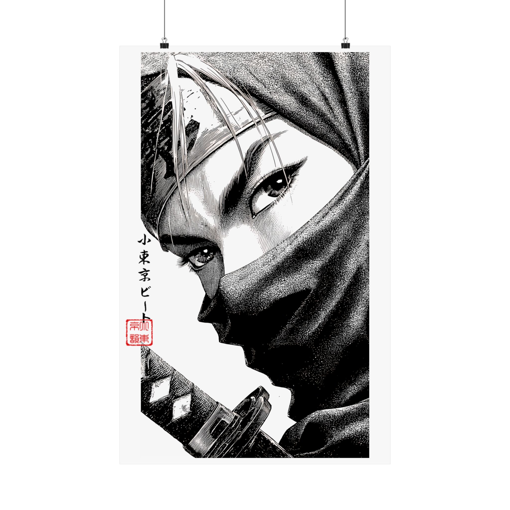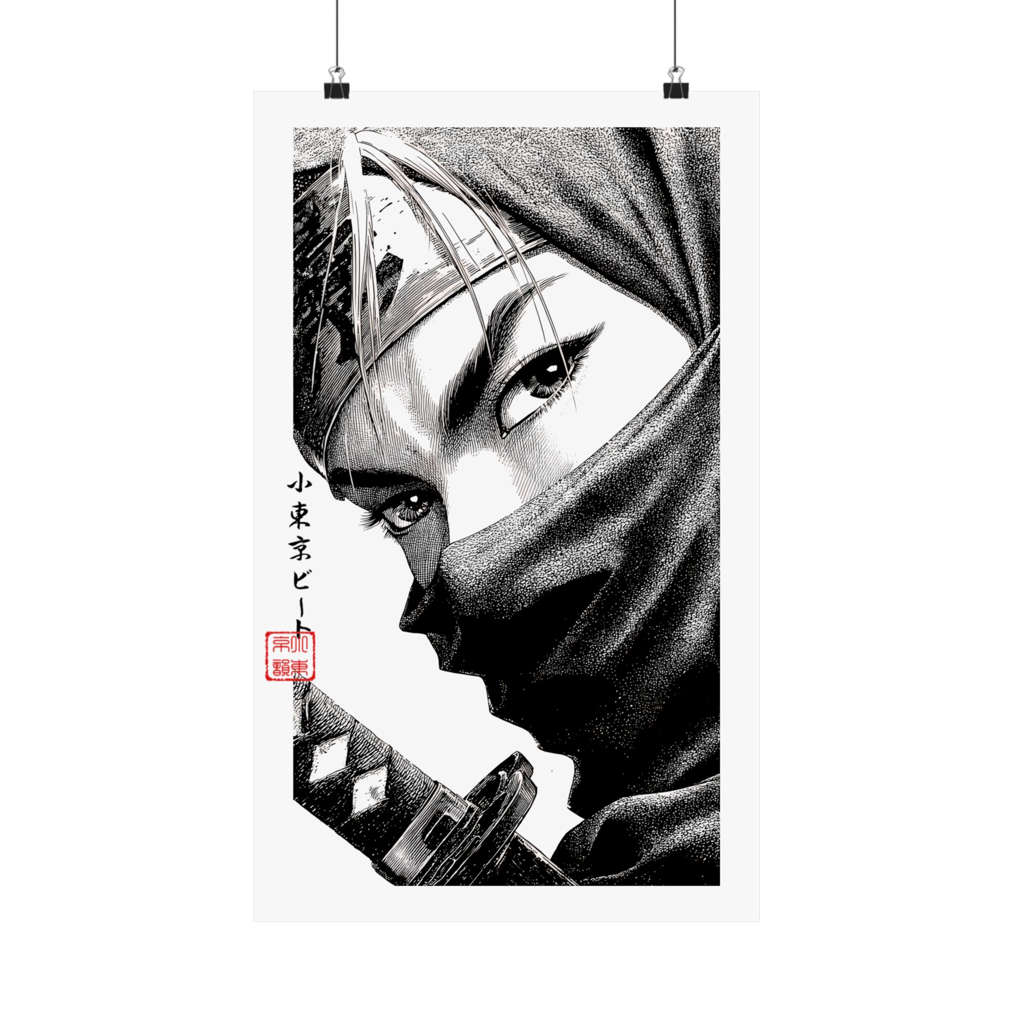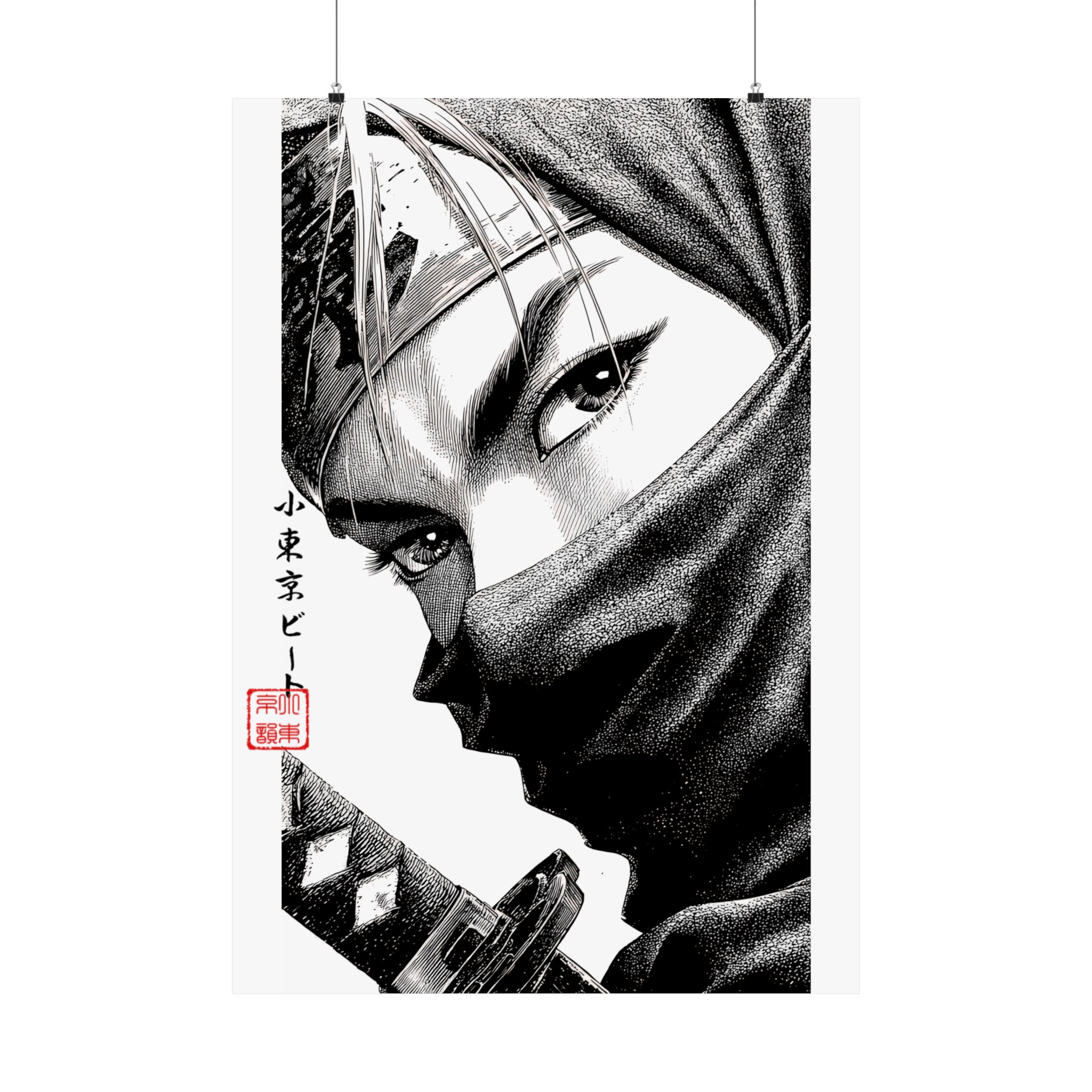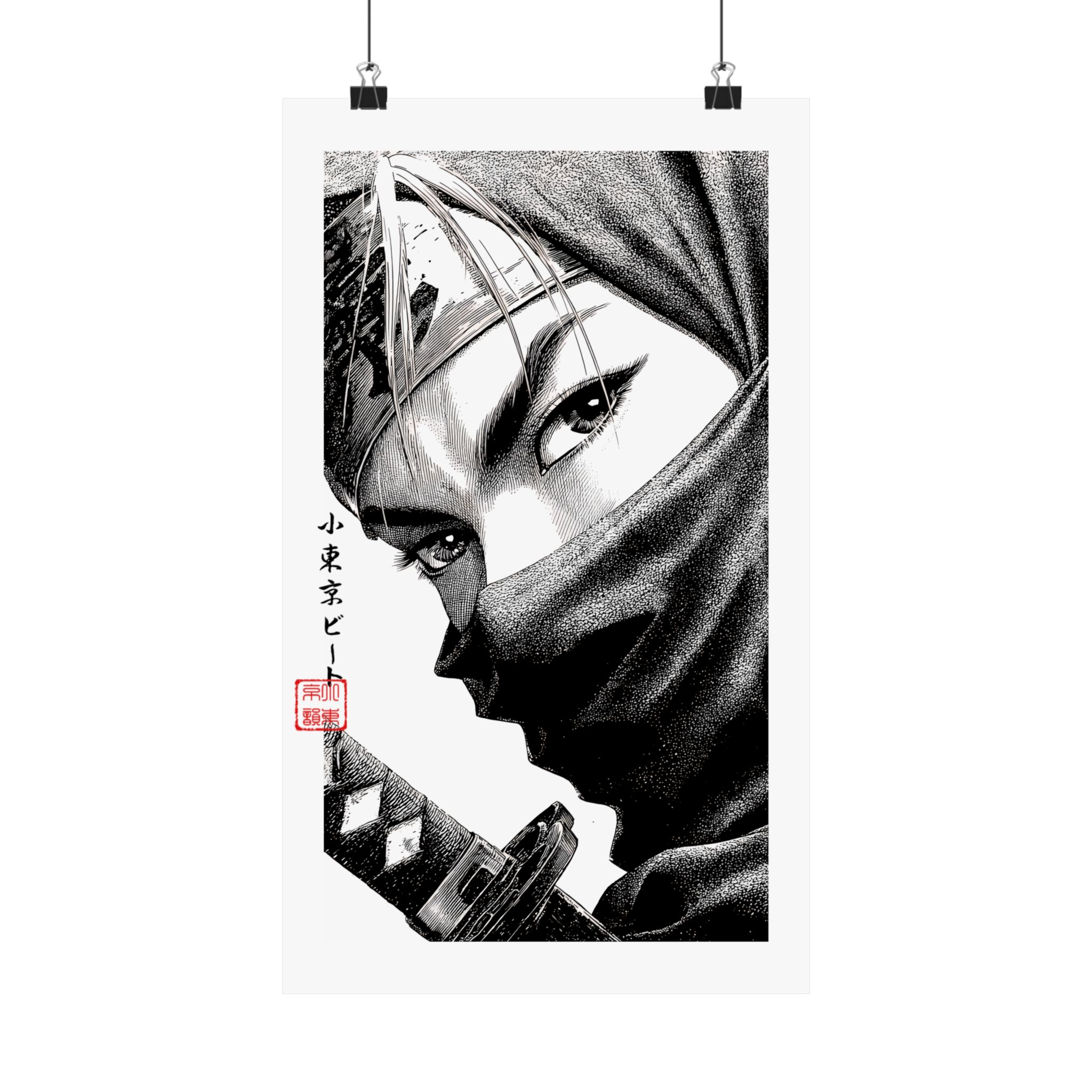 This striking masked ninja woman poster captures mystery, strength, and quiet intensity through bold black and white illustration. Featuring a close-up female warrior with piercing eyes, wrapped in flowing fabric and holding a blade, this artwork delivers a cinematic, graphic novel feel. The detailed ink-style texture and high-contrast shading create a powerful gallery presence that commands attention. Perfect for fans of ninja art, samurai aesthetics, assassin themes, and modern monochrome decor, this print brings Lil Tokyo Beat’s K.A.T. energy — Kool, Artful, Timeless — into your space. A statement piece for studios, offices, game rooms, or anyone drawn to stealth, strength, and dramatic warrior imagery.