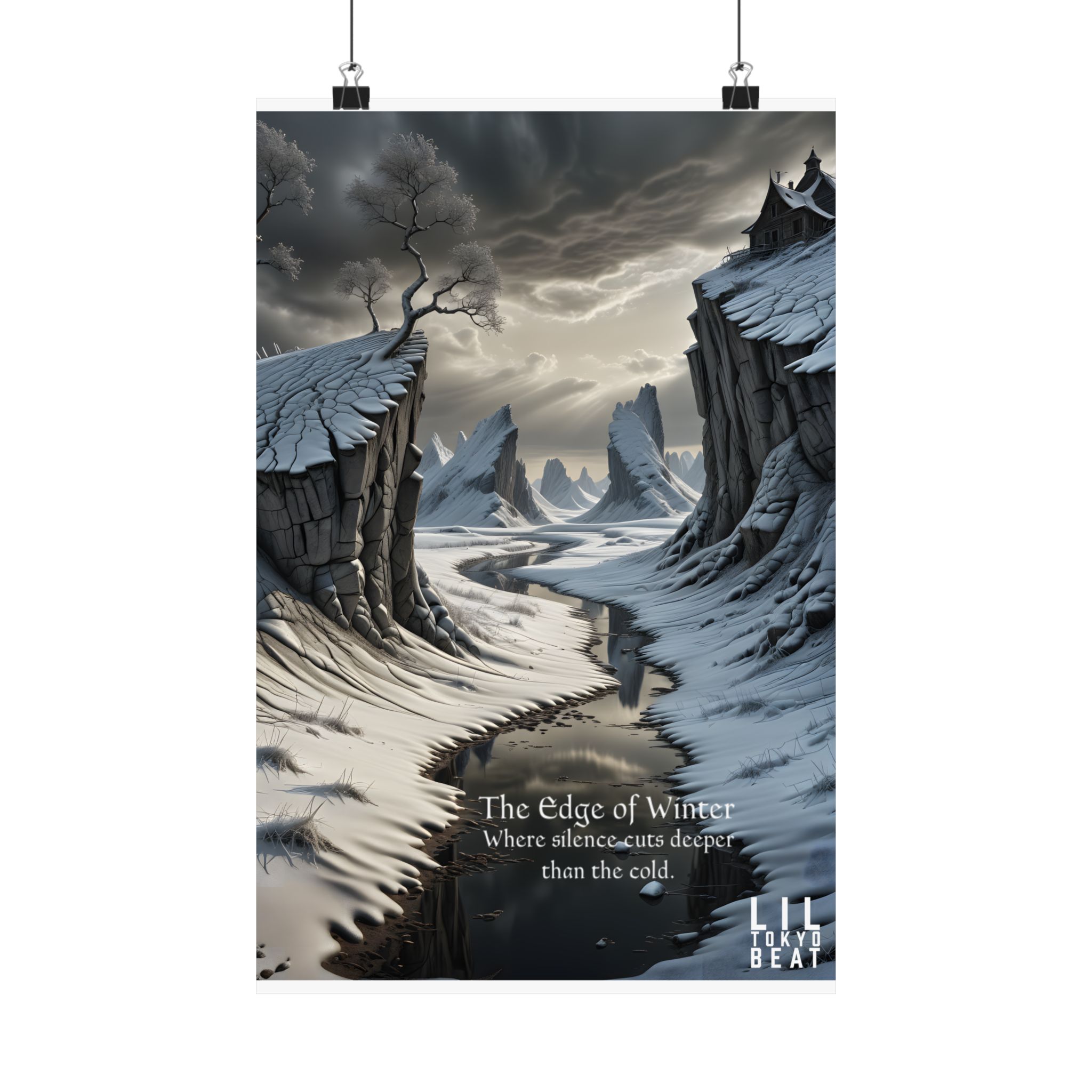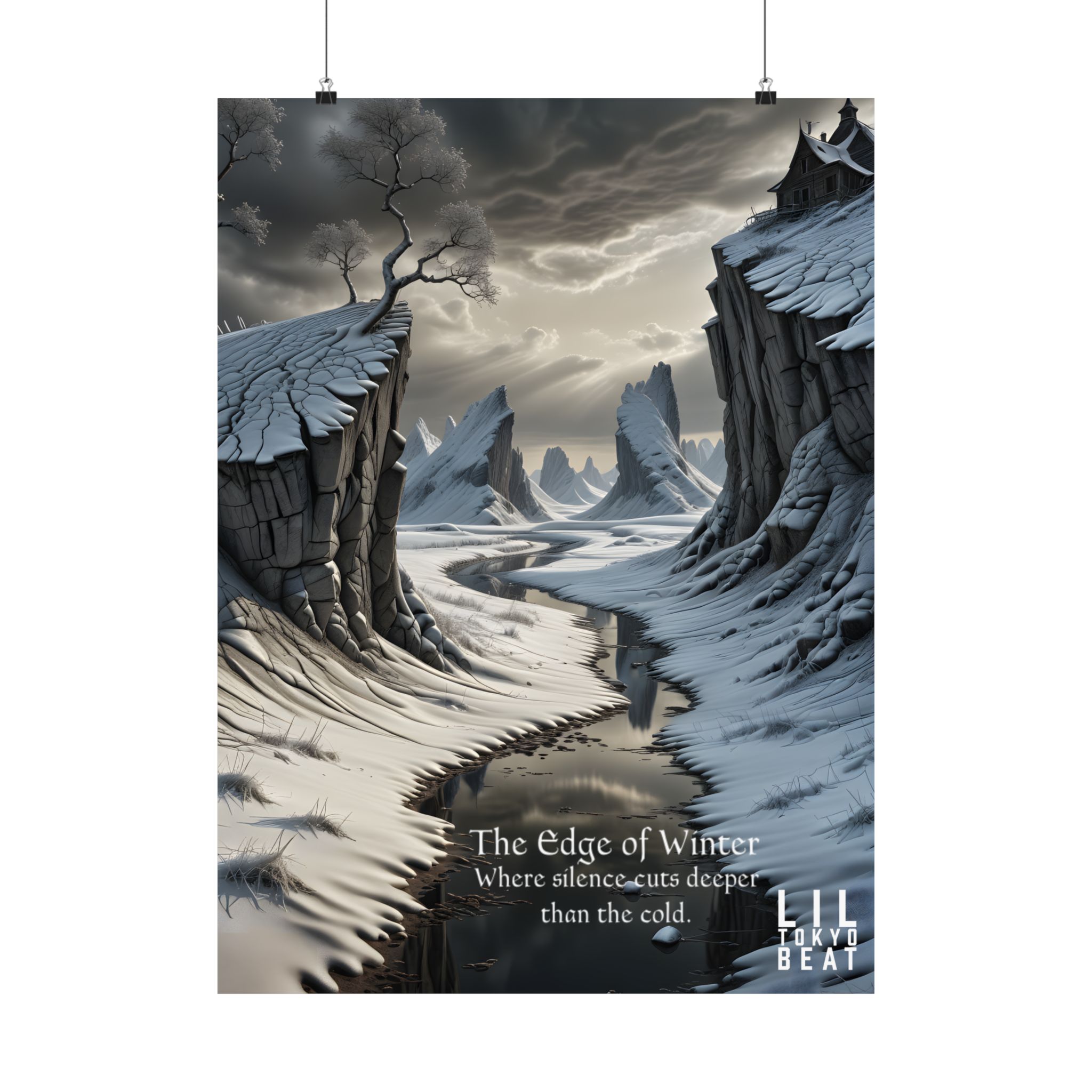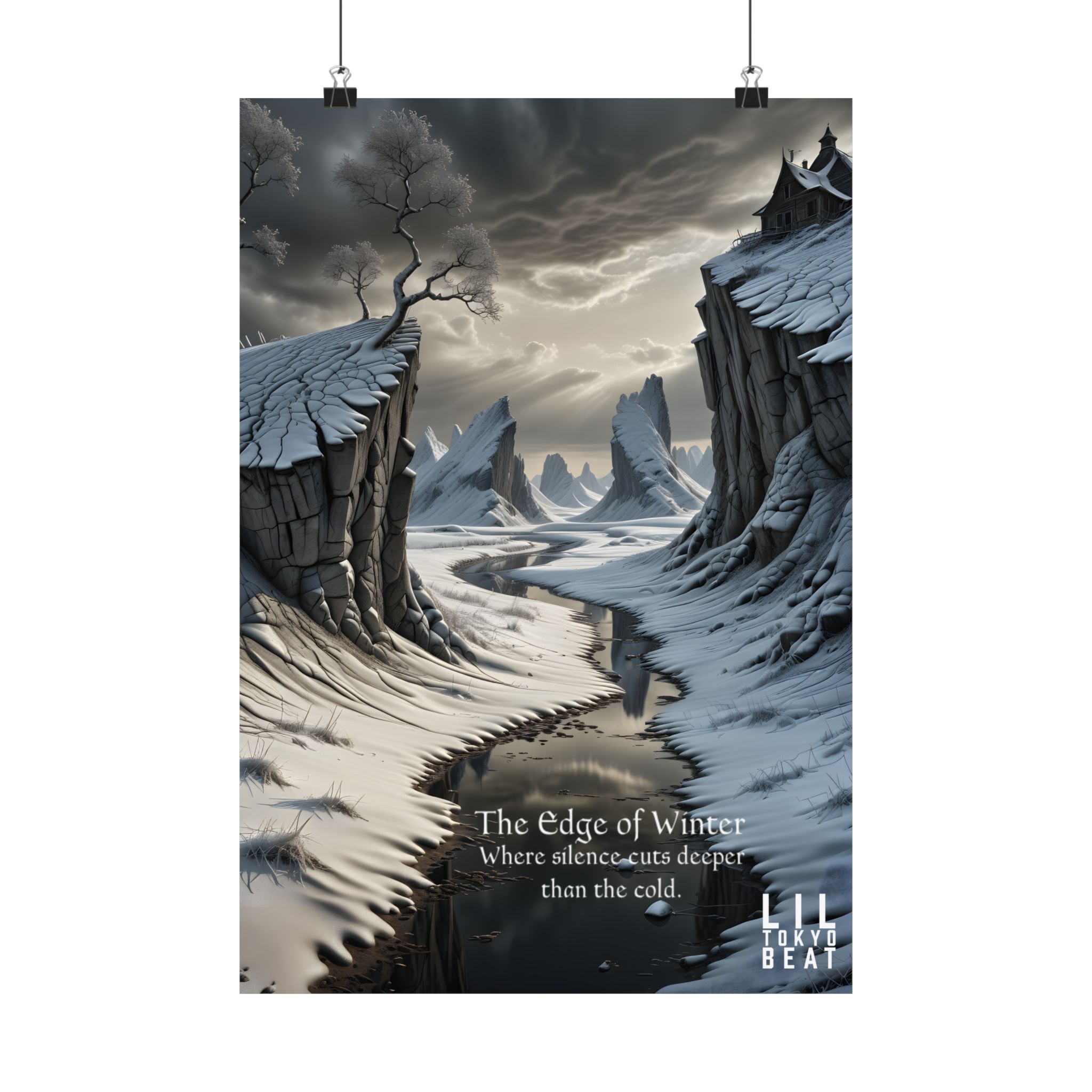 This matte vertical poster brings a quiet, stark landscape into the room — a frozen gorge under an iron sky, wind-carved cliffs, and a black river that seems to swallow sound. The scene reads like the first page of a winter fable: cool grays and slate blues rendered in rich giclée pigments on archival museum-grade paper that won’t yellow with time. The soft matte finish keeps reflections low so the details and mood stay intact under warm indoor lighting. Hang it where you want a contemplative pause — a study, bedroom, or hall — and let it set a calm, slightly wild tone for the space.