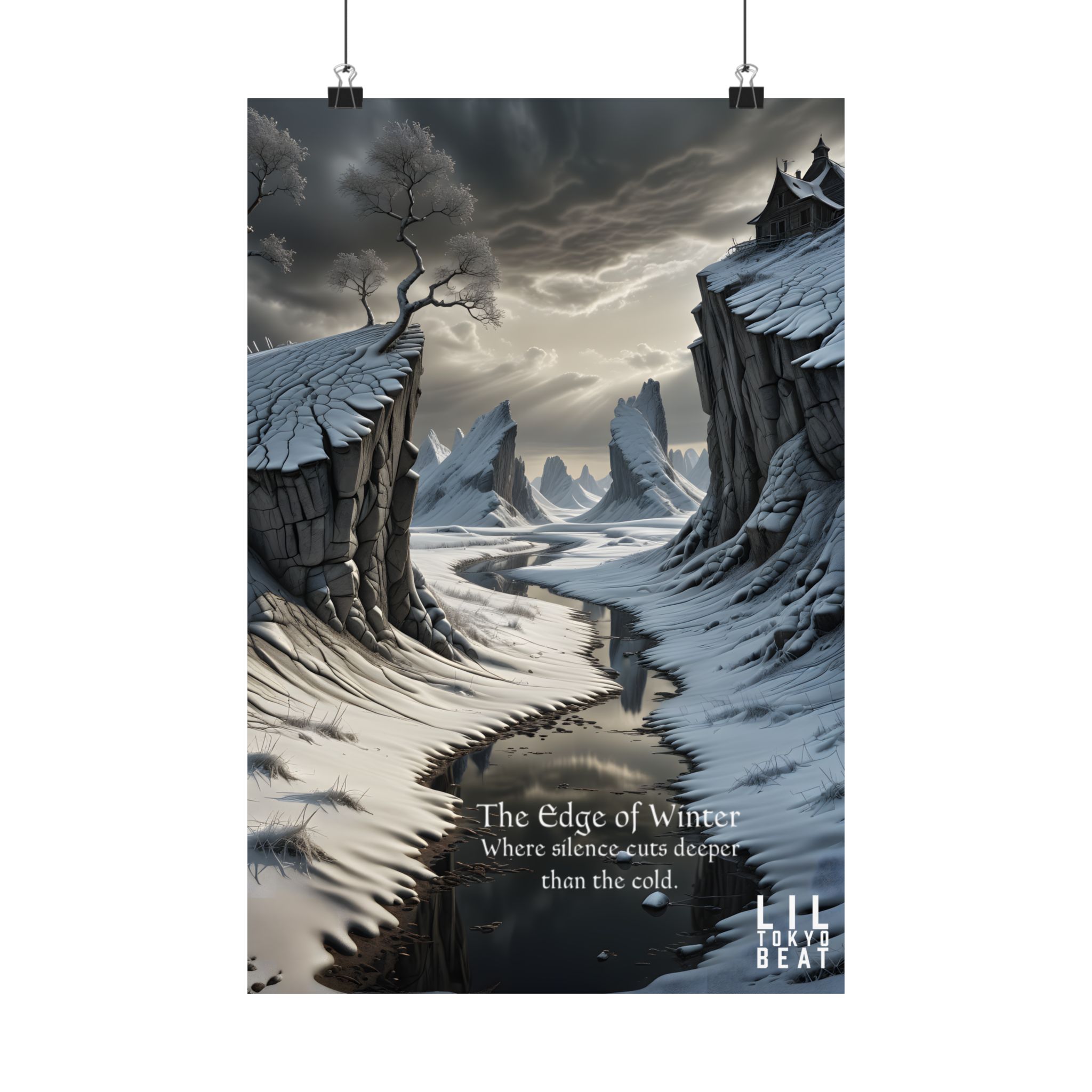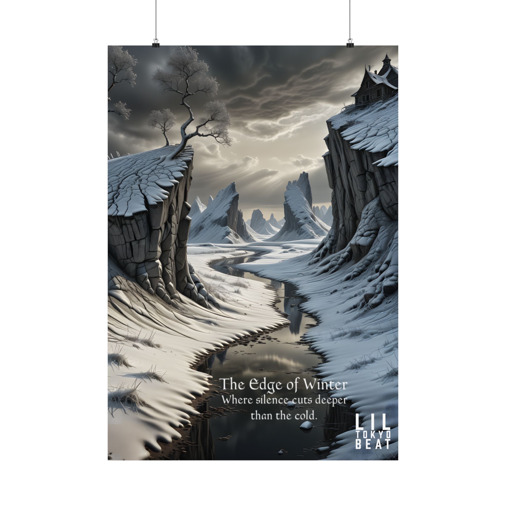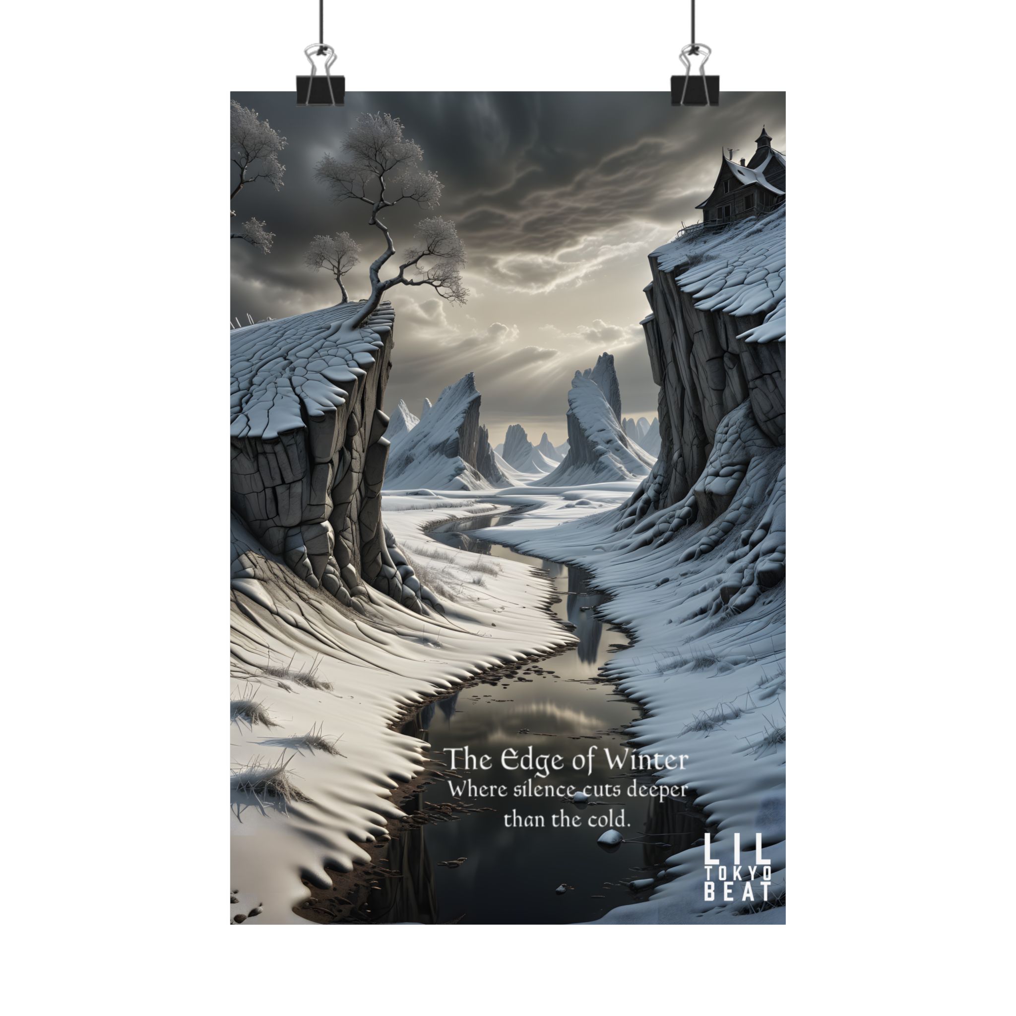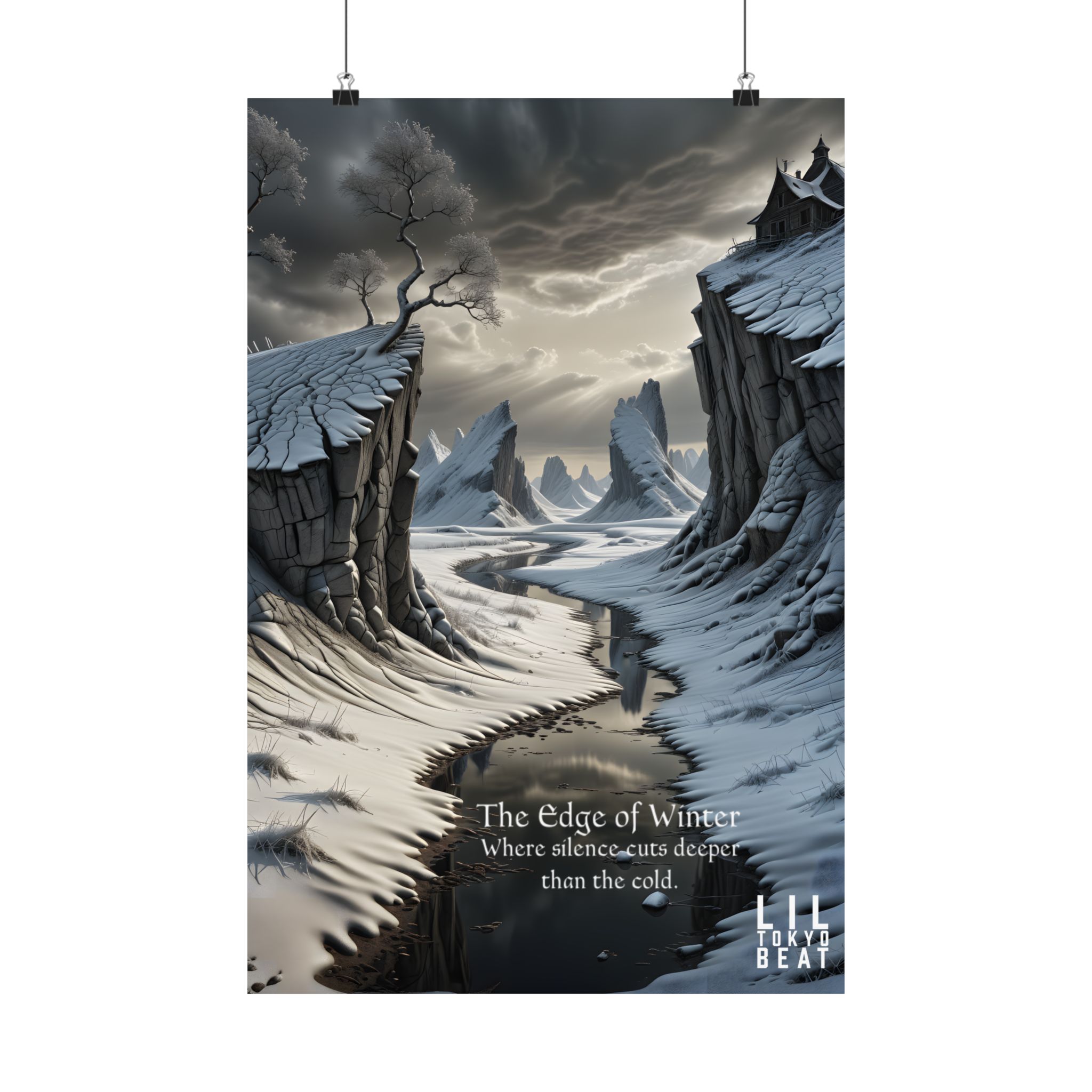 This matte vertical poster brings a quiet, stark landscape into the room — a frozen gorge under an iron sky, wind-carved cliffs, and a black river that seems to swallow sound. The scene reads like the first page of a winter fable: cool grays and slate blues rendered in rich giclée pigments on archival museum-grade paper that won’t yellow with time. The soft matte finish keeps reflections low so the details and mood stay intact under warm indoor lighting. Hang it where you want a contemplative pause — a study, bedroom, or hall — and let it set a calm, slightly wild tone for the space.