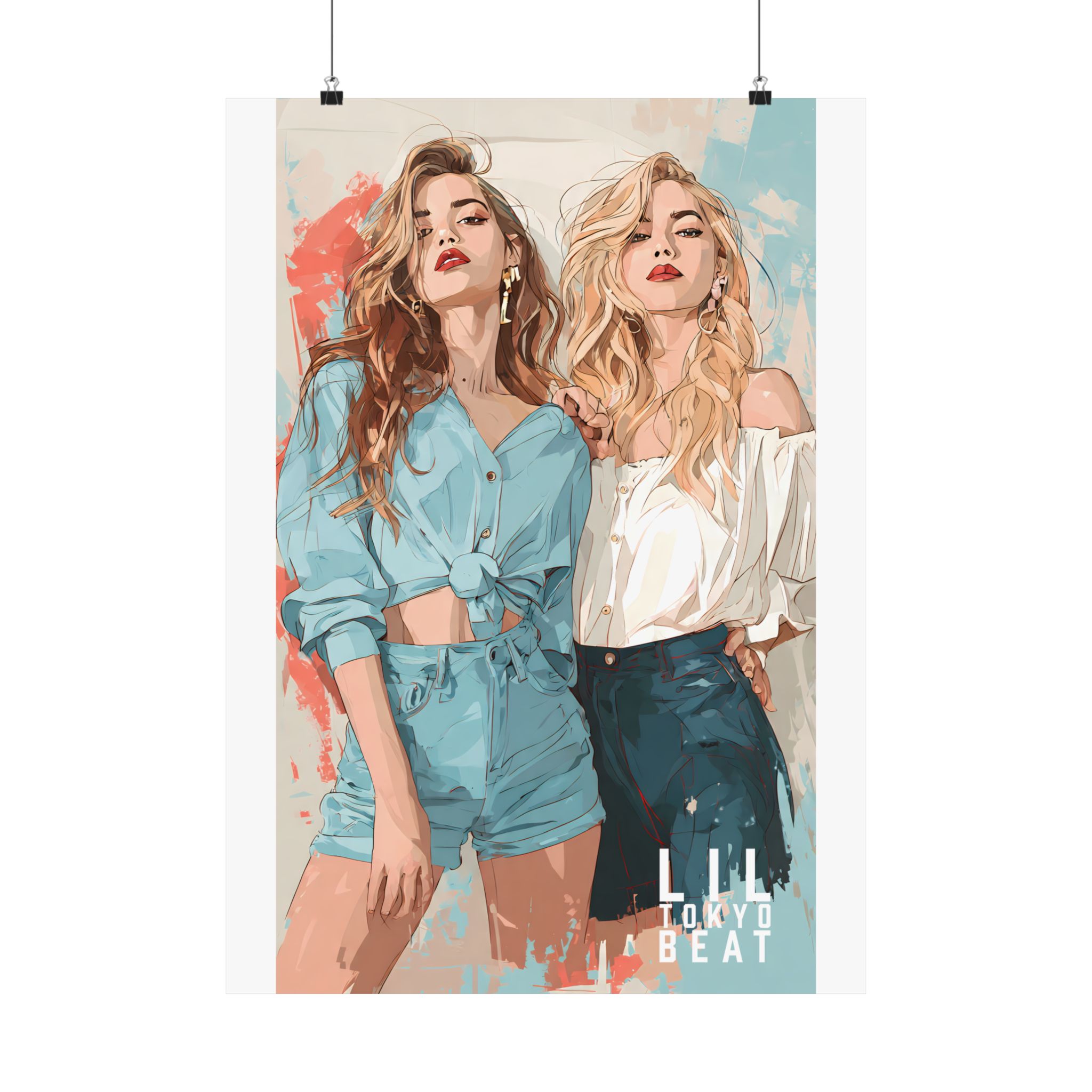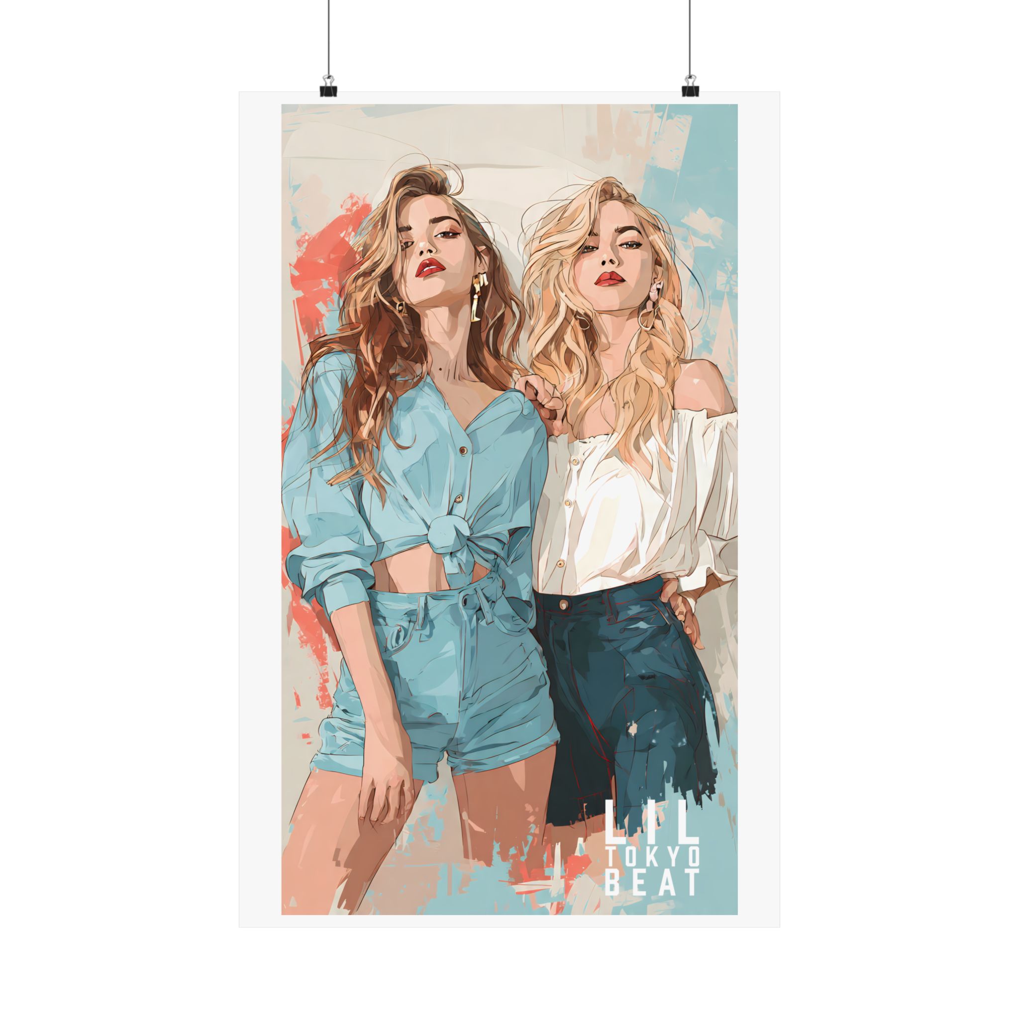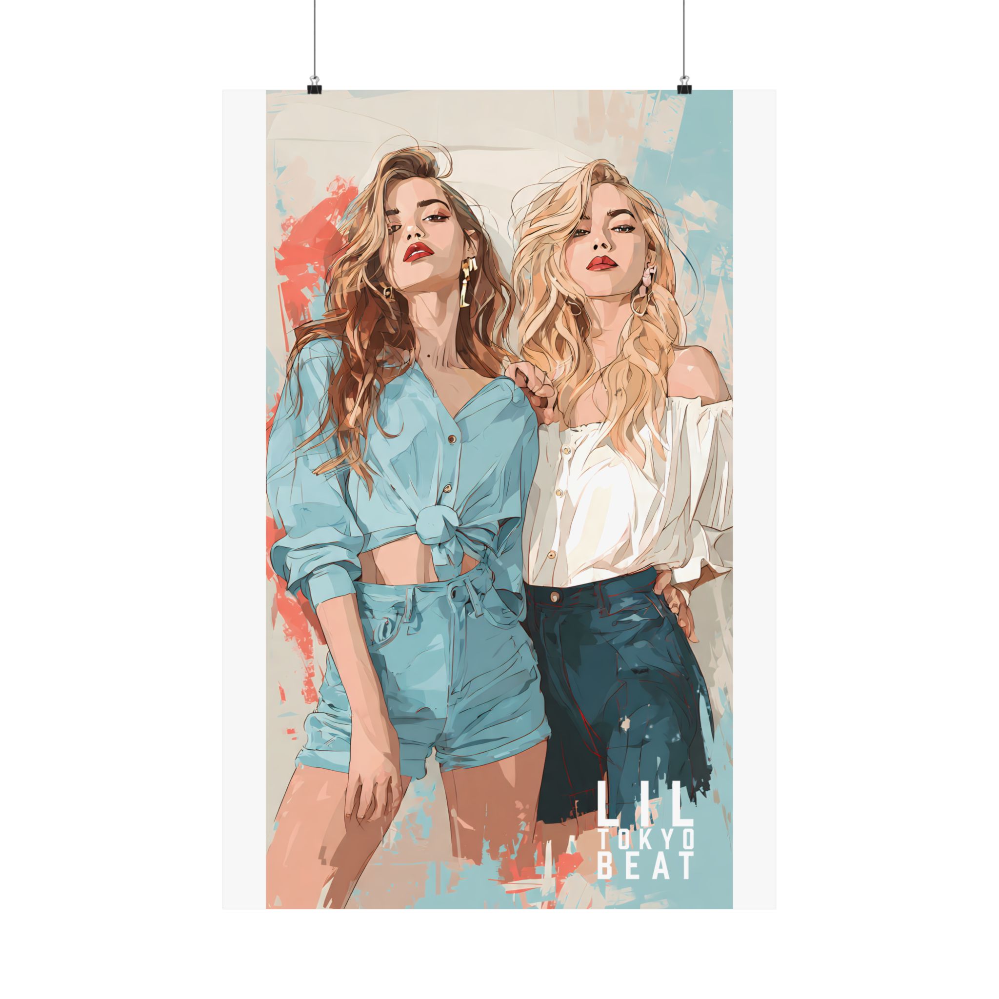 Effortless confidence meets modern illustration. This Lil Tokyo Beat poster features two fashion-forward women rendered in soft contemporary tones with painterly textures and clean editorial composition. The blend of muted blues, warm neutrals, and abstract splashes creates a gallery-ready aesthetic that feels both stylish and timeless. Designed for bedrooms, dressing areas, studios, or boutique-inspired interiors, this artwork adds confident feminine energy without overpowering a space. Kool. Artful. Timeless. wall décor from Lil Tokyo Beat — A New Voice in Tee Culture, now expanding into refined statement art.
