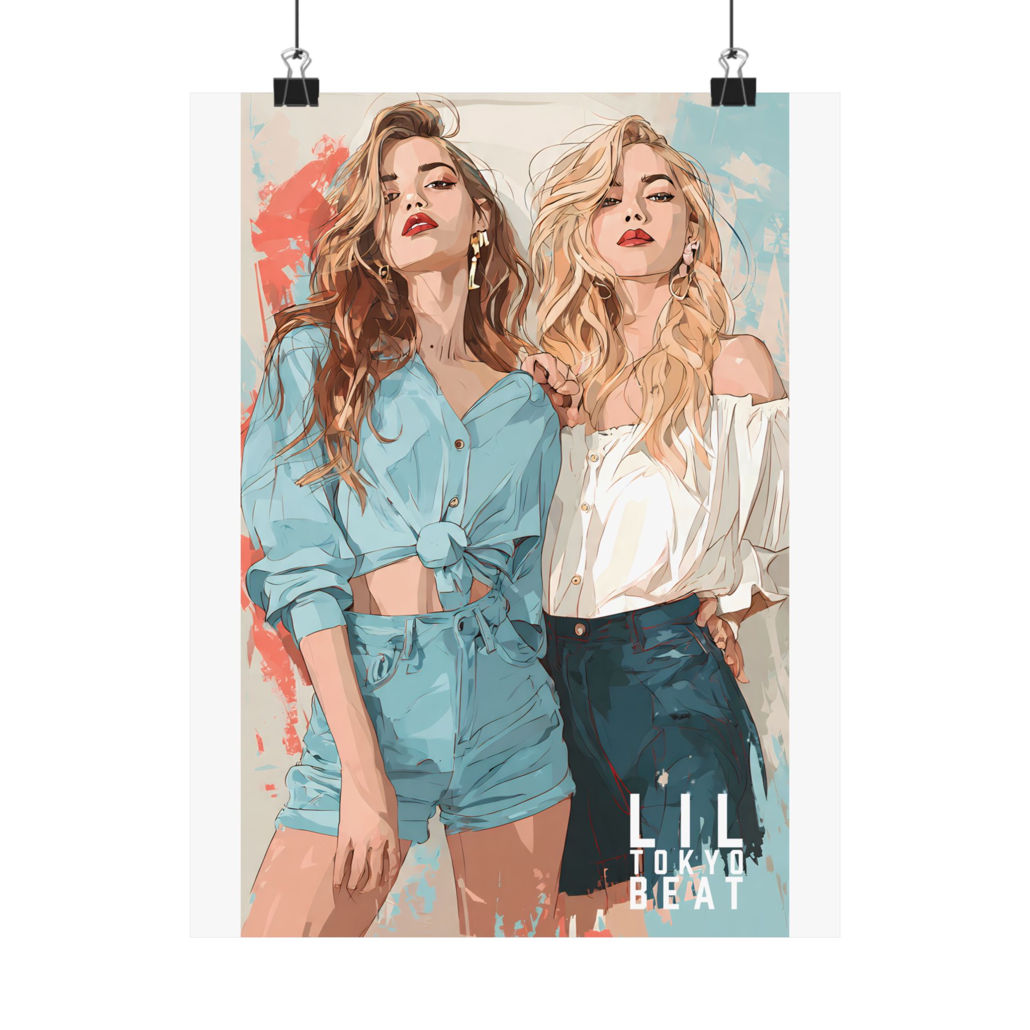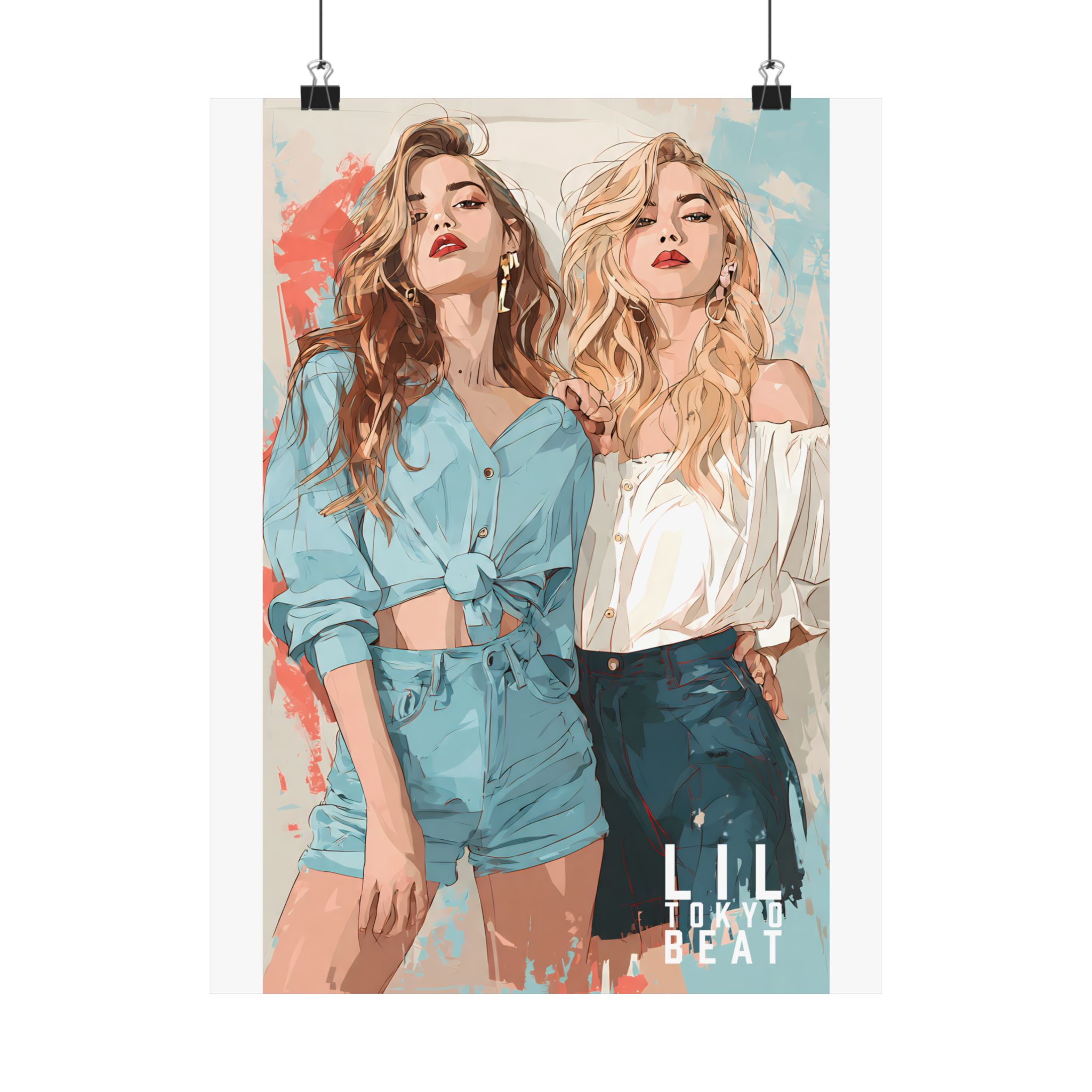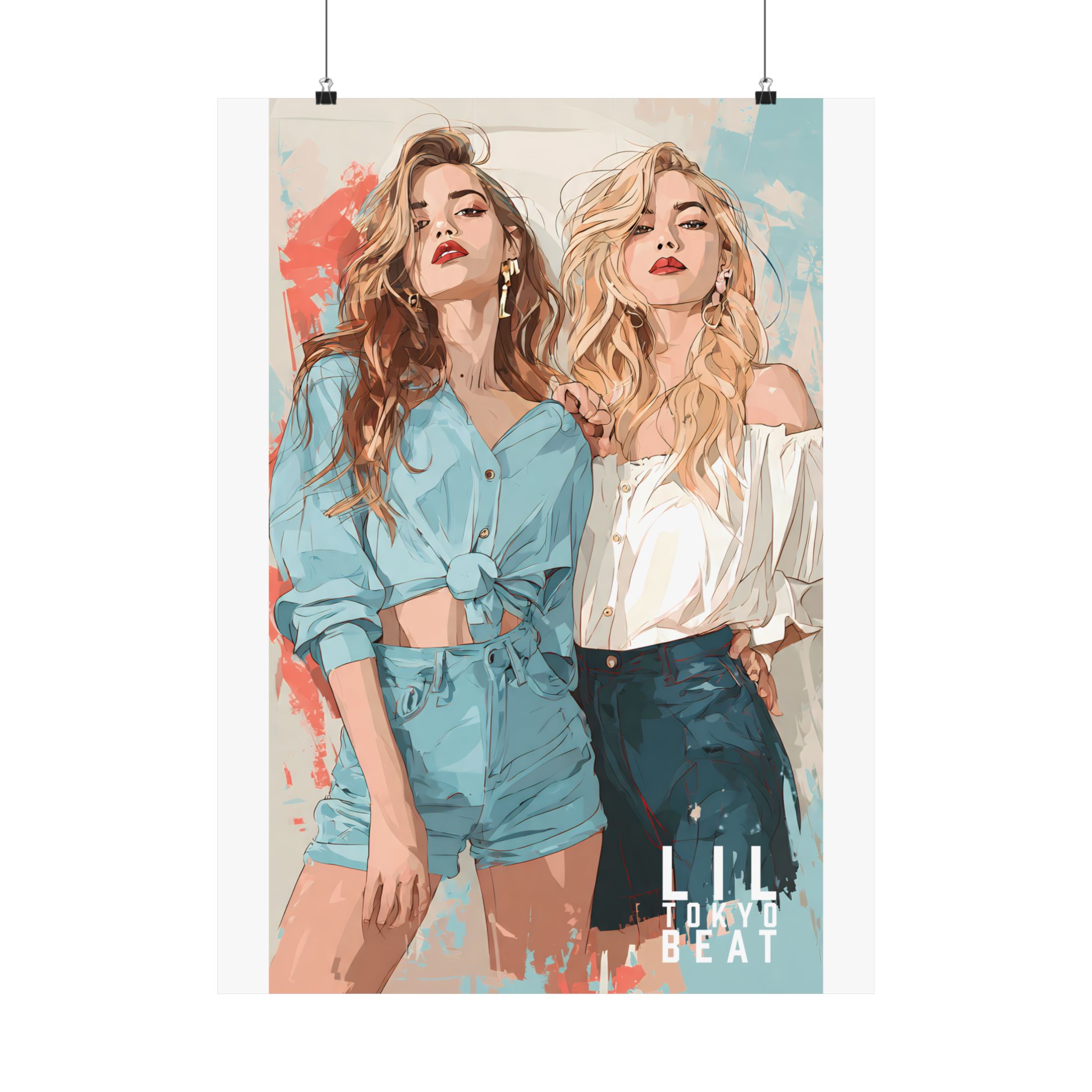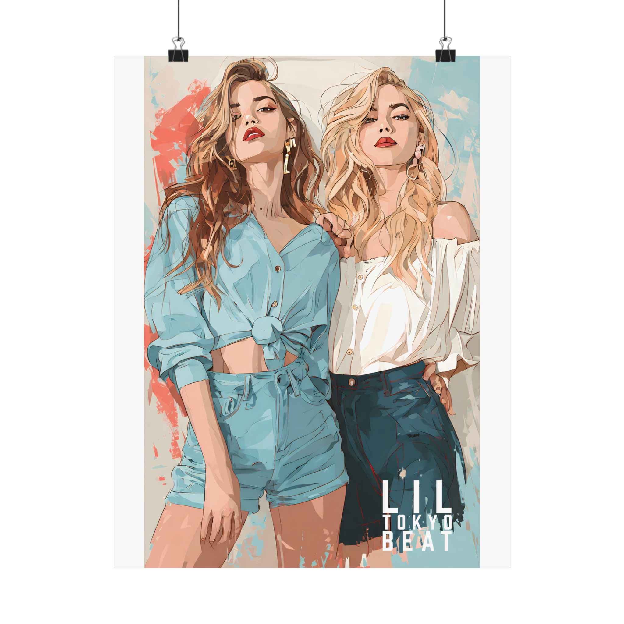 Effortless confidence meets modern illustration. This Lil Tokyo Beat poster features two fashion-forward women rendered in soft contemporary tones with painterly textures and clean editorial composition. The blend of muted blues, warm neutrals, and abstract splashes creates a gallery-ready aesthetic that feels both stylish and timeless. Designed for bedrooms, dressing areas, studios, or boutique-inspired interiors, this artwork adds confident feminine energy without overpowering a space. Kool. Artful. Timeless. wall décor from Lil Tokyo Beat — A New Voice in Tee Culture, now expanding into refined statement art.