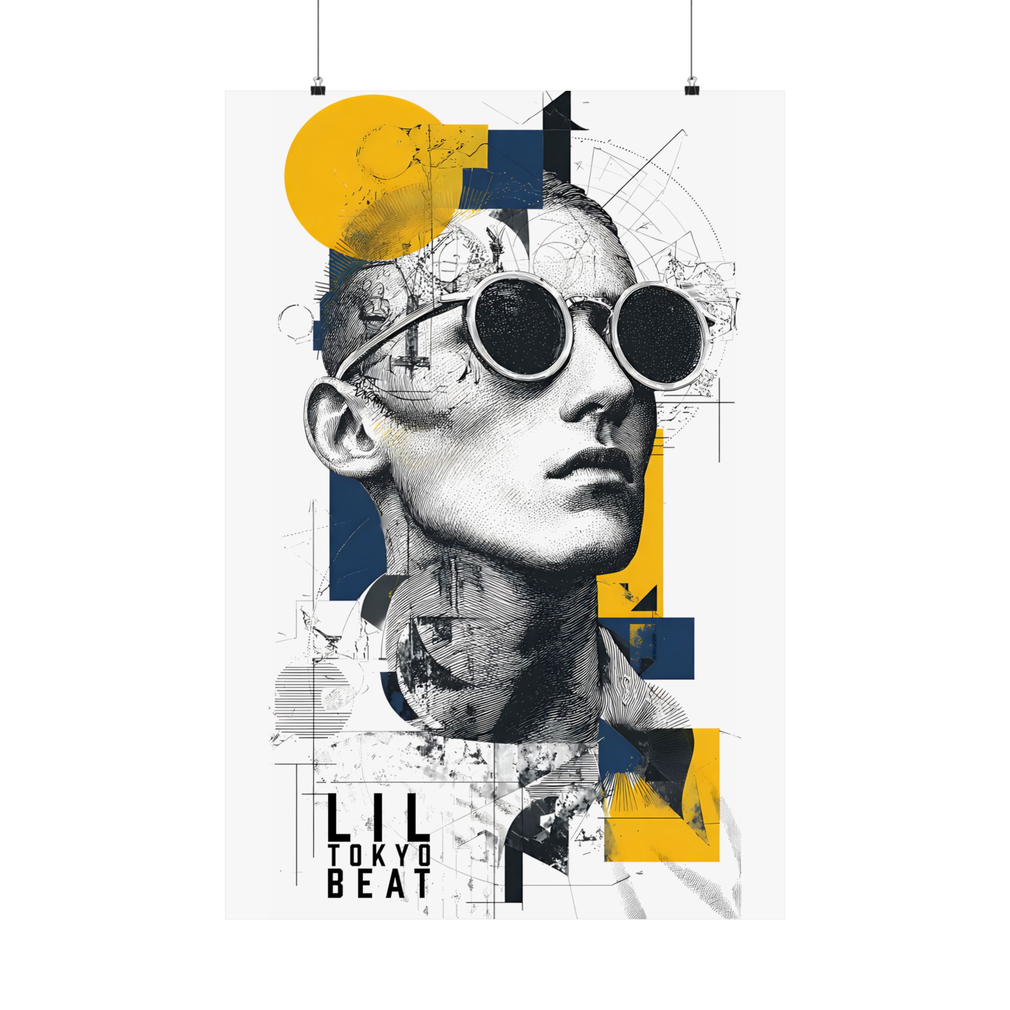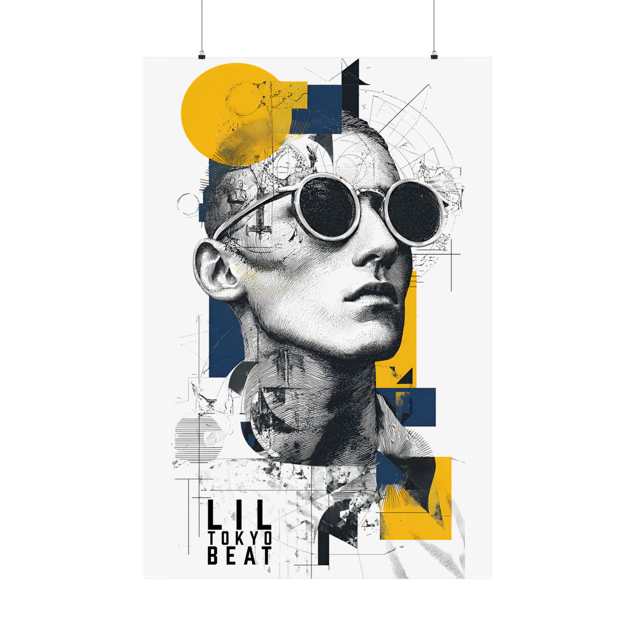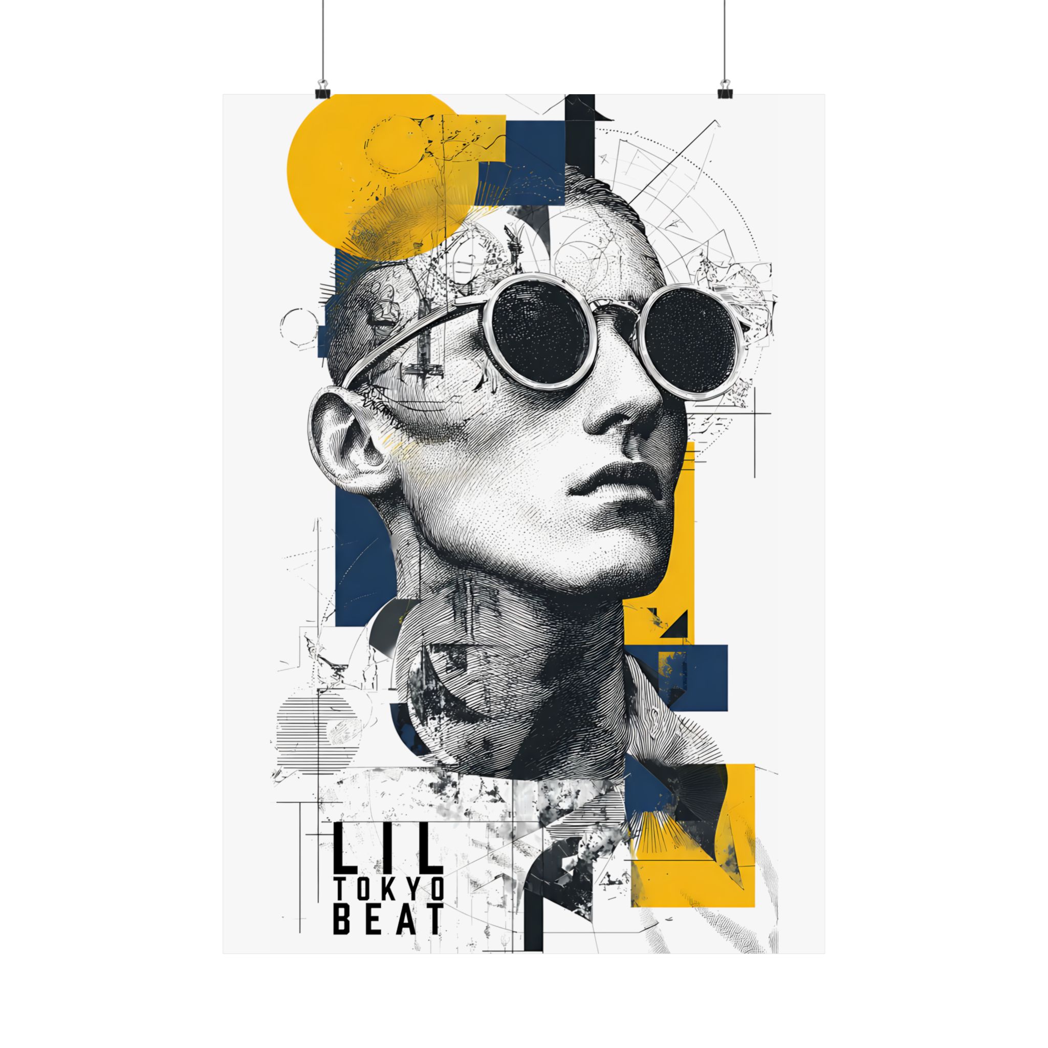 Where classical sketch meets modern geometry. This Lil Tokyo Beat poster blends detailed line-art portrait illustration with bold geometric overlays in yellow and deep navy. The fusion of architectural drafting textures and contemporary color blocking creates a refined, gallery-inspired aesthetic. Perfect for modern apartments, creative studios, office spaces, or minimalist interiors, this artwork adds intellectual edge and artistic depth to any wall. Designed under the LTB philosophy — Kool. Artful. Timeless. — it represents wearable-art culture expanded into striking contemporary wall décor.