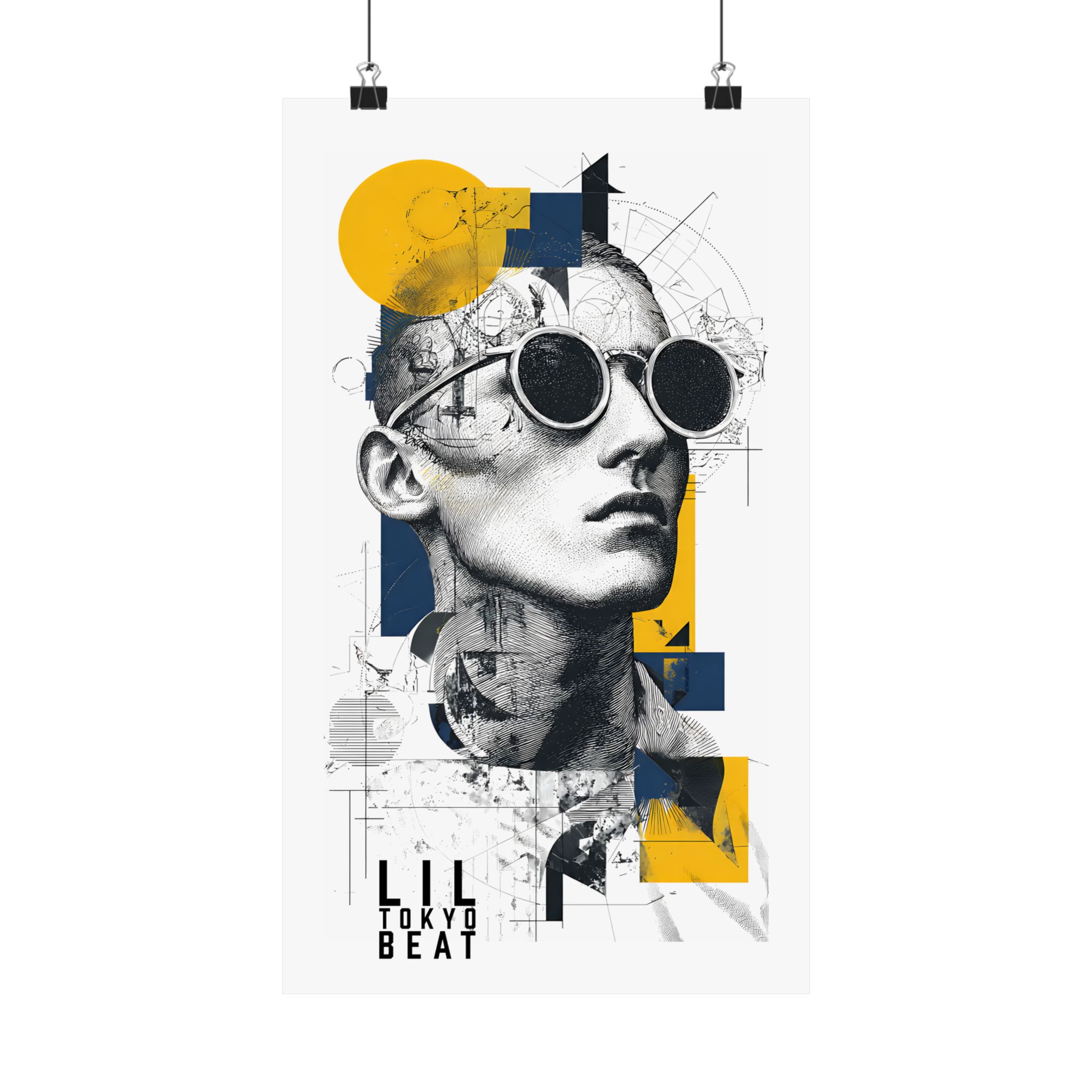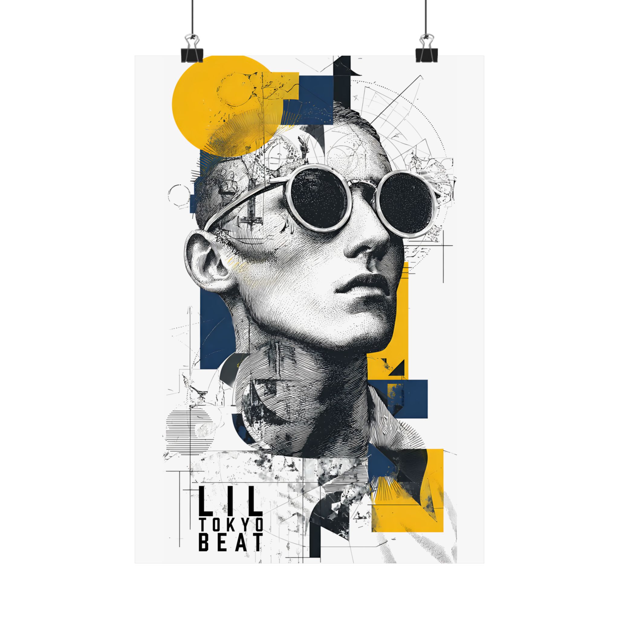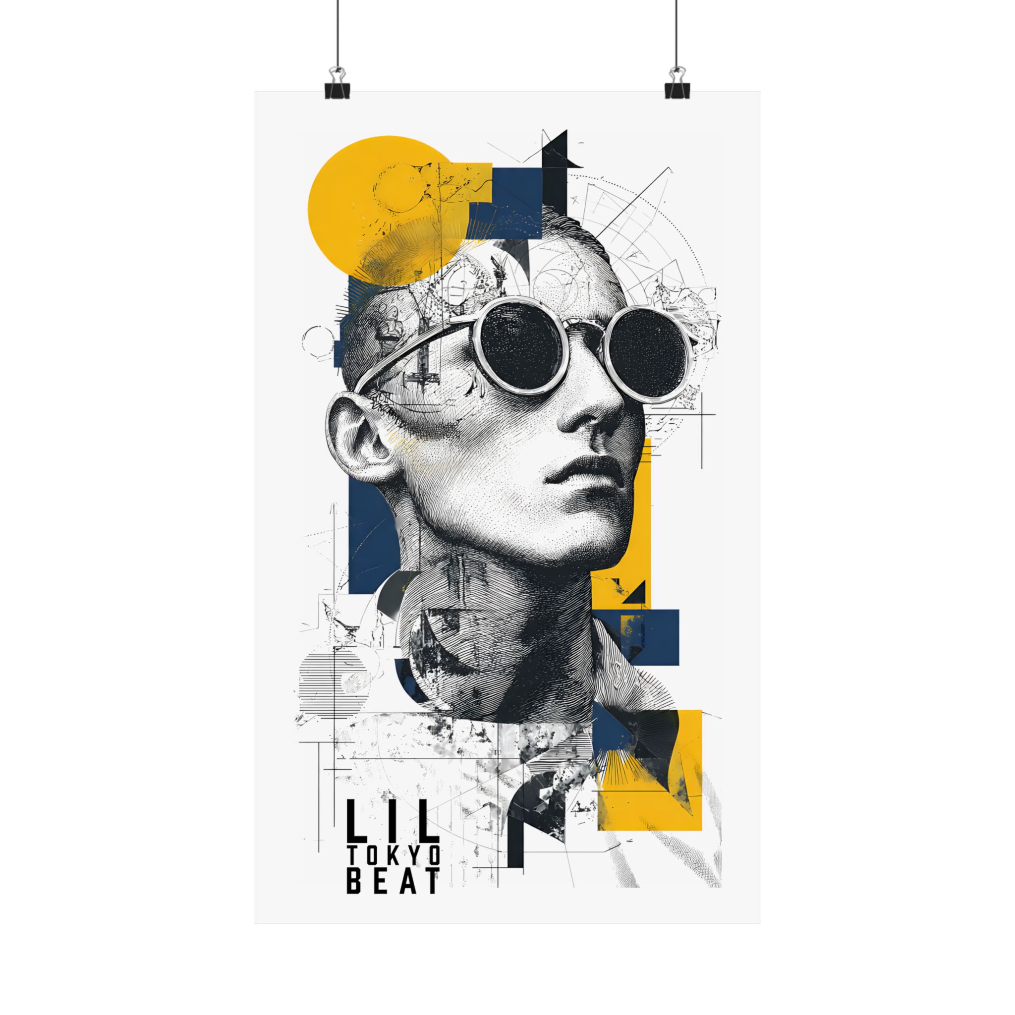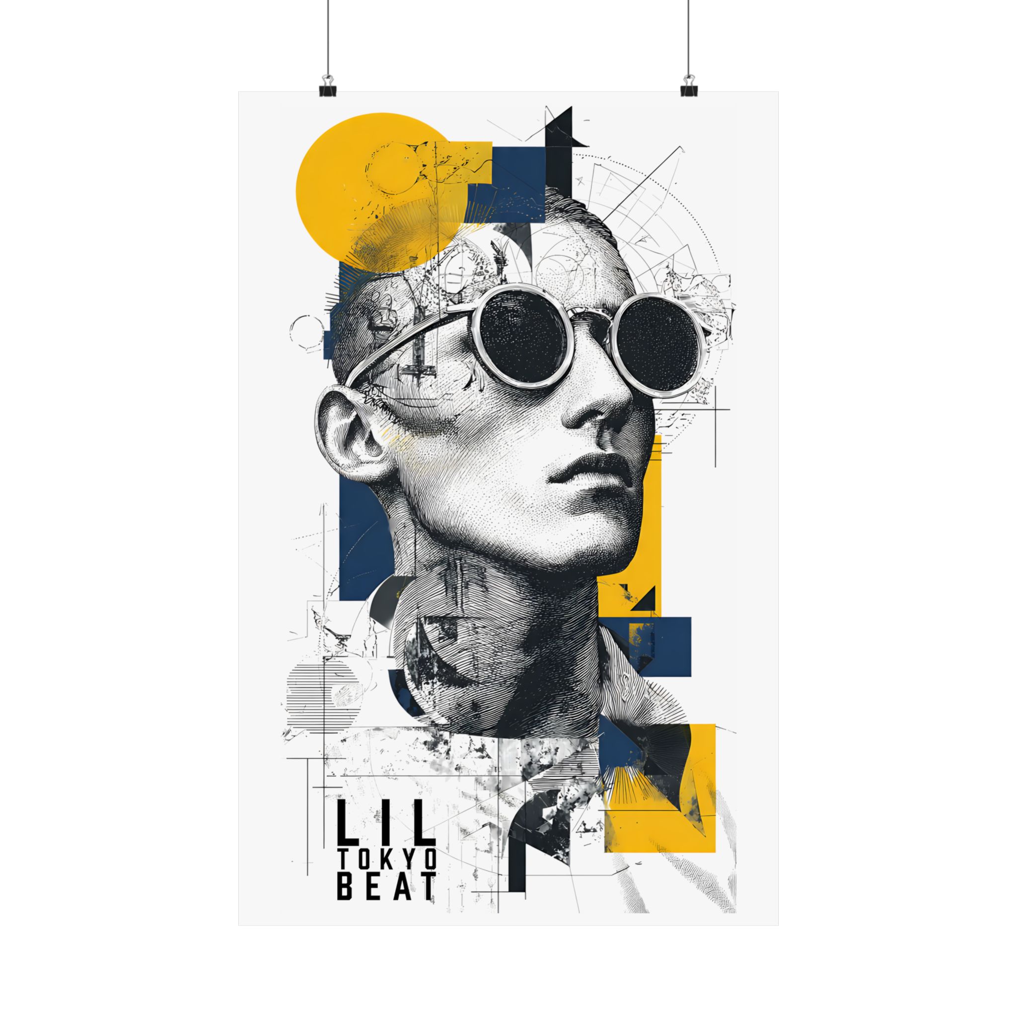 Where classical sketch meets modern geometry. This Lil Tokyo Beat poster blends detailed line-art portrait illustration with bold geometric overlays in yellow and deep navy. The fusion of architectural drafting textures and contemporary color blocking creates a refined, gallery-inspired aesthetic. Perfect for modern apartments, creative studios, office spaces, or minimalist interiors, this artwork adds intellectual edge and artistic depth to any wall. Designed under the LTB philosophy — Kool. Artful. Timeless. — it represents wearable-art culture expanded into striking contemporary wall décor.