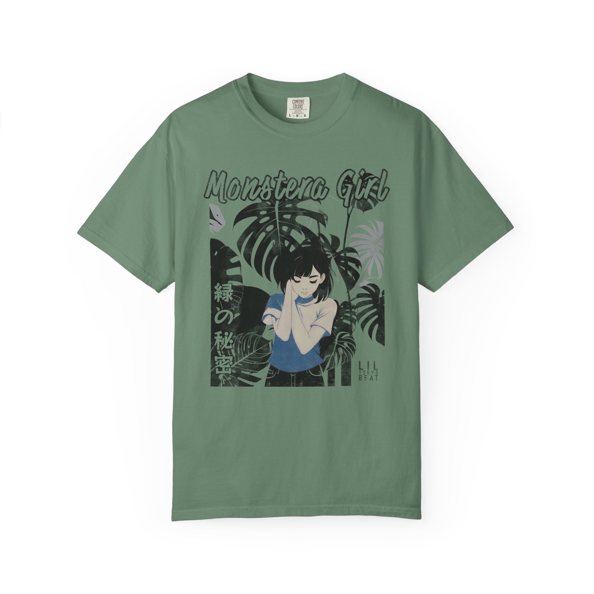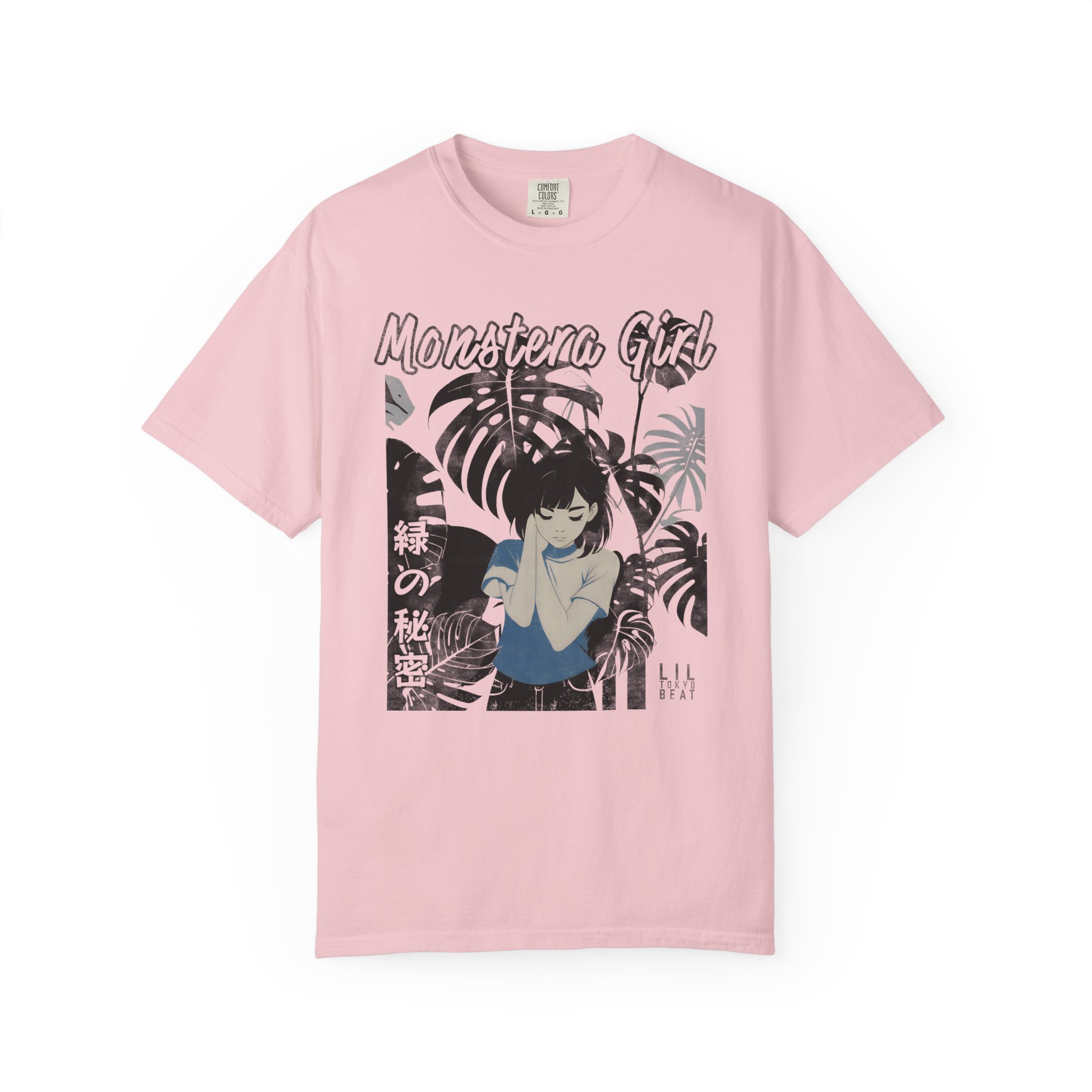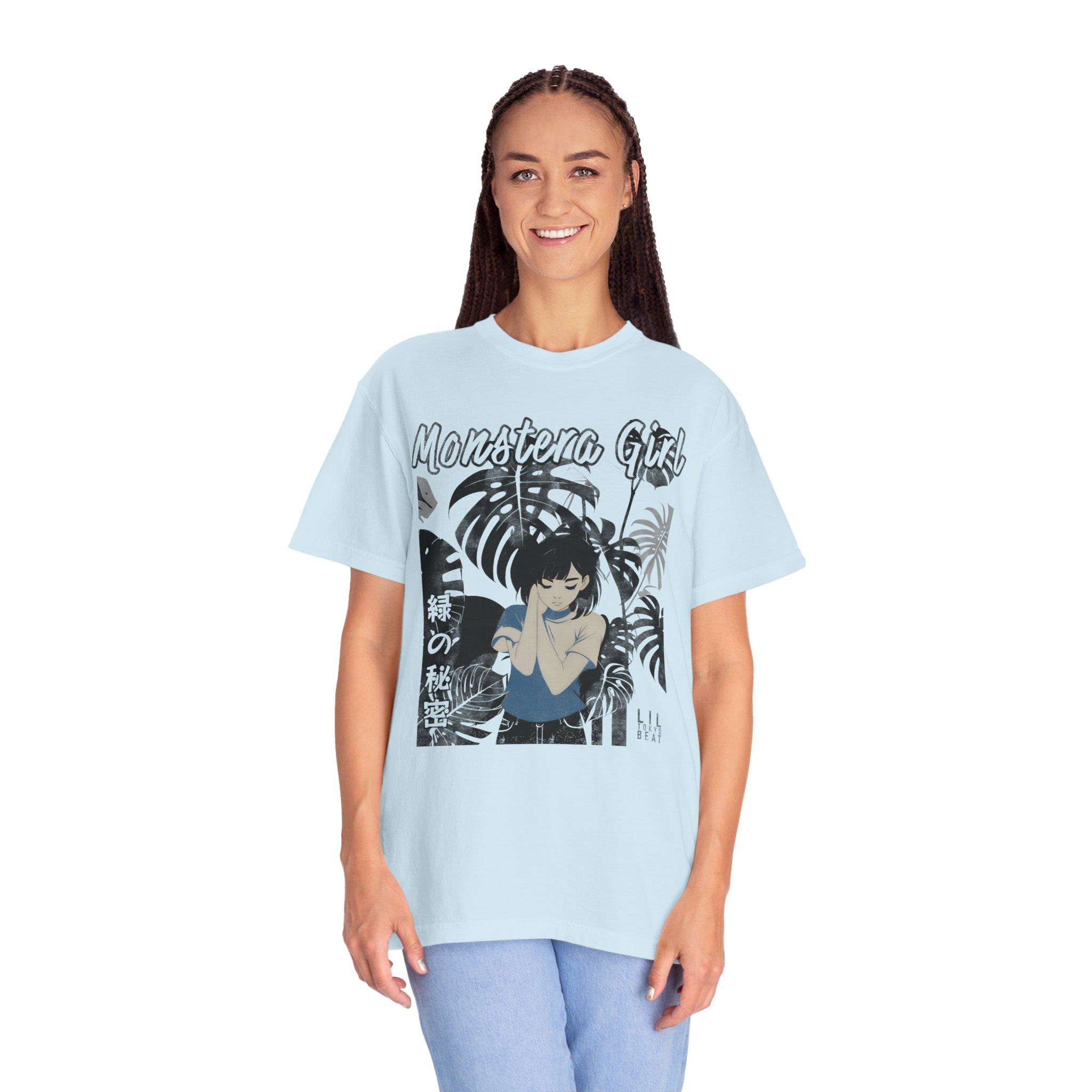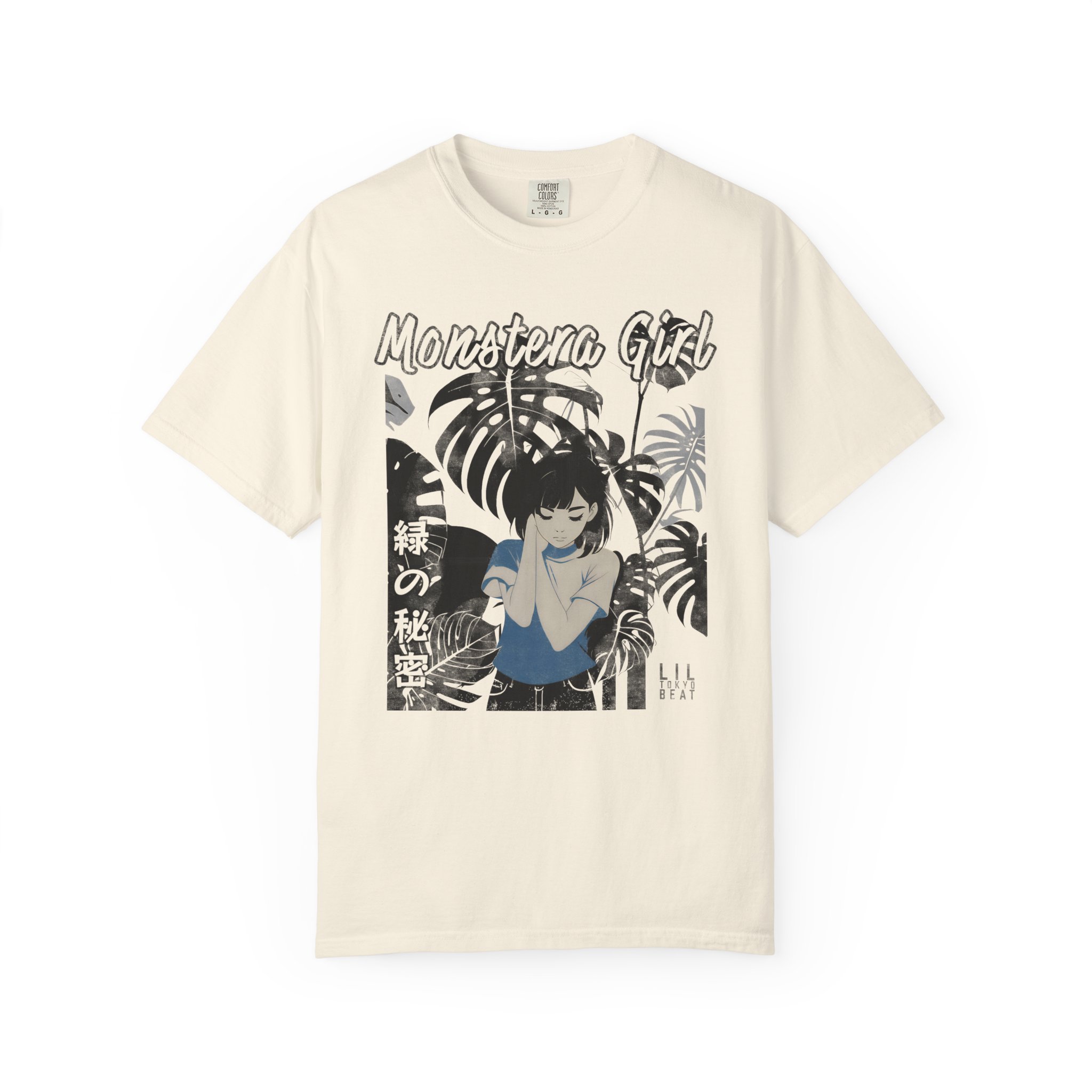 The artwork of Monstera Girl Tee has has nature and emotion combined style
