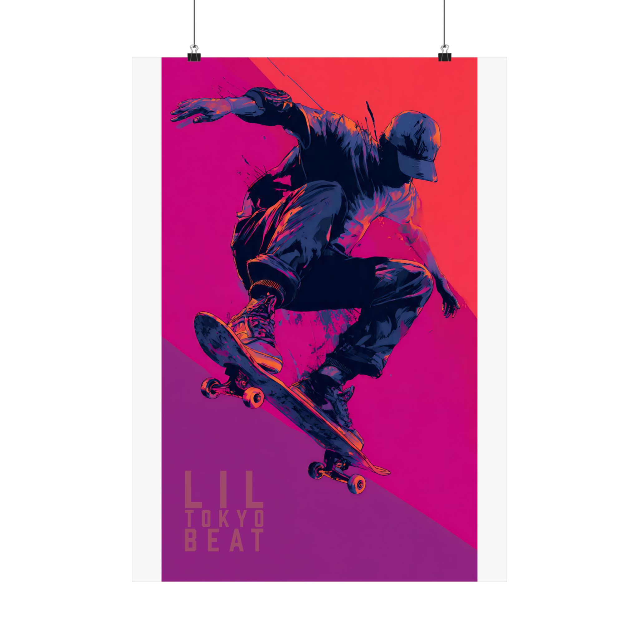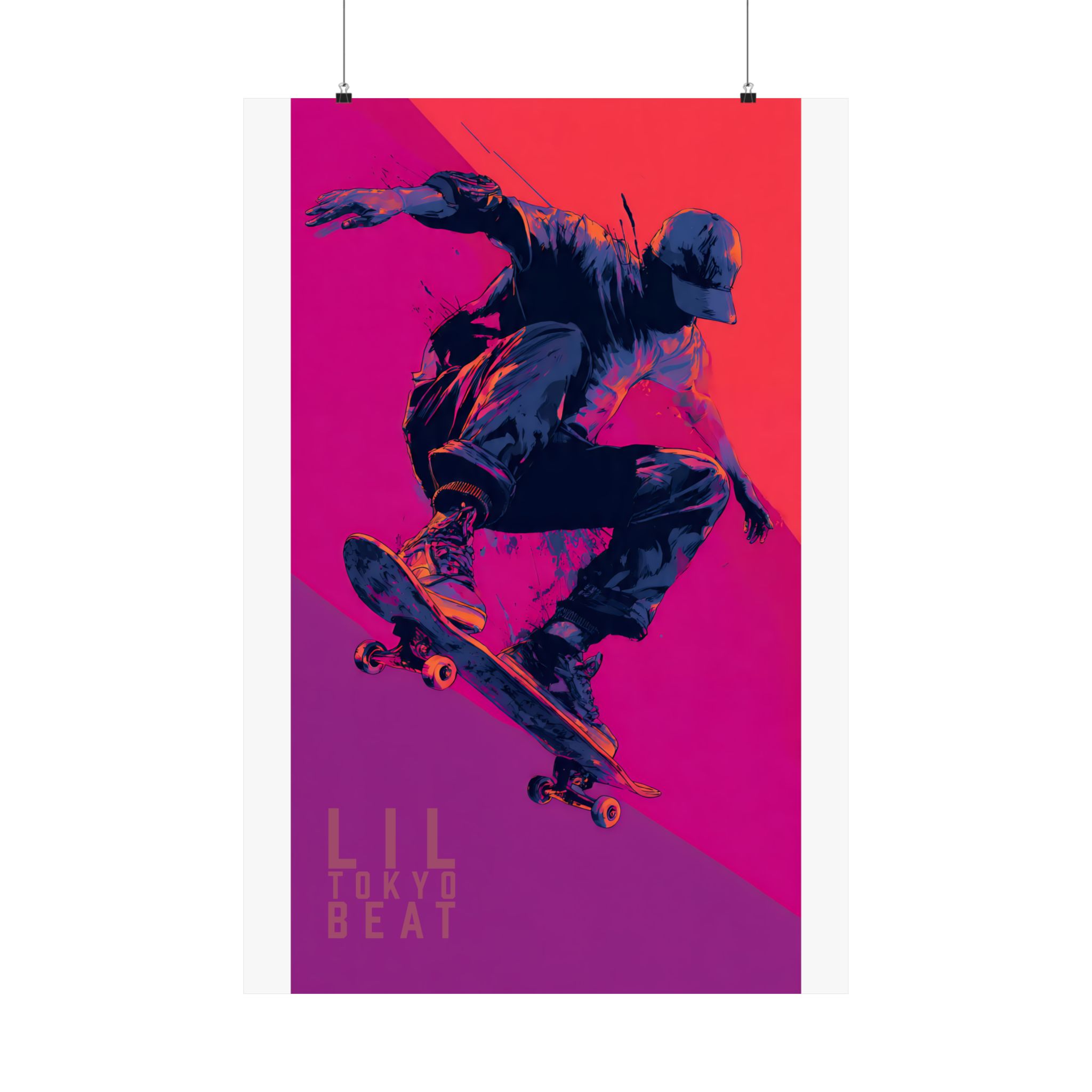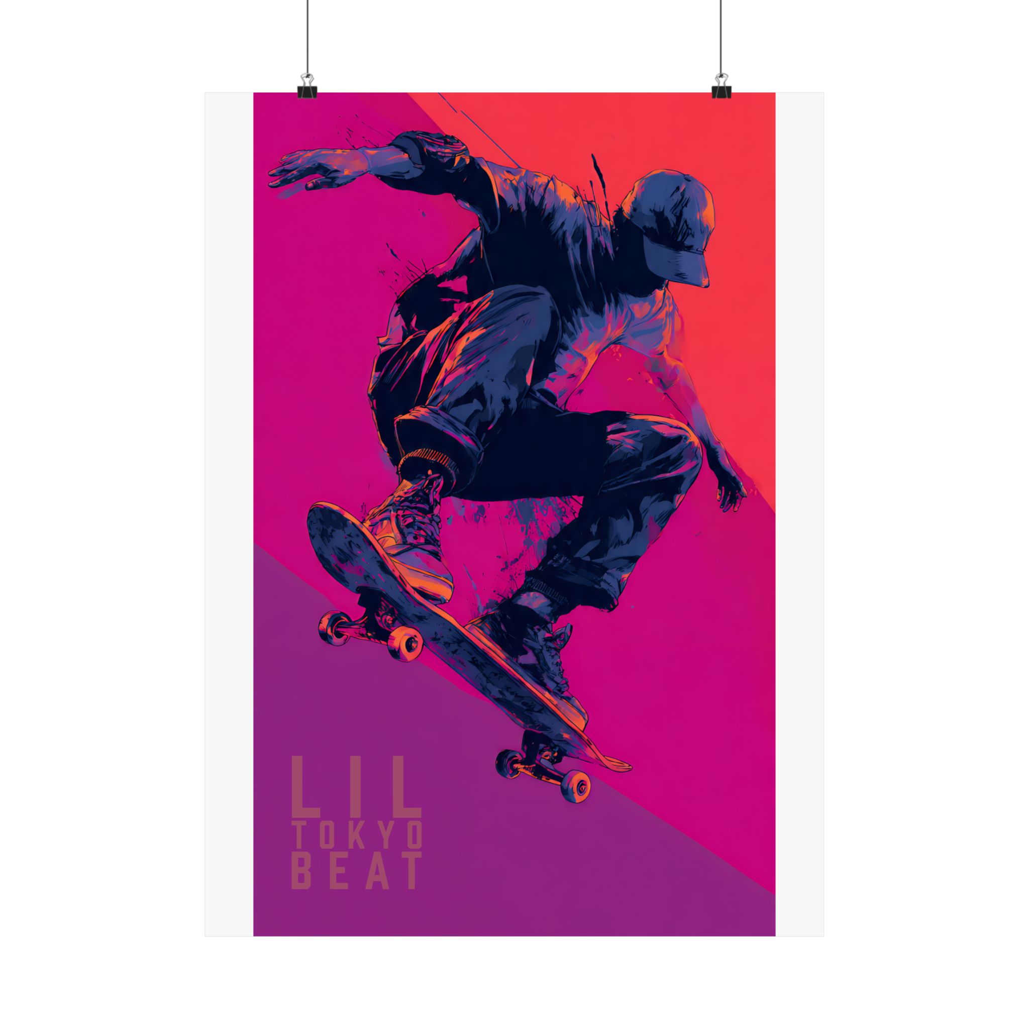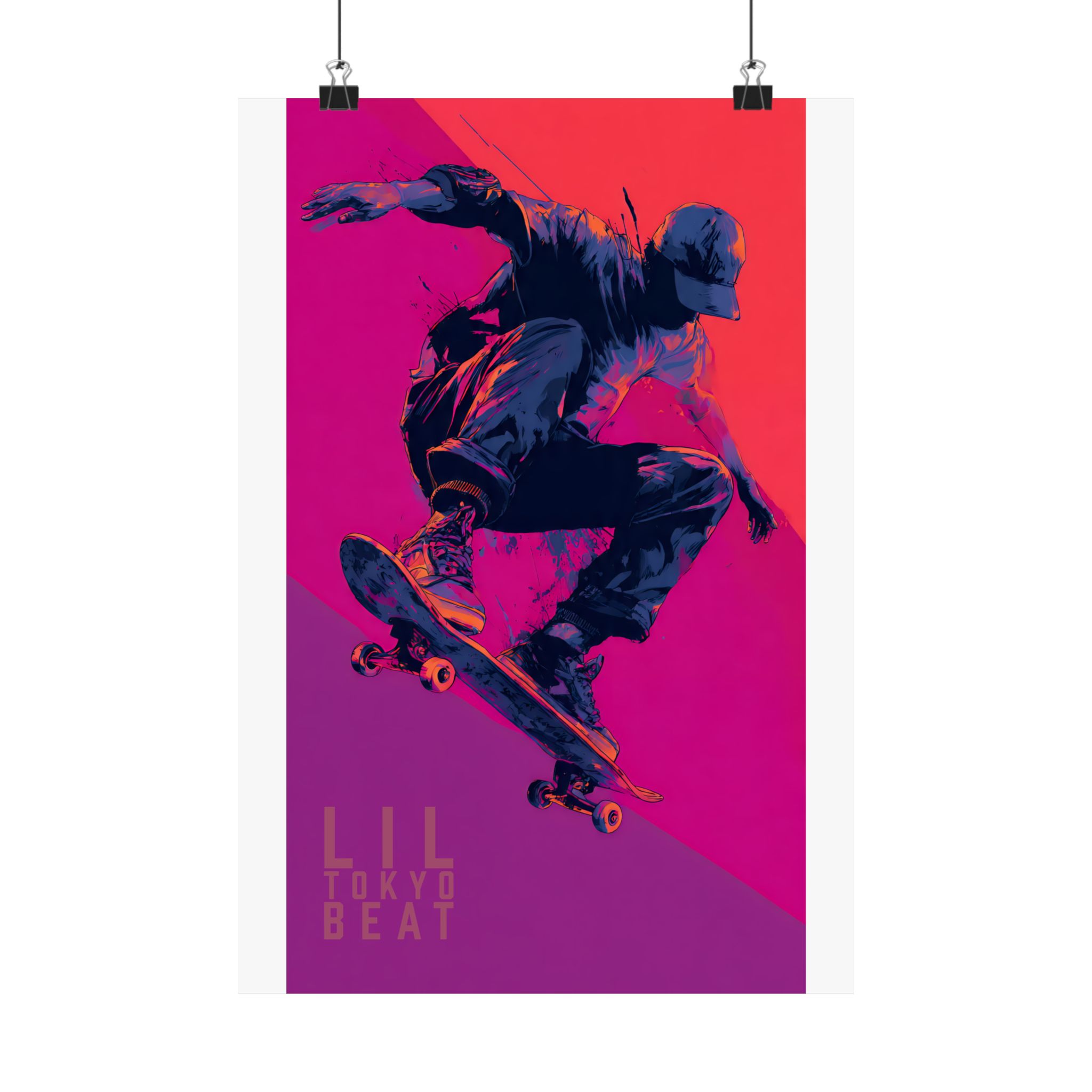High-energy movement captured in bold neon color. This Lil Tokyo Beat skateboard poster features a dynamic mid-air trick set against a vibrant pink-to-purple gradient backdrop. The dramatic lighting and expressive brush textures give it a cinematic, street-art edge that feels both modern and timeless. Perfect for bedrooms, studios, dorm rooms, game rooms, or urban-inspired interiors, this artwork adds instant motion and attitude to your space. Kool. Artful. Timeless. design energy from Lil Tokyo Beat — A New Voice in Tee Culture, now expanding into bold statement wall art.