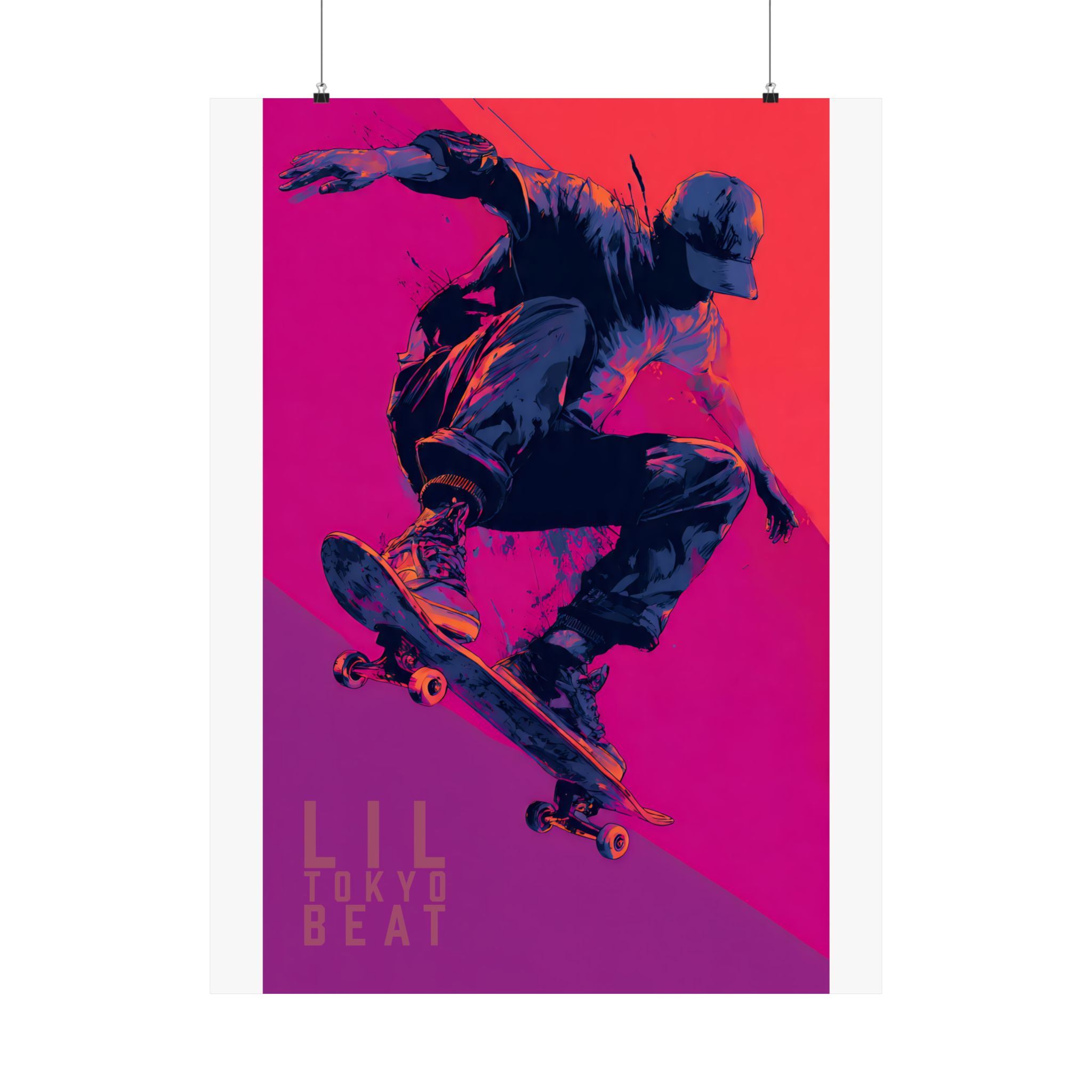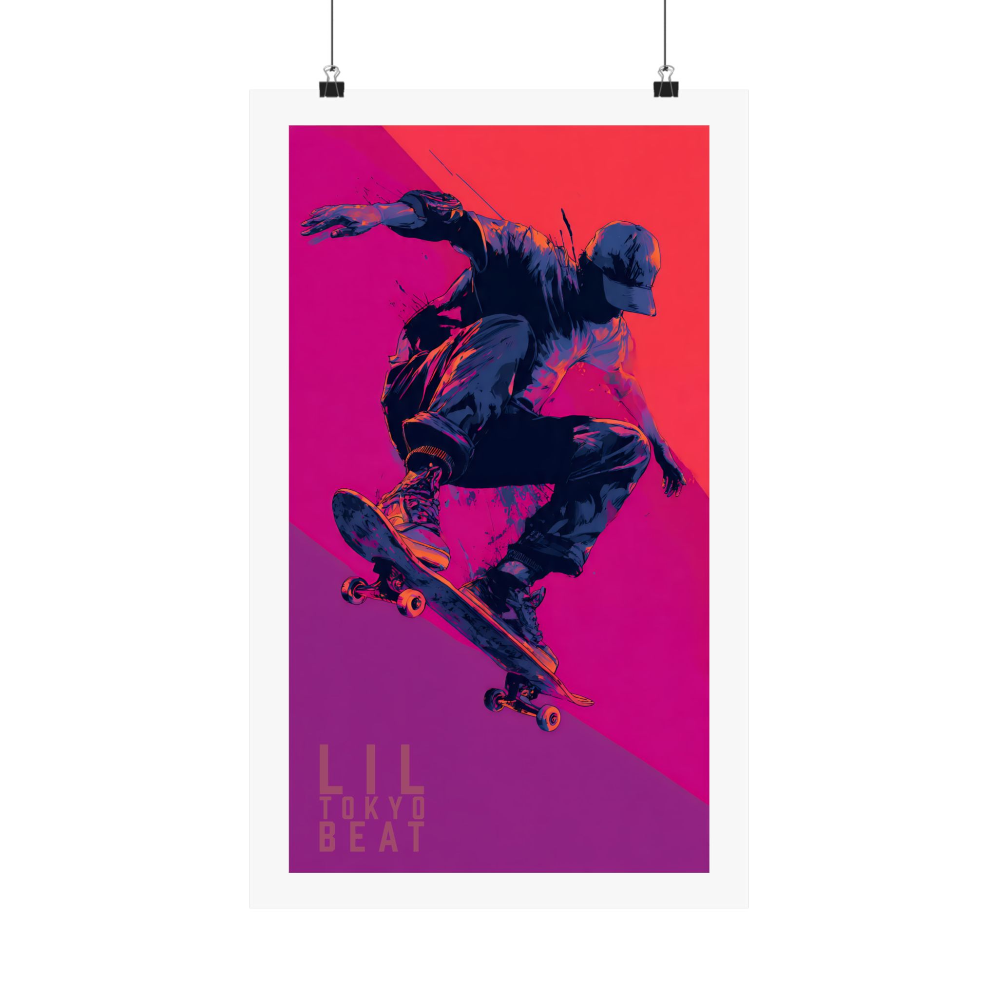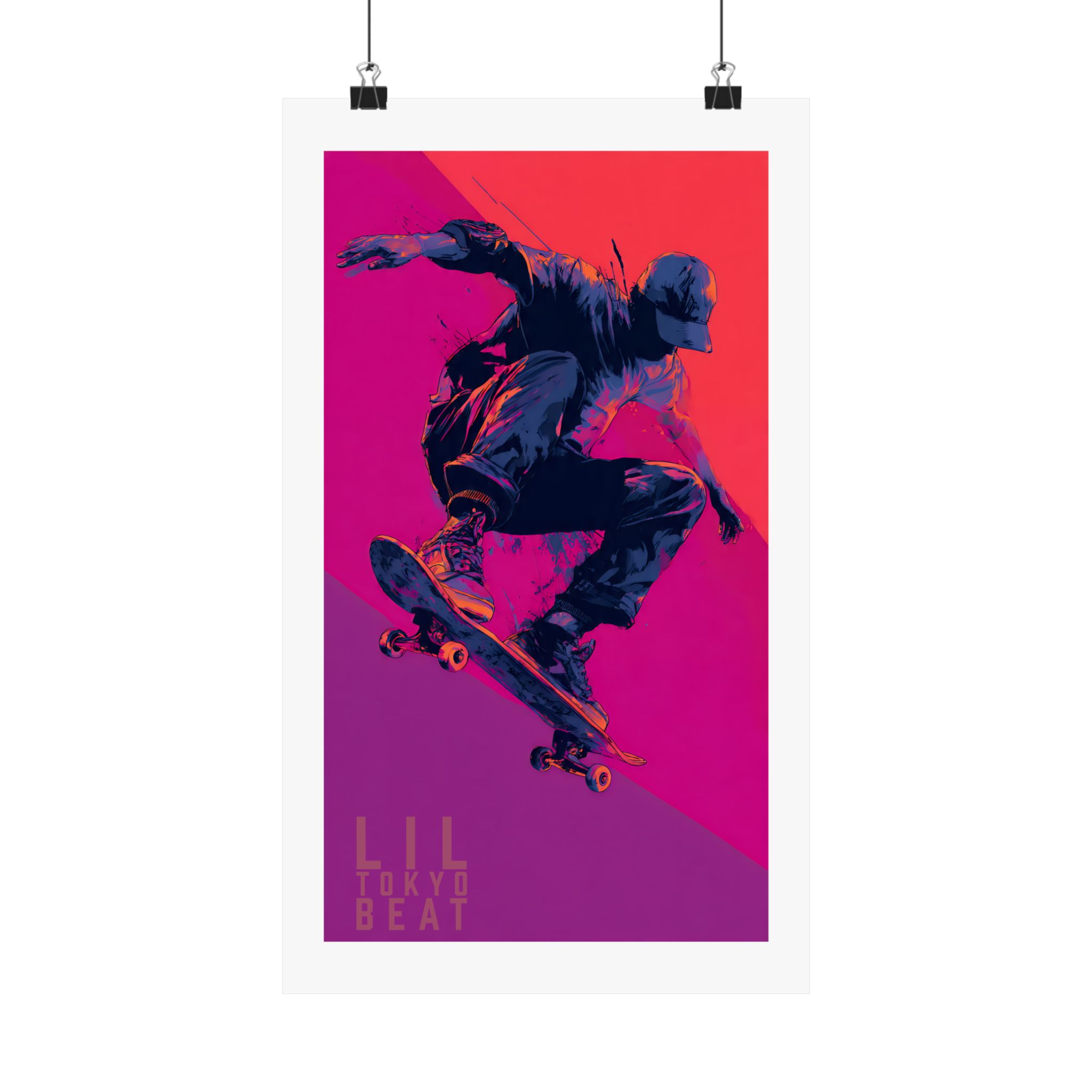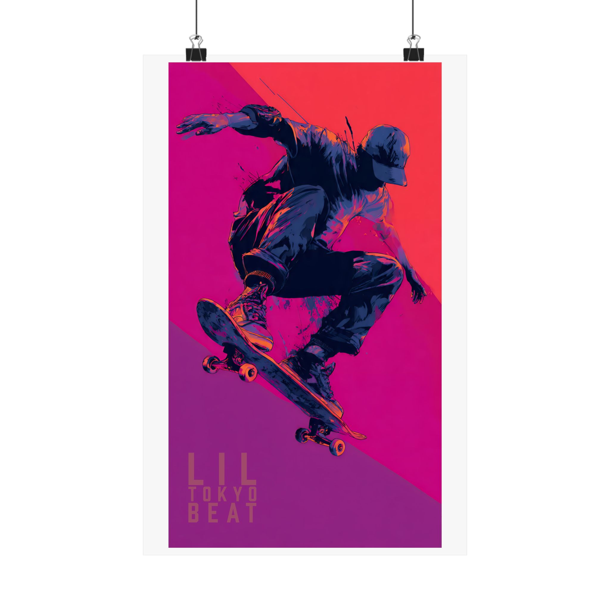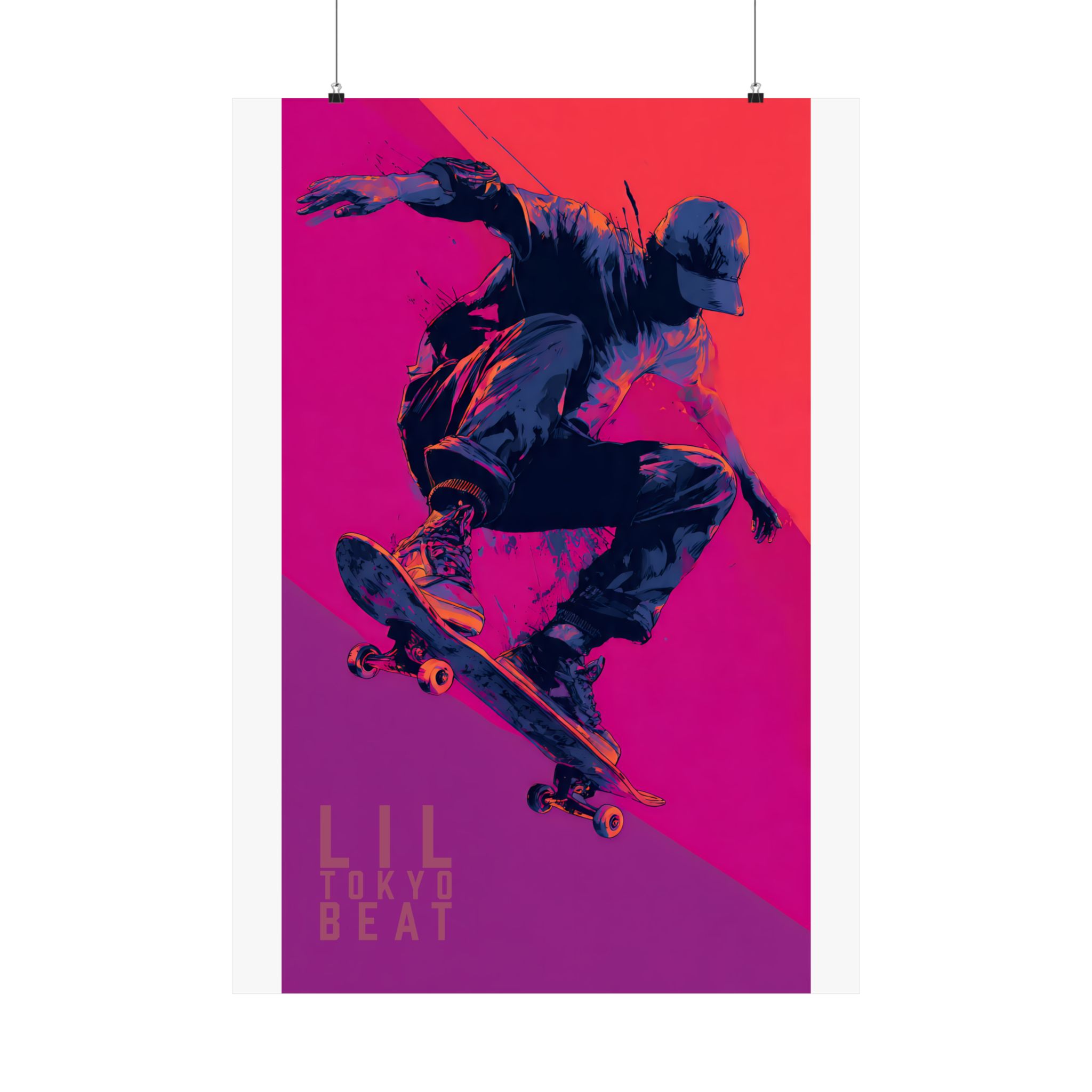 High-energy movement captured in bold neon color. This Lil Tokyo Beat skateboard poster features a dynamic mid-air trick set against a vibrant pink-to-purple gradient backdrop. The dramatic lighting and expressive brush textures give it a cinematic, street-art edge that feels both modern and timeless. Perfect for bedrooms, studios, dorm rooms, game rooms, or urban-inspired interiors, this artwork adds instant motion and attitude to your space. Kool. Artful. Timeless. design energy from Lil Tokyo Beat — A New Voice in Tee Culture, now expanding into bold statement wall art.