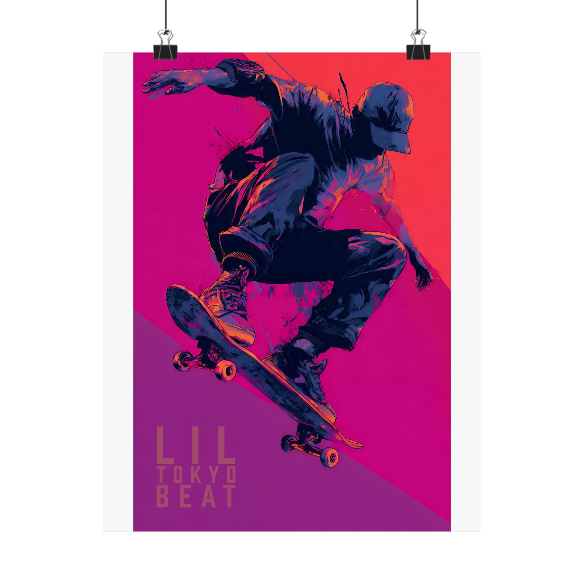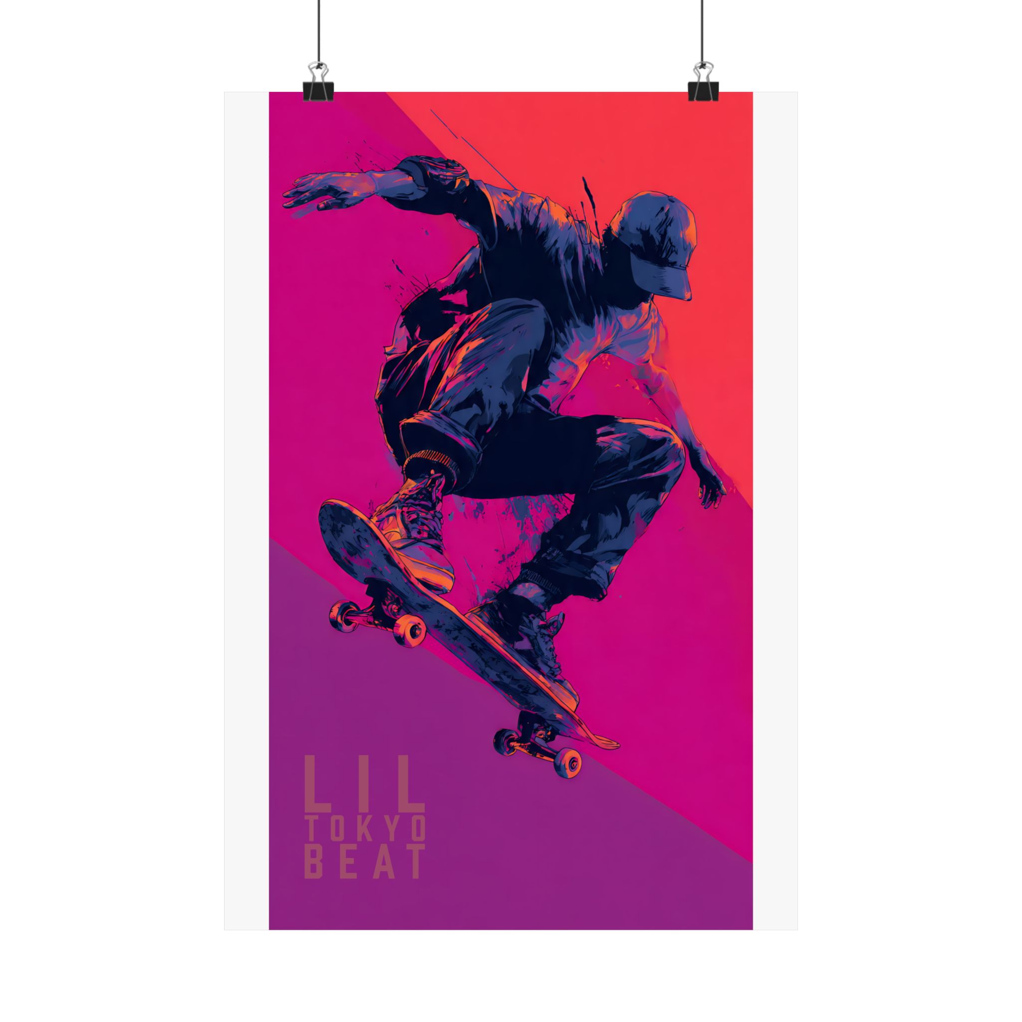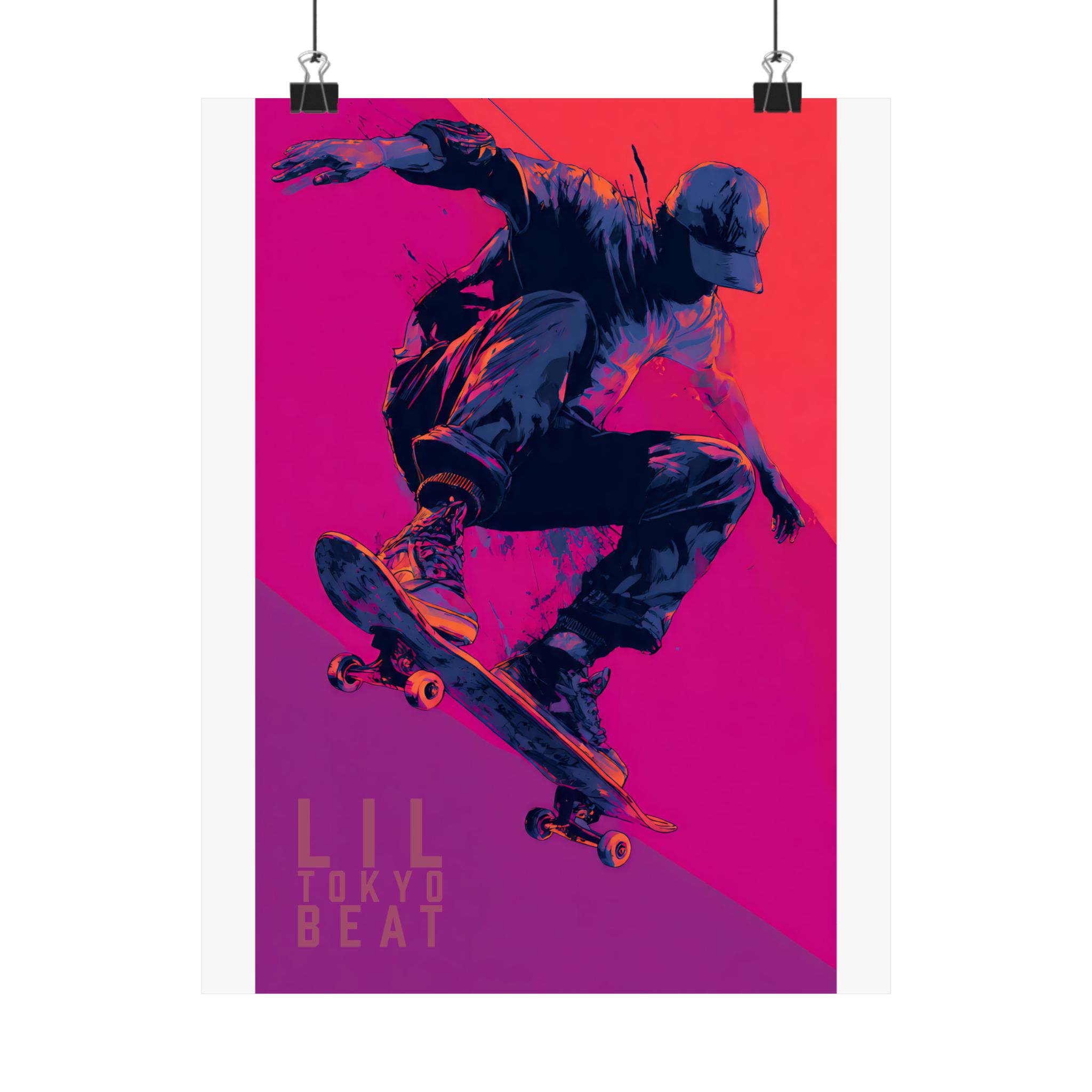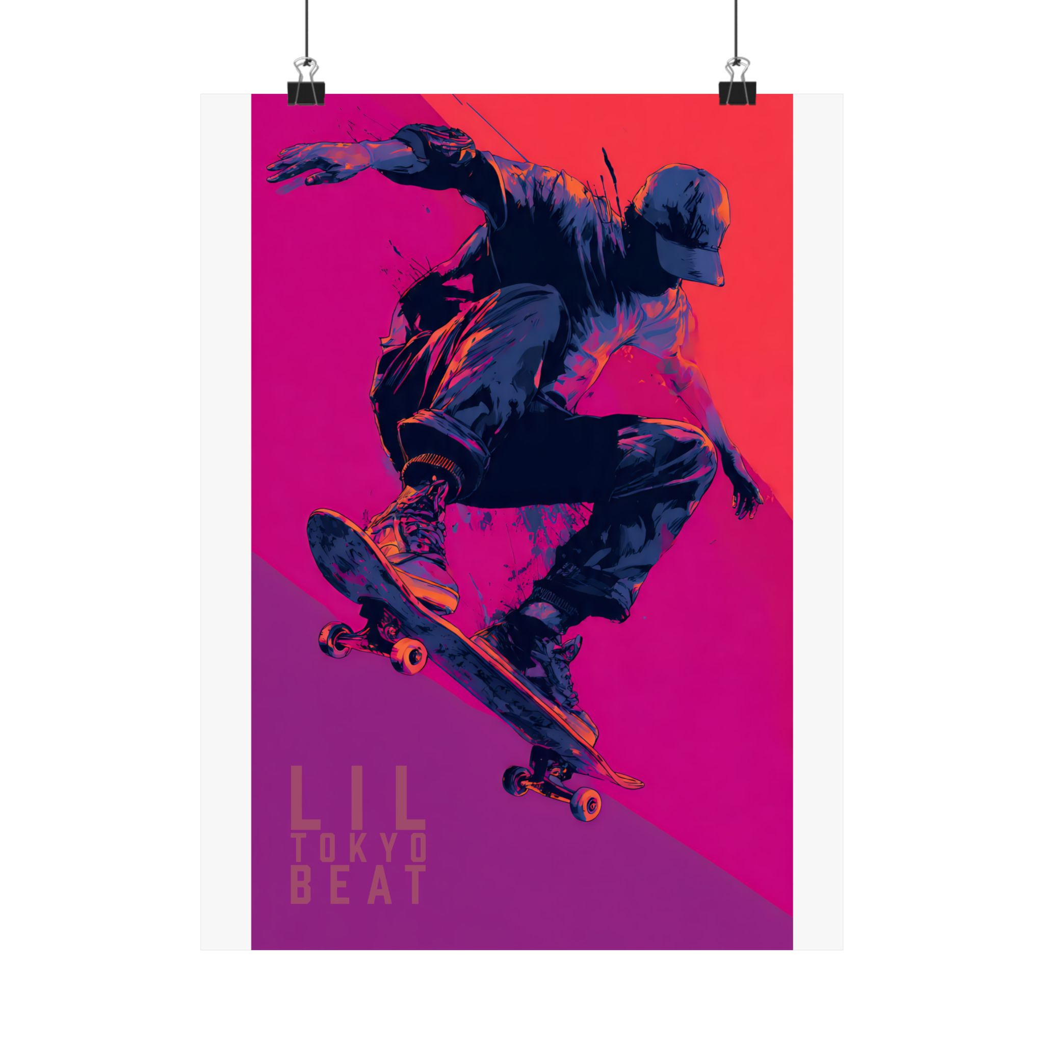 High-energy movement captured in bold neon color. This Lil Tokyo Beat skateboard poster features a dynamic mid-air trick set against a vibrant pink-to-purple gradient backdrop. The dramatic lighting and expressive brush textures give it a cinematic, street-art edge that feels both modern and timeless. Perfect for bedrooms, studios, dorm rooms, game rooms, or urban-inspired interiors, this artwork adds instant motion and attitude to your space. Kool. Artful. Timeless. design energy from Lil Tokyo Beat — A New Voice in Tee Culture, now expanding into bold statement wall art.