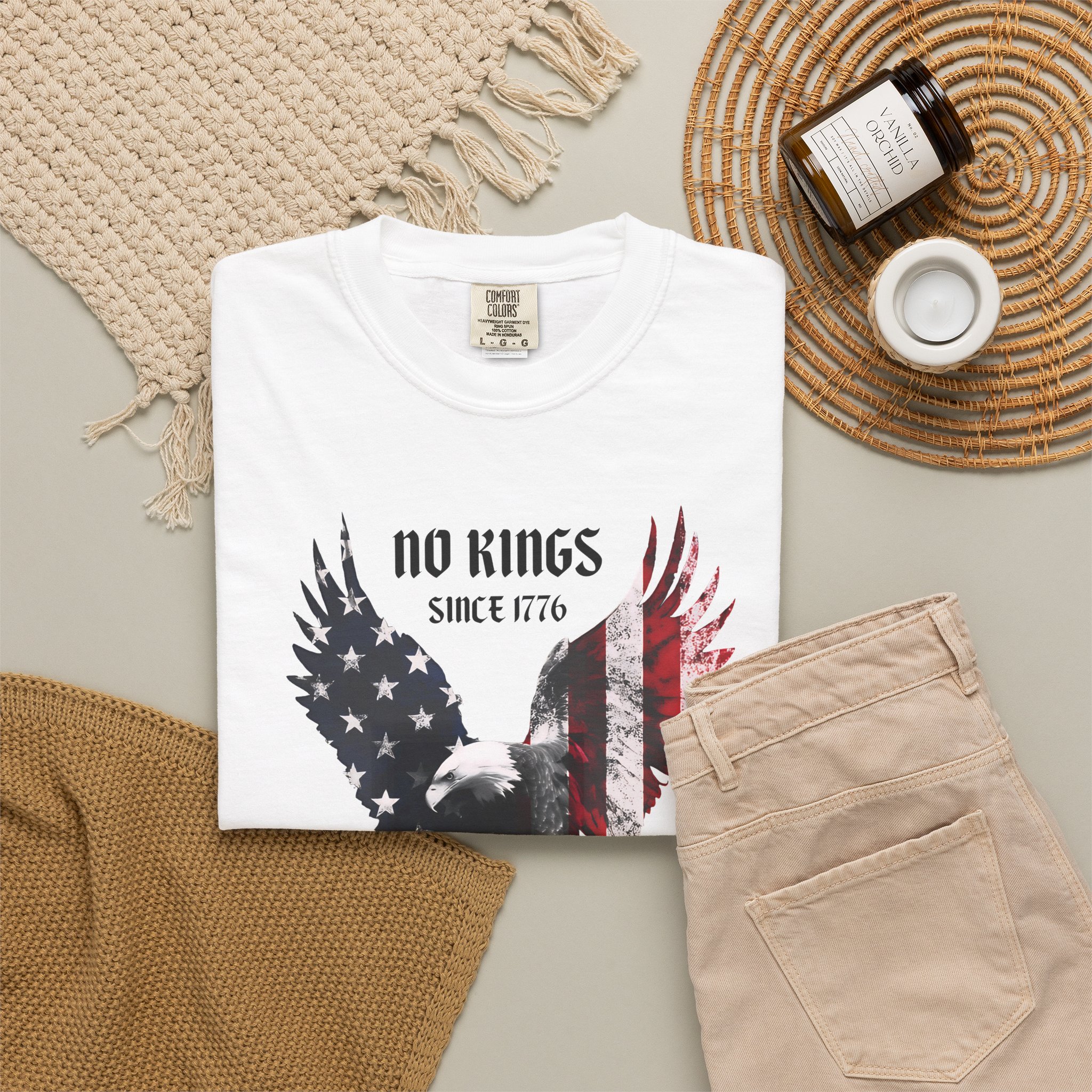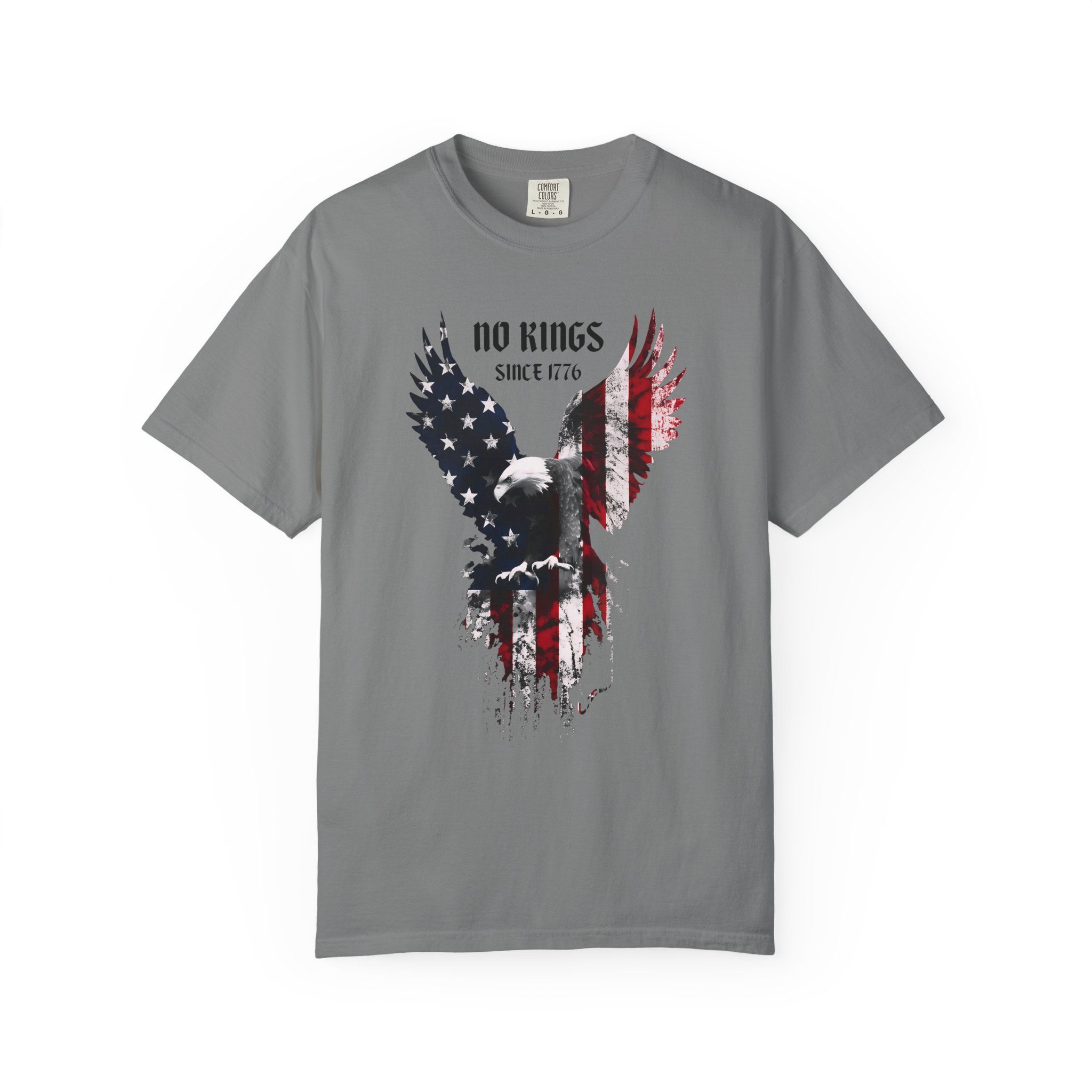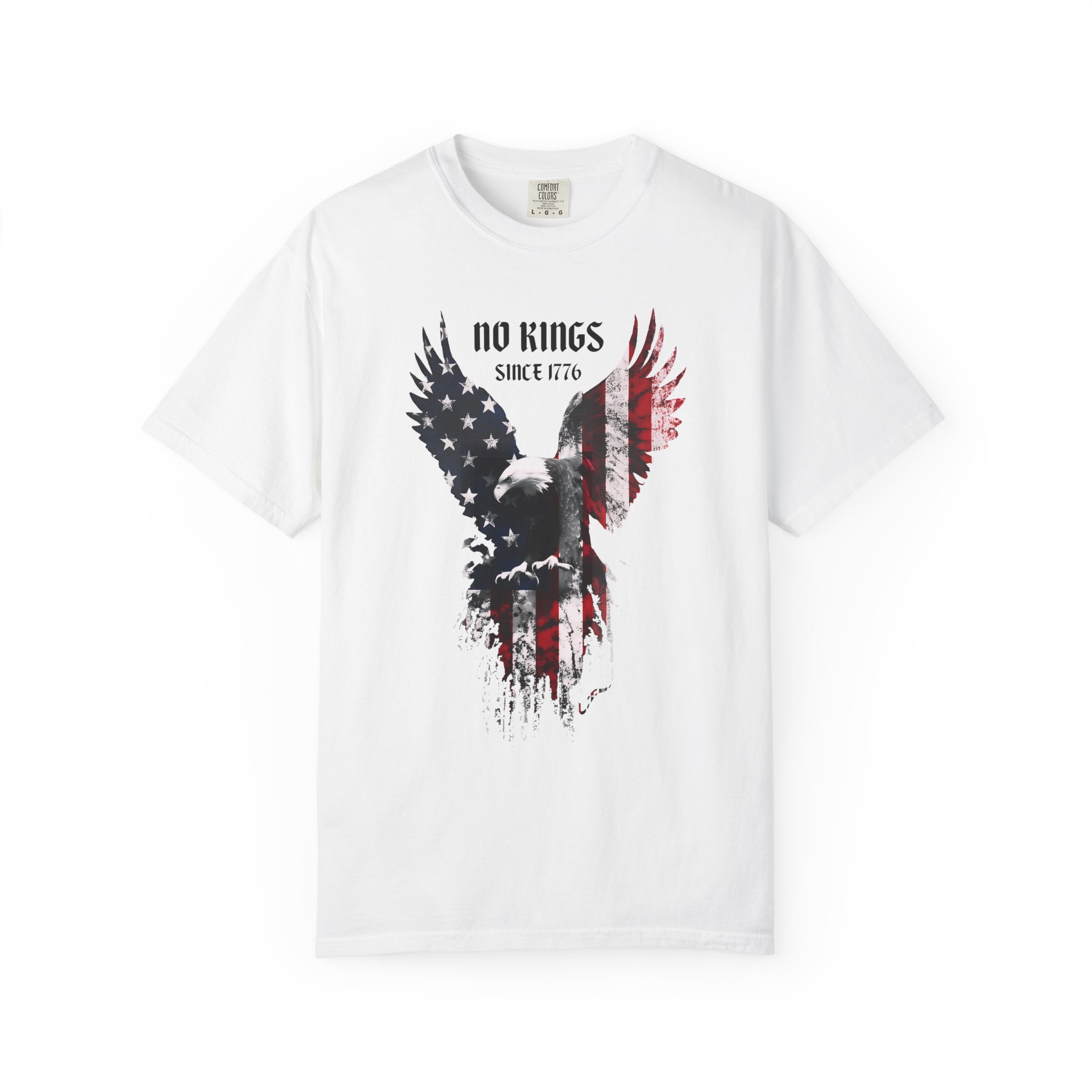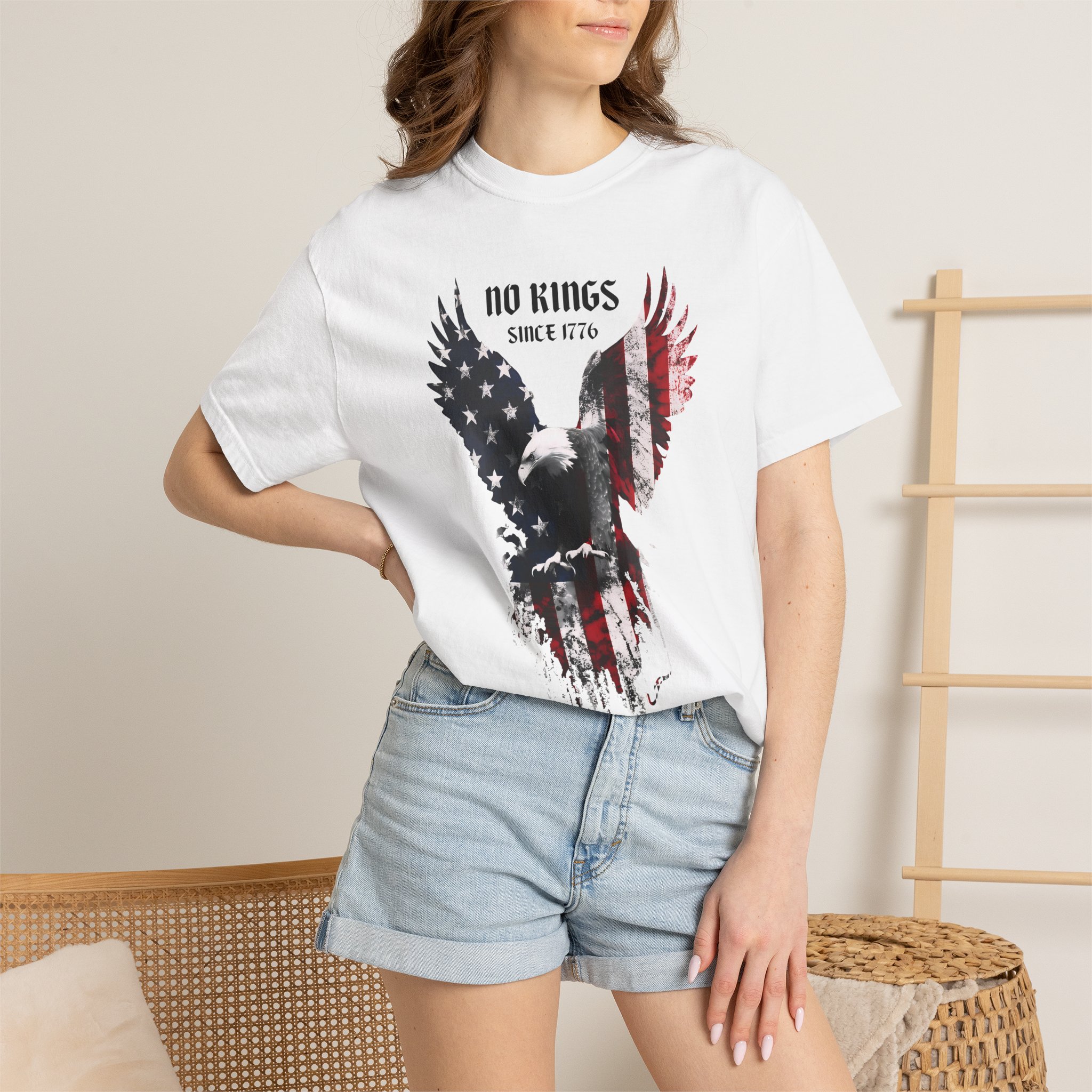 Show bold independence and classic American spirit with this powerful graphic T-shirt from Lil Tokyo Beat. The design features a striking bald eagle with wings spread wide, overlaid in vivid red, white, and blue for a dynamic flag‑inspired look. Above the artwork, the phrase “NO KINGS SINCE 1776” delivers a confident message rooted in freedom, history, and national identity. The high‑contrast illustration and patriotic symbolism make this tee perfect for fans of Americana, bold graphics, and streetwear that blends attitude with meaning. Whether worn for holidays, weekend hangs, outdoor events, or everyday style, this tee embodies the Lil Tokyo Beat philosophy—Kool. Artful. Timeless.—and continues the brand’s mission as A New Voice in Tee Culture.