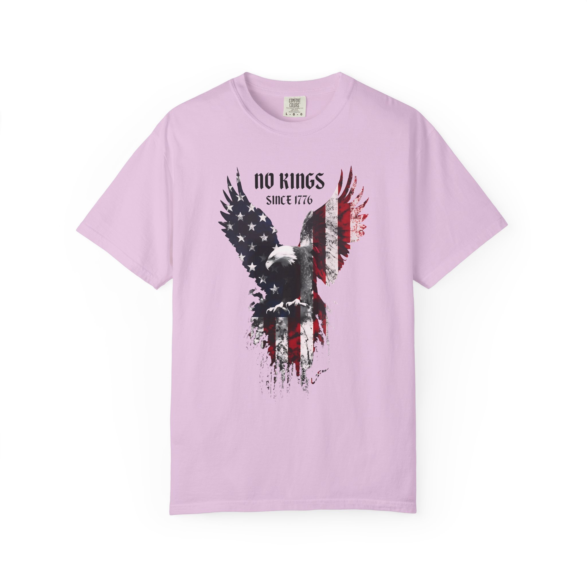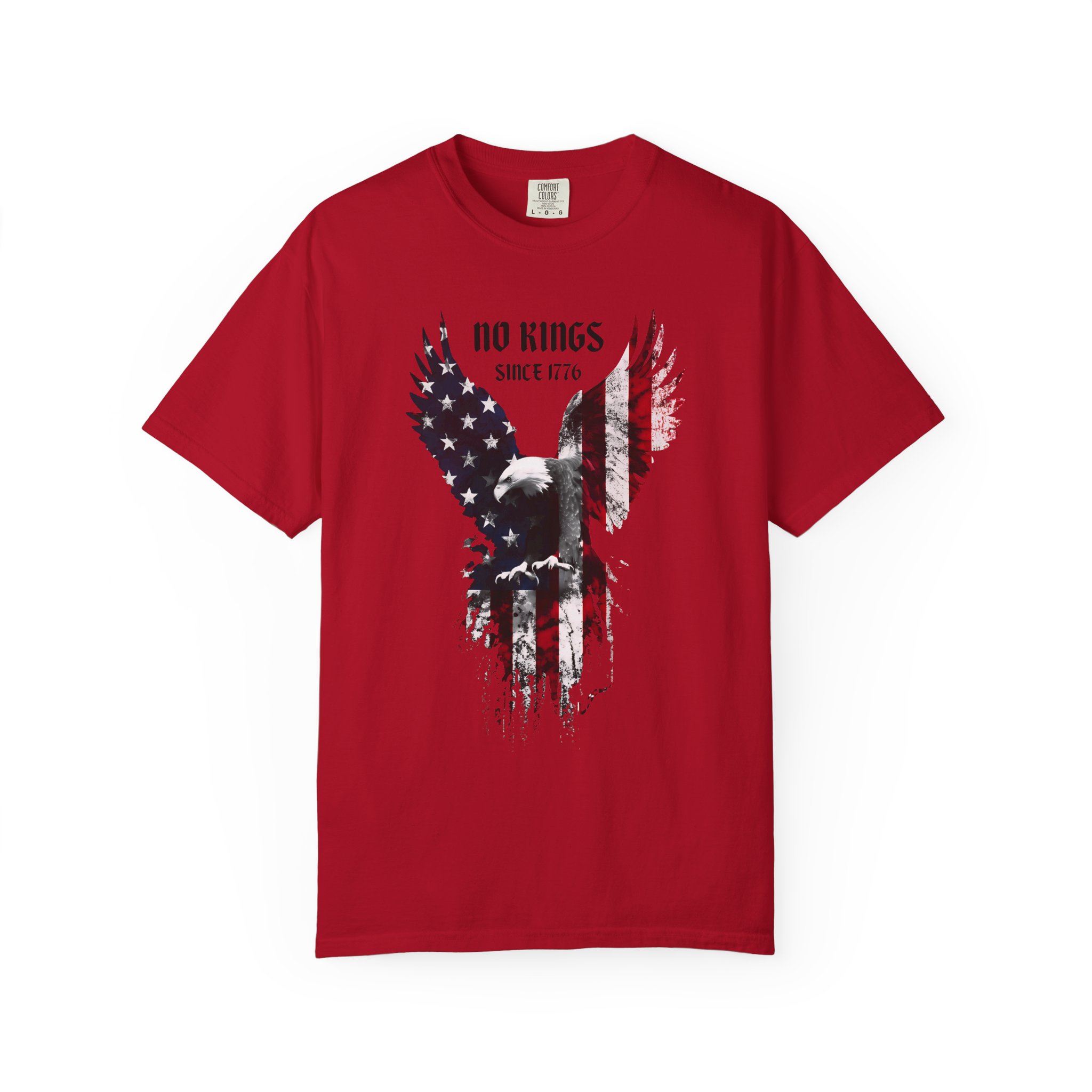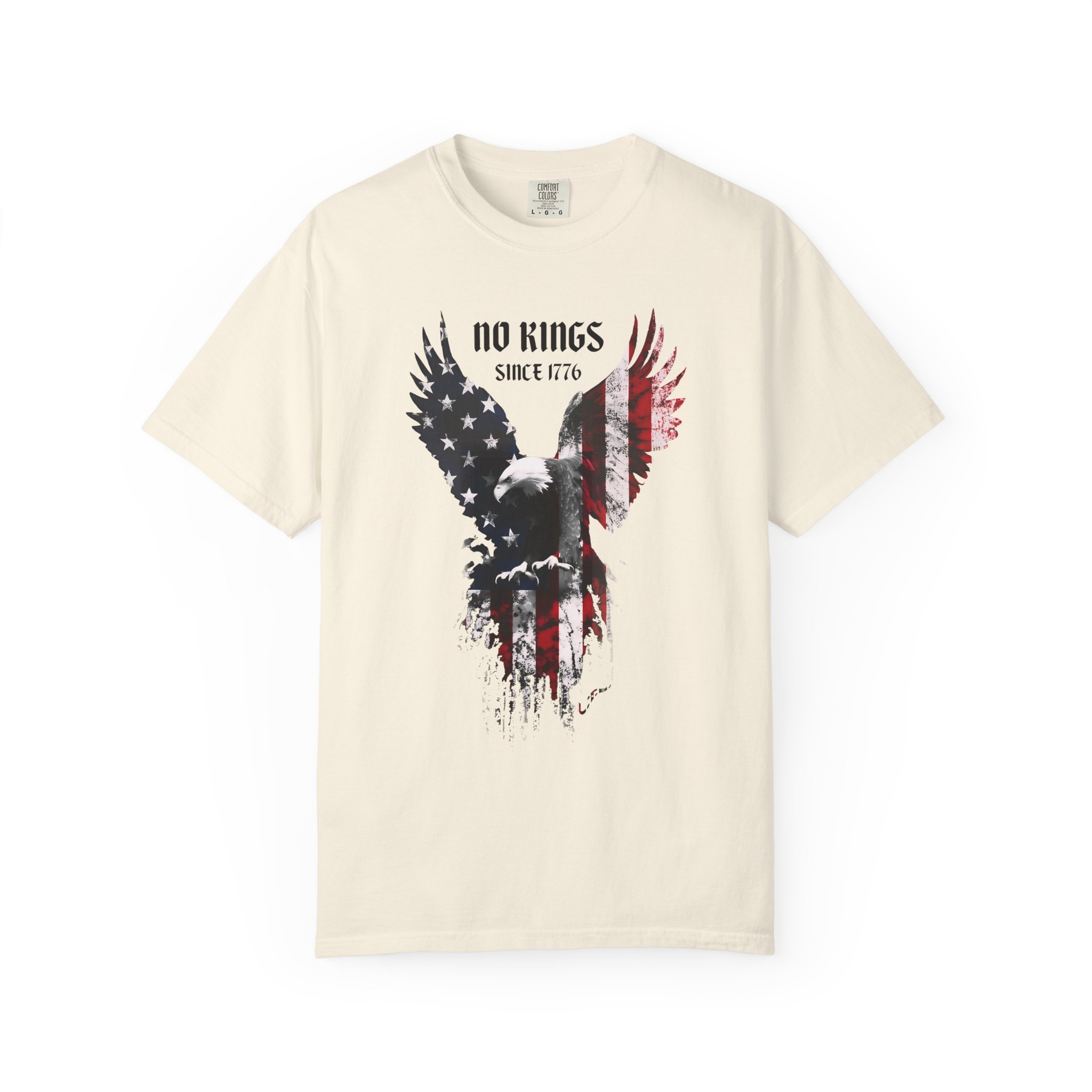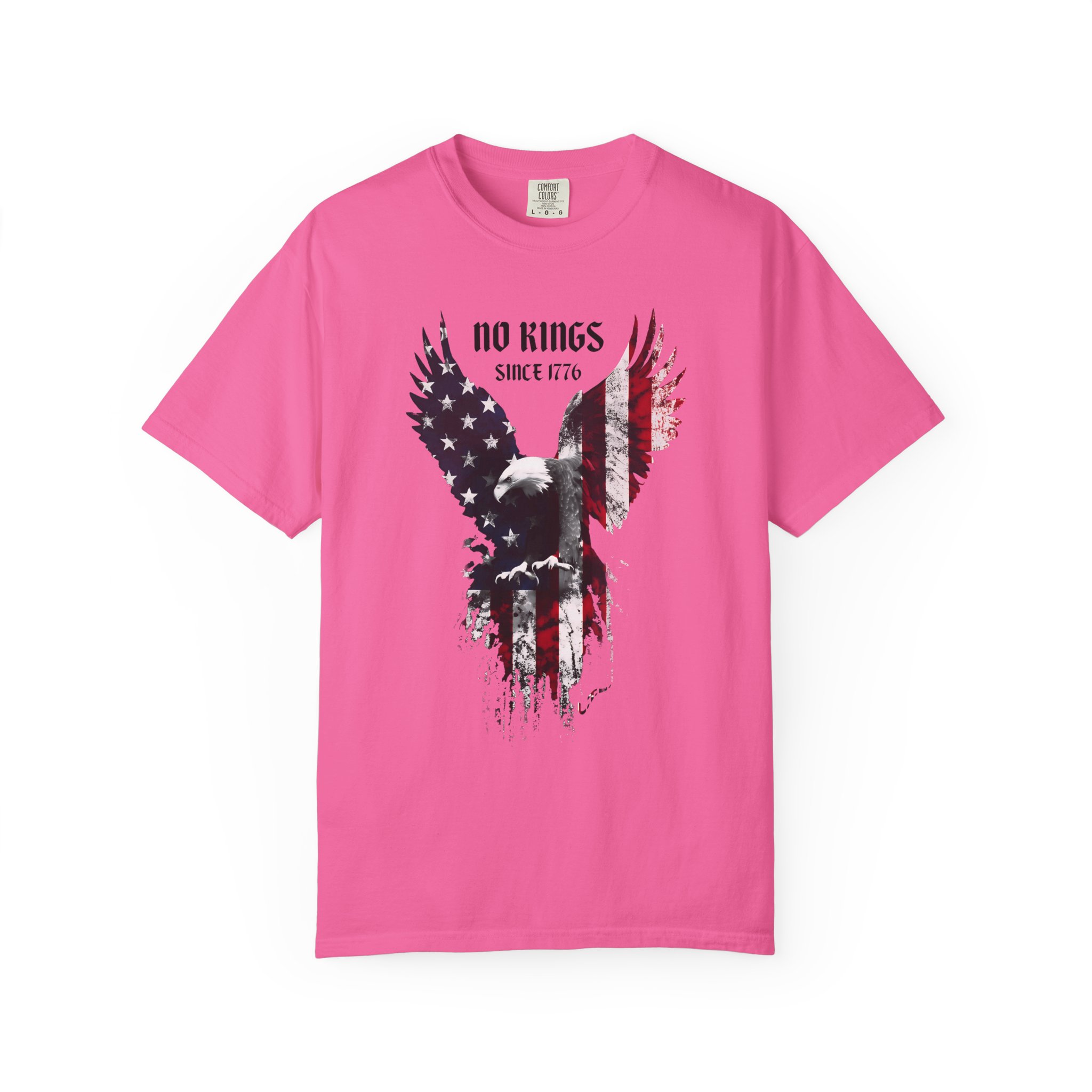 Show bold independence and classic American spirit with this powerful graphic T-shirt from Lil Tokyo Beat. The design features a striking bald eagle with wings spread wide, overlaid in vivid red, white, and blue for a dynamic flag‑inspired look. Above the artwork, the phrase “NO KINGS SINCE 1776” delivers a confident message rooted in freedom, history, and national identity. The high‑contrast illustration and patriotic symbolism make this tee perfect for fans of Americana, bold graphics, and streetwear that blends attitude with meaning. Whether worn for holidays, weekend hangs, outdoor events, or everyday style, this tee embodies the Lil Tokyo Beat philosophy—Kool. Artful. Timeless.—and continues the brand’s mission as A New Voice in Tee Culture.