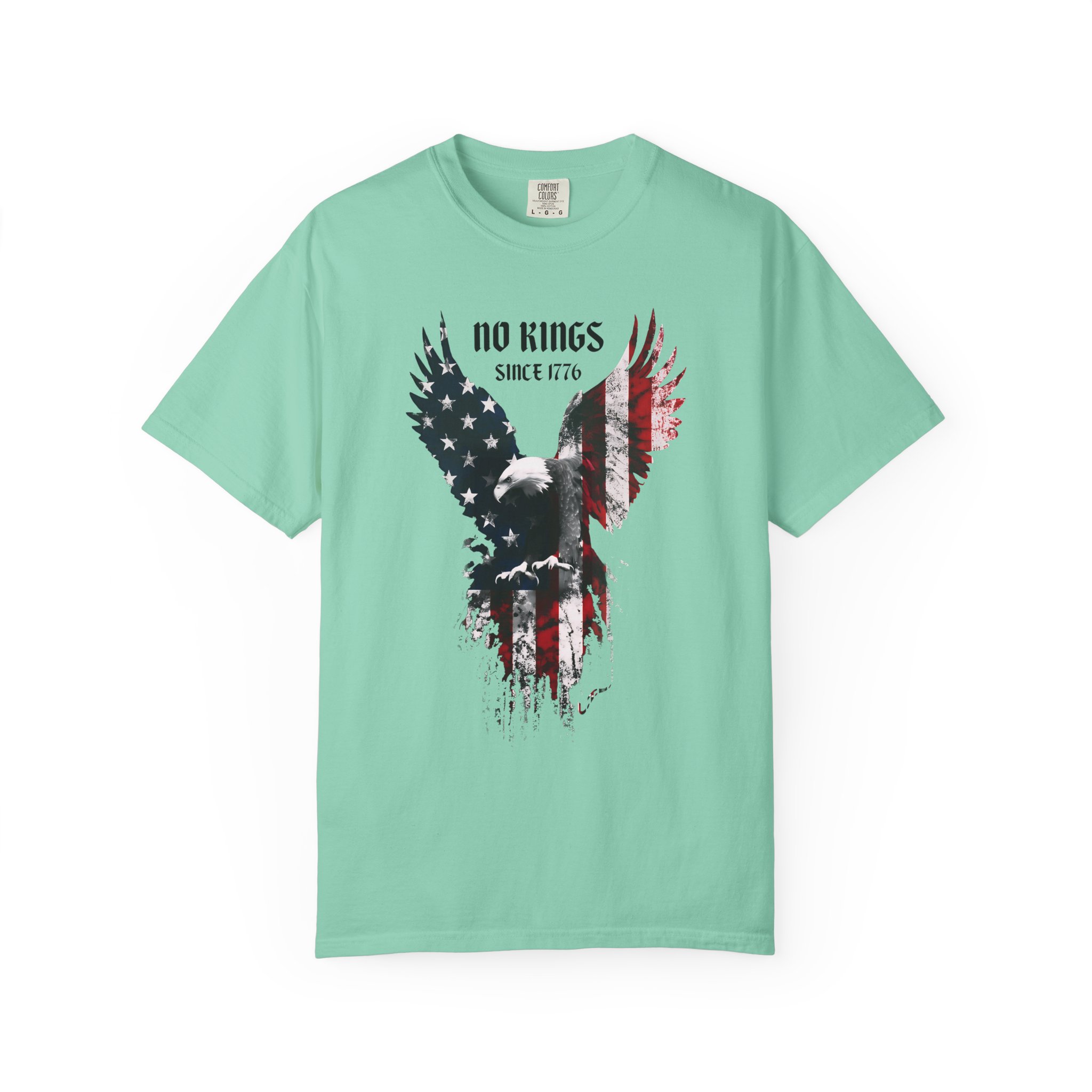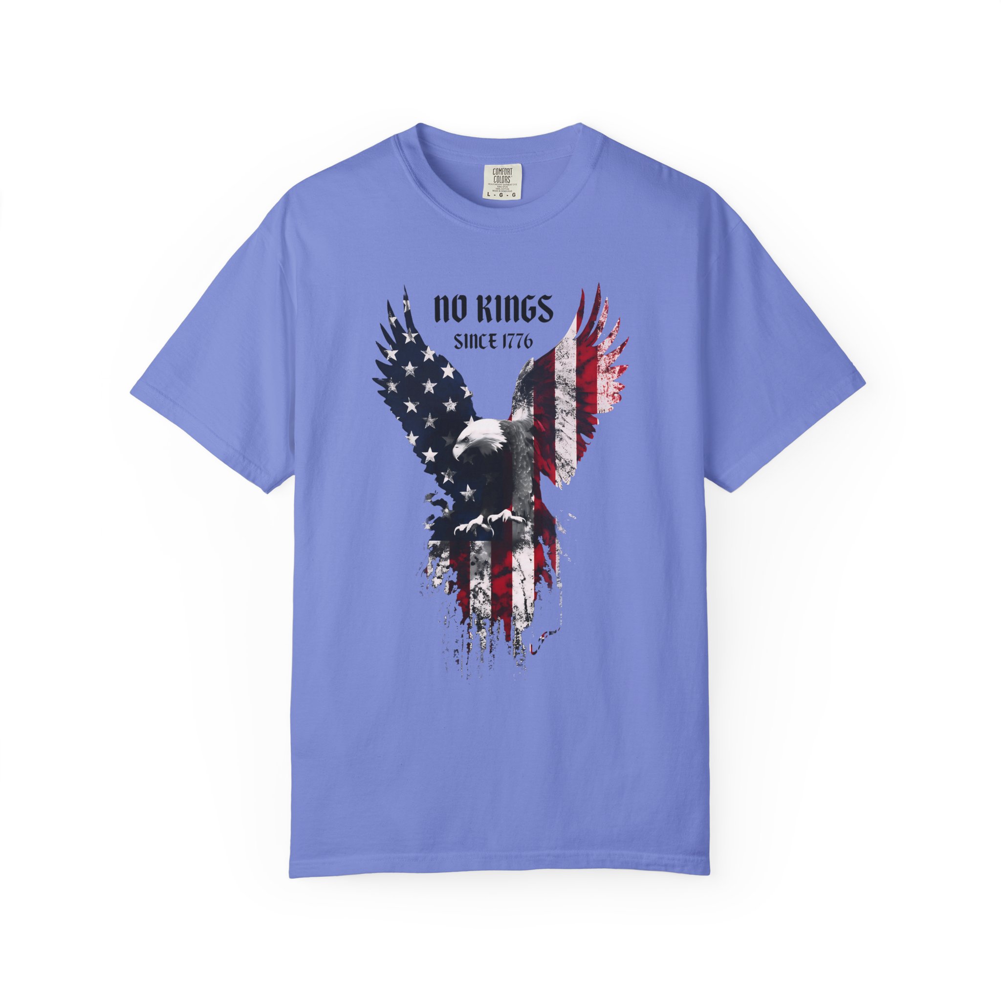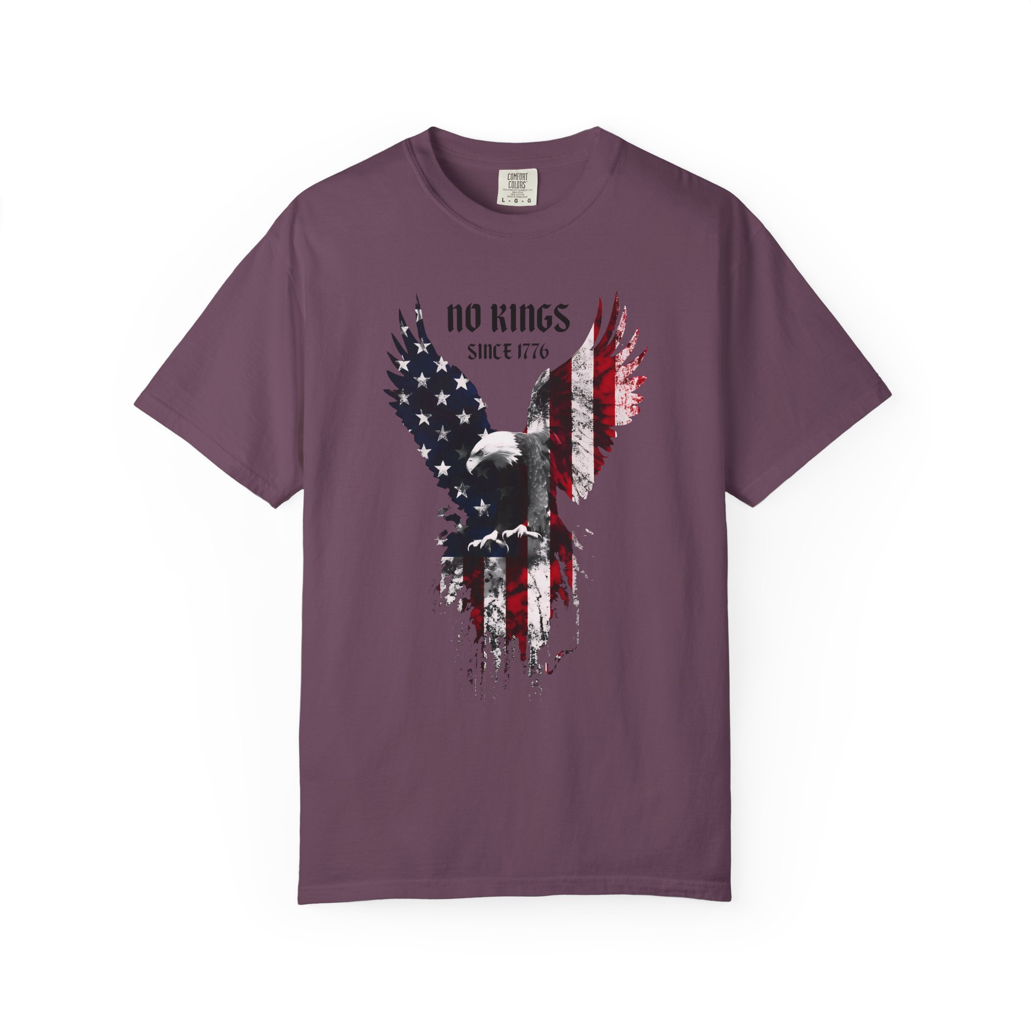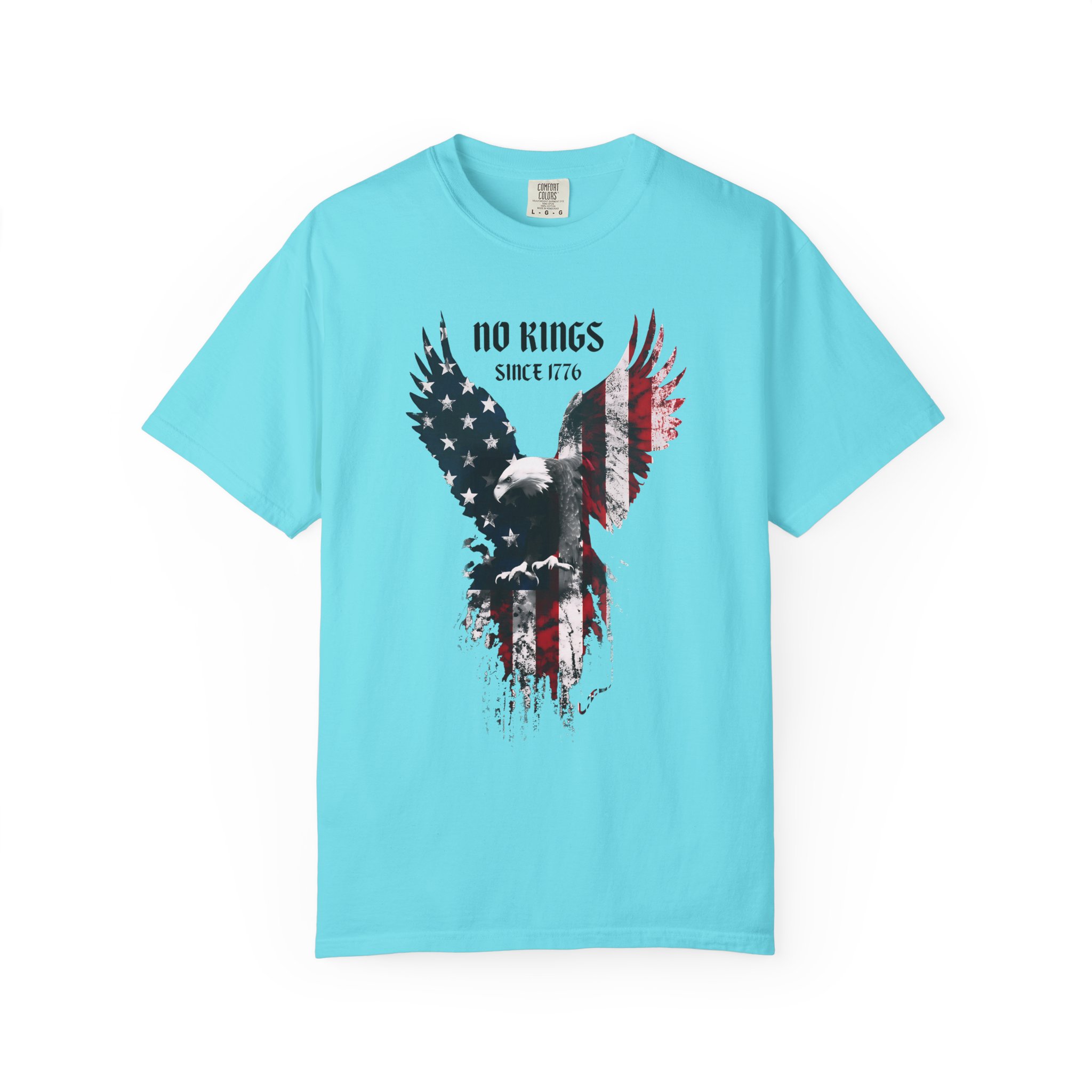 Show bold independence and classic American spirit with this powerful graphic T-shirt from Lil Tokyo Beat. The design features a striking bald eagle with wings spread wide, overlaid in vivid red, white, and blue for a dynamic flag‑inspired look. Above the artwork, the phrase “NO KINGS SINCE 1776” delivers a confident message rooted in freedom, history, and national identity. The high‑contrast illustration and patriotic symbolism make this tee perfect for fans of Americana, bold graphics, and streetwear that blends attitude with meaning. Whether worn for holidays, weekend hangs, outdoor events, or everyday style, this tee embodies the Lil Tokyo Beat philosophy—Kool. Artful. Timeless.—and continues the brand’s mission as A New Voice in Tee Culture.