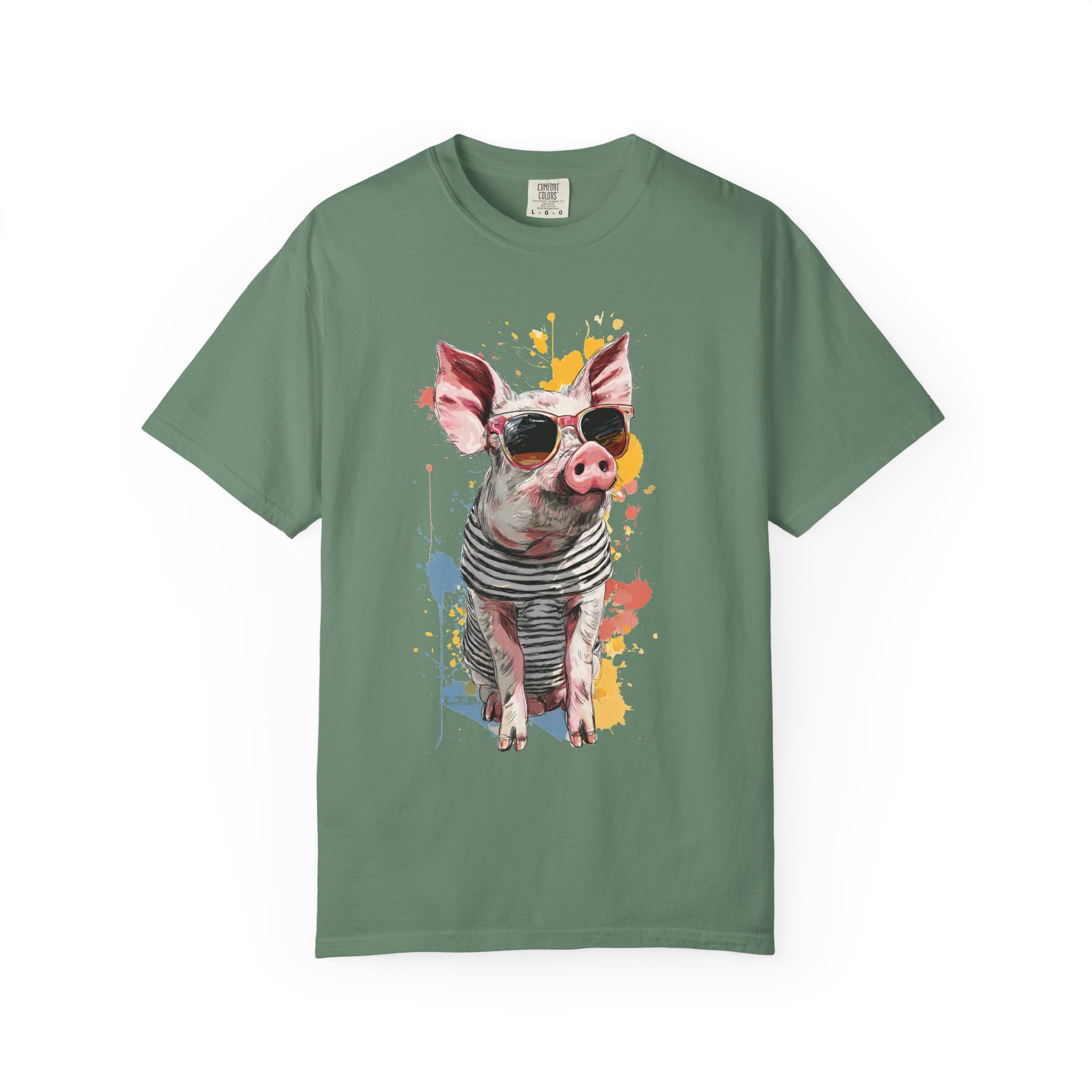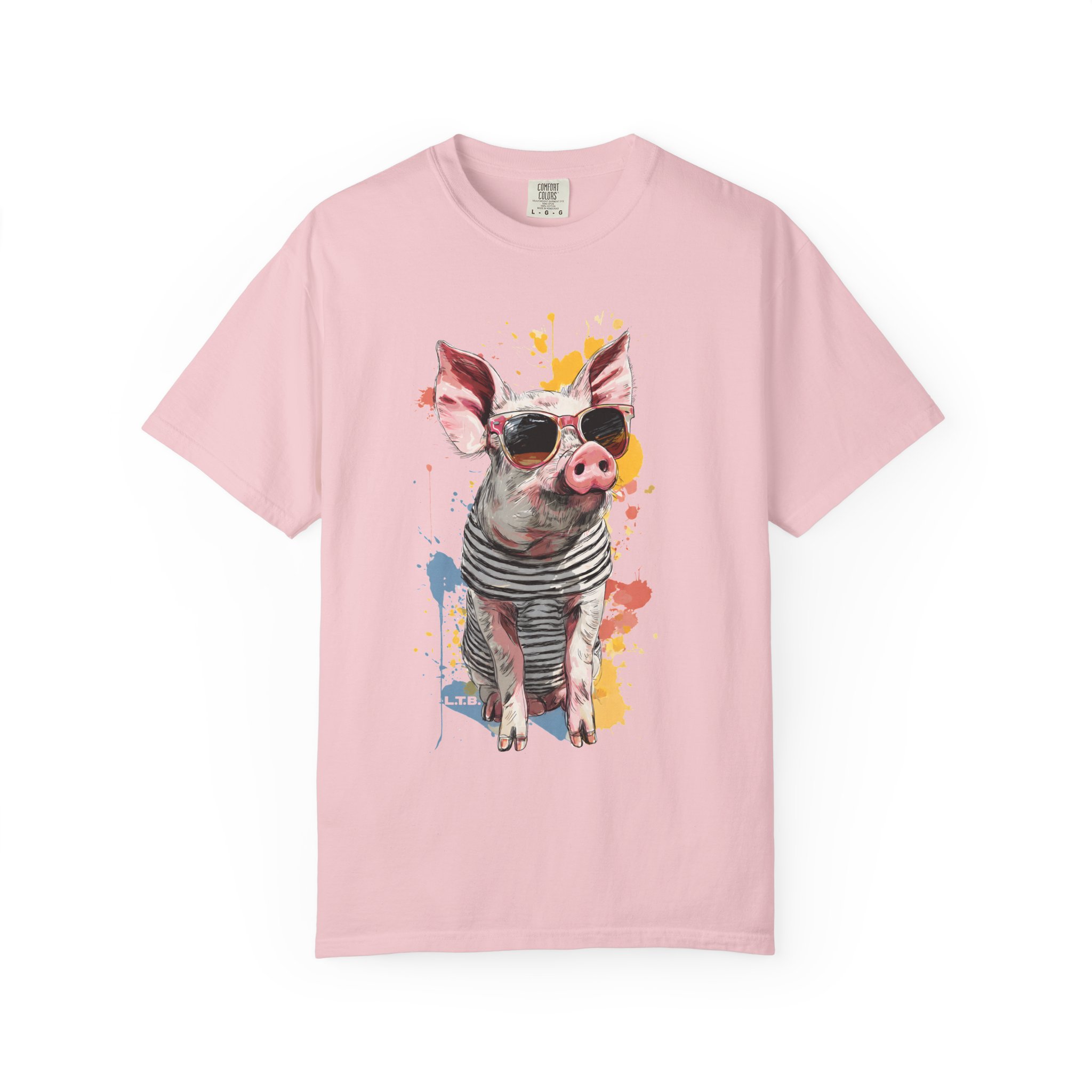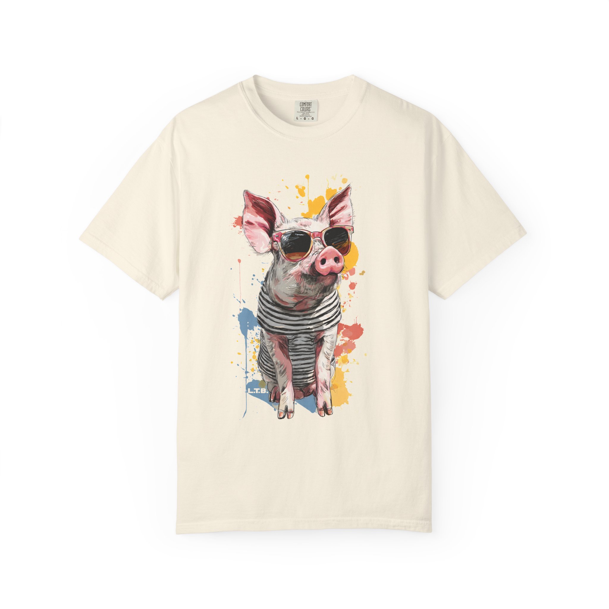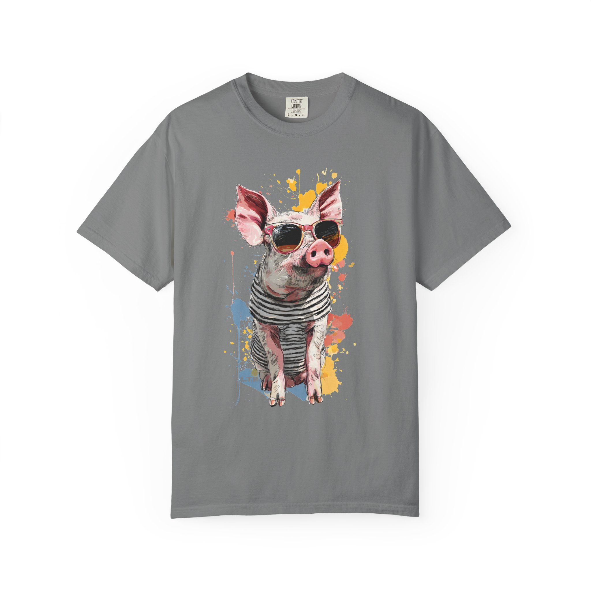 A relaxed, garment-dyed cotton tee that brings playful art to everyday wear. This heavyweight, tubular-knit shirt feels broken-in from the first wear — soft, substantial, and built to last. The front features a vibrant watercolor-style pig wearing sunglasses and a striped shirt, with splashes of color that read like a carefree street-art piece. It layers easily under a jacket or stands alone as the focal point of a casual outfit. Made with ring-spun cotton and double-needle stitching, it holds shape wash after wash while keeping a lived-in comfort. Whether you wear it to a weekend market, a casual hang with friends, or while tending a backyard garden, this tee adds a dash of humor and color to slow, easy days.