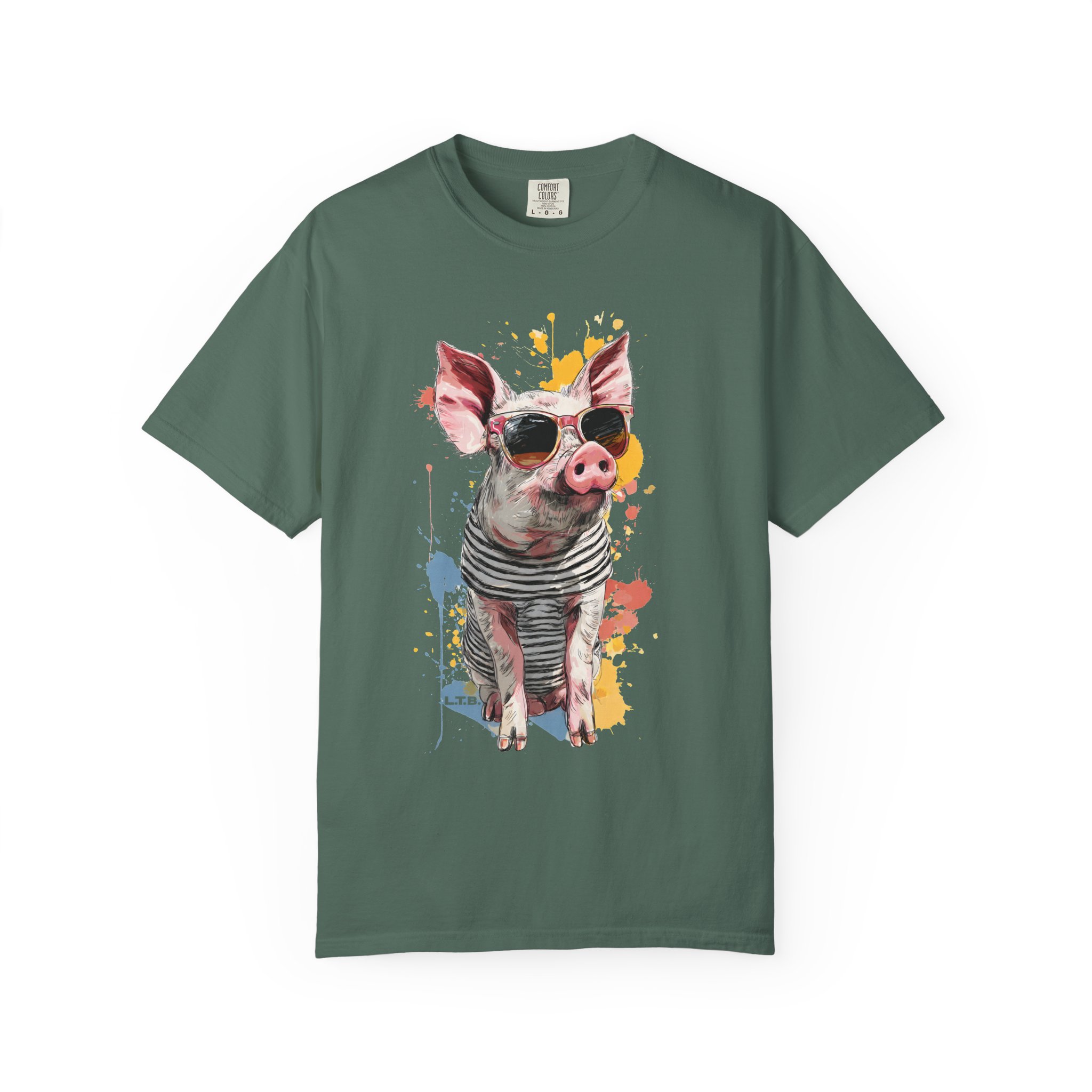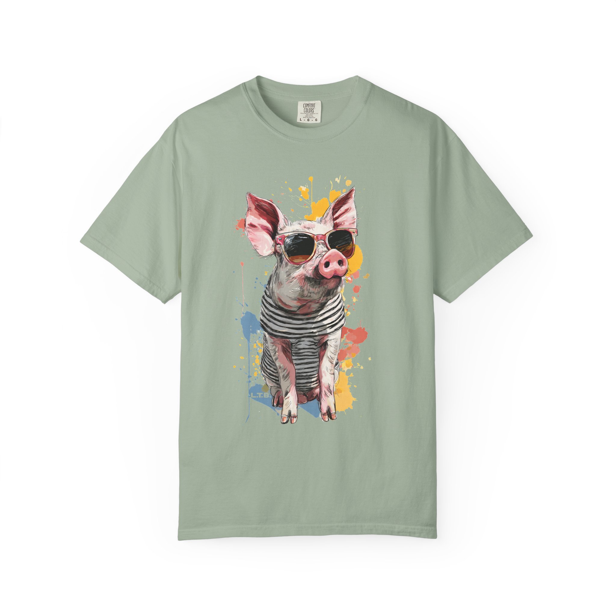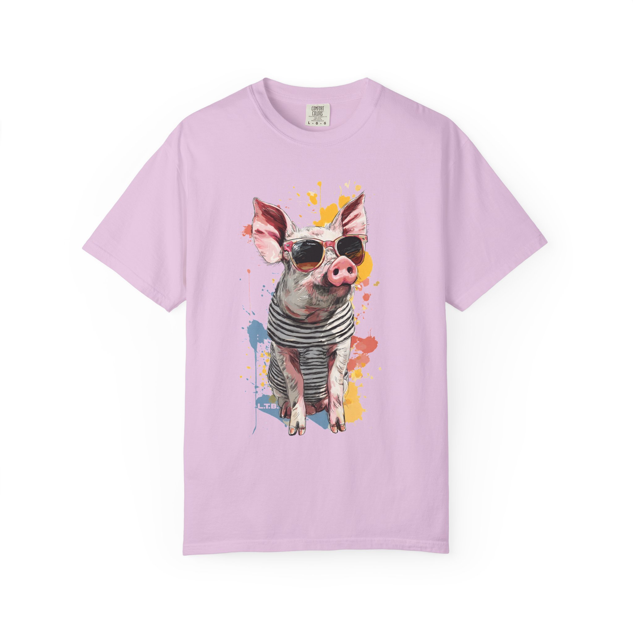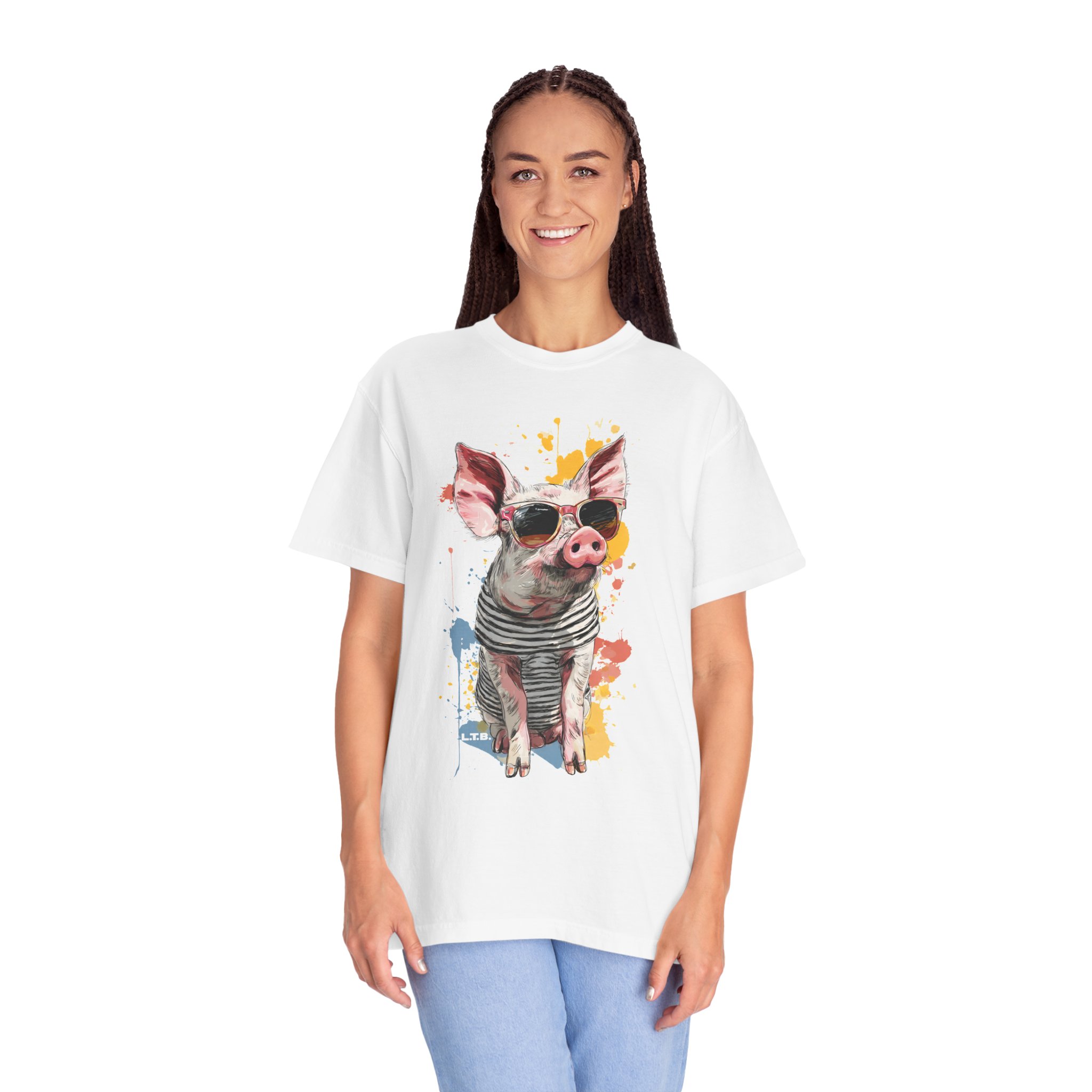 A relaxed, garment-dyed cotton tee that brings playful art to everyday wear. This heavyweight, tubular-knit shirt feels broken-in from the first wear — soft, substantial, and built to last. The front features a vibrant watercolor-style pig wearing sunglasses and a striped shirt, with splashes of color that read like a carefree street-art piece. It layers easily under a jacket or stands alone as the focal point of a casual outfit. Made with ring-spun cotton and double-needle stitching, it holds shape wash after wash while keeping a lived-in comfort. Whether you wear it to a weekend market, a casual hang with friends, or while tending a backyard garden, this tee adds a dash of humor and color to slow, easy days.