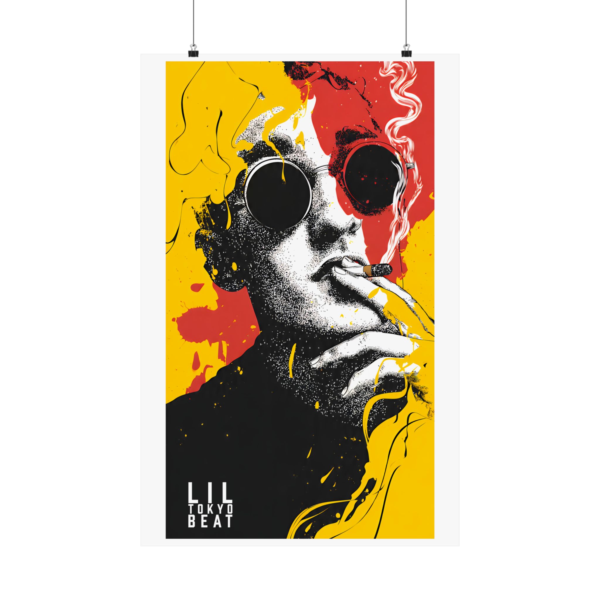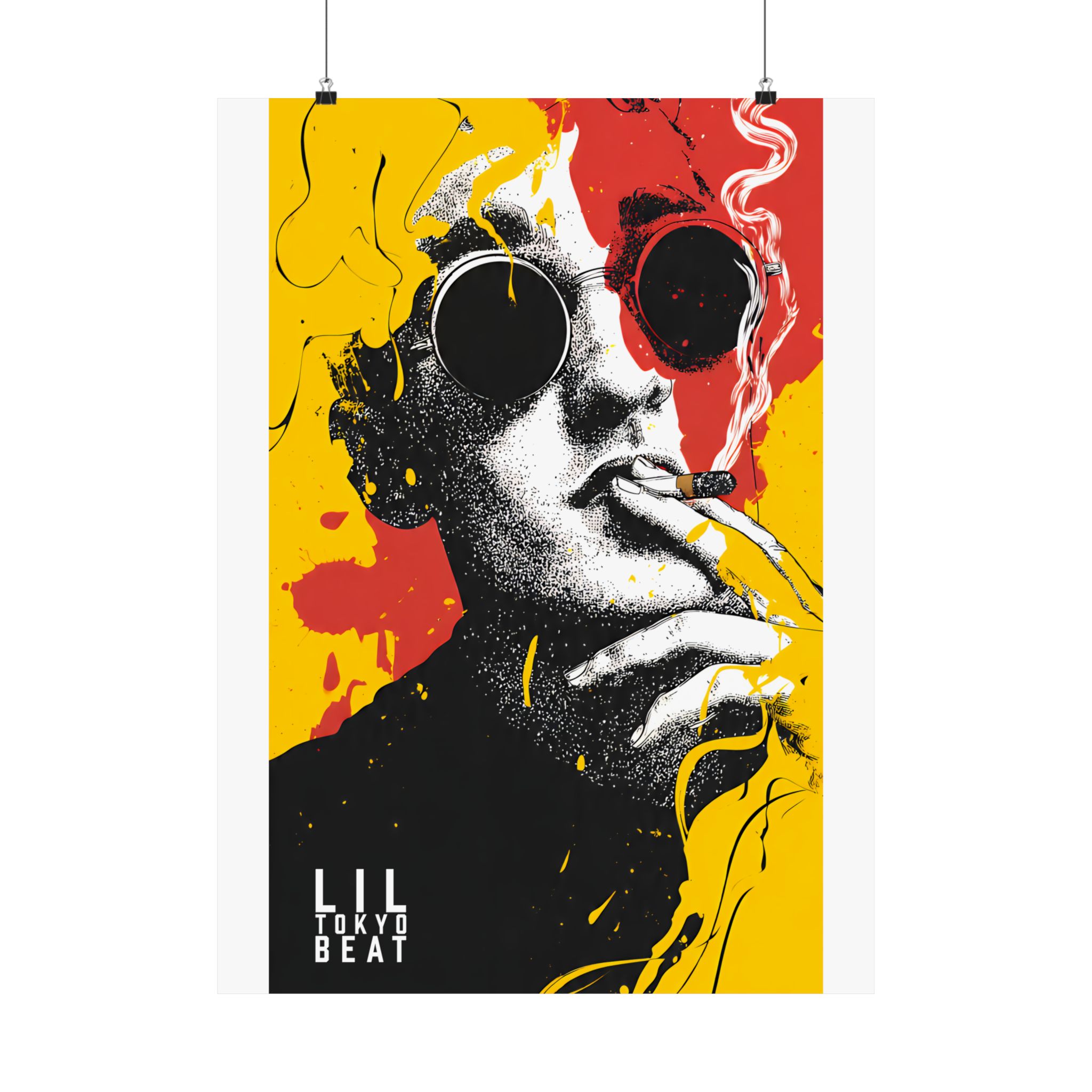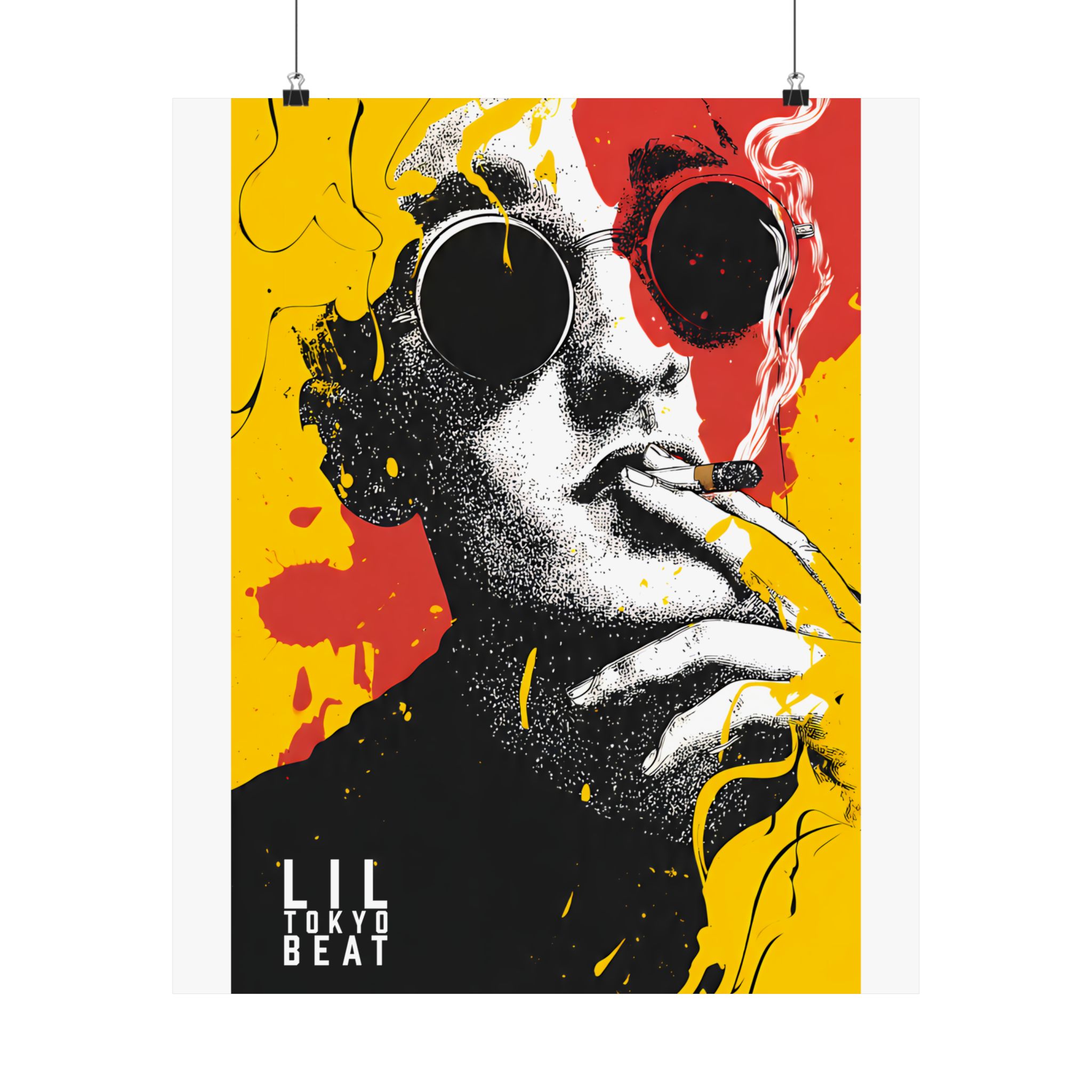 Make a statement with this bold pop art sunglasses poster by Lil Tokyo Beat. Featuring a striking black-and-white portrait layered with explosive yellow and red paint splashes, this design blends street art attitude with gallery-level composition. The oversized round sunglasses create a mysterious, fashion-forward edge, while the graphic contrast delivers modern urban energy. Perfect for living rooms, studios, creative offices, or streetwear-inspired interiors, this art print embodies K.A.T. — Kool. Artful. Timeless. A powerful visual centerpiece for collectors of contemporary pop art and expressive wall décor.