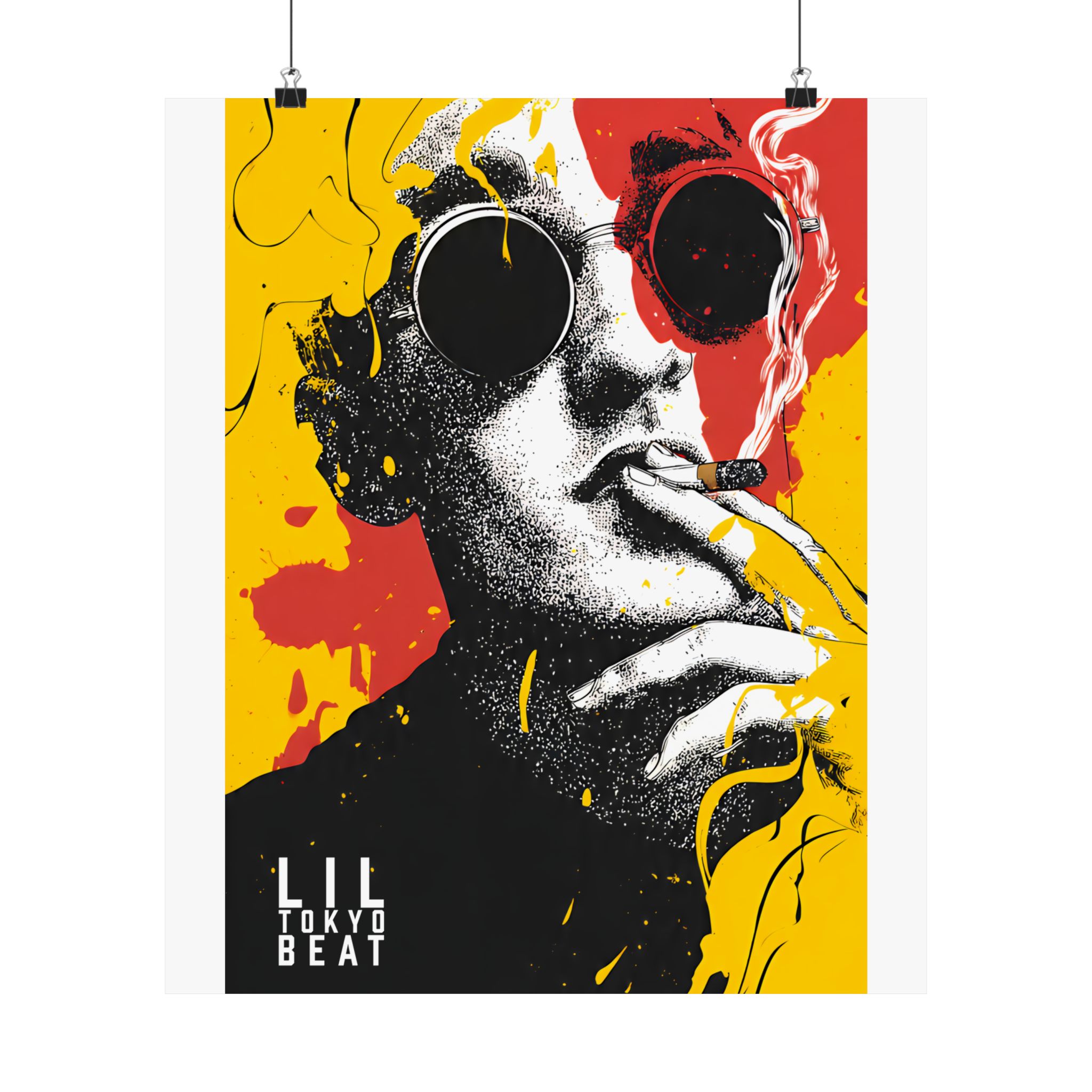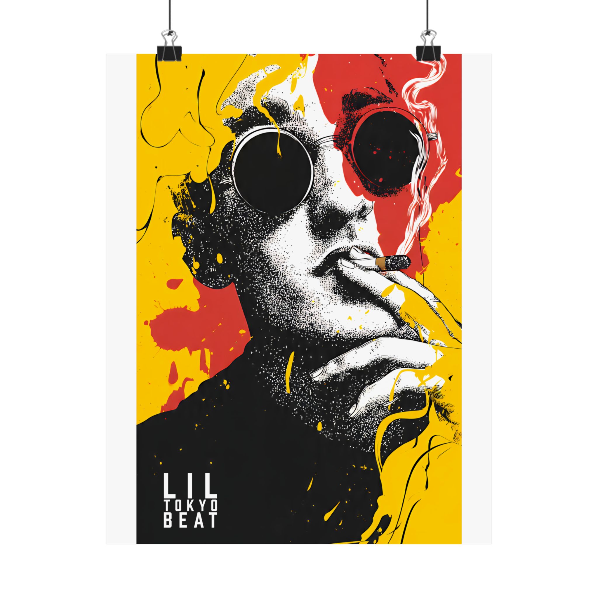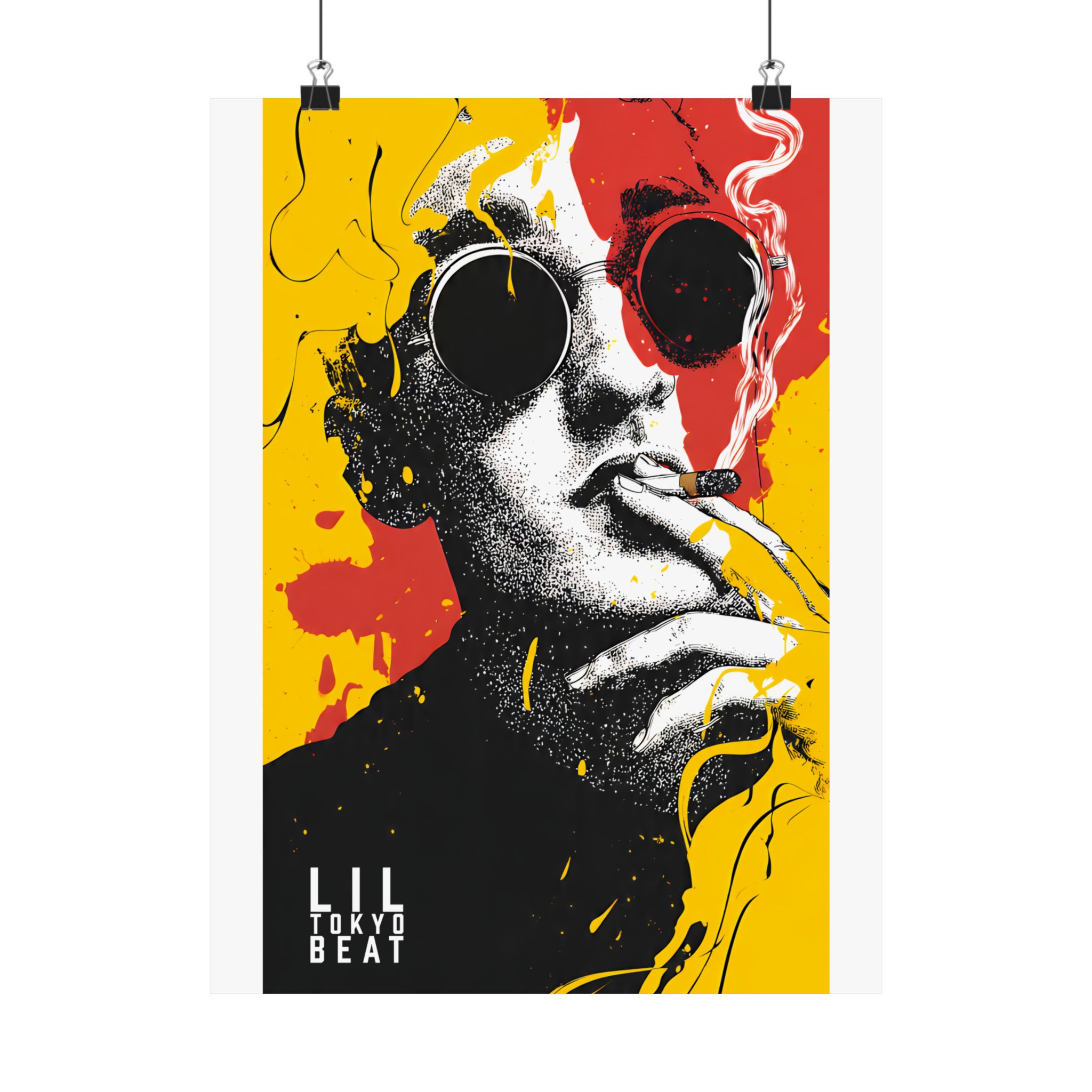 Make a statement with this bold pop art sunglasses poster by Lil Tokyo Beat. Featuring a striking black-and-white portrait layered with explosive yellow and red paint splashes, this design blends street art attitude with gallery-level composition. The oversized round sunglasses create a mysterious, fashion-forward edge, while the graphic contrast delivers modern urban energy. Perfect for living rooms, studios, creative offices, or streetwear-inspired interiors, this art print embodies K.A.T. — Kool. Artful. Timeless. A powerful visual centerpiece for collectors of contemporary pop art and expressive wall décor.