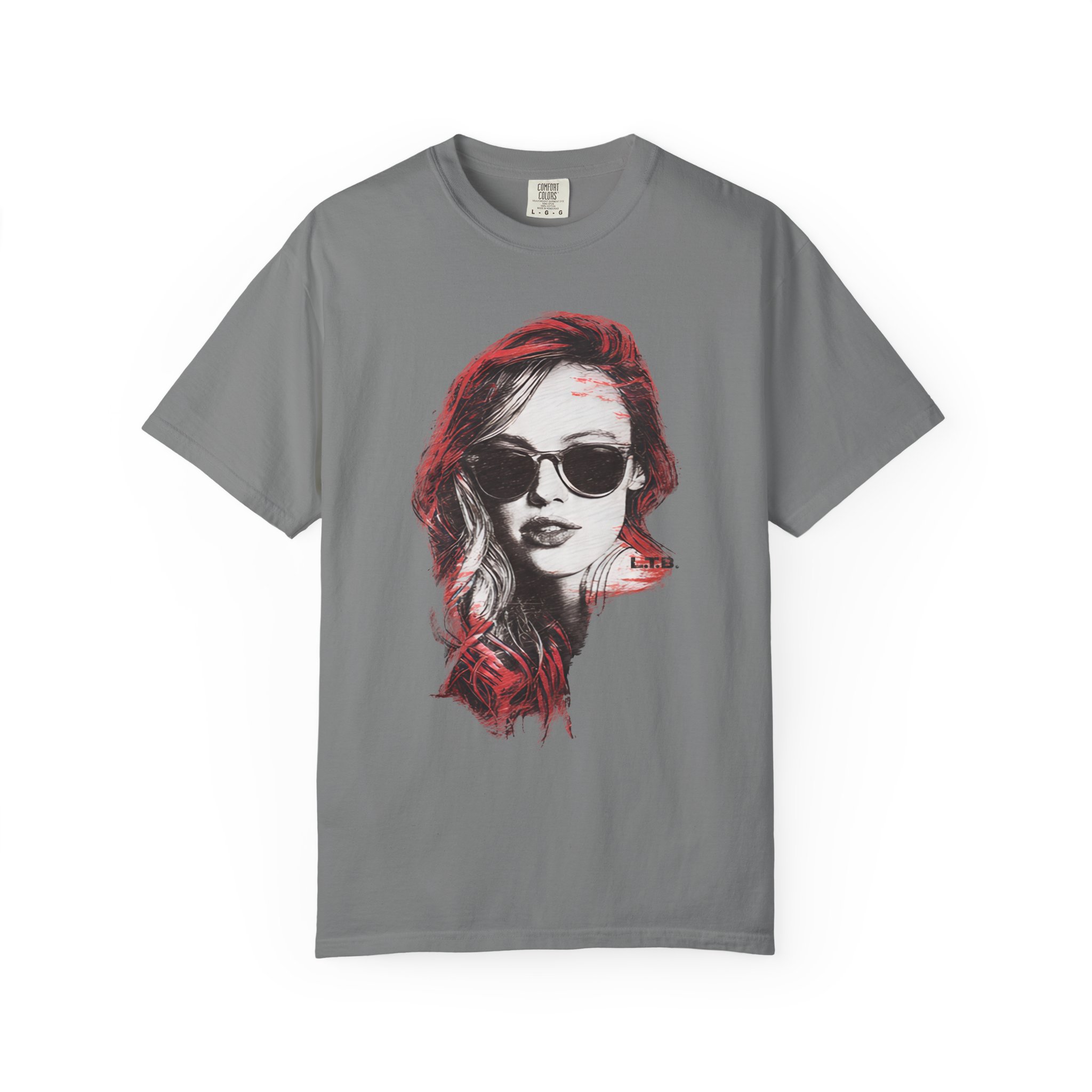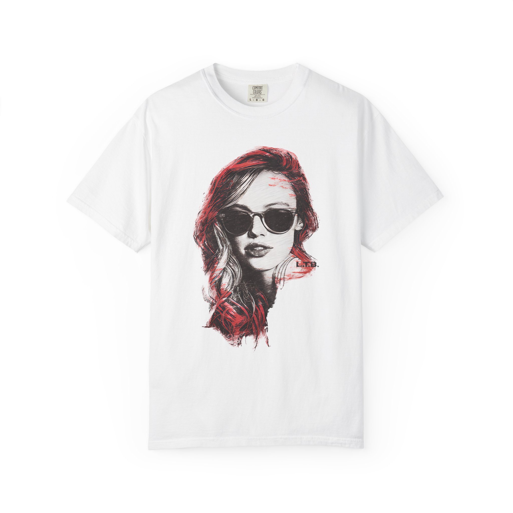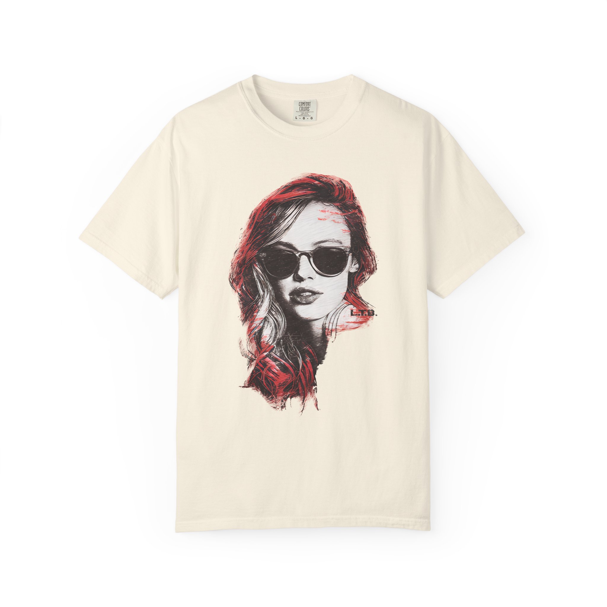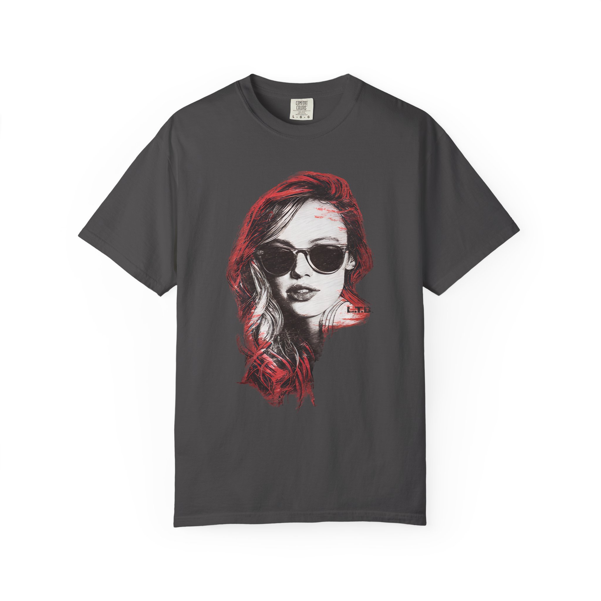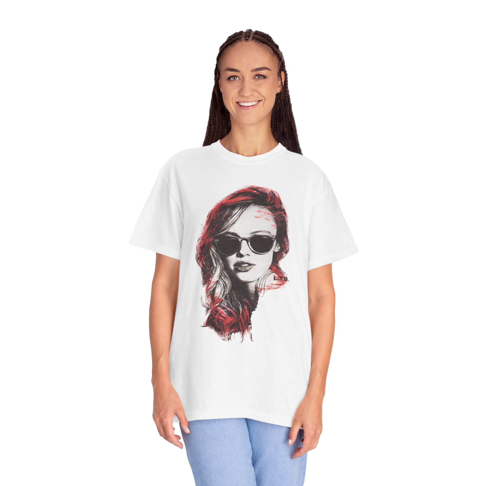 Soft, lived-in comfort meets striking portrait art. This garment-dyed tee wears in like an old favorite from day one — the heavyweight cotton feels substantial while the relaxed fit lets you move freely. The front features a high-contrast, fashion-forward portrait of a woman in sunglasses, with painterly red accents that give the design attitude without shouting. It layers easily under a denim jacket or stands alone with jeans for a casual, streetwise look. Wear it to gallery openings, coffee runs, or long afternoons wandering the city. The muted, garment-dyed colorway and sewn-in label keep the vibe understated and authentic — clothing that looks like it has a story already.