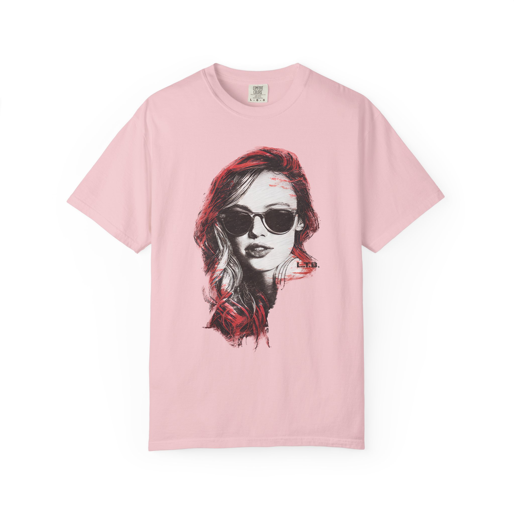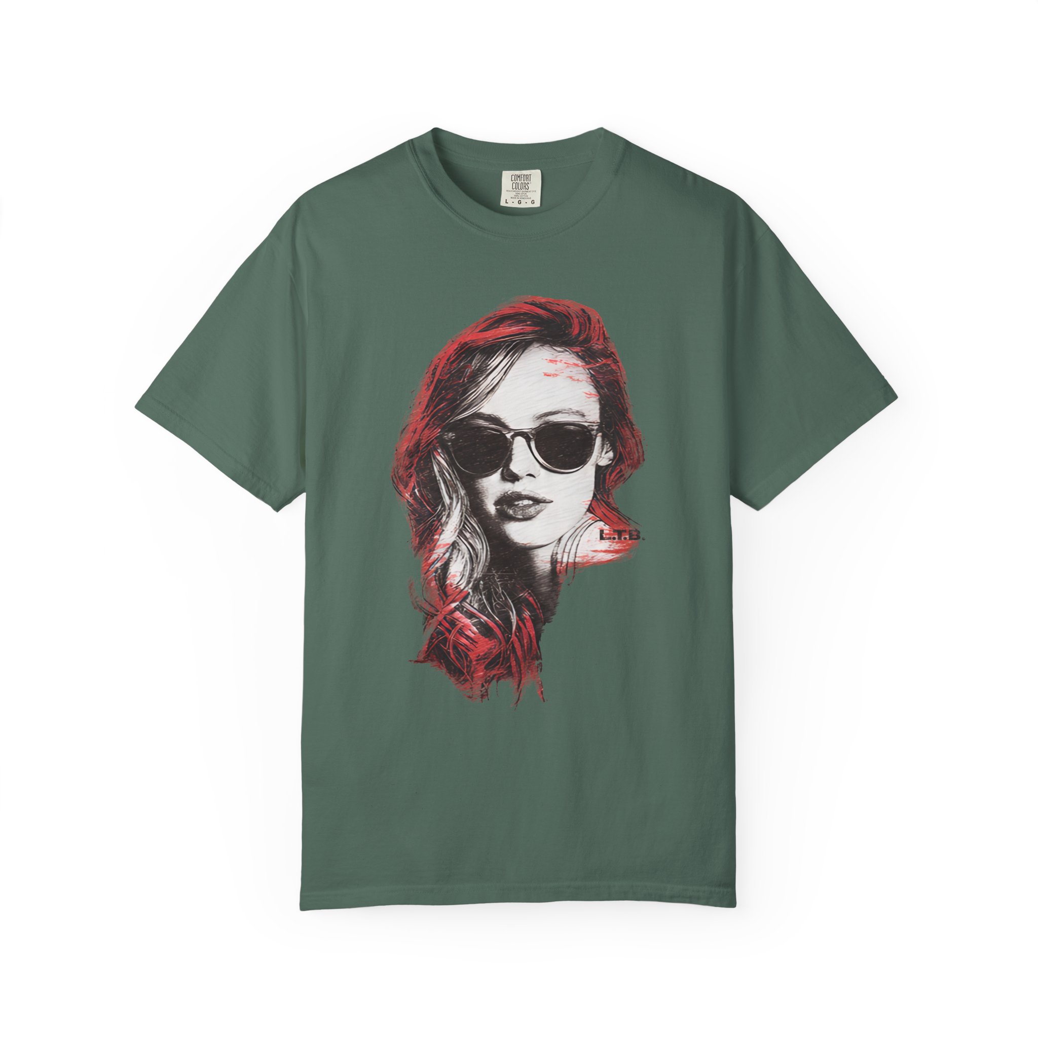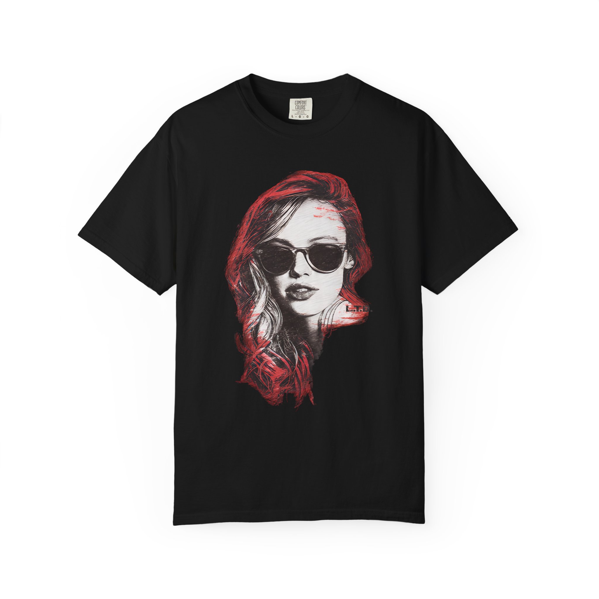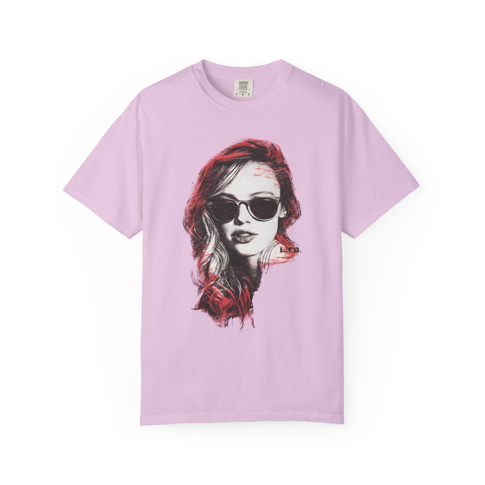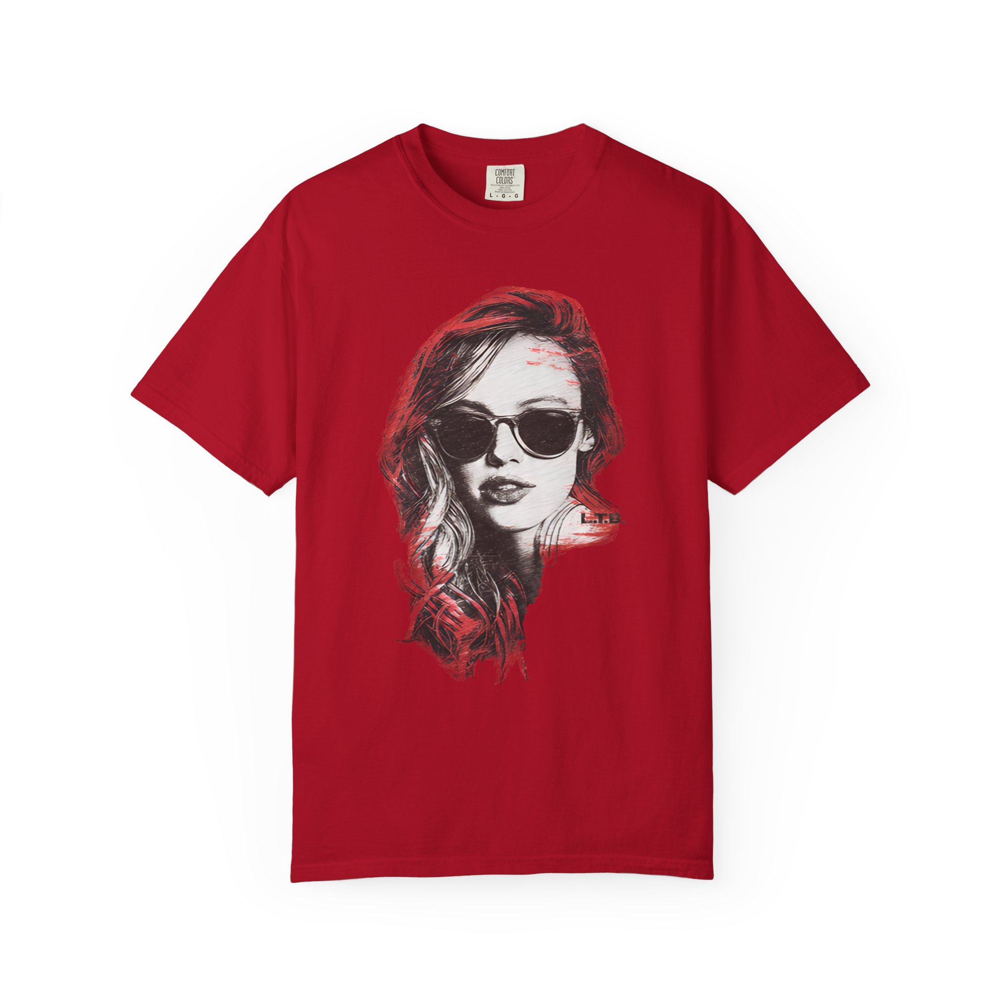 Soft, lived-in comfort meets striking portrait art. This garment-dyed tee wears in like an old favorite from day one — the heavyweight cotton feels substantial while the relaxed fit lets you move freely. The front features a high-contrast, fashion-forward portrait of a woman in sunglasses, with painterly red accents that give the design attitude without shouting. It layers easily under a denim jacket or stands alone with jeans for a casual, streetwise look. Wear it to gallery openings, coffee runs, or long afternoons wandering the city. The muted, garment-dyed colorway and sewn-in label keep the vibe understated and authentic — clothing that looks like it has a story already.