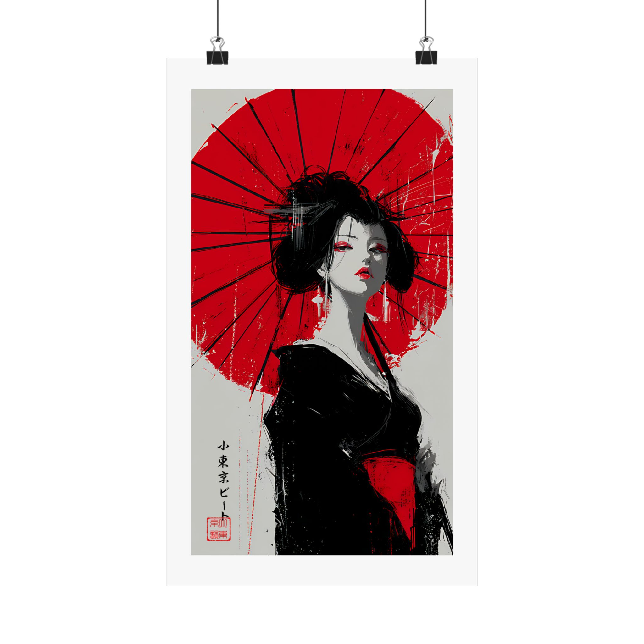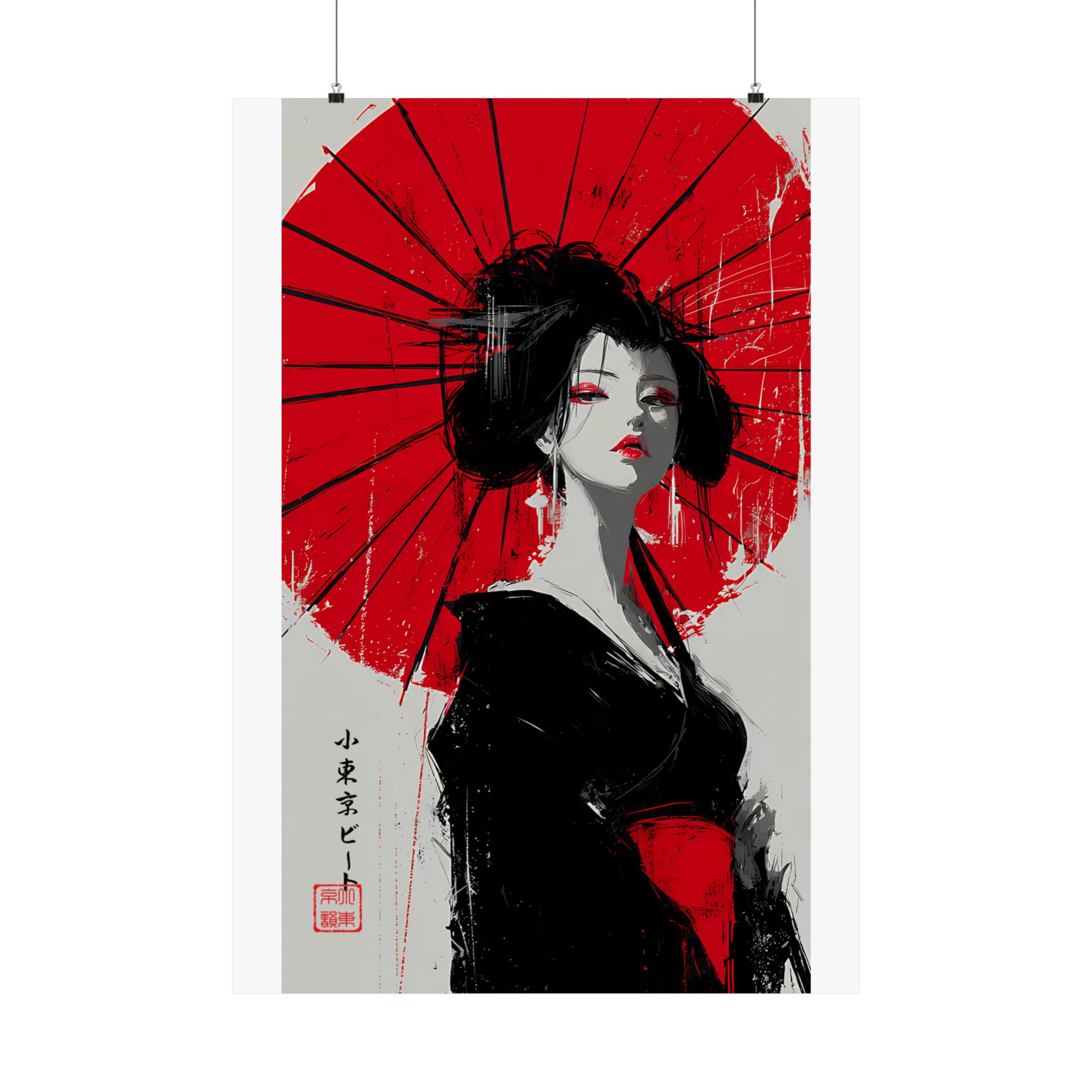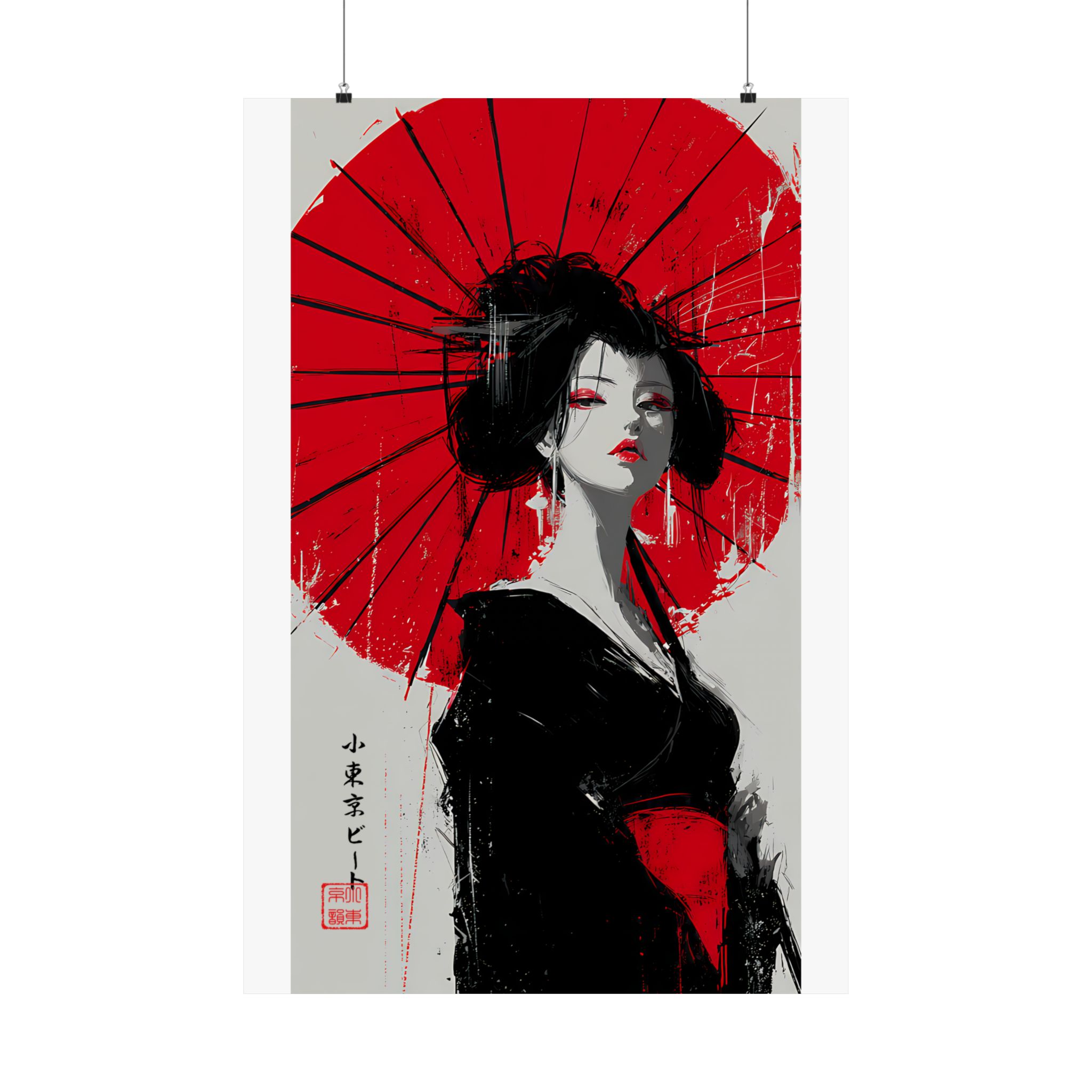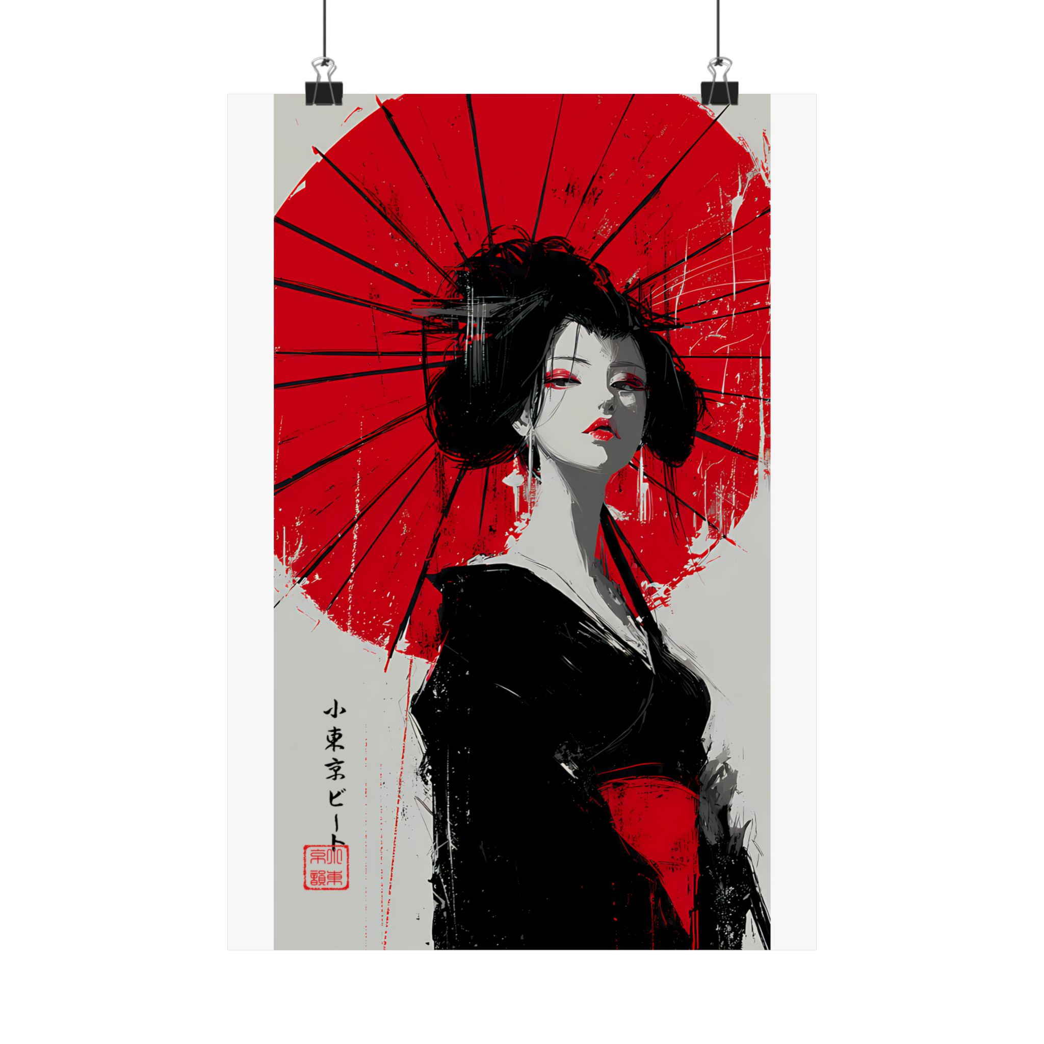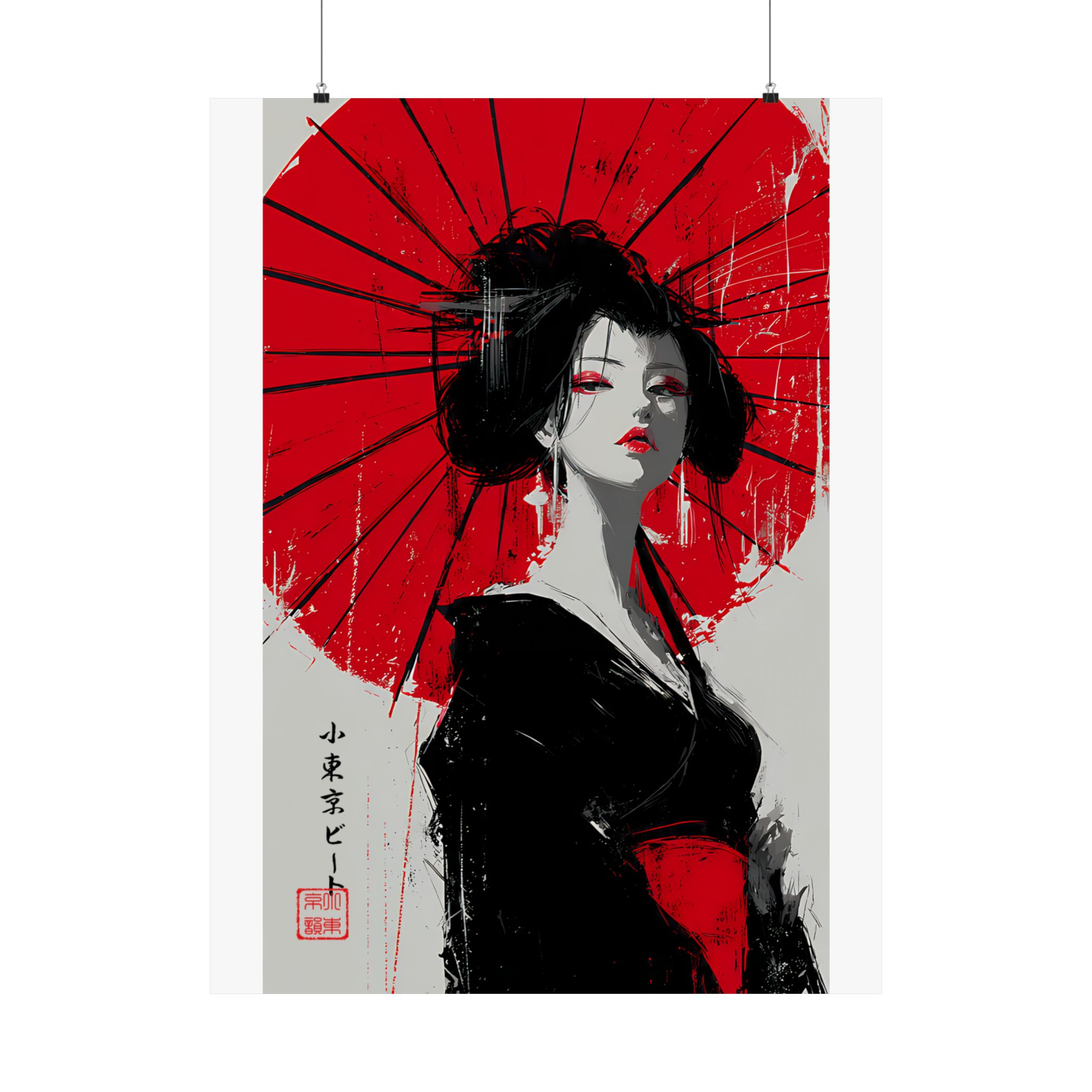 Minimal palette. Maximum impact. This Lil Tokyo Beat vertical poster features a striking Japanese-inspired portrait set against a vivid red umbrella backdrop. The bold contrast of crimson, black, and soft neutrals creates dramatic visual tension, blending traditional elegance with modern abstract brush energy. Expressive eyes, confident posture, and painterly texture give this piece cinematic presence. Ideal for Japanese aesthetic interiors, modern bedrooms, creative studios, and statement gallery walls. Kool. Artful. Timeless. A New Voice in Tee Culture — expanding into fearless wall art that commands attention.