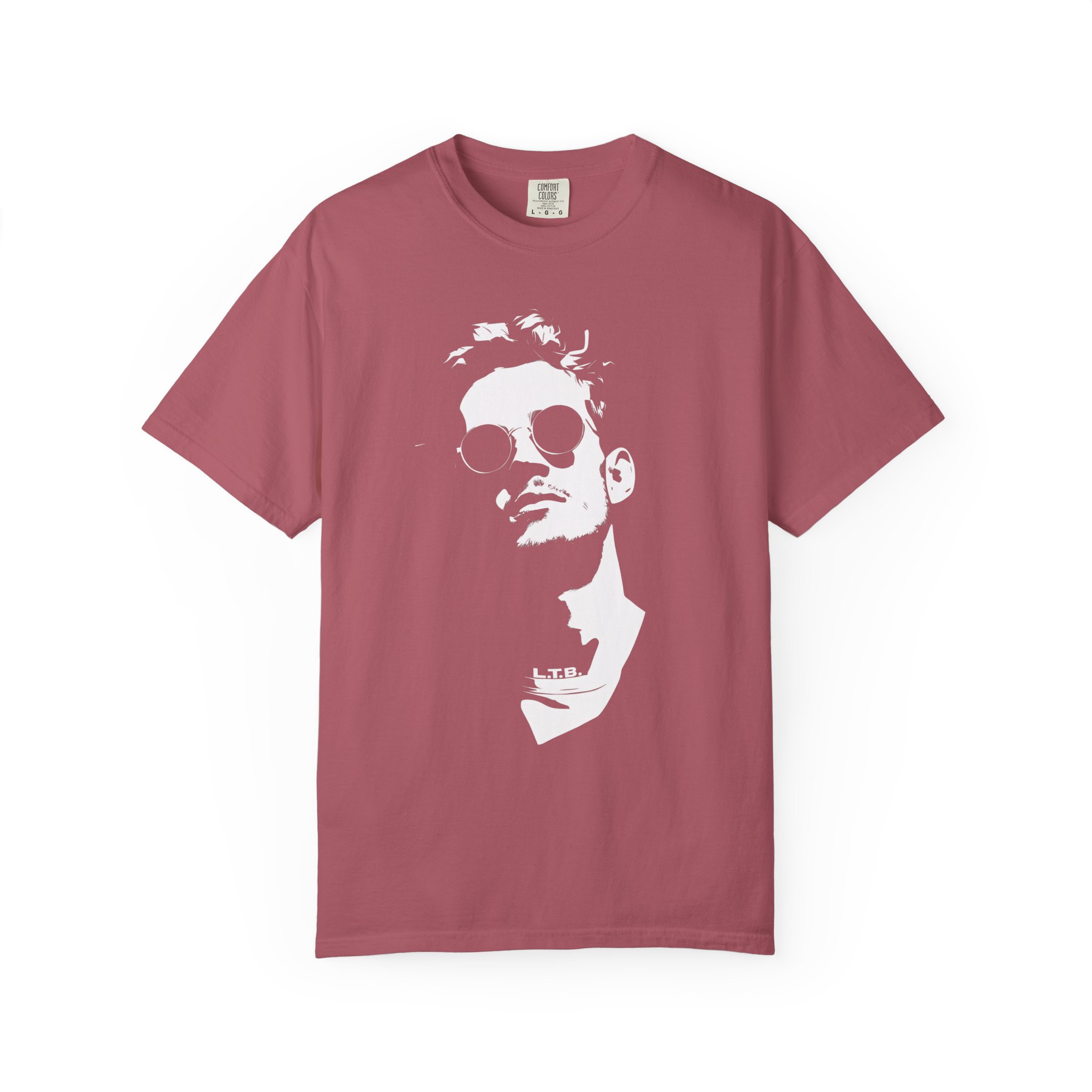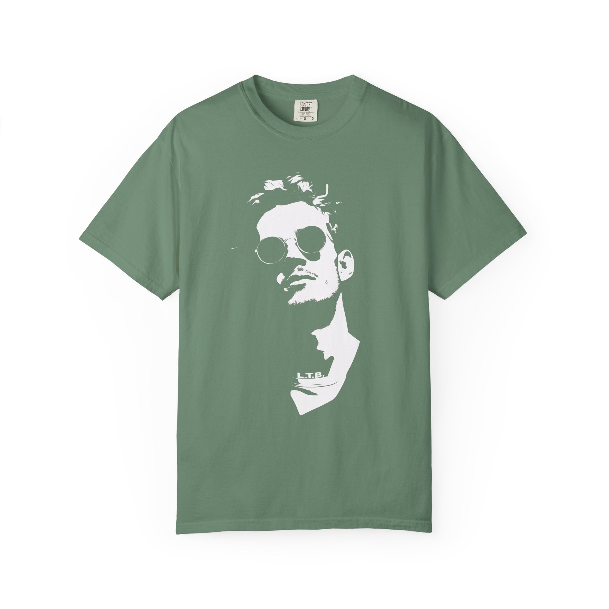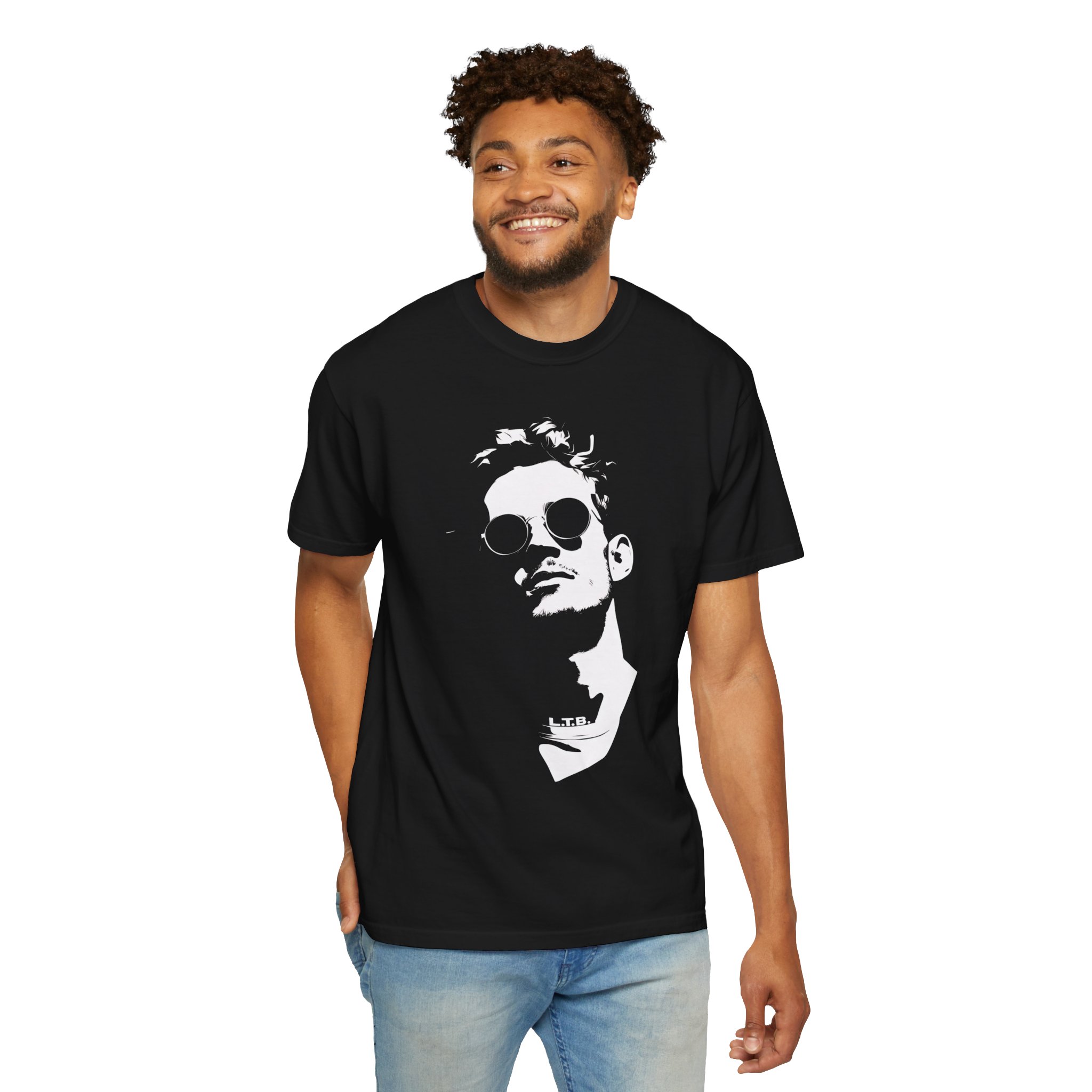 This relaxed, garment-dyed tee carries an easy, lived-in vibe — the heavyweight cotton feels substantial while the soft dye gives each shirt a slightly faded, vintage surface. The bold, high-contrast portrait print on the chest reads like a confident, late-afternoon moment: sunglasses on, jaw set, ready for whatever comes next. Wear it to slow city walks, record-store stops, or evenings around a fire pit. The roomy cut lets movement feel natural and the durable double-needle seams mean it will age alongside your favorite memories, not fall apart after a few wears.