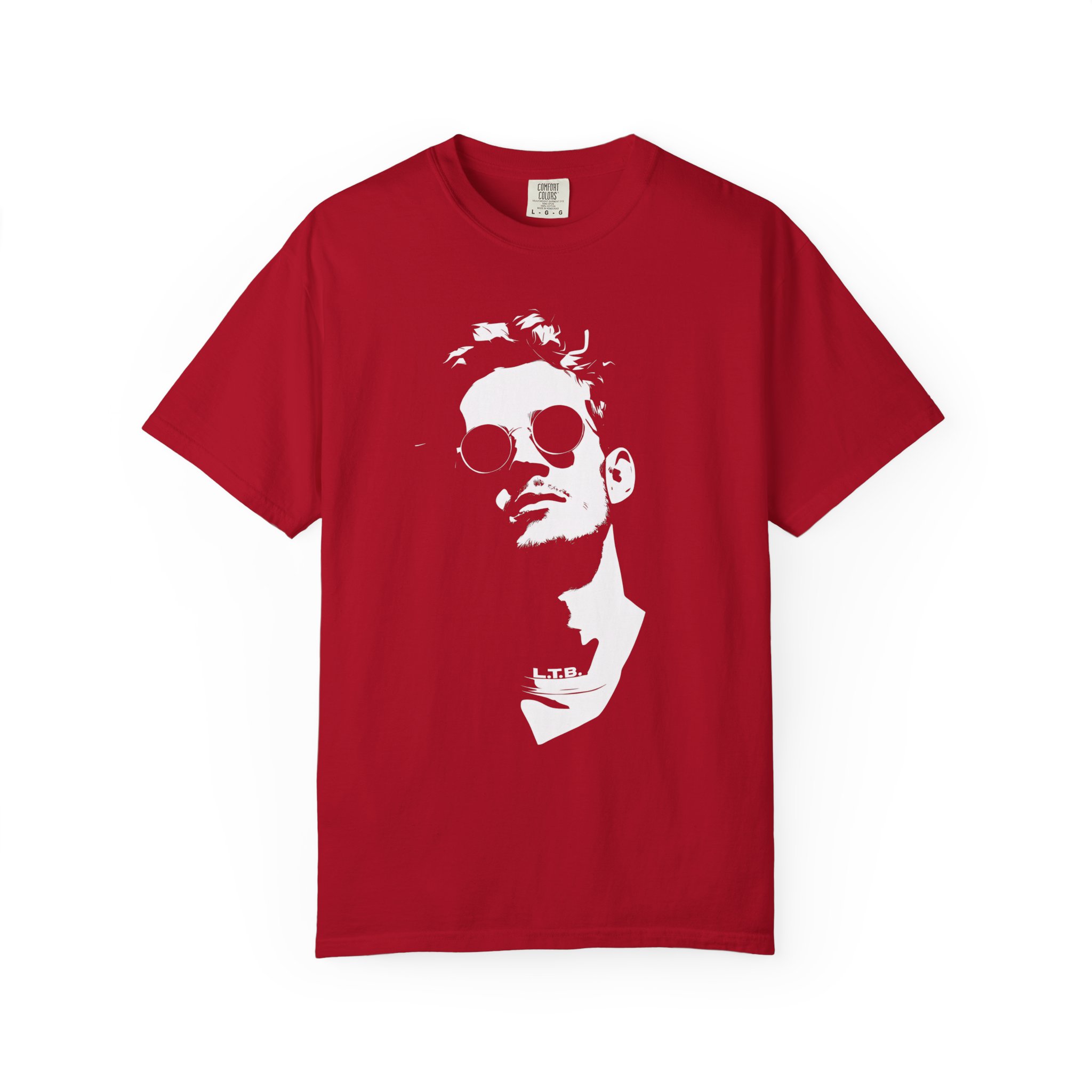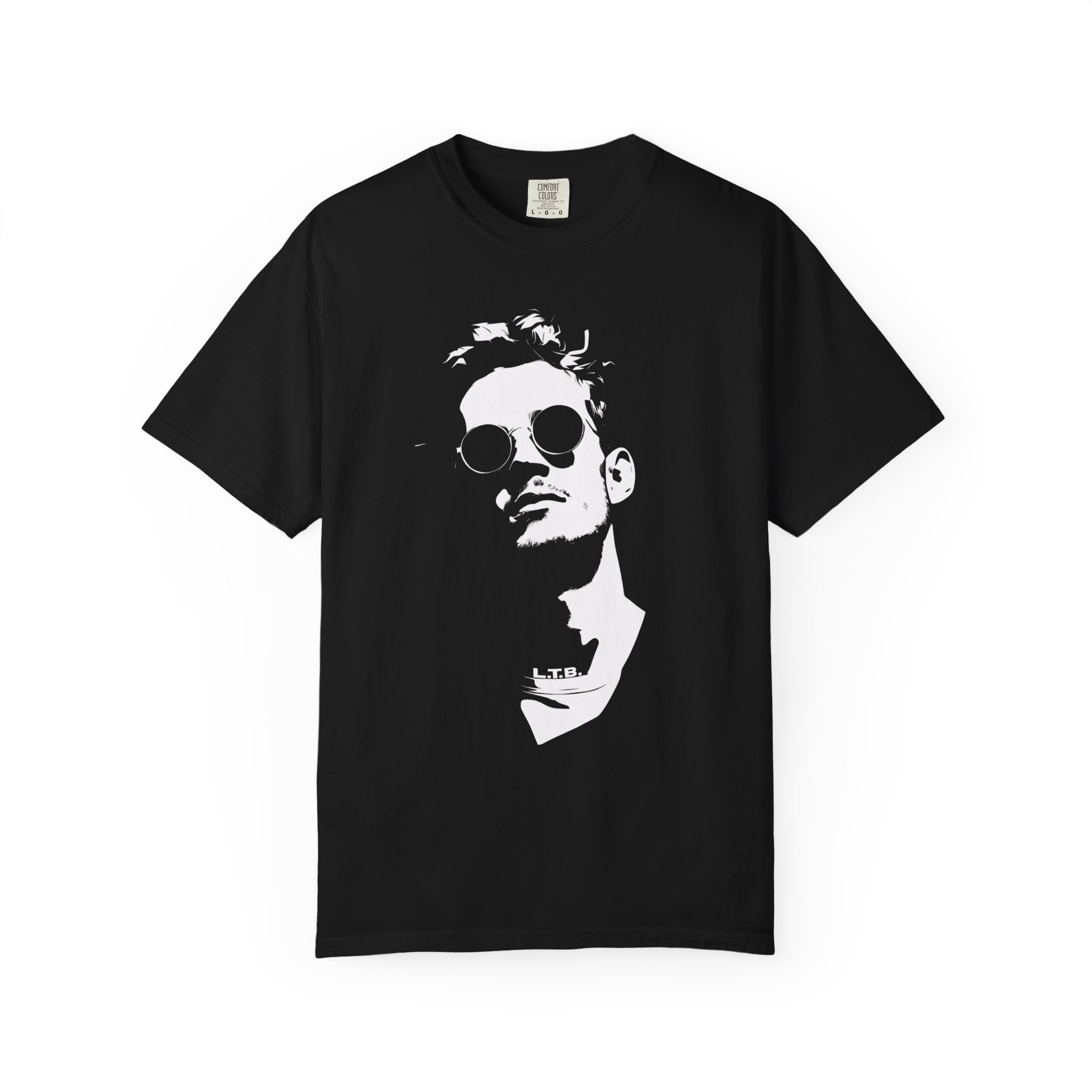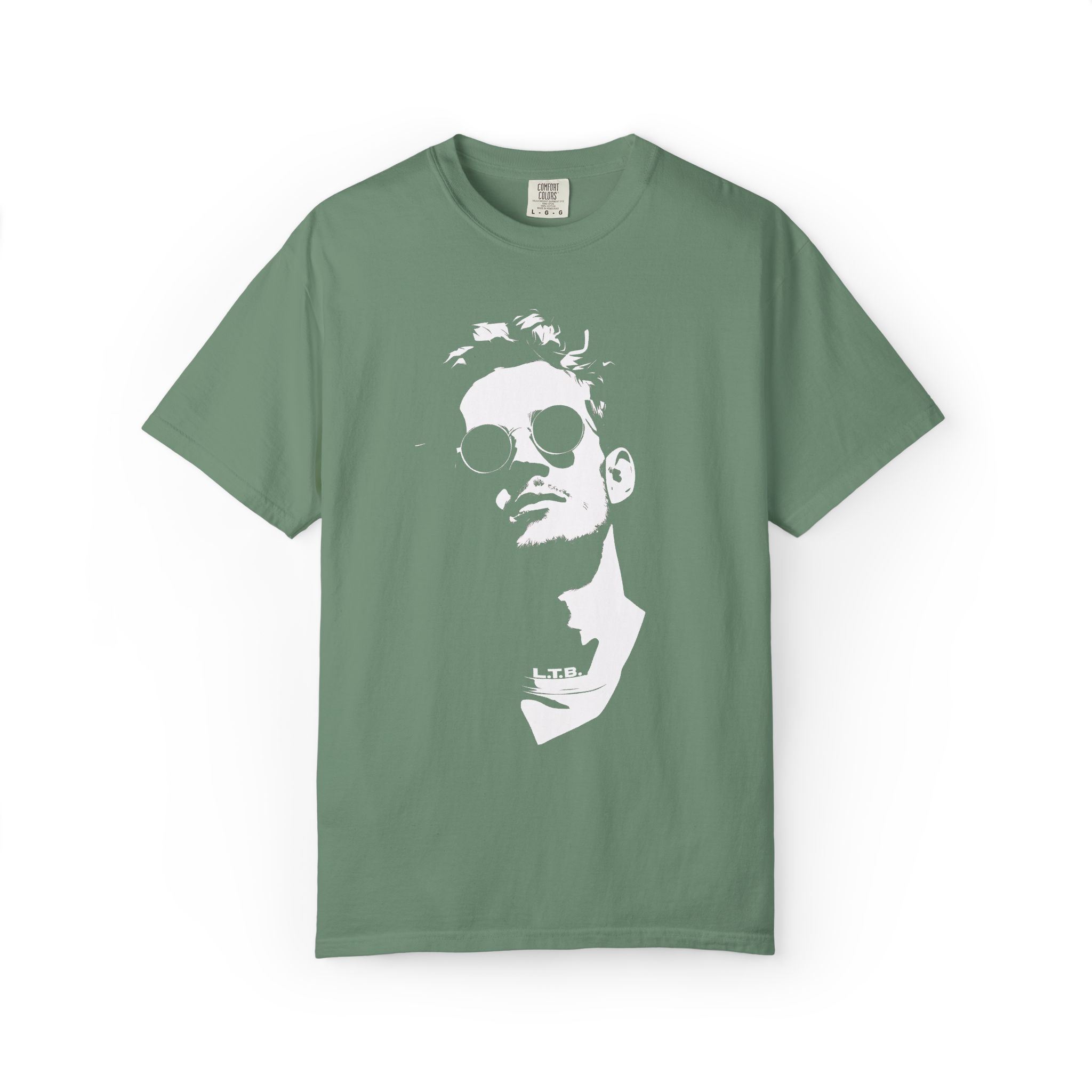 This relaxed, garment-dyed tee carries an easy, lived-in vibe — the heavyweight cotton feels substantial while the soft dye gives each shirt a slightly faded, vintage surface. The bold, high-contrast portrait print on the chest reads like a confident, late-afternoon moment: sunglasses on, jaw set, ready for whatever comes next. Wear it to slow city walks, record-store stops, or evenings around a fire pit. The roomy cut lets movement feel natural and the durable double-needle seams mean it will age alongside your favorite memories, not fall apart after a few wears.