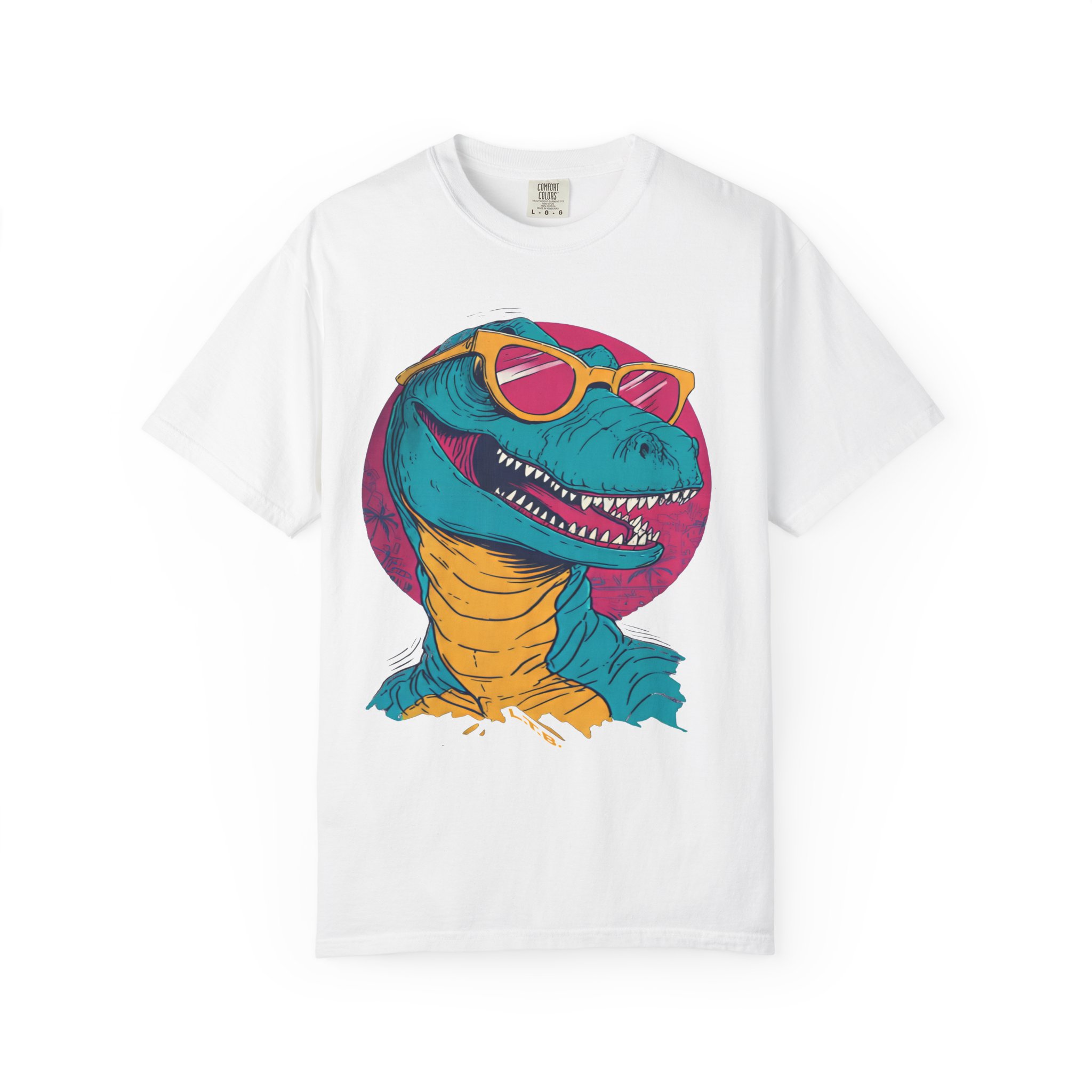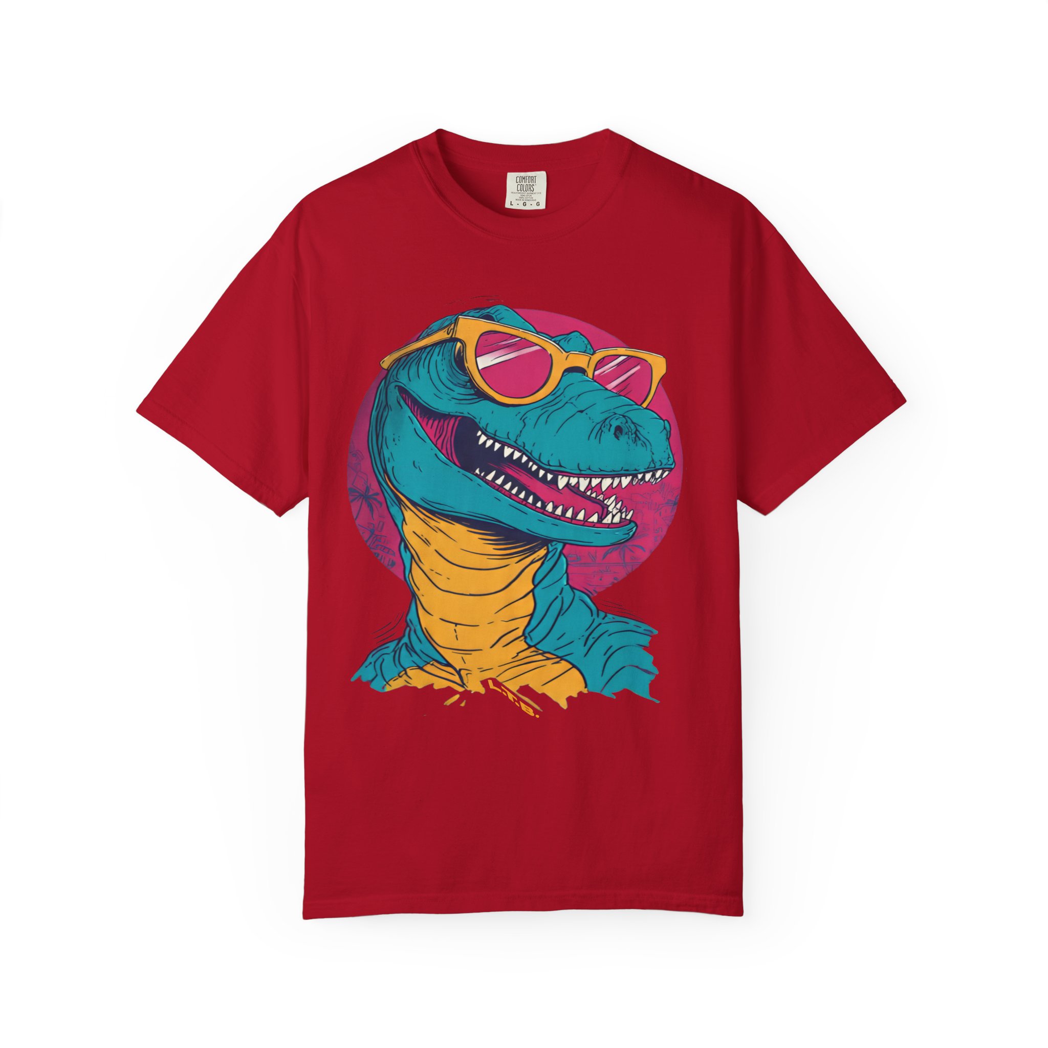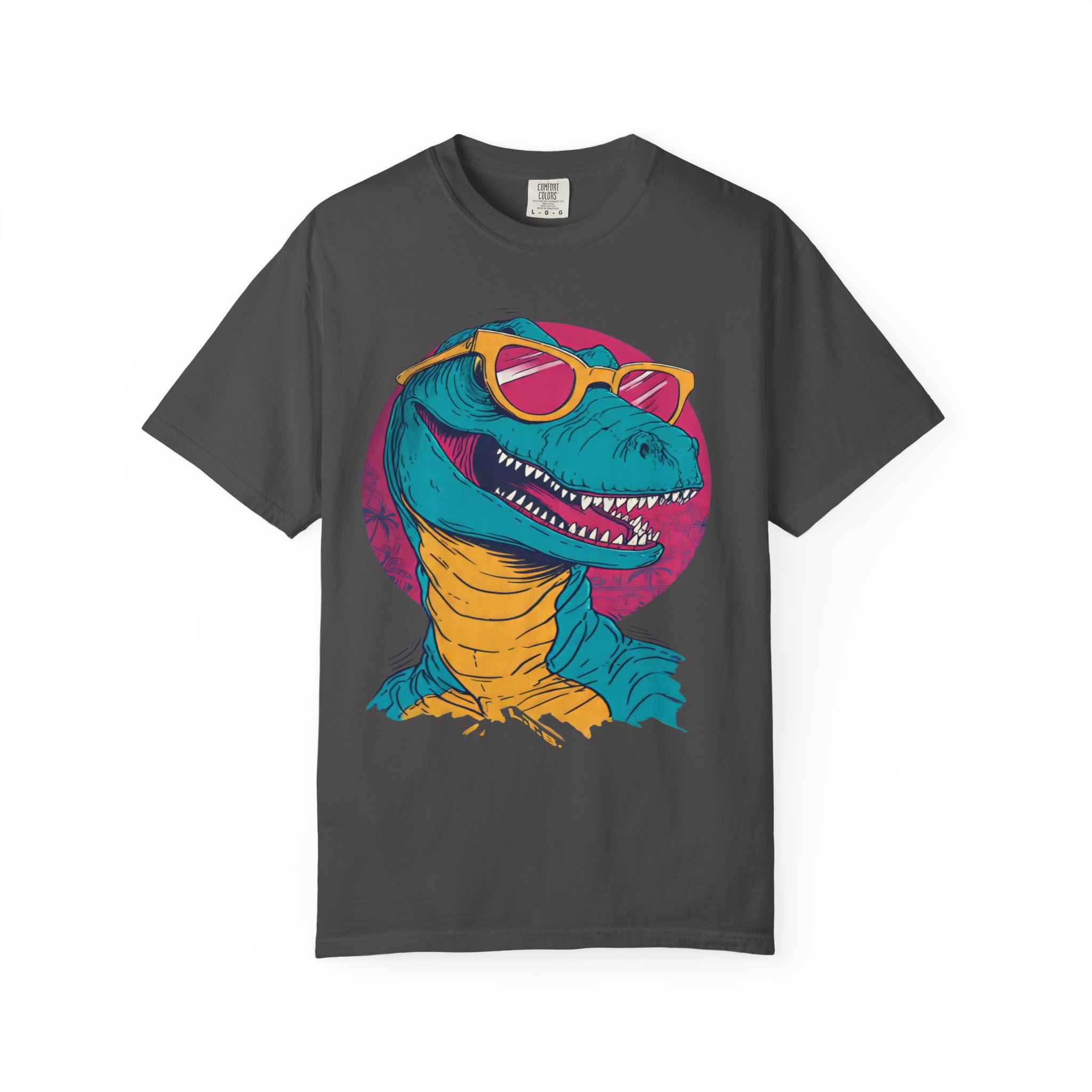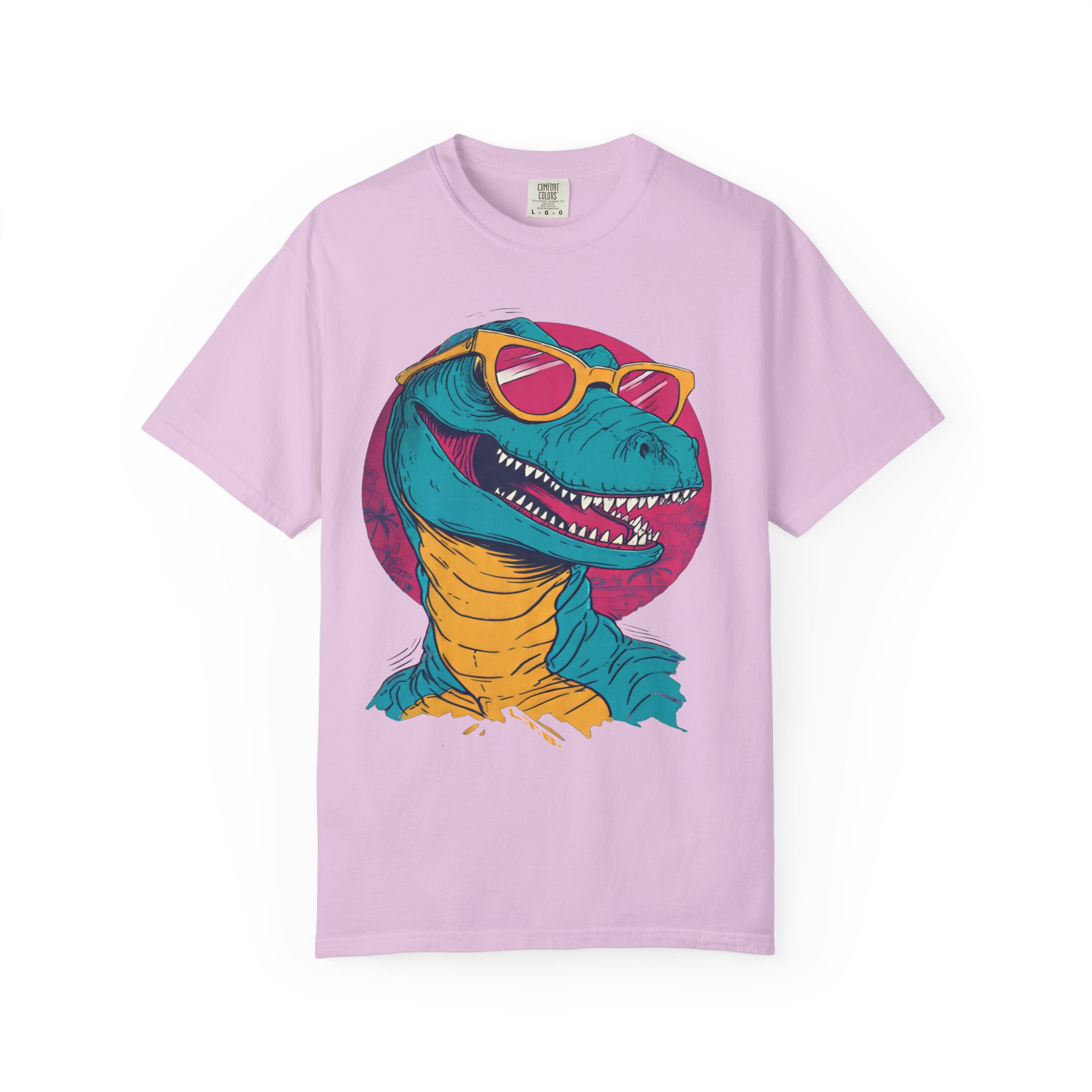 This relaxed-fit garment-dyed tee brings playful color and soft, lived-in comfort to everyday wear. A bold, retro-inspired dinosaur design—sunset tones, tinted shades, and a cheeky grin—sits center chest, giving the shirt an easygoing, nostalgic vibe. The heavyweight, ring-spun cotton feels substantial yet soft thanks to post-construction dyeing that produces a vintage texture and rich, slightly muted color. Built to last with double-needle stitching and a tubular knit that avoids side seams, it wears well, washes well, and keeps its relaxed silhouette. Available across a broad size range, it’s the kind of casual shirt you reach for when you want personality with dependable comfort.