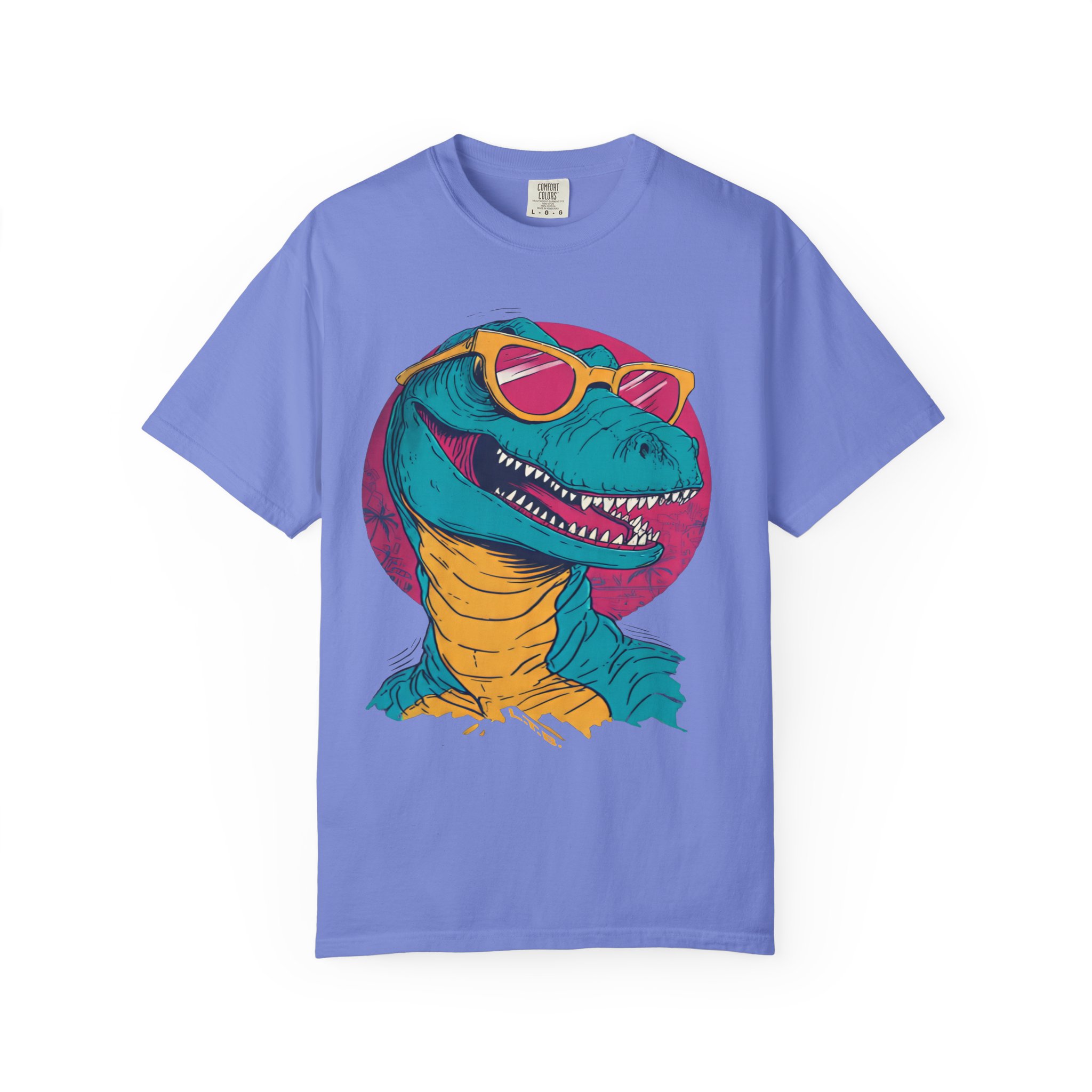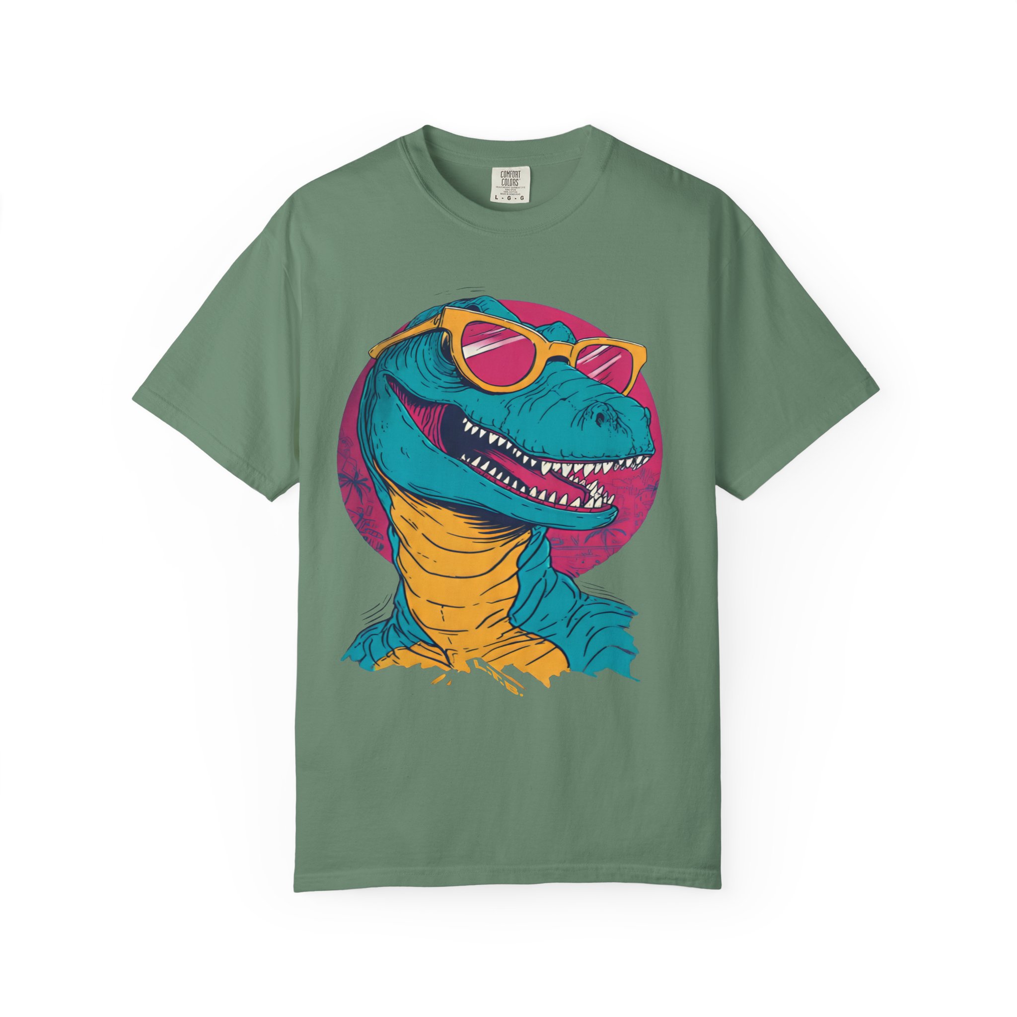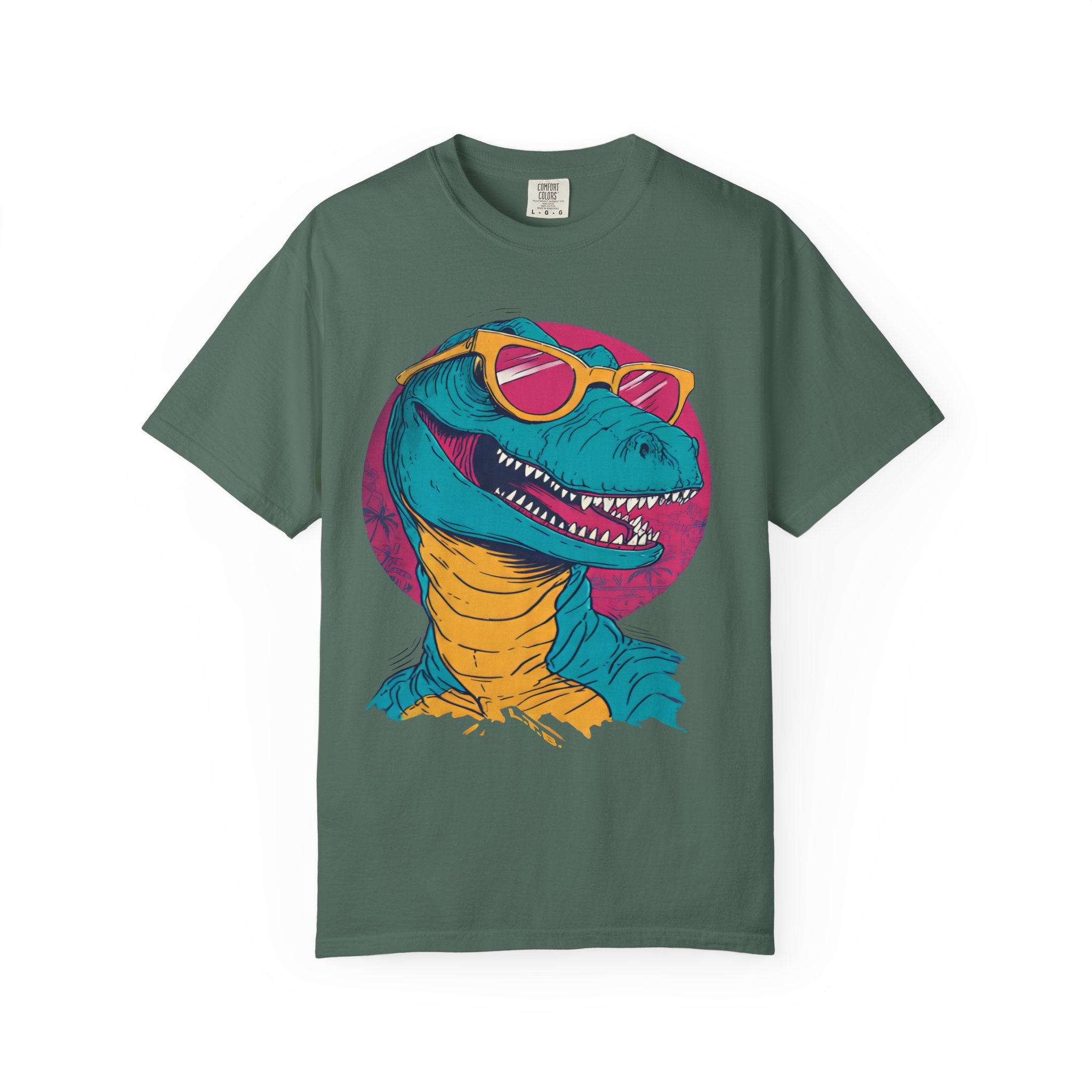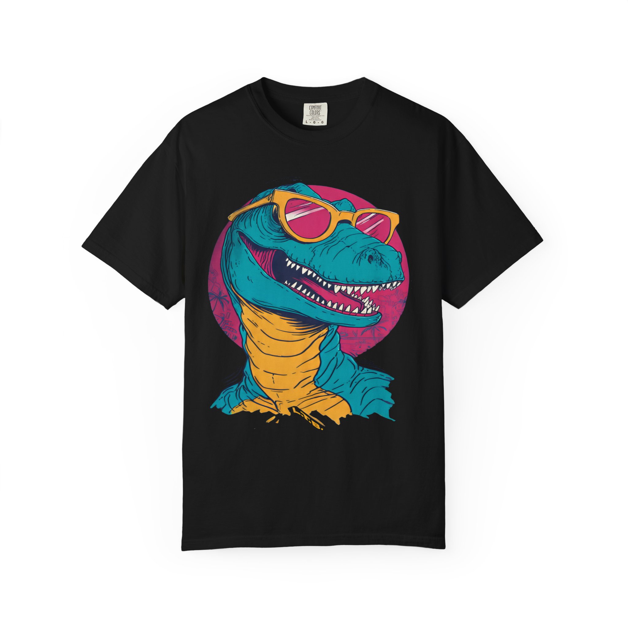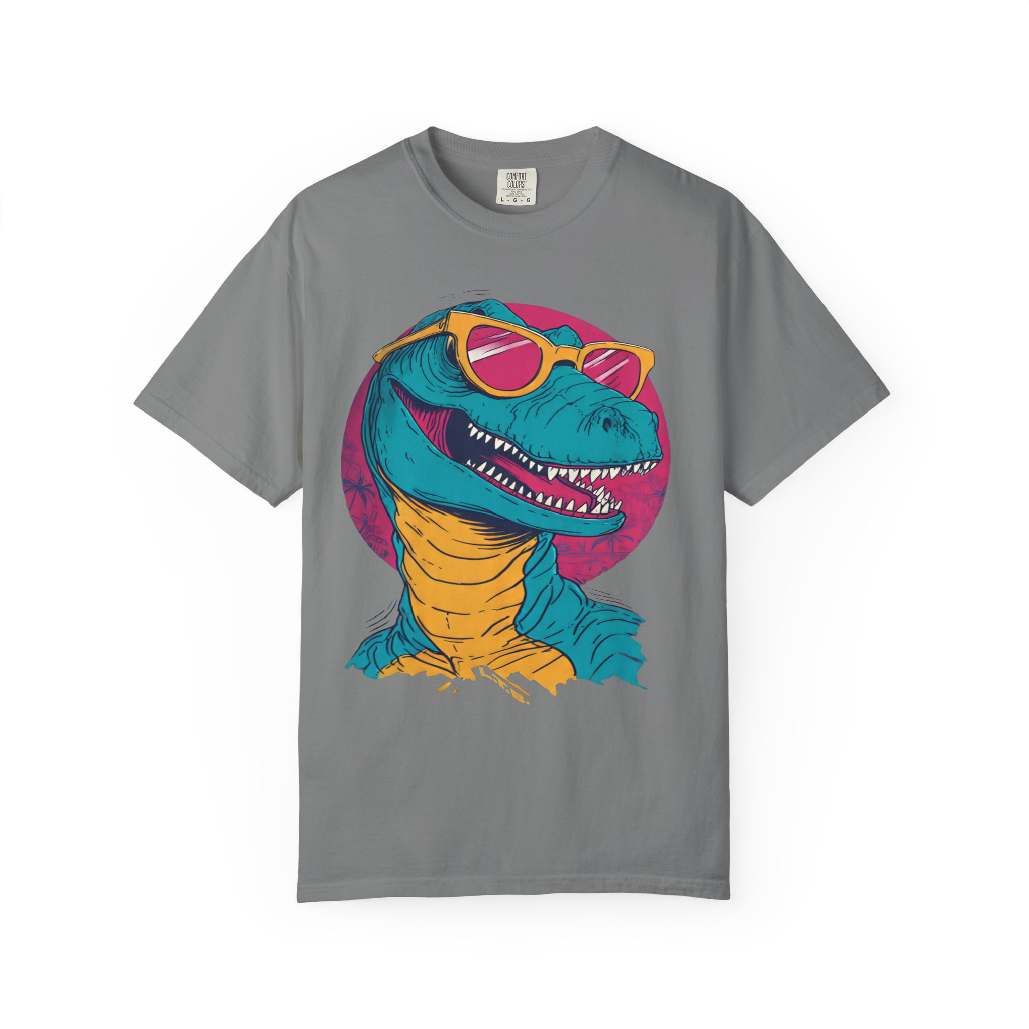 This relaxed-fit garment-dyed tee brings playful color and soft, lived-in comfort to everyday wear. A bold, retro-inspired dinosaur design—sunset tones, tinted shades, and a cheeky grin—sits center chest, giving the shirt an easygoing, nostalgic vibe. The heavyweight, ring-spun cotton feels substantial yet soft thanks to post-construction dyeing that produces a vintage texture and rich, slightly muted color. Built to last with double-needle stitching and a tubular knit that avoids side seams, it wears well, washes well, and keeps its relaxed silhouette. Available across a broad size range, it’s the kind of casual shirt you reach for when you want personality with dependable comfort.