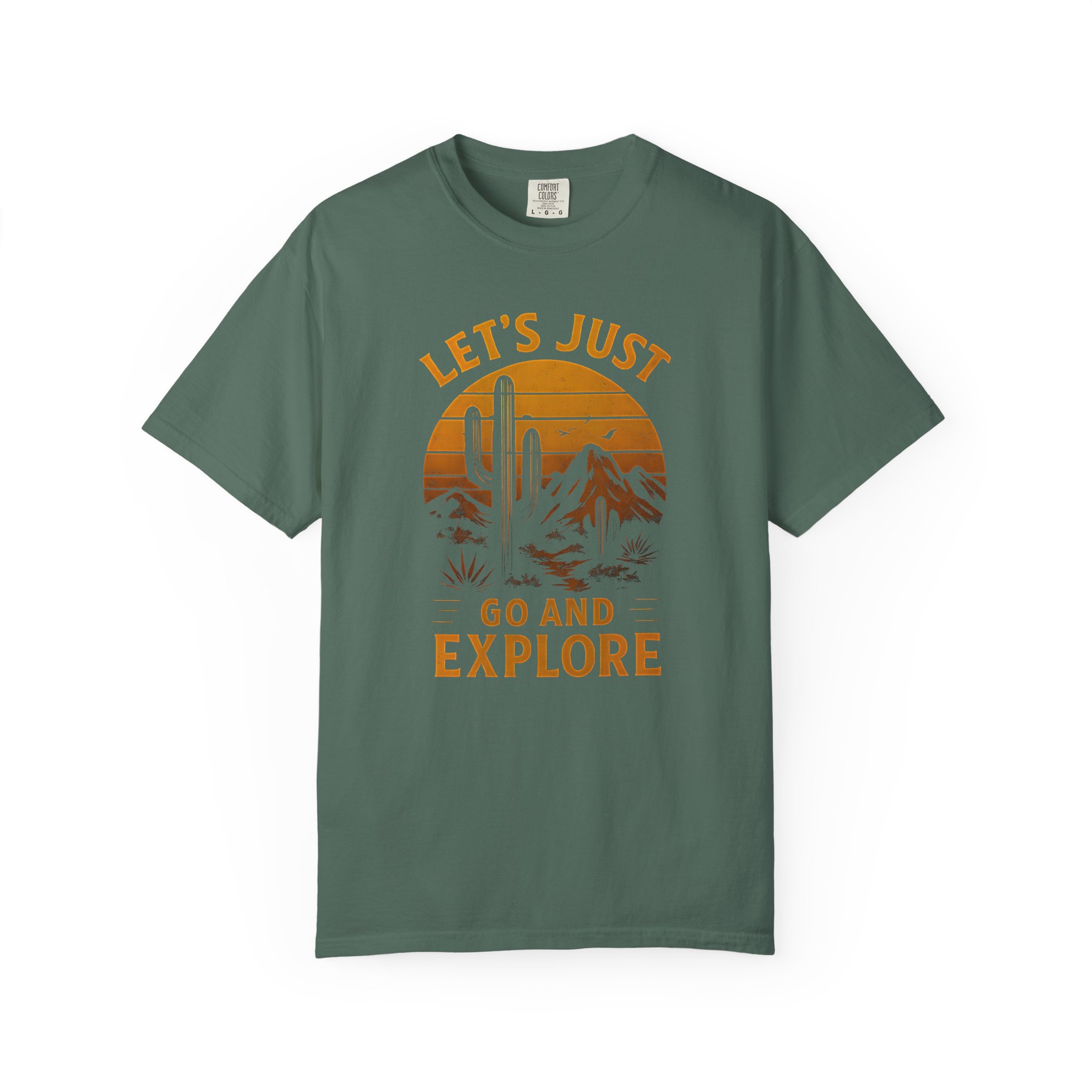 Slide into a sun-warmed memory of open roads and wide horizons. This tee carries a retro desert scene—faded stripes, a lone saguaro silhouette, and the quiet dare to wander—etched into soft, garment-dyed cotton that already feels lived-in. Wear it on a weekend drive with the windows down, layered under a flannel when the desert night cools, or as your go-to for maps-and-coffee runs. The relaxed cut and heavier knit give it presence without stiffness; the muted colorways let the graphic sit naturally, like a postcard you’ve kept in a wallet for years. For people who chase gravel side roads, campsite sunsets, and the small, stubborn thrill of discovery, this shirt settles right into that life.