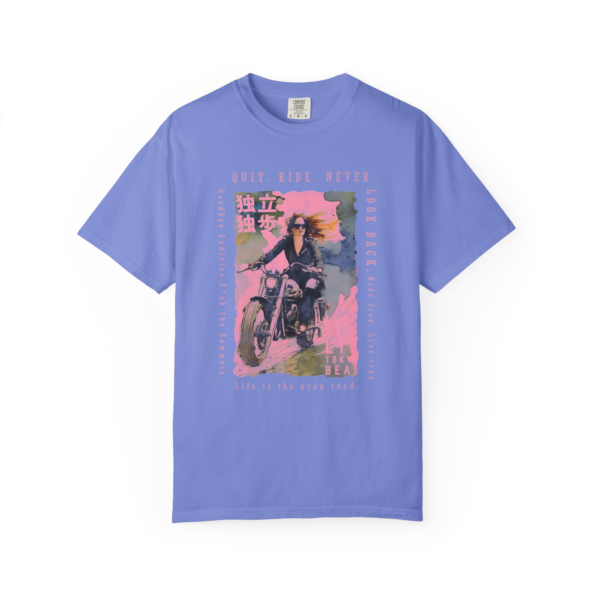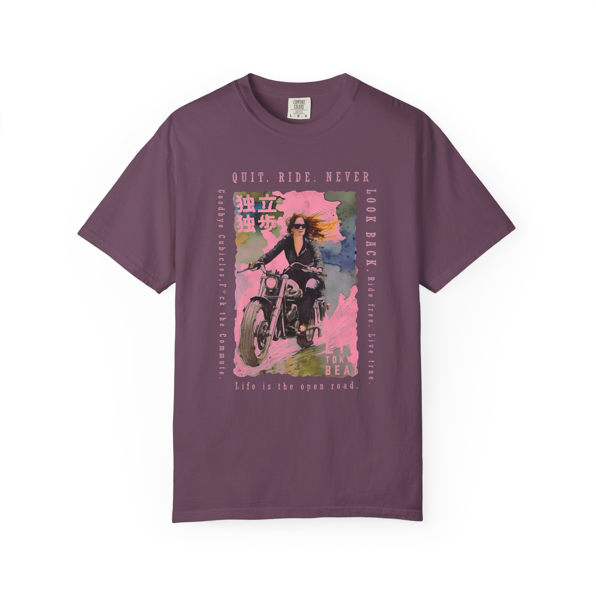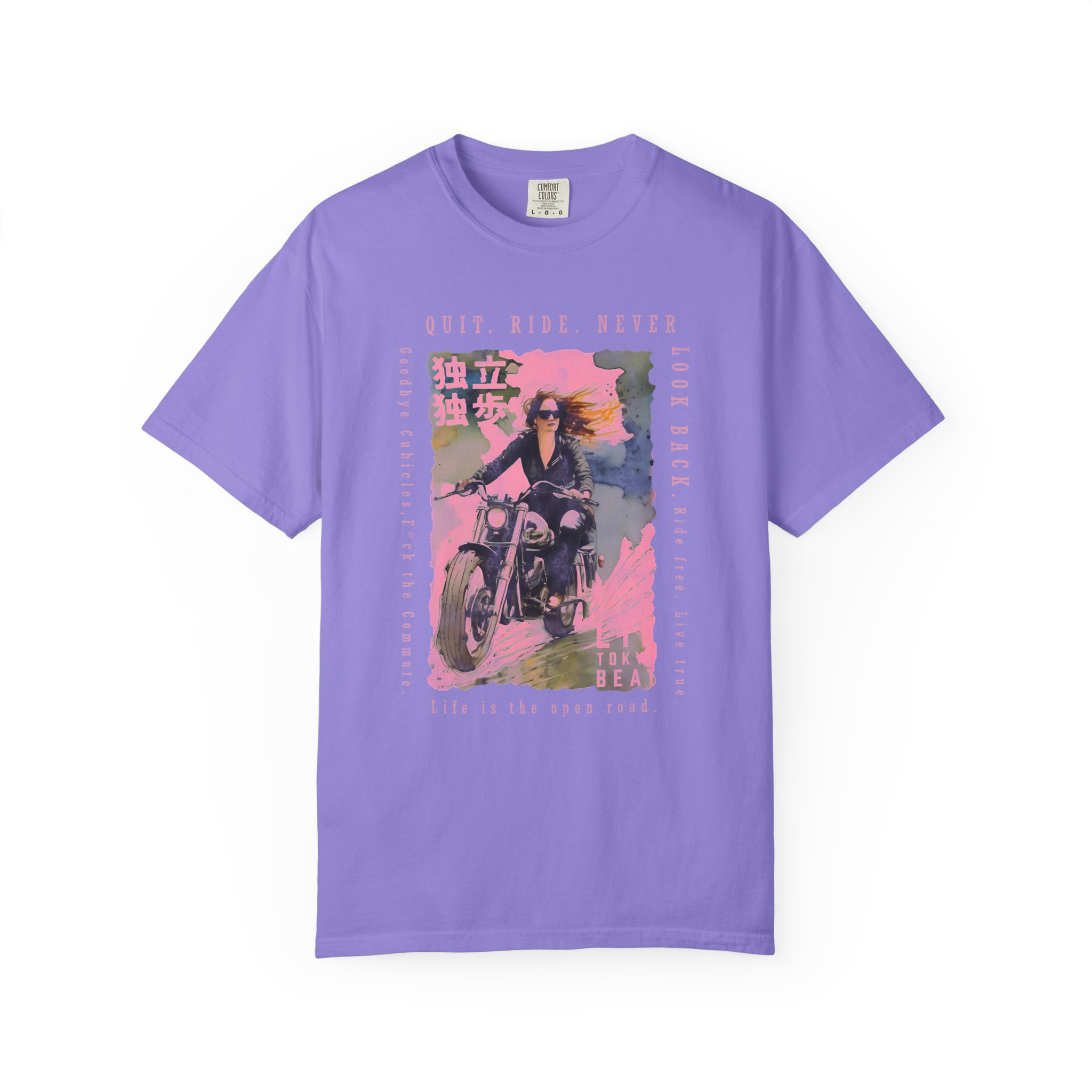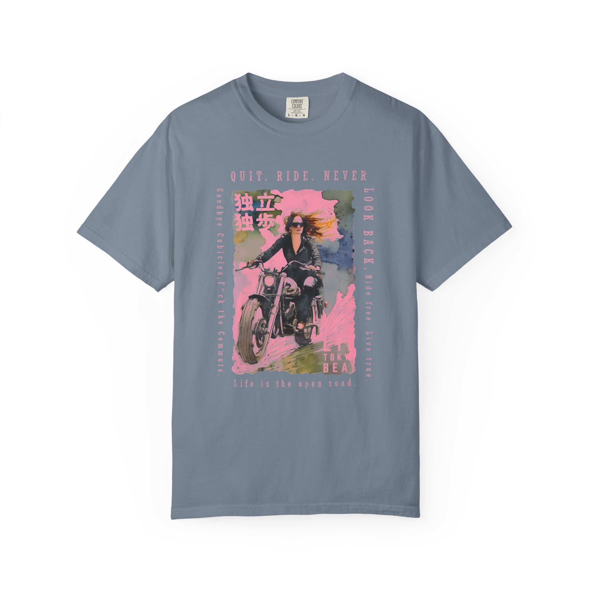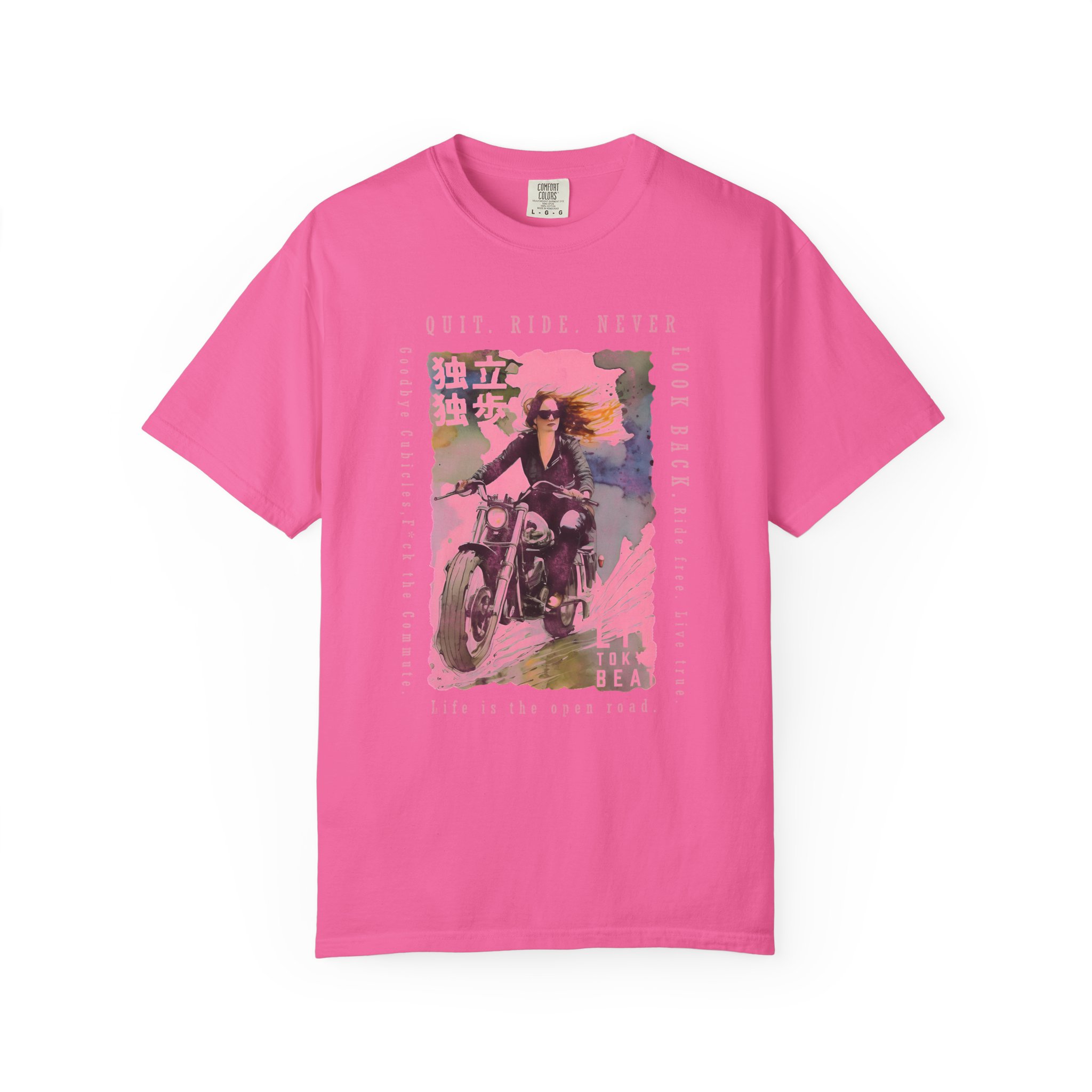 Embrace the rush of independence and the thrill of motion with this motorcycle‑inspired graphic T-shirt from Lil Tokyo Beat. The design features a bold rider set against vibrant color tones, paired with bilingual text that celebrates breaking routines, escaping cubicles, and choosing the open road over anything that holds you back. With its energetic palette, rebellious spirit, and modern streetwear edge, this tee is perfect for riders, creatives, commuters‑turned‑dreamers, and anyone who lives life on their own terms. Whether worn for weekend rides, city adventures, creative sessions, or everyday streetwear, this shirt channels the spirit of freedom, grit, and the courage to look forward without looking back. Created under the Lil Tokyo Beat philosophy—Kool. Artful. Timeless.—this design continues the brand vision as A New Voice in Tee Culture.