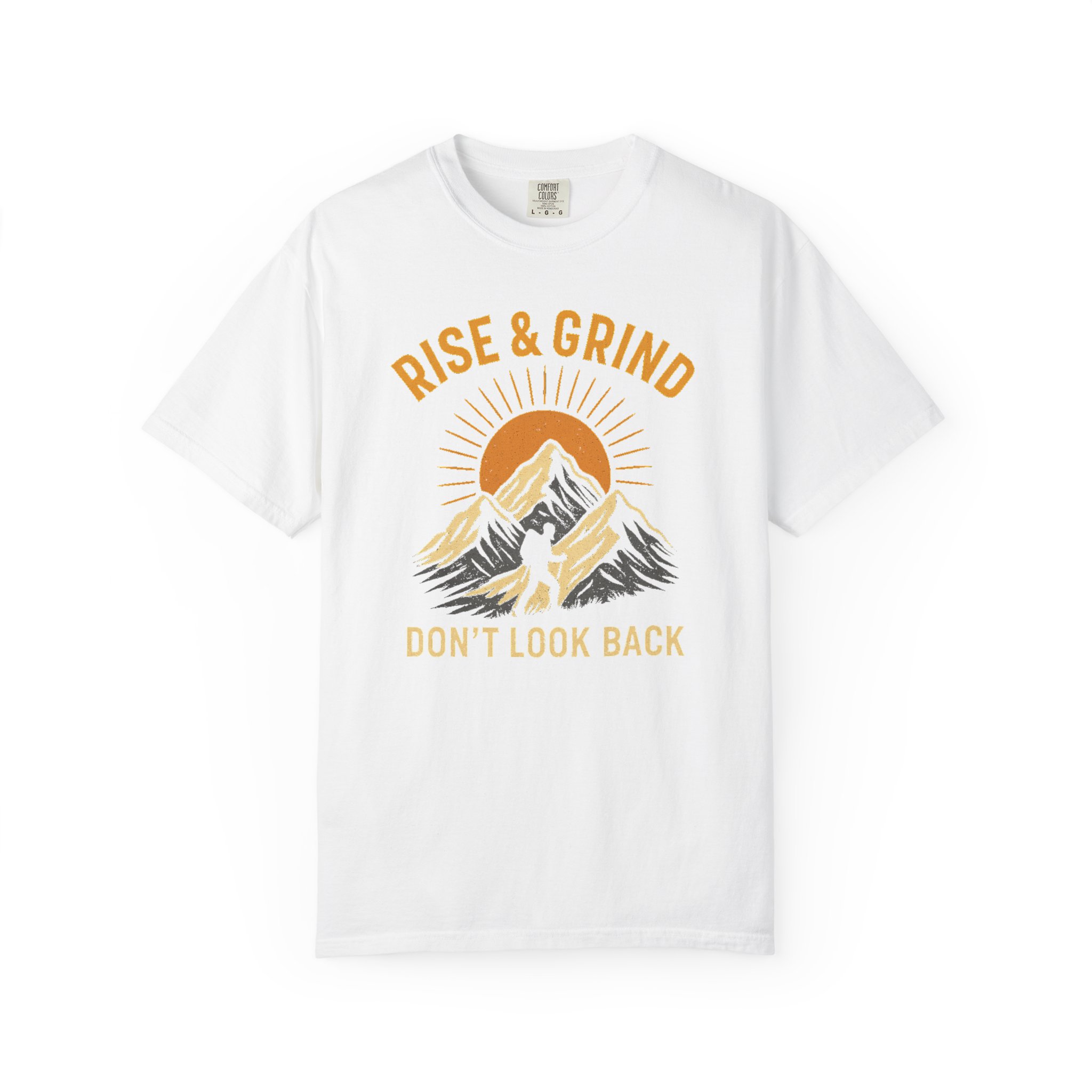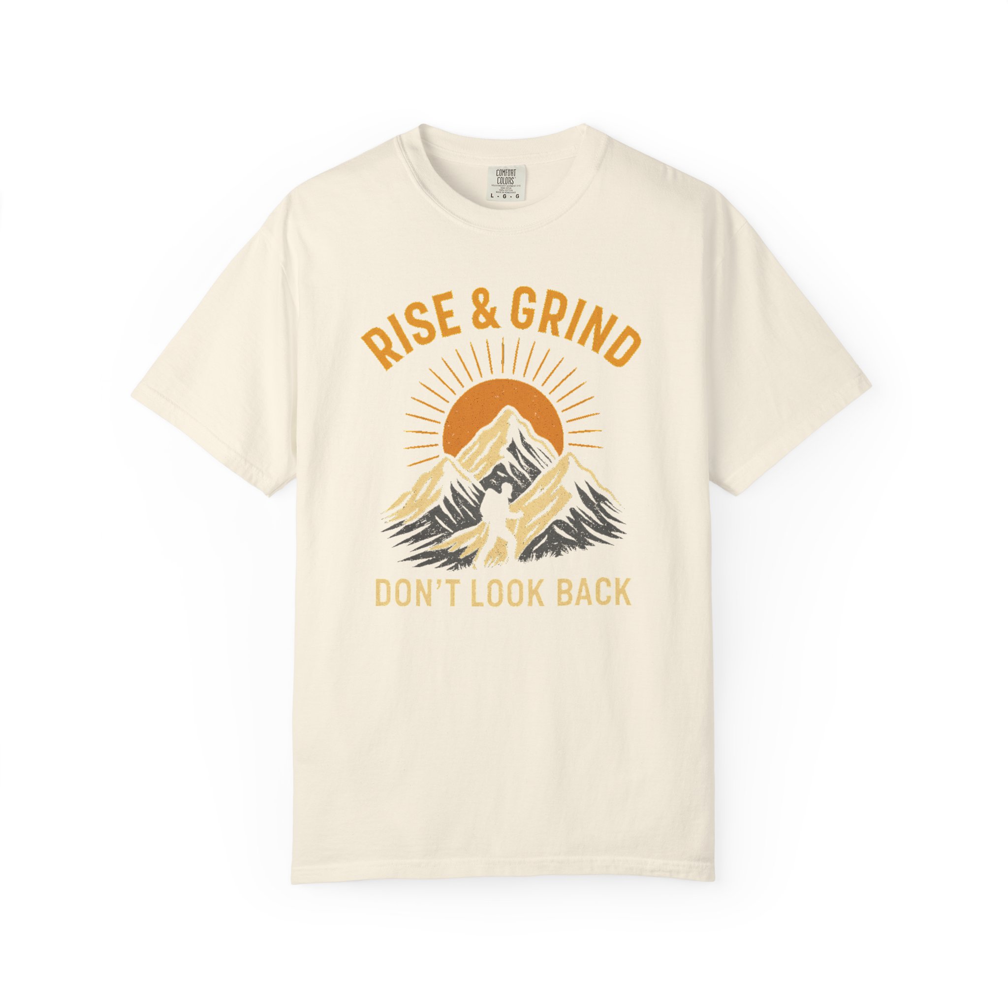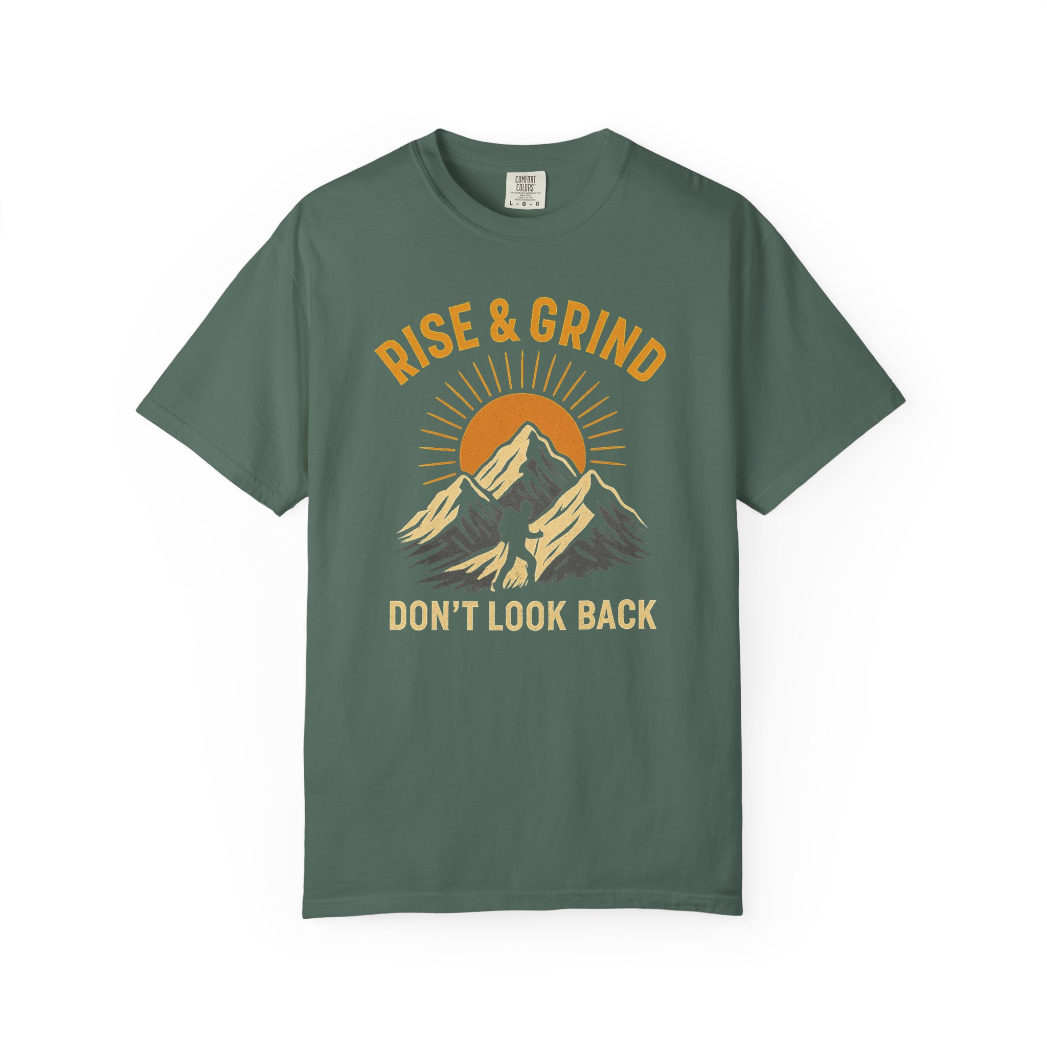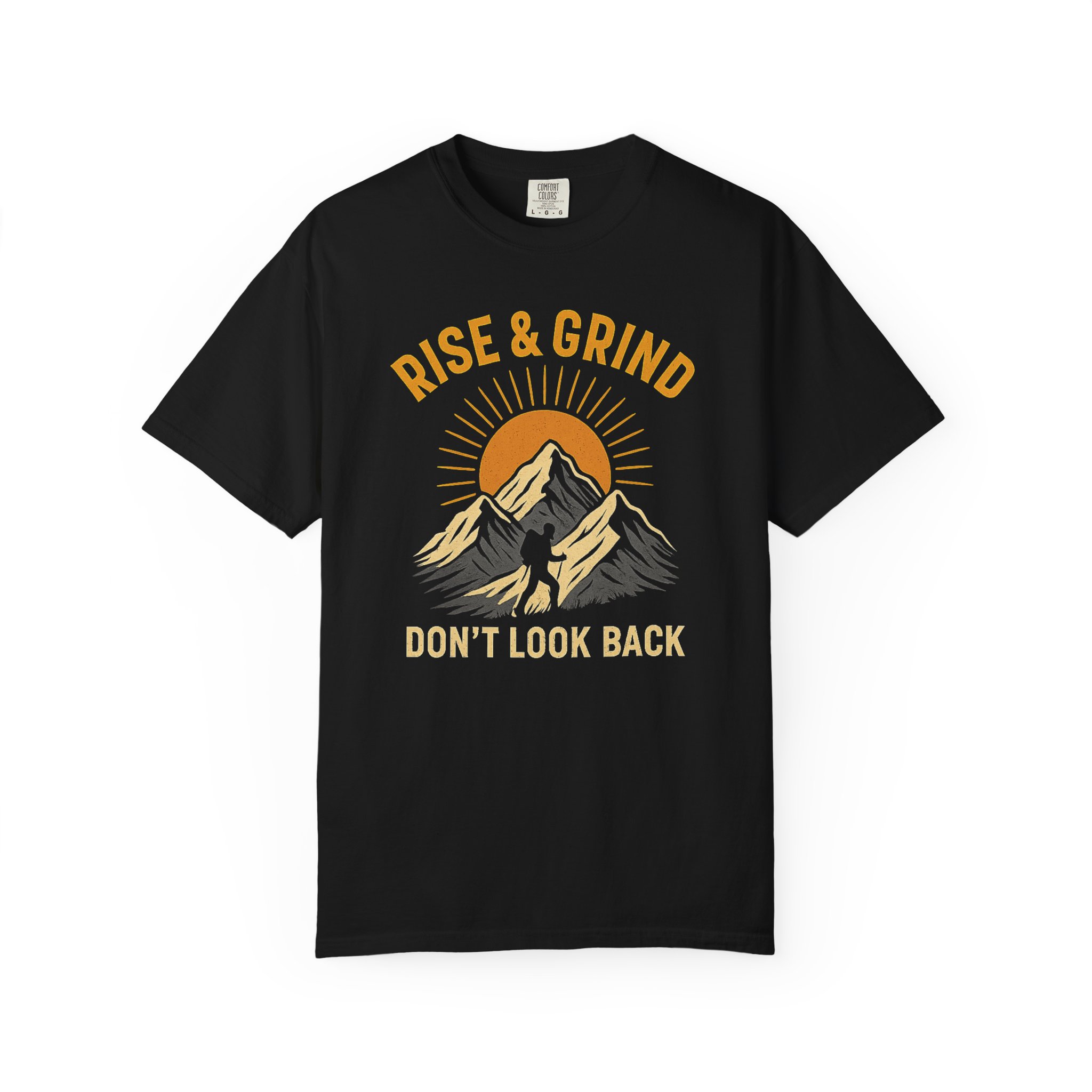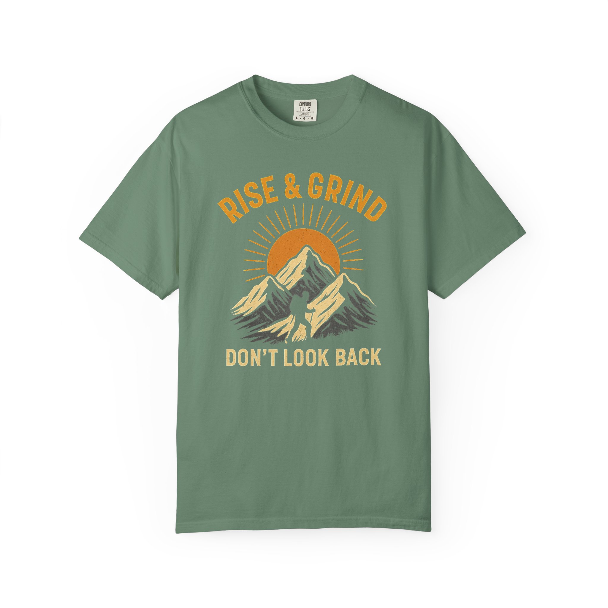 A relaxed, garment-dyed tee that feels like an early morning climb — soft, sturdy, and quietly bold. The sunlit mountain graphic and motivational message sit slightly faded on the chest, evoking first-light hikes and focused routines. Wear it on slow mornings, trailheads, or when you need a steady reminder to move forward. The substantial cotton body and tubular knit give this shirt a lived-in fit that softens with every wash while keeping its shape. It’s a simple, honest layer for people who value comfort, durability, and that subtle outdoorsy look.