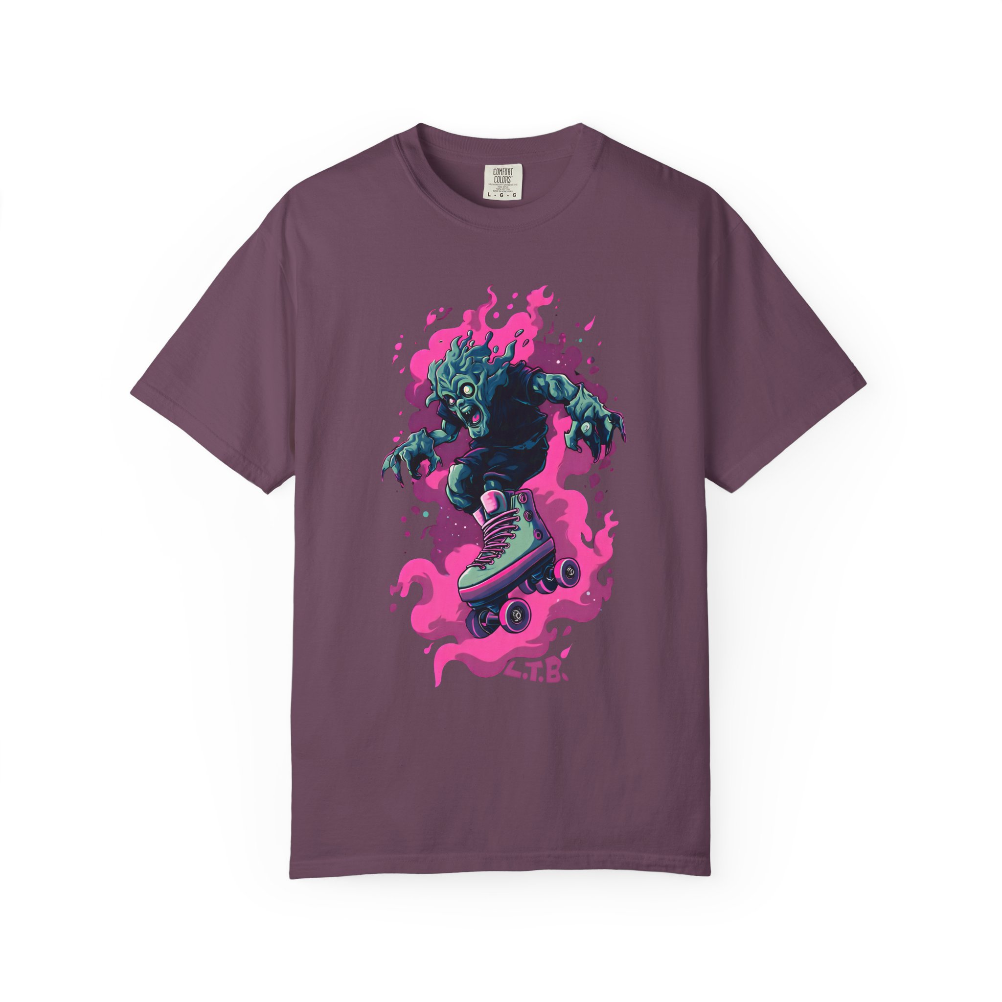 This heavyweight, garment-dyed tee brings bold street energy to everyday wear. The relaxed-fit 100% ring-spun cotton is soft from the first wear, with a lived-in texture from post-construction dyeing. A vivid roller-skating creature graphic—neon magenta flames framing teal and indigo tones—feels like a midnight alley ride turned into art. Wear it layered under a denim jacket or alone when you want your look to speak loud and clear. The tubular knit and double-needle stitching mean the silhouette stays clean and the seams hold up through repeat wears and washes. Available in a wide range of colors and sizes, this tee blends skate-culture attitude with durable, comfortable construction.