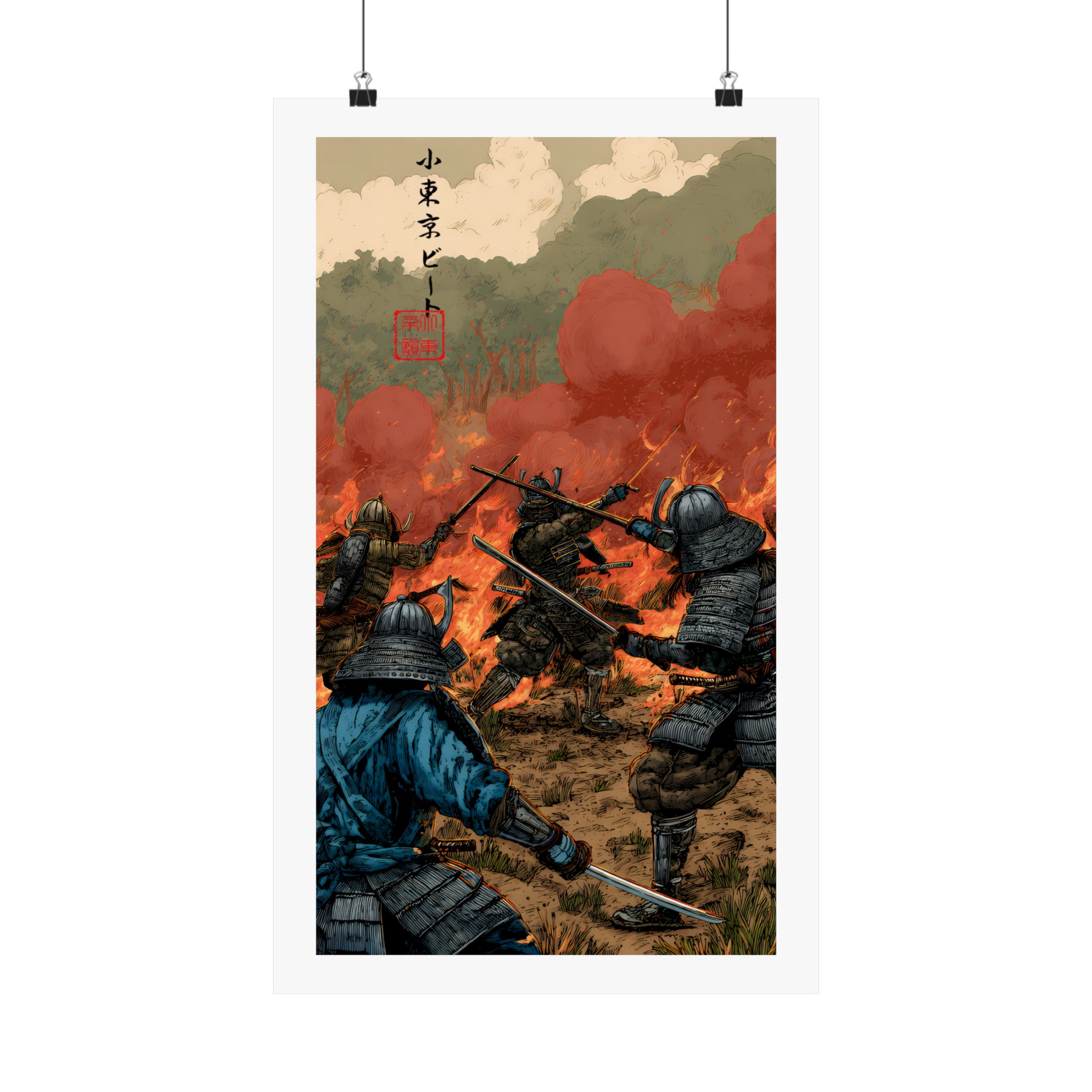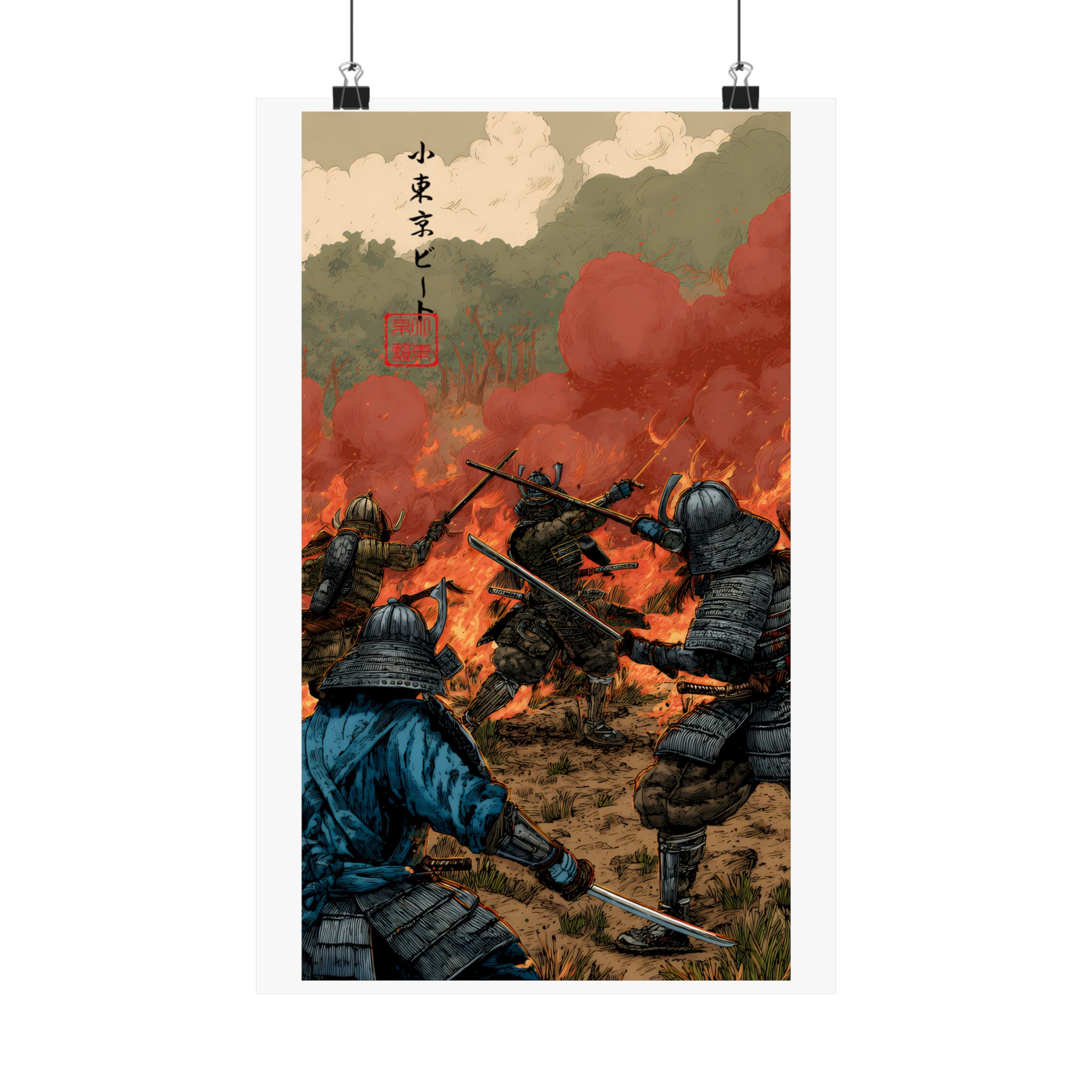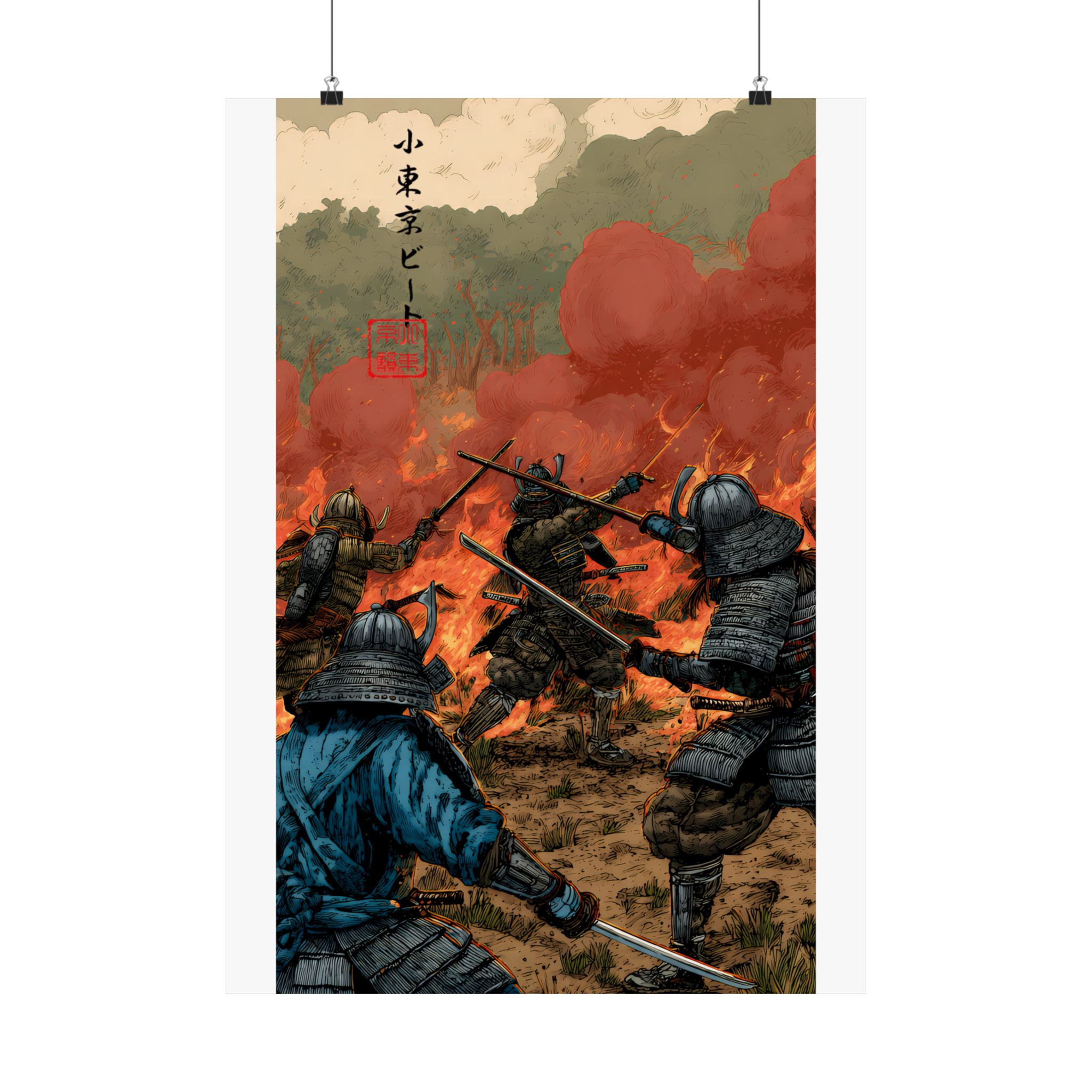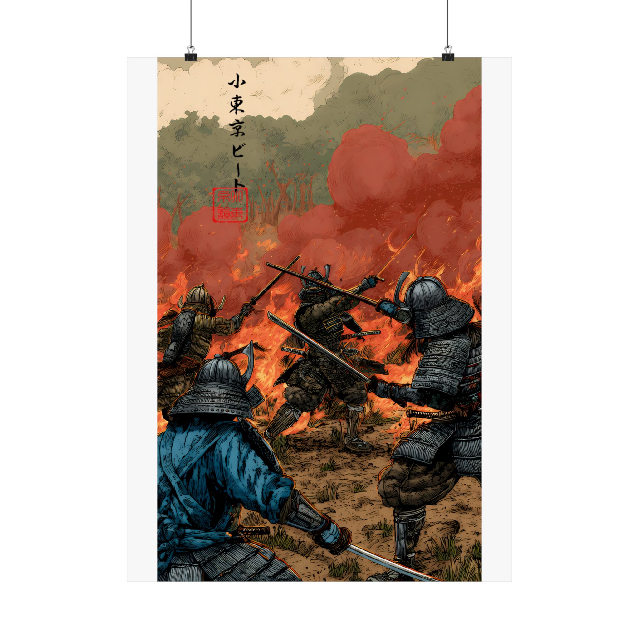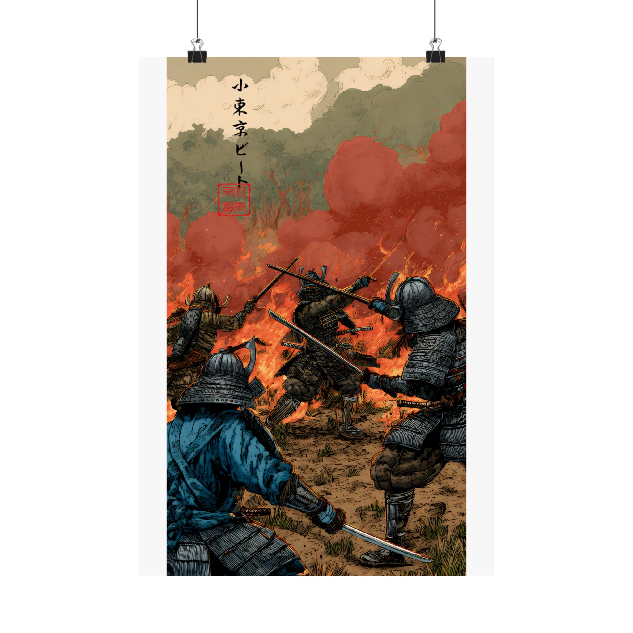 This dramatic samurai battle poster captures the chaos, courage, and intensity of ancient warrior combat. Featuring armored samurai clashing swords amid fire, smoke, and a burning battlefield, this artwork delivers cinematic storytelling and raw motion. The fiery sky, detailed armor, and dynamic action create a powerful focal point that brings history-inspired warrior energy into any space. Perfect for fans of samurai art, Japanese history aesthetics, medieval battle scenes, and bold action decor, this poster embodies Lil Tokyo Beat’s K.A.T. spirit — Kool, Artful, Timeless — transforming your wall into a scene of honor, conflict, and legendary strength.