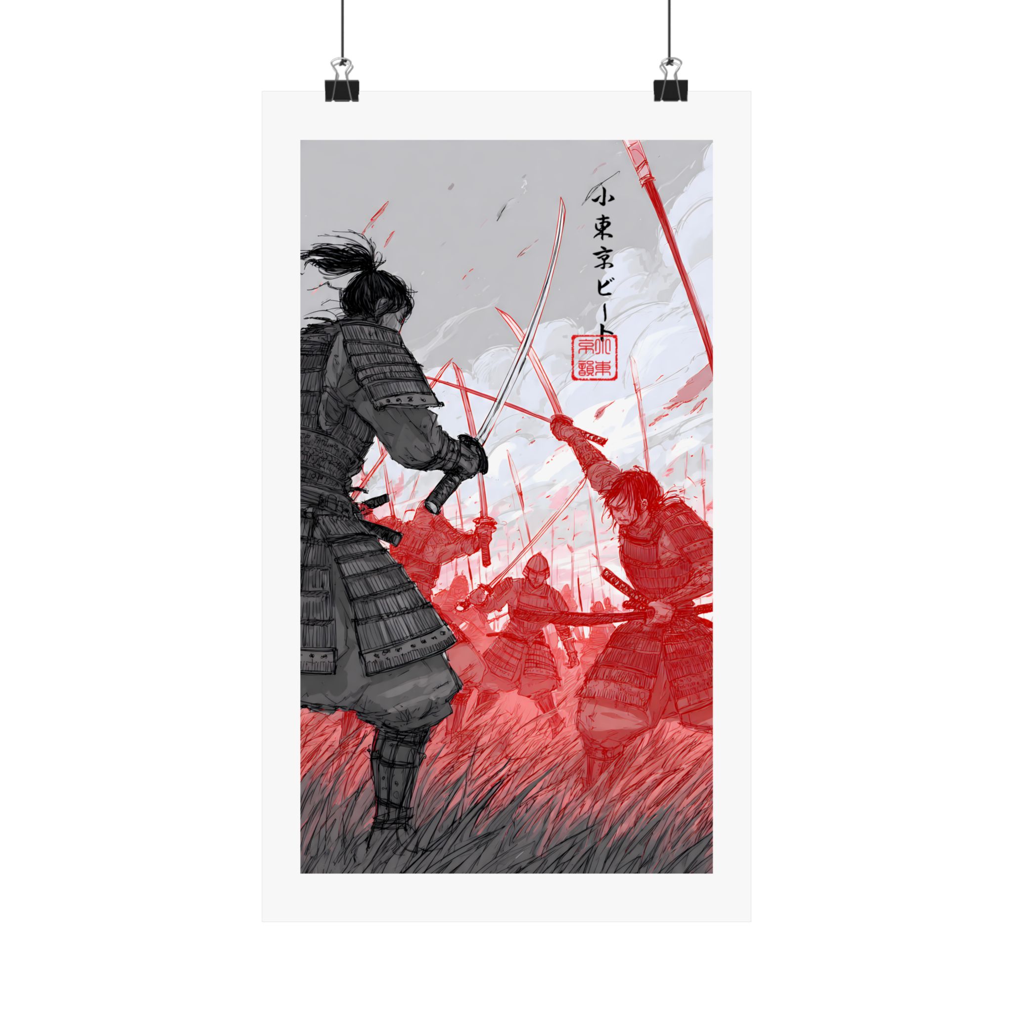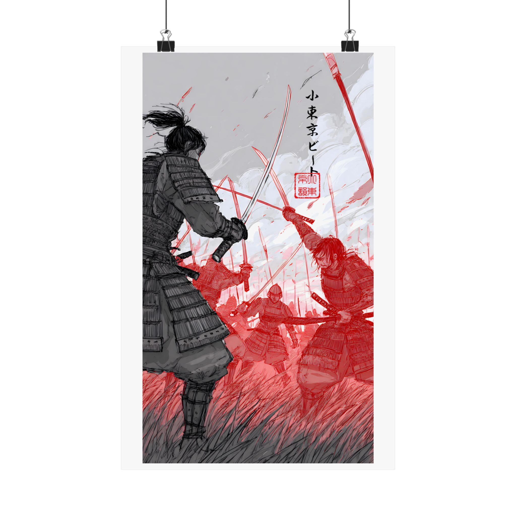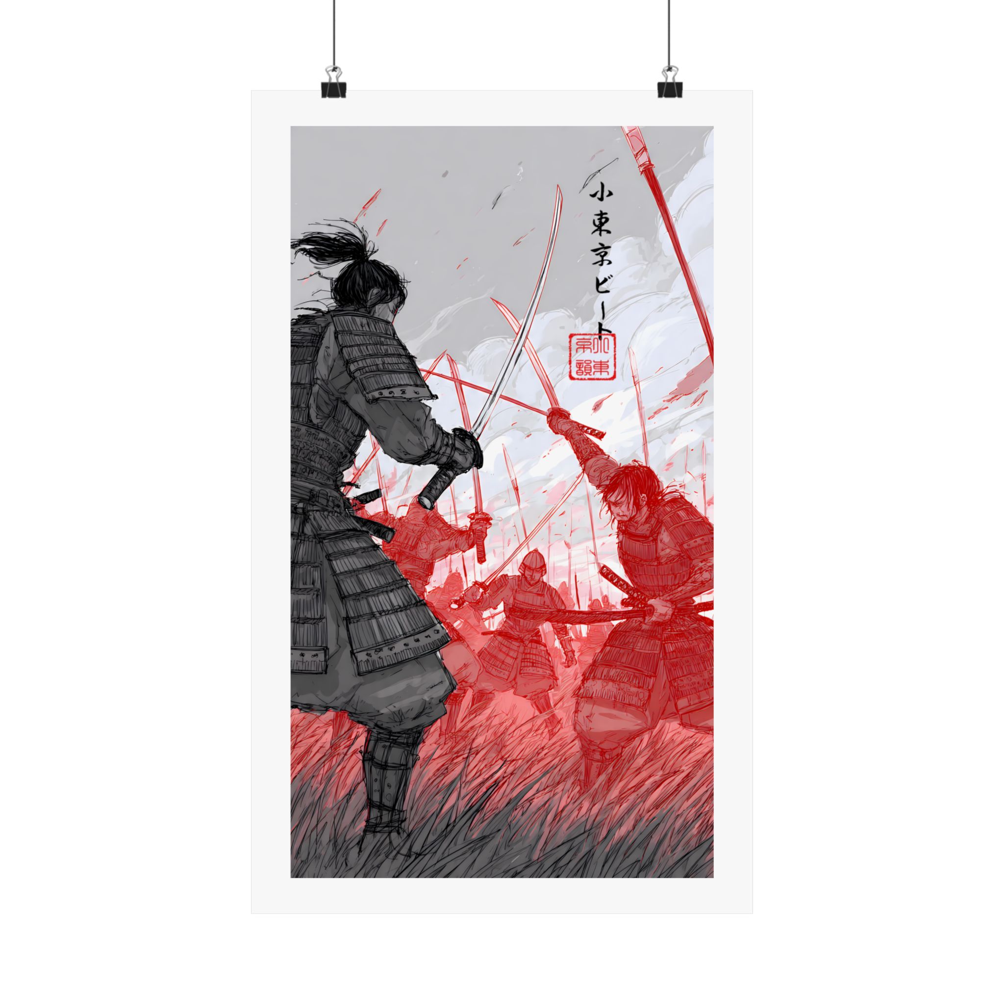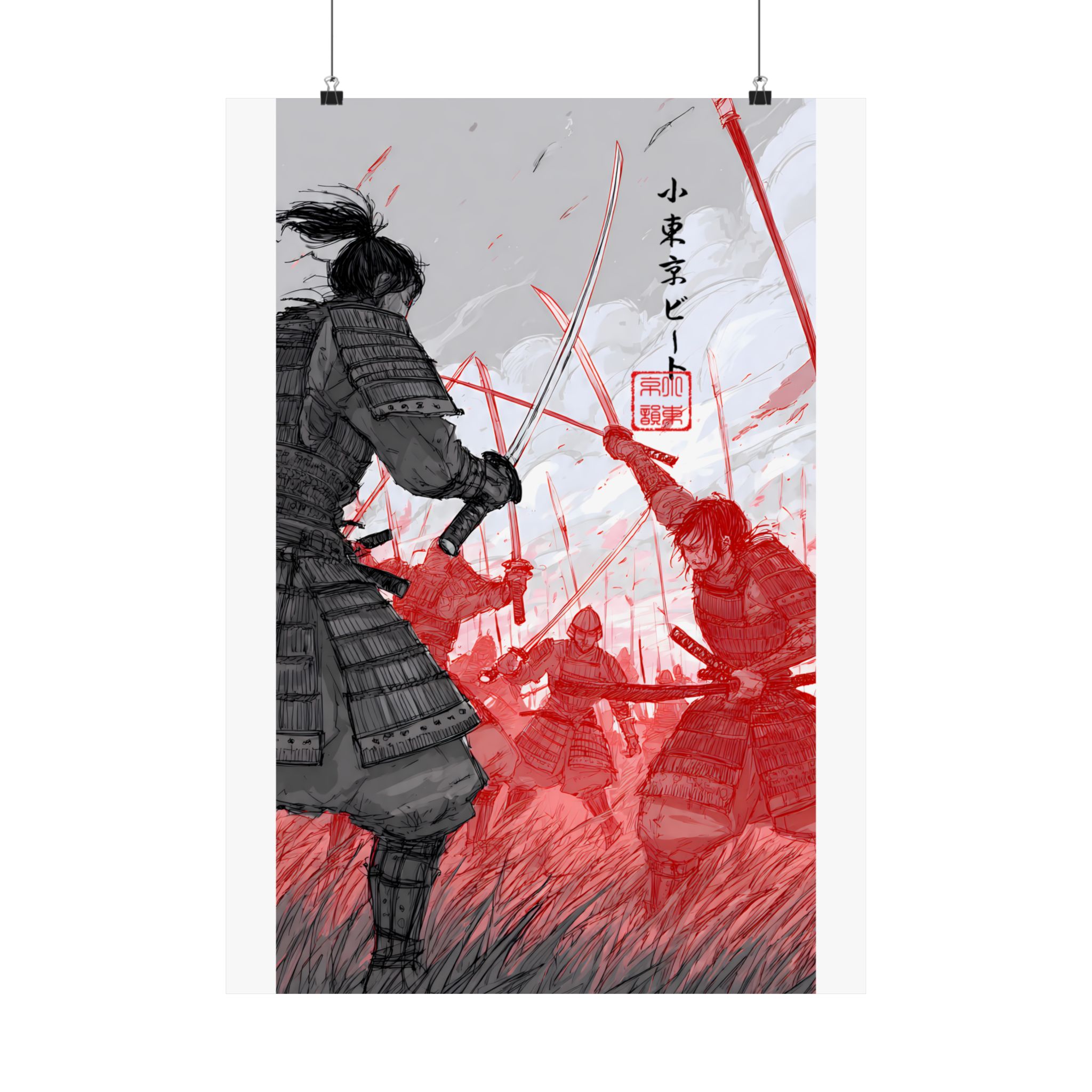 A striking matte poster that captures the raw intensity of samurai combat with painterly strokes and a bold red accent. Rendered on museum-grade archival paper using giclée printing, the image holds deep blacks and vivid scarlet tones that stay true over time. Hung in a study, game room, or studio, this vertical piece draws the eye with its motion — a lone warrior poised against a sea of foes — and brings a cinematic, historical mood to interior walls. The matte finish reduces glare so details remain visible under soft light, and the wide range of available sizes makes it simple to frame or display in a gallery-style arrangement.