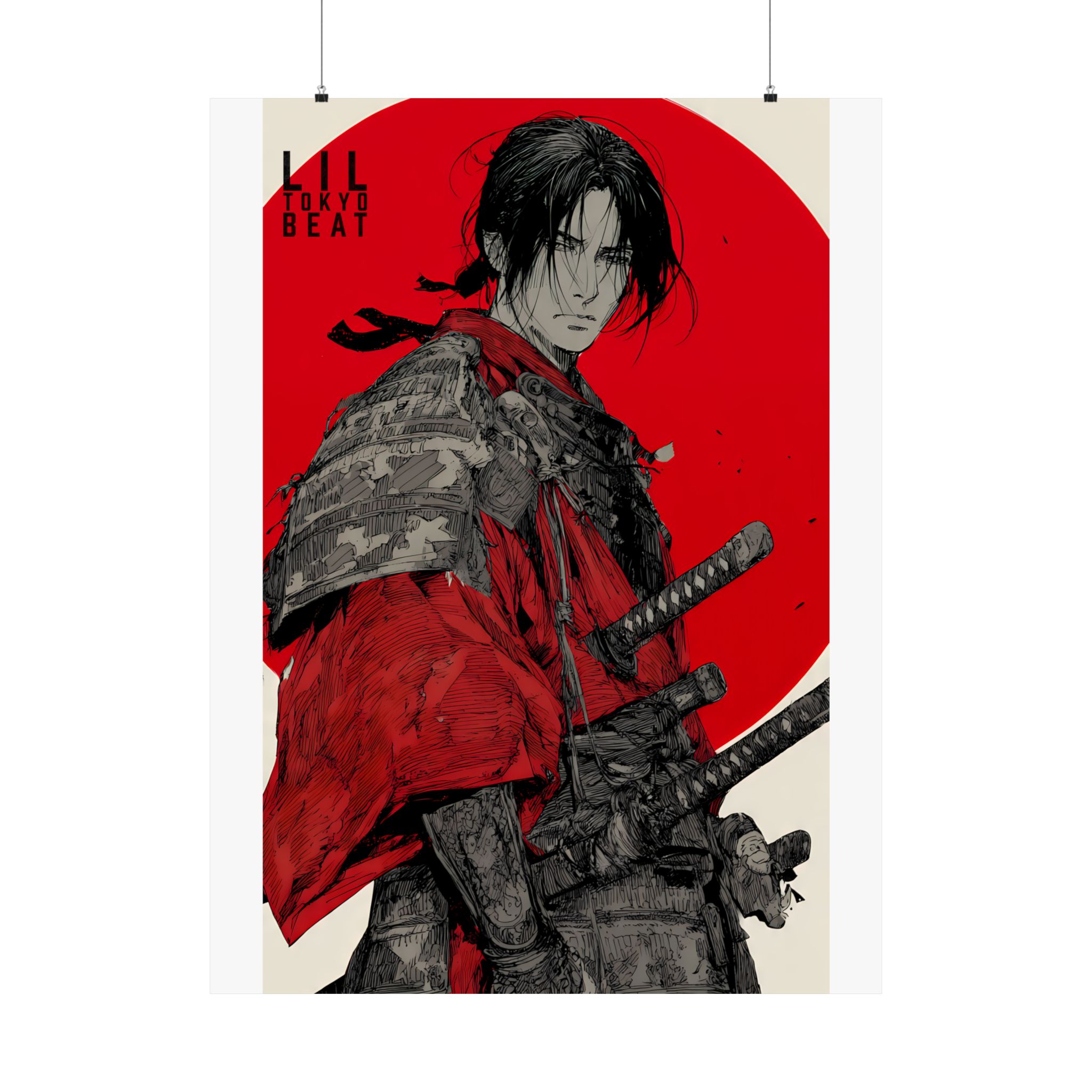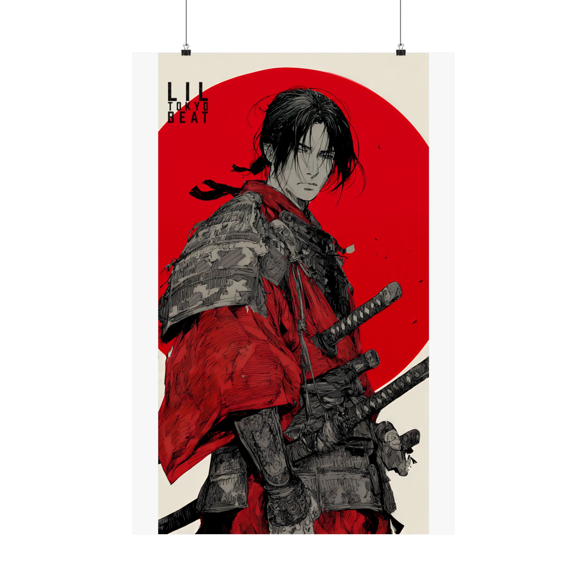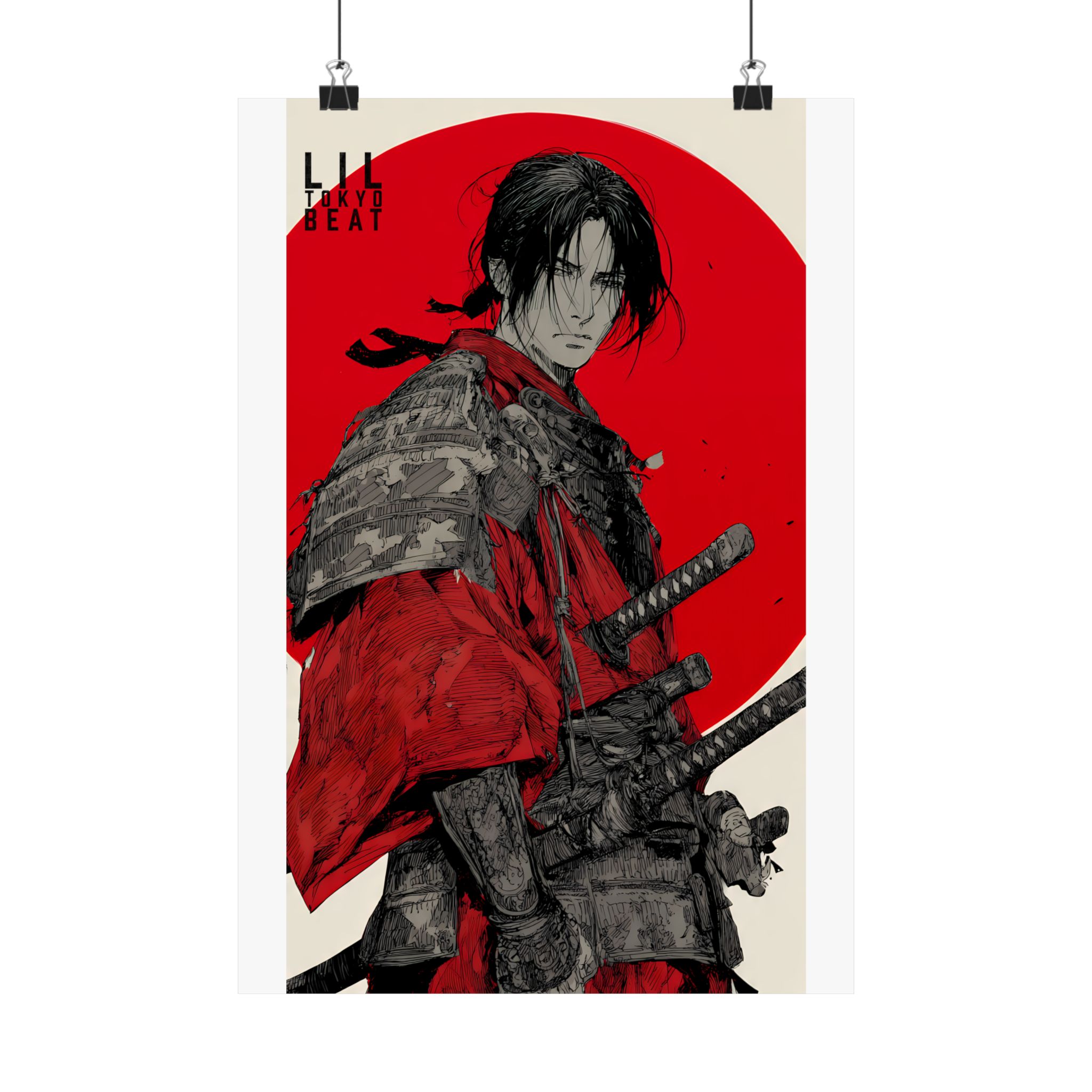 This matte vertical poster brings bold, manga-inspired energy to any wall. The composition centers on a lone samurai rendered in textured ink and rich reds, printed with museum-grade giclée for deep, lasting color. The matte finish soaks up glare, letting fine linework and shadowed detail breathe. Hang it in a studio, bedroom, or hallway to create a charged focal point that feels lived-in and cinematic — like a scene paused between breaths.
