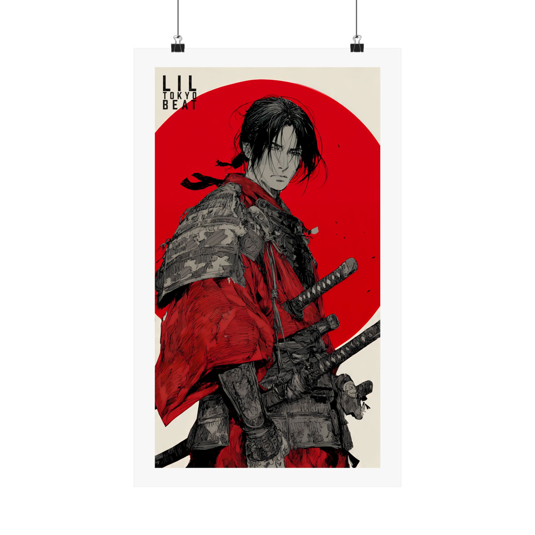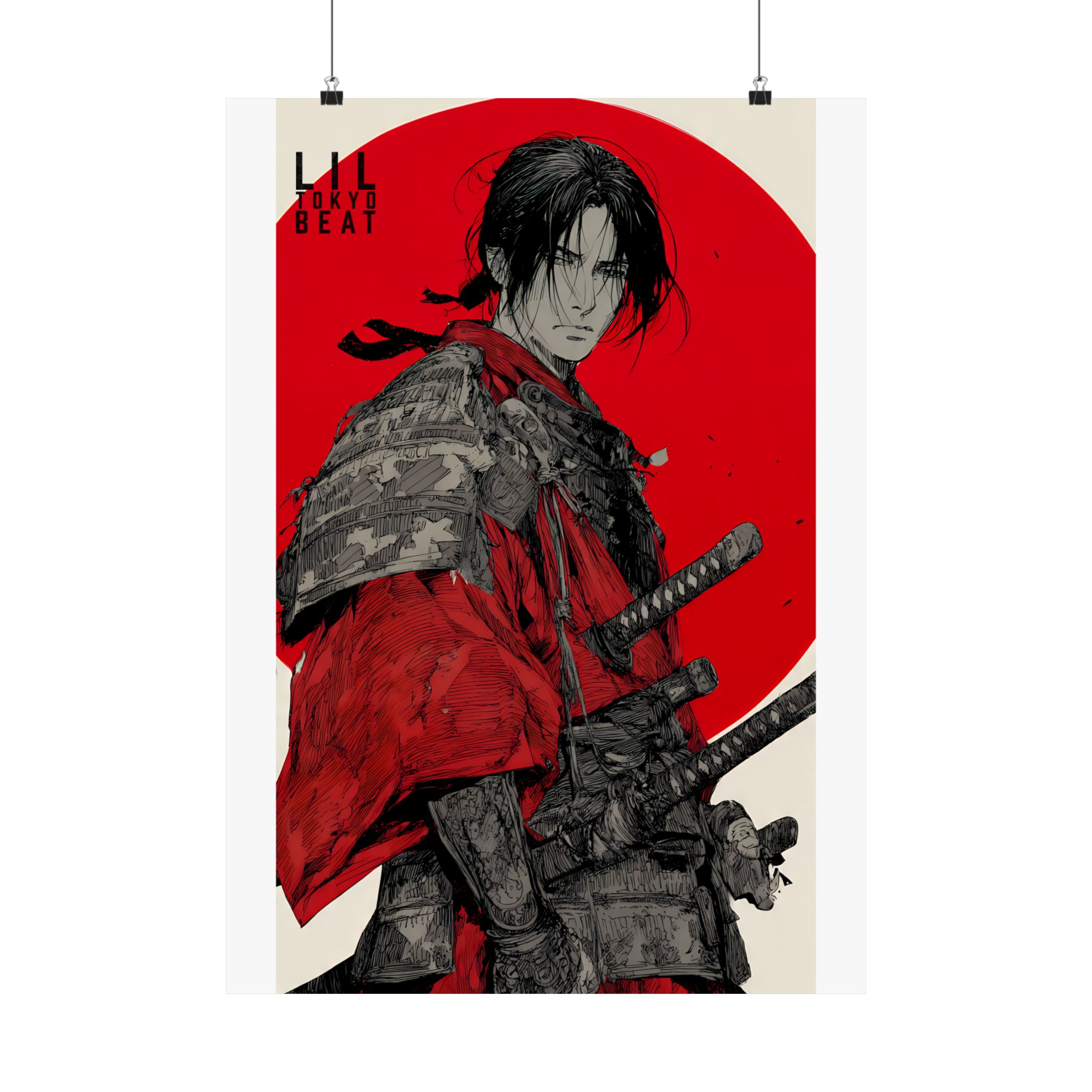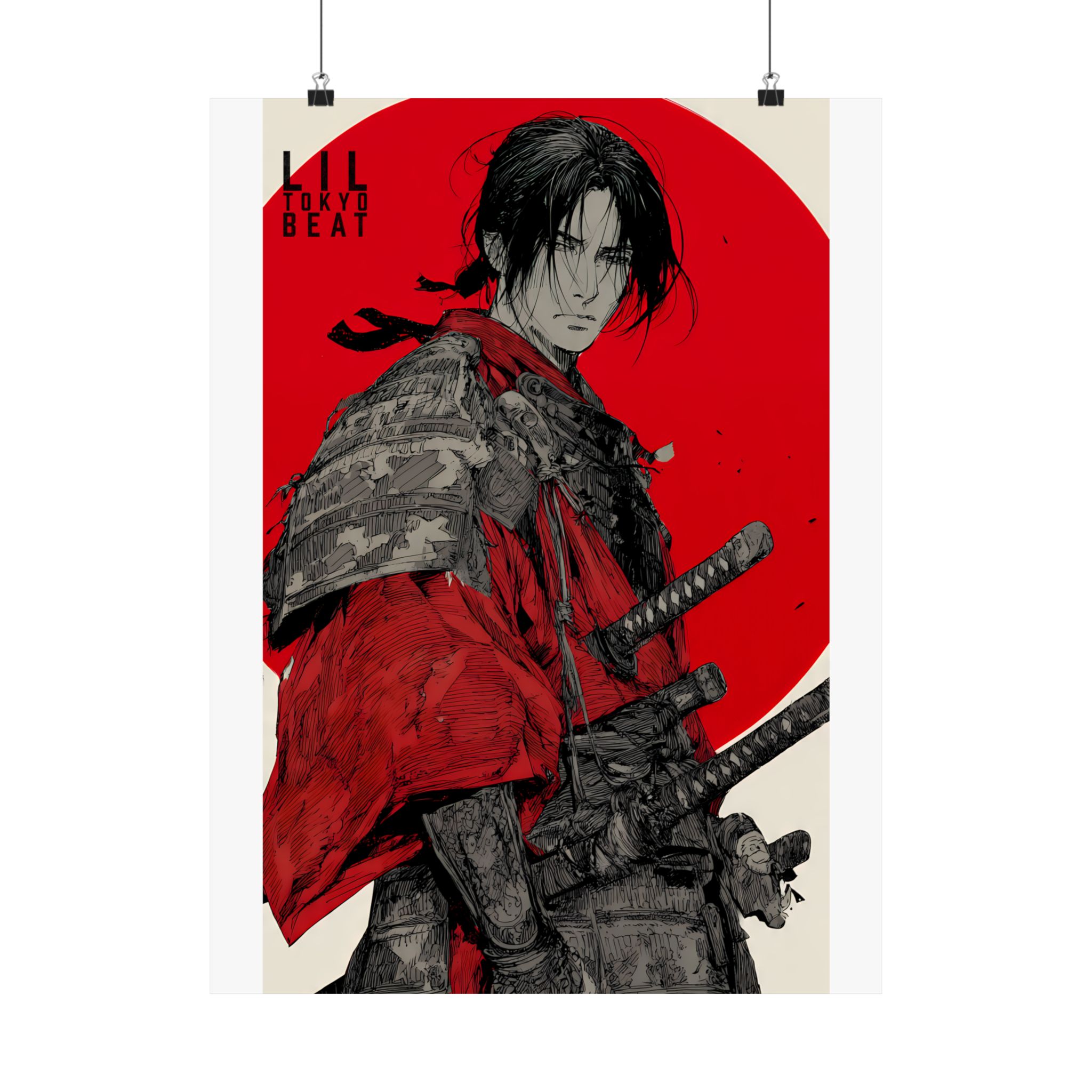 This matte vertical poster brings bold, manga-inspired energy to any wall. The composition centers on a lone samurai rendered in textured ink and rich reds, printed with museum-grade giclée for deep, lasting color. The matte finish soaks up glare, letting fine linework and shadowed detail breathe. Hang it in a studio, bedroom, or hallway to create a charged focal point that feels lived-in and cinematic — like a scene paused between breaths.