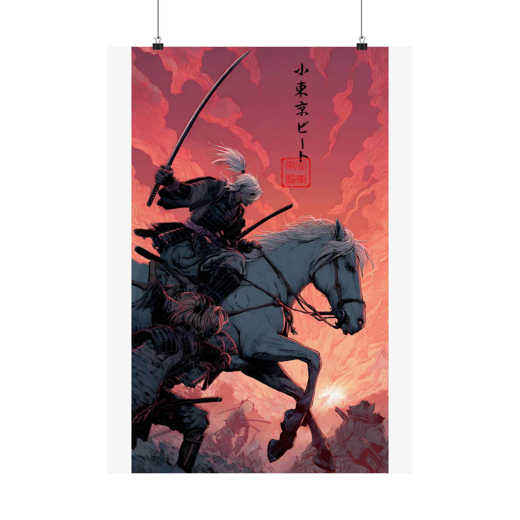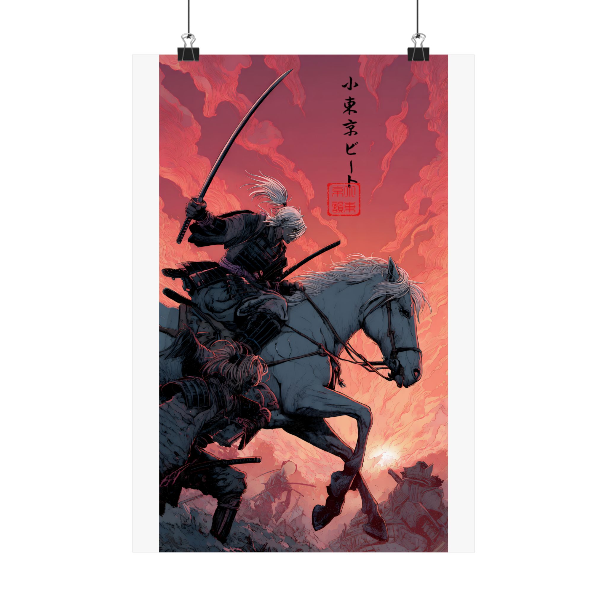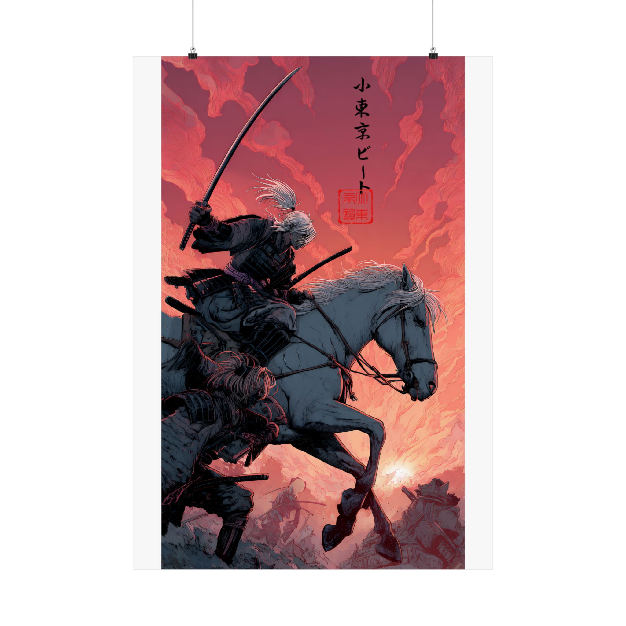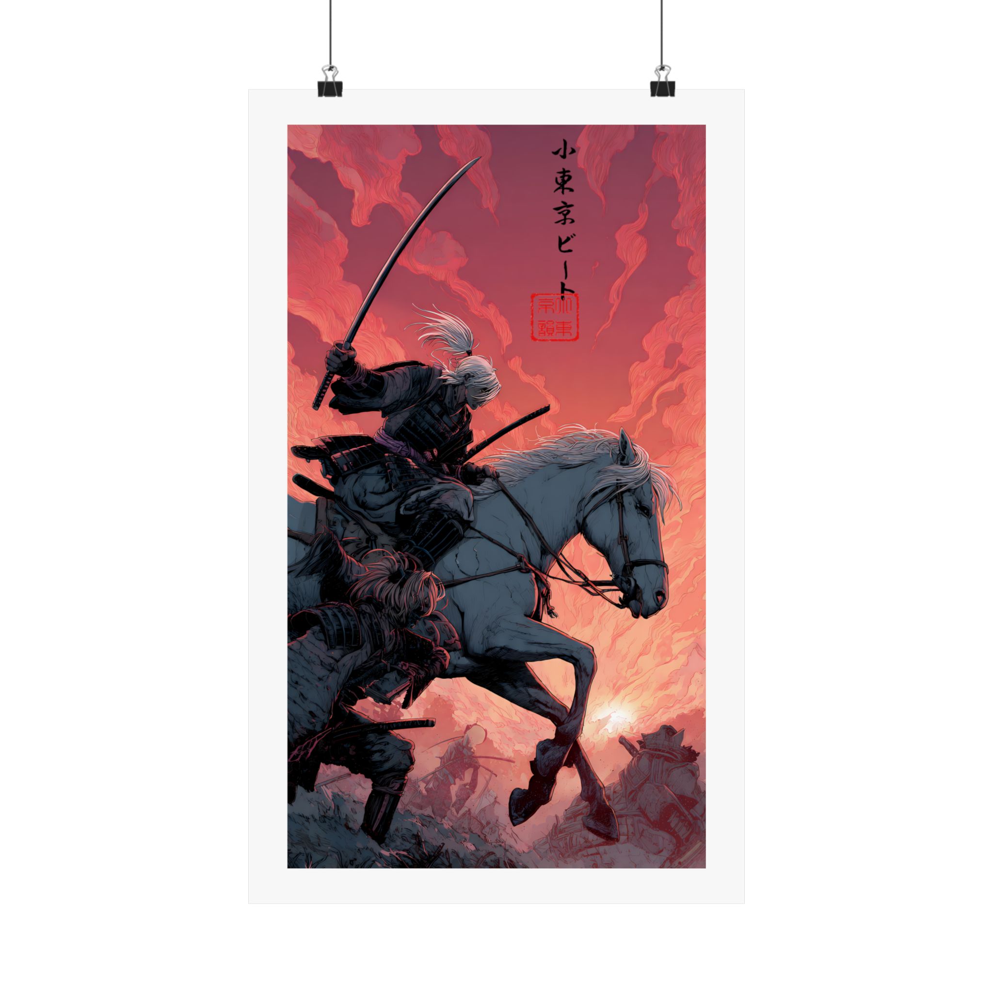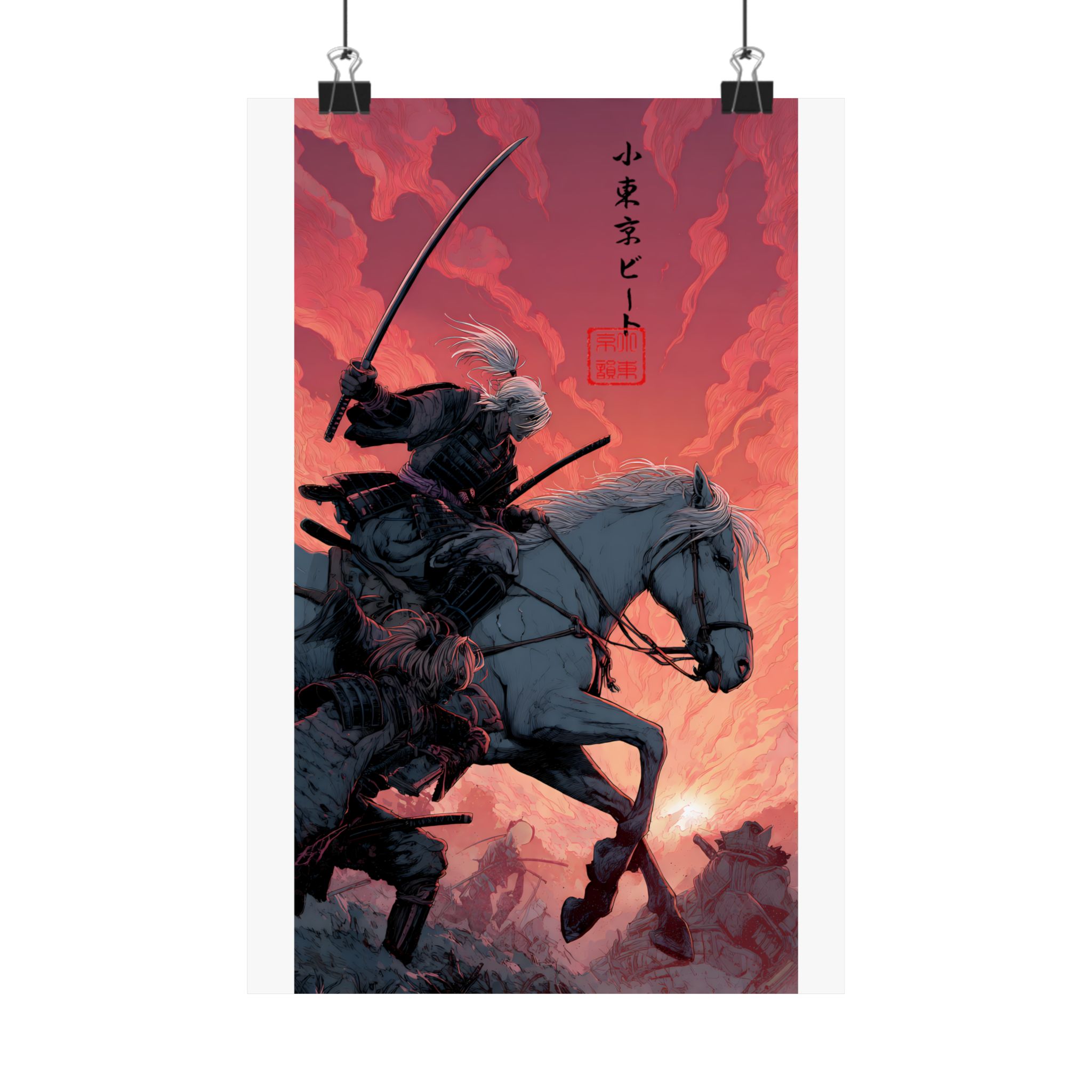 A matte vertical poster printed on museum-grade archival paper, this piece captures a dramatic samurai mounted on horseback against a molten-red sky. The heavy-giclée inks deliver intense, lightfast colors that keep the bold contrasts and delicate linework alive. With a soft, anti-reflective matte finish, details remain crisp without glare — suited for indoor galleries, dens, or personal studios. Sized across many options, the print ships with slight production tolerances and is intended for adult collectors who appreciate finely rendered, cinematic illustration with a nod to traditional Japanese motifs.