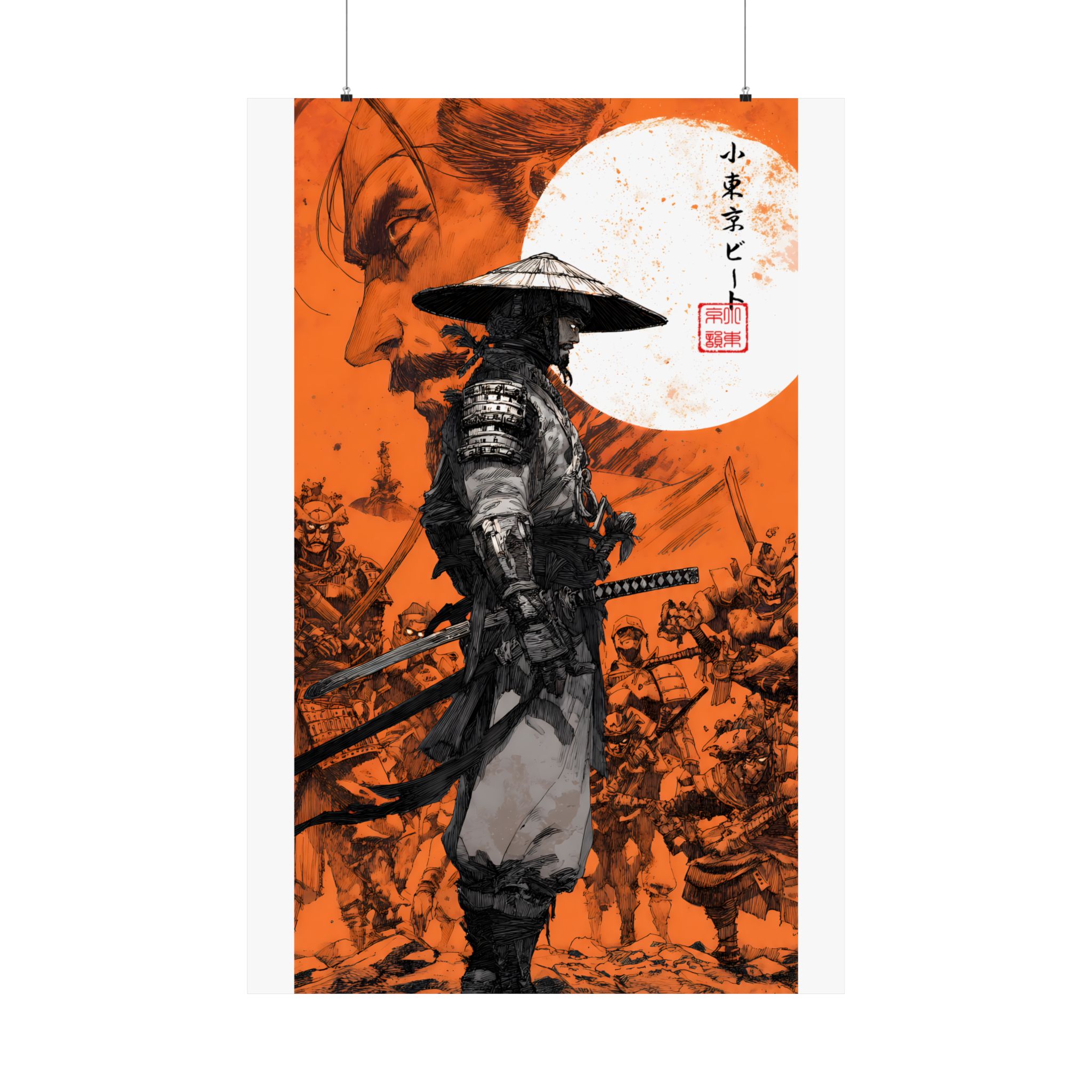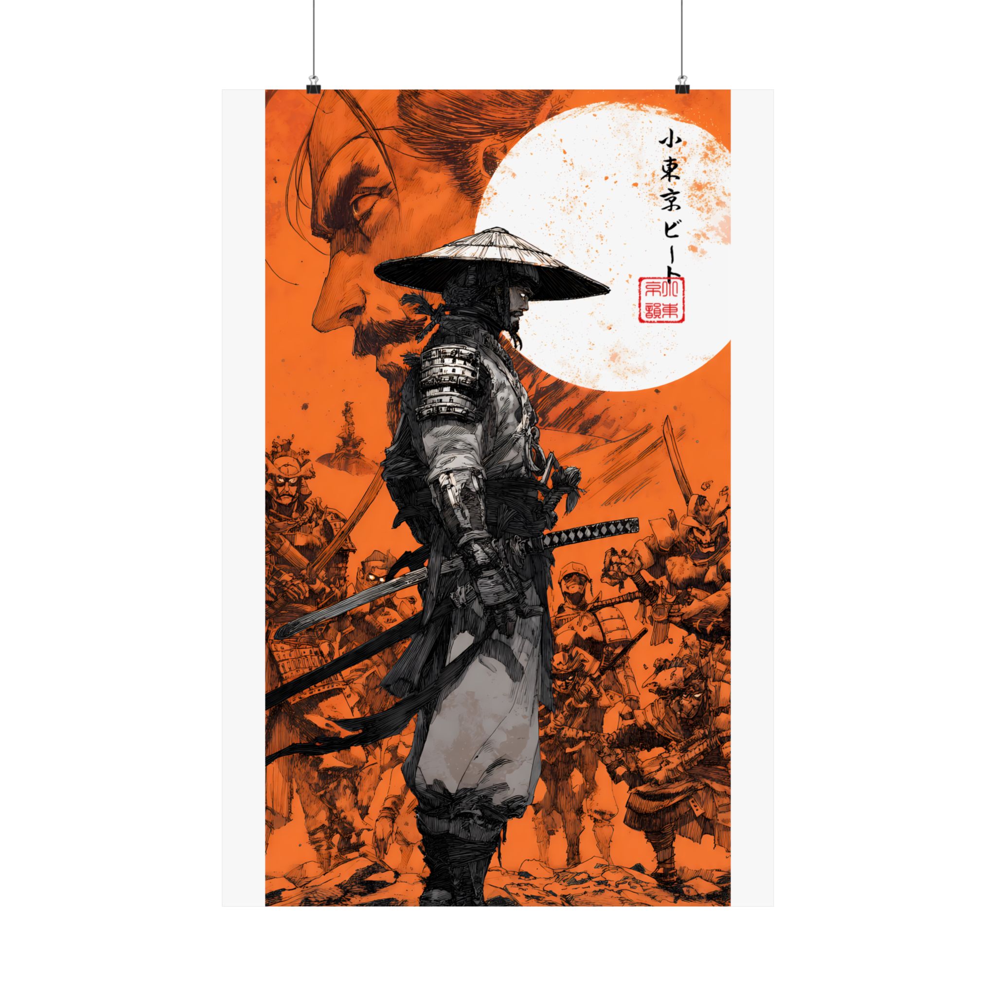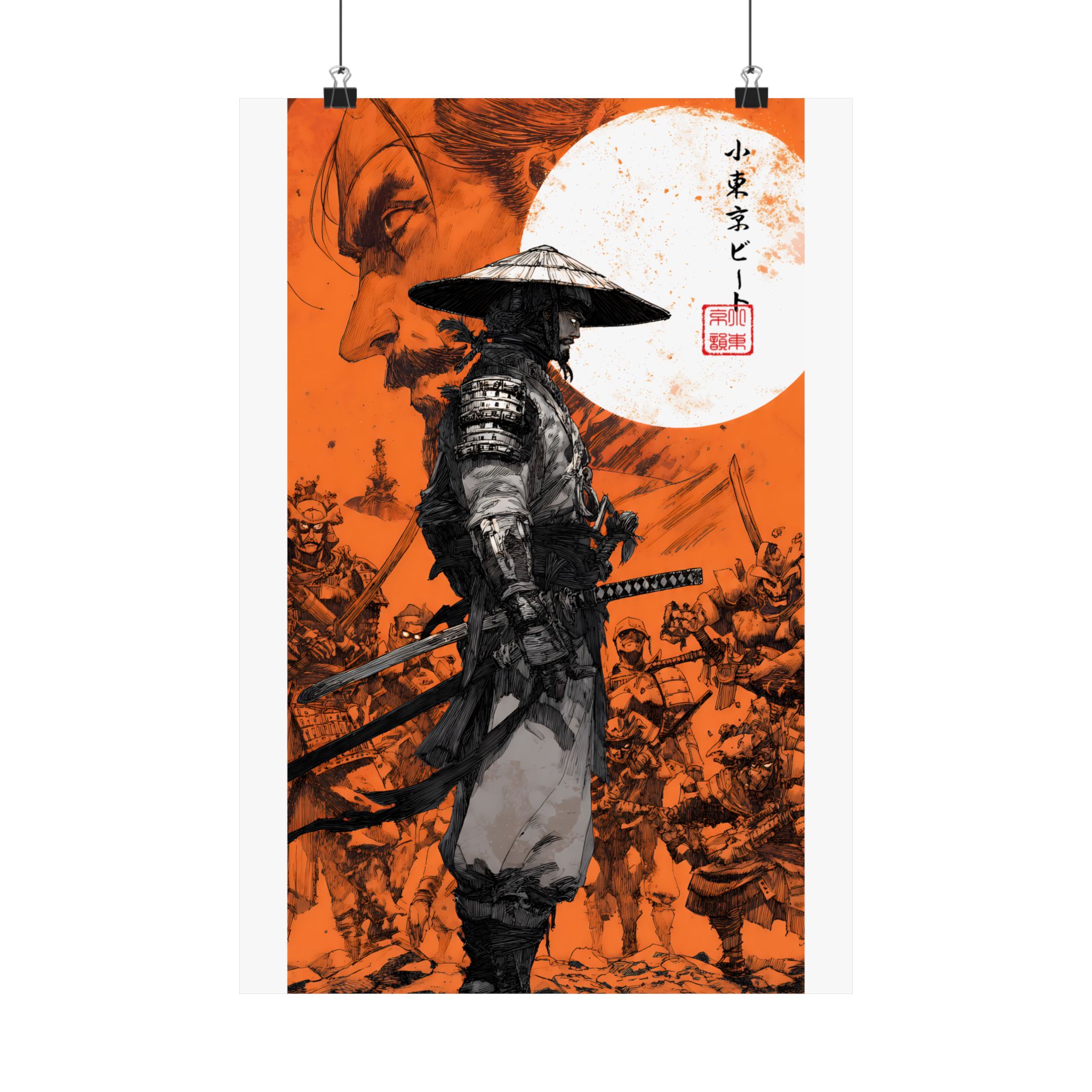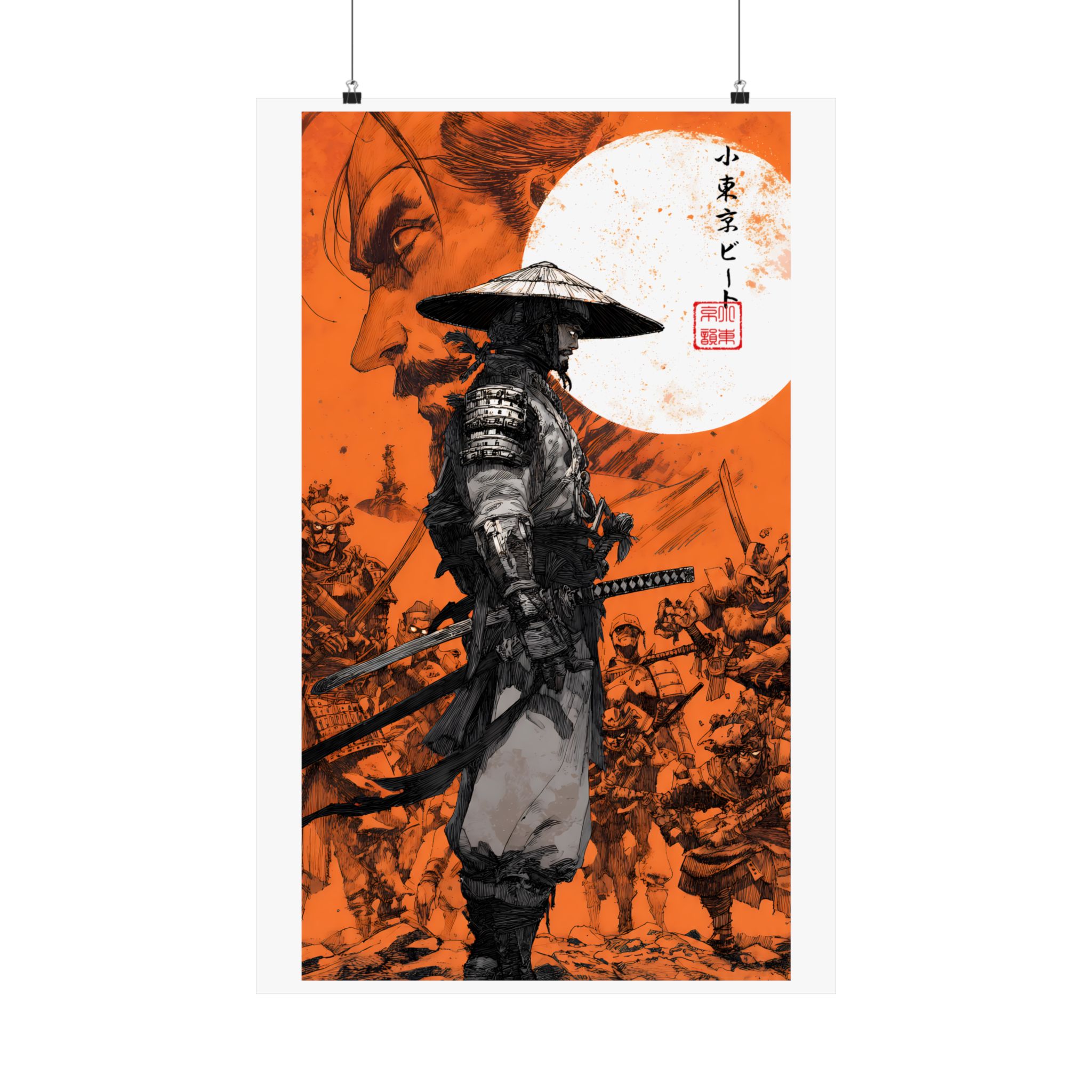 A striking vertical poster that channels samurai-era intensity and quiet resolve. Printed on museum-grade archival paper with rich giclée inks, the artwork’s deep orange backdrop and inked figures retain bold contrast and fine detail. The central ronin stands framed by a full moon and a tide of warriors — a scene that feels equal parts history and myth. Hung in a hallway, studio, or living room, this matte poster brings a cinematic, contemplative energy to any indoor wall, inviting long looks at its brushwork and texture.