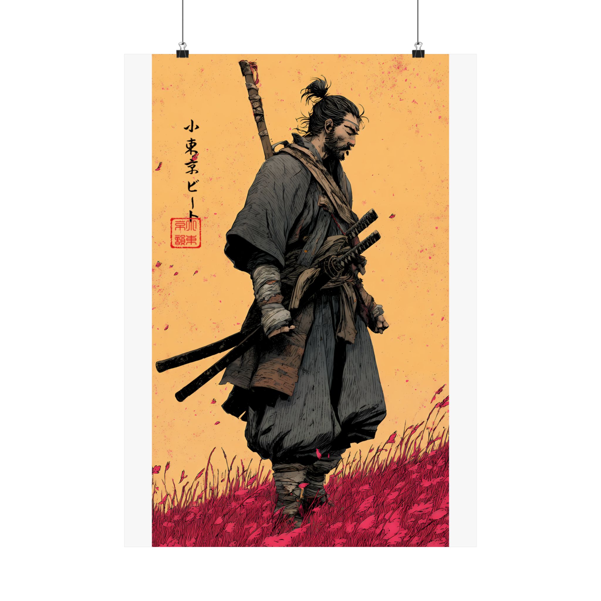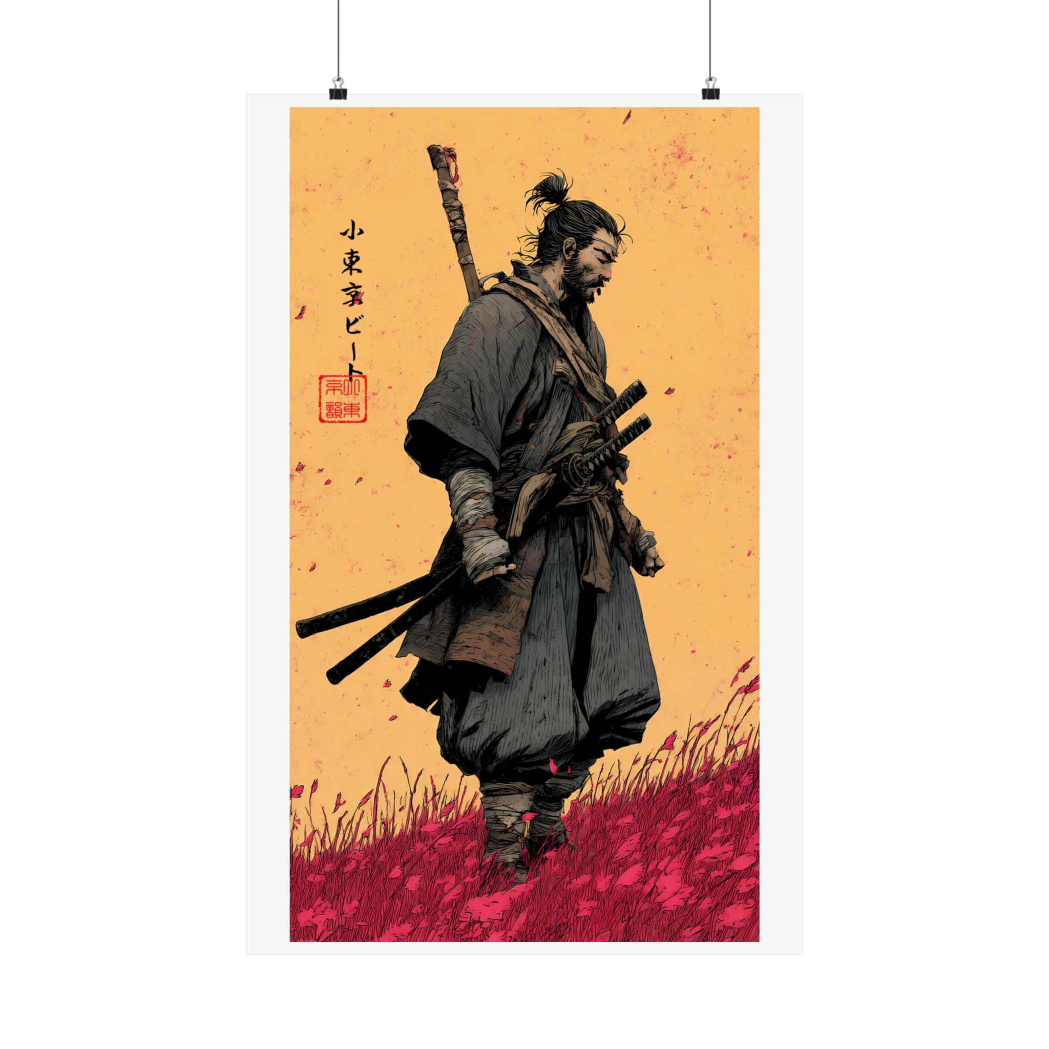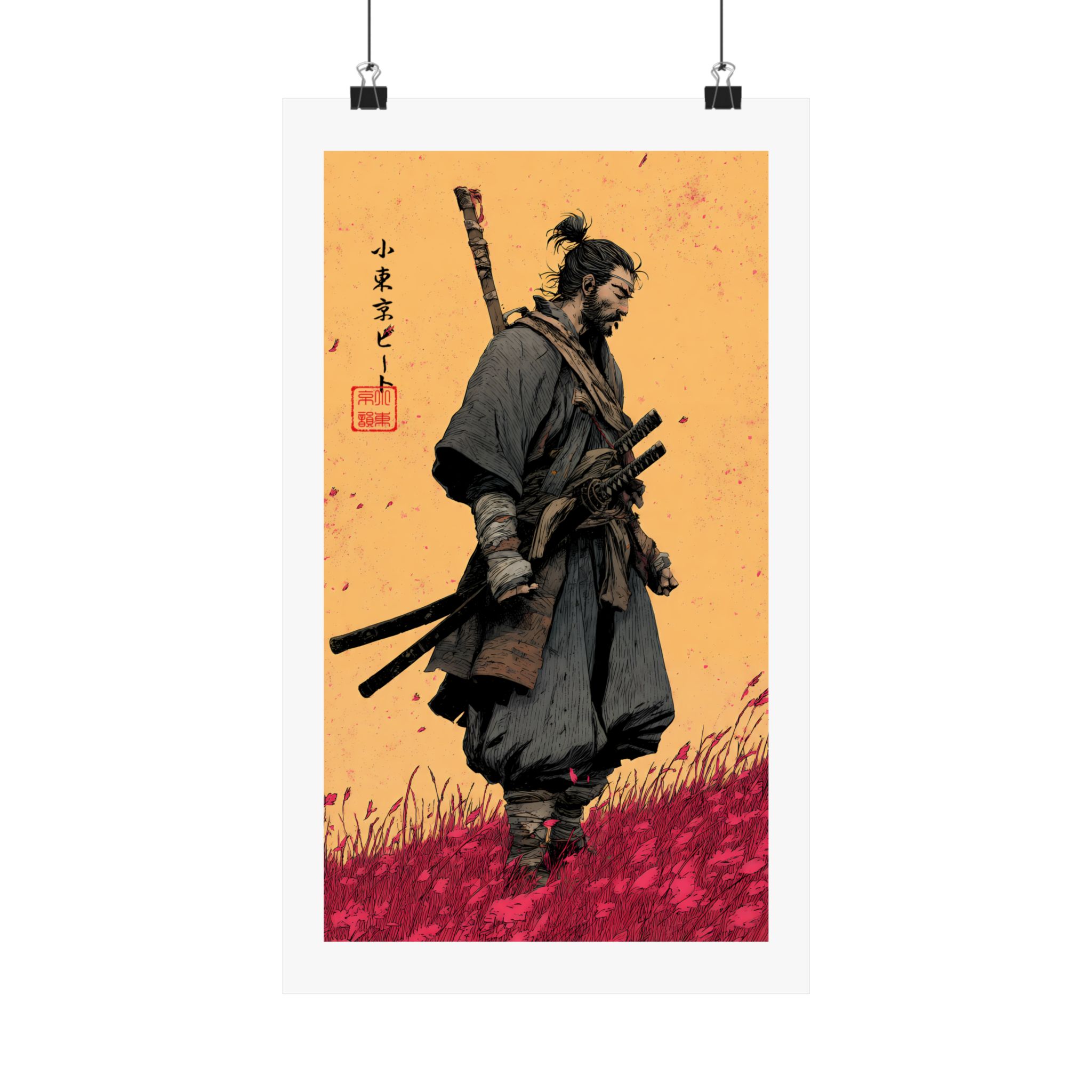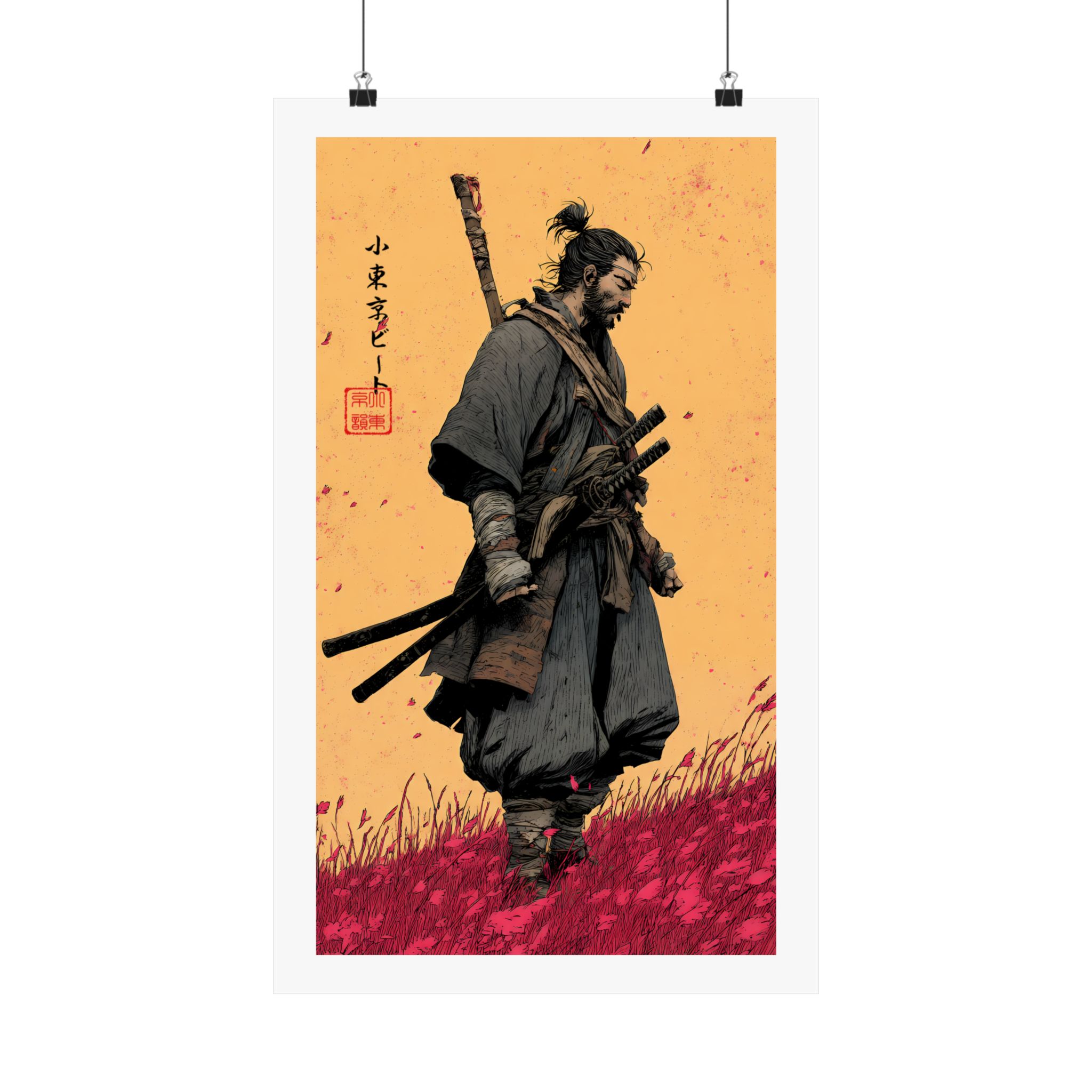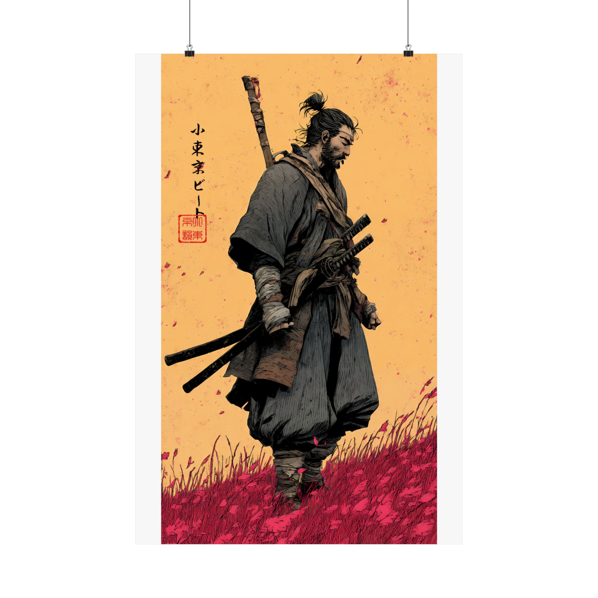 A matte vertical poster that brings a quiet, rugged energy into any indoor space. Printed on museum-grade archival paper with giclée inks, this piece holds deep, saturated color—rich ochres and crimson grasses—that stay vivid under regular light. The matte finish absorbs glare for tactile depth and a museum-like presence on the wall. Sized to fit narrow vertical spaces, it reads like a moment captured: a lone warrior walking through windswept fields, textured brushwork, and subtle Asian calligraphic accents. Hang it where thoughtfulness and atmosphere matter — a study, entryway, or beside shelves of well-loved books — to anchor the room with a timeless, contemplative mood.