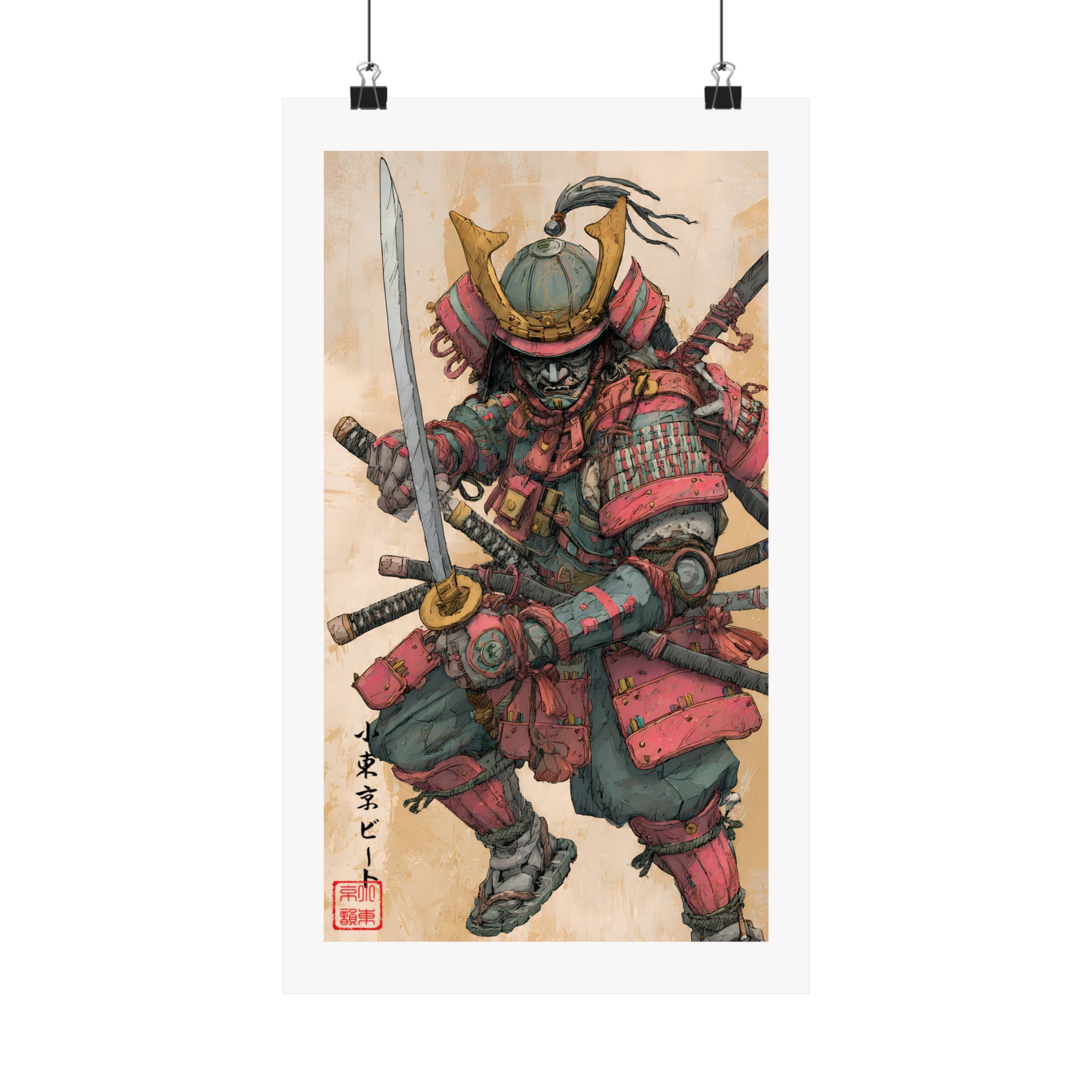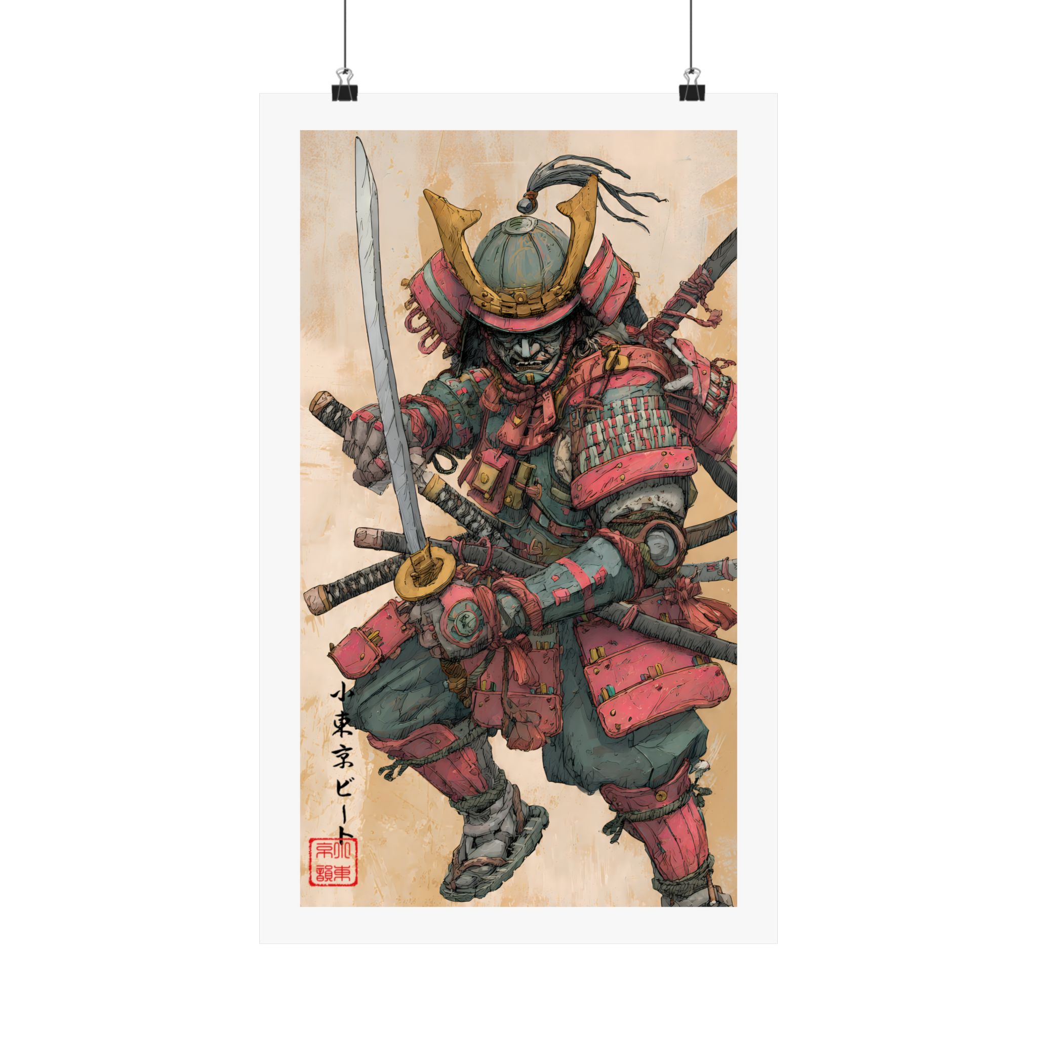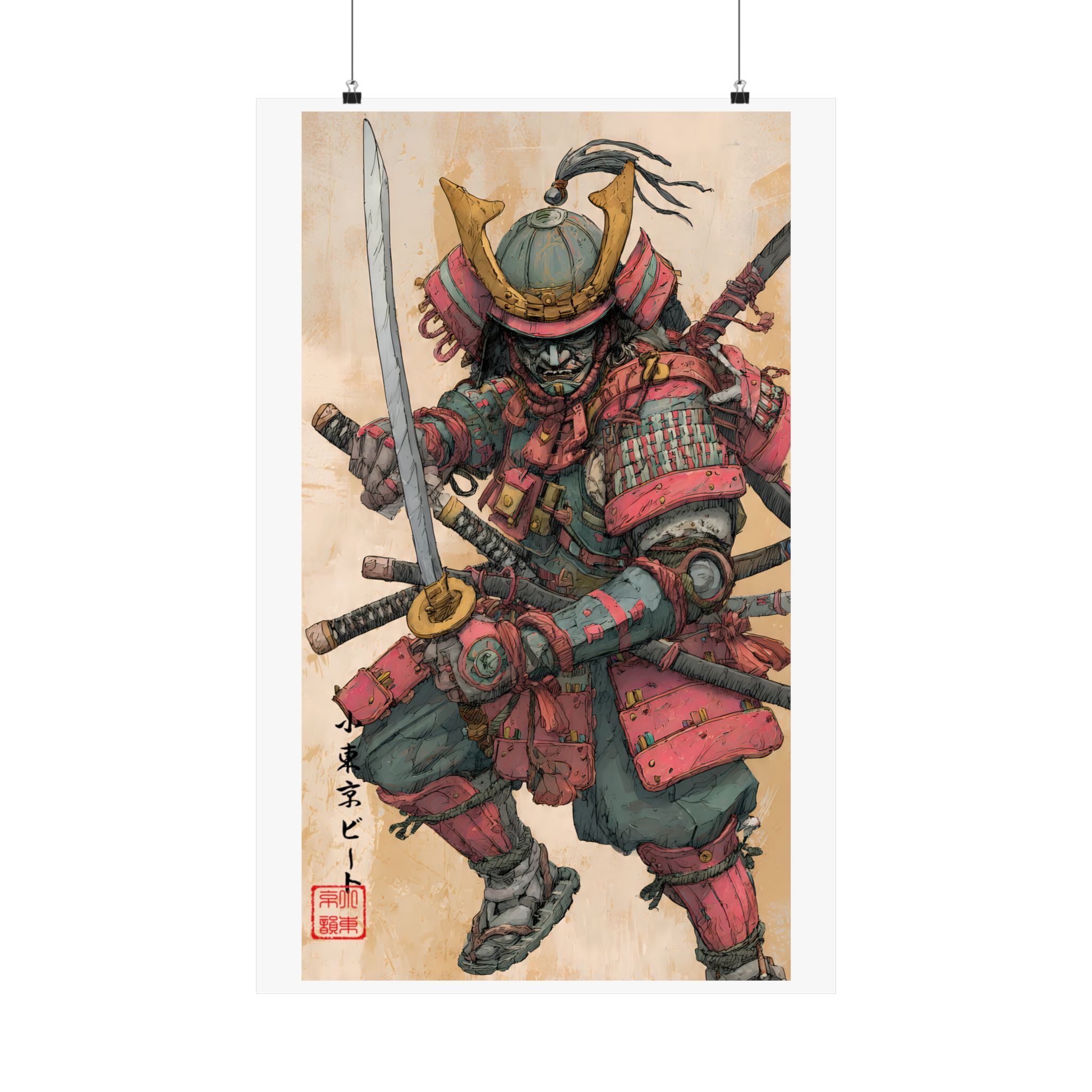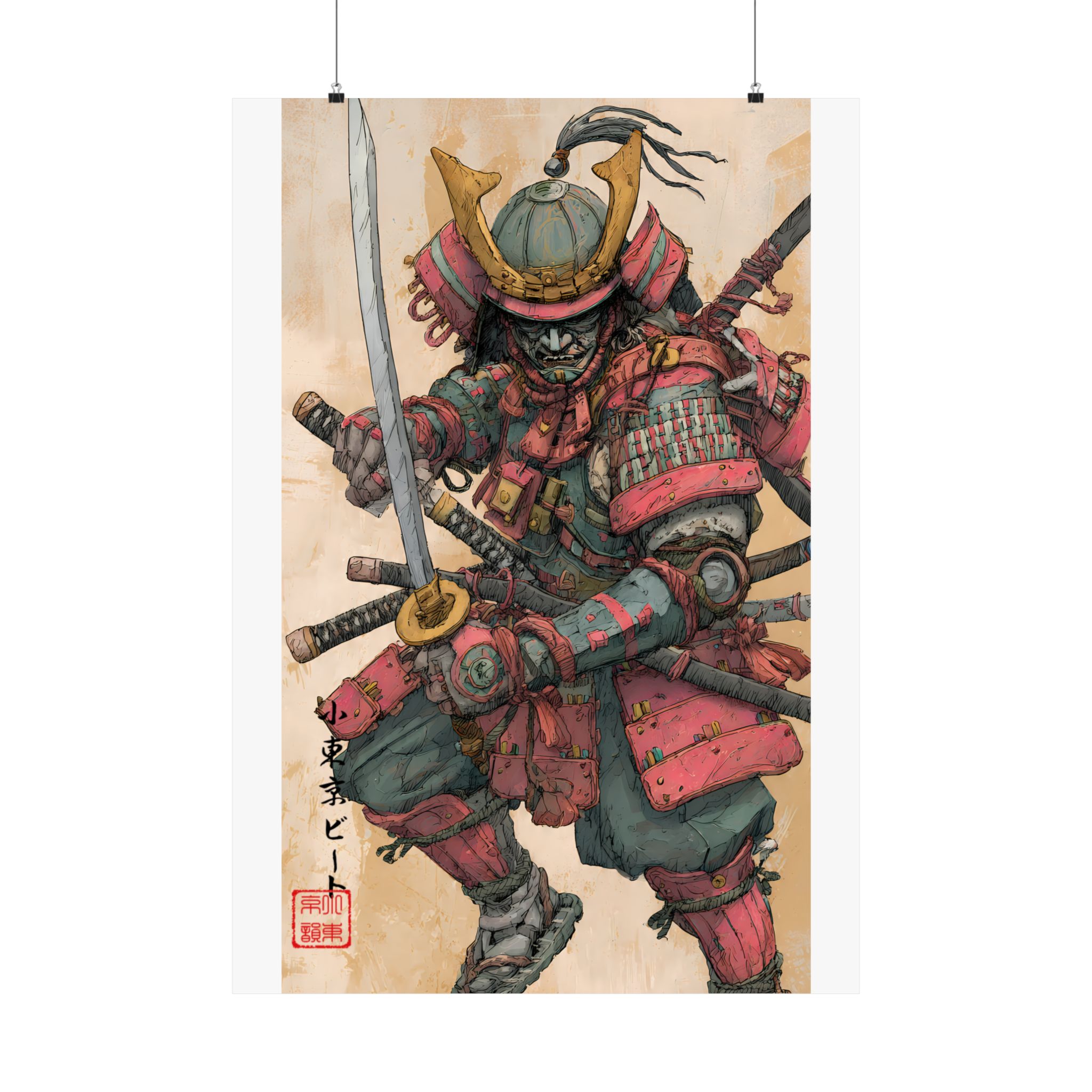 This vertical matte poster brings a warrior’s presence into quiet spaces. Printed on archival museum-grade paper with rich giclée inks, the samurai illustration shows lived-in armor, fluid motion, and hand-drawn texture that reads like an old scroll brought into the present. The matte finish soaks up light, keeping colors deep without glare — a thoughtful statement piece for an indoor wall where detail and atmosphere matter.