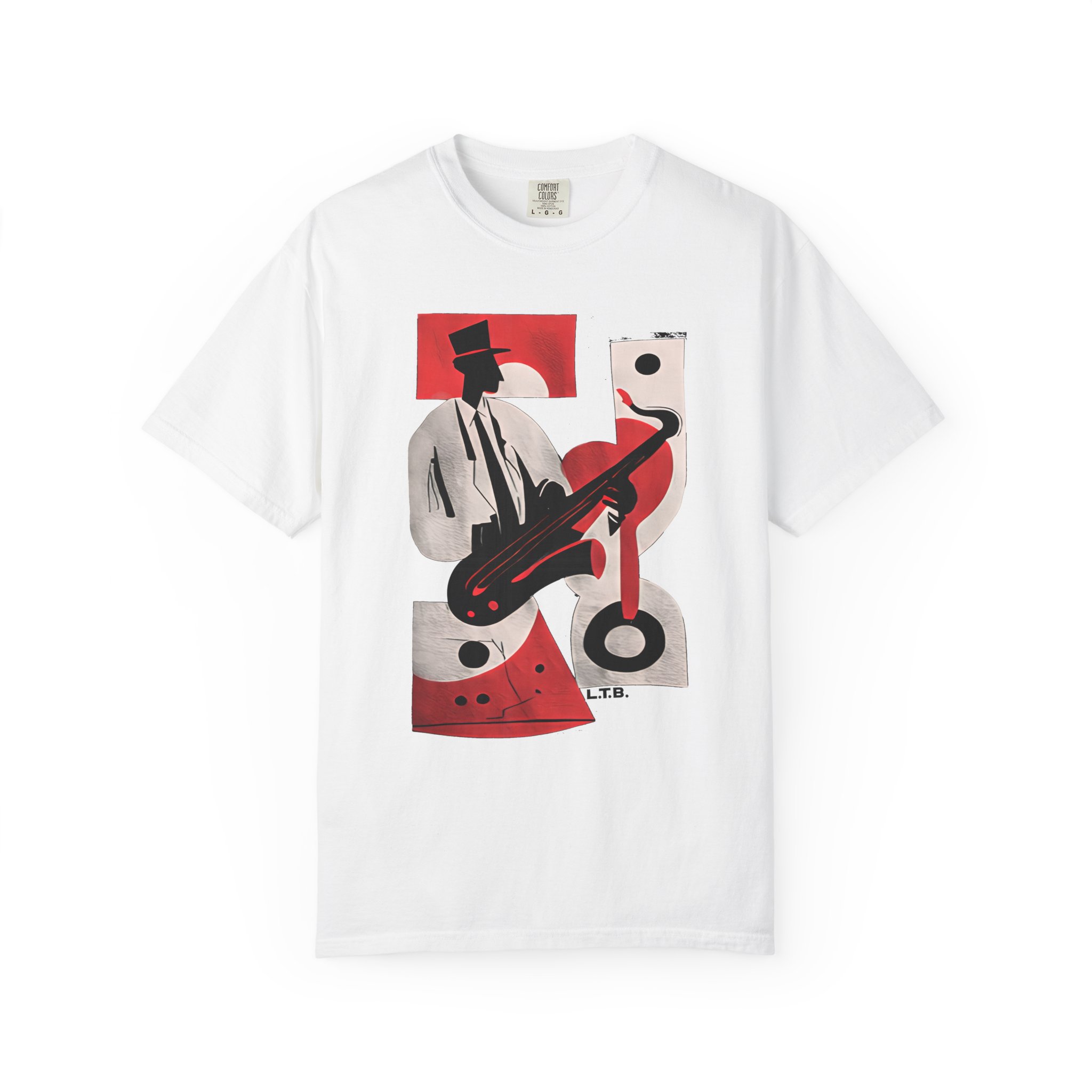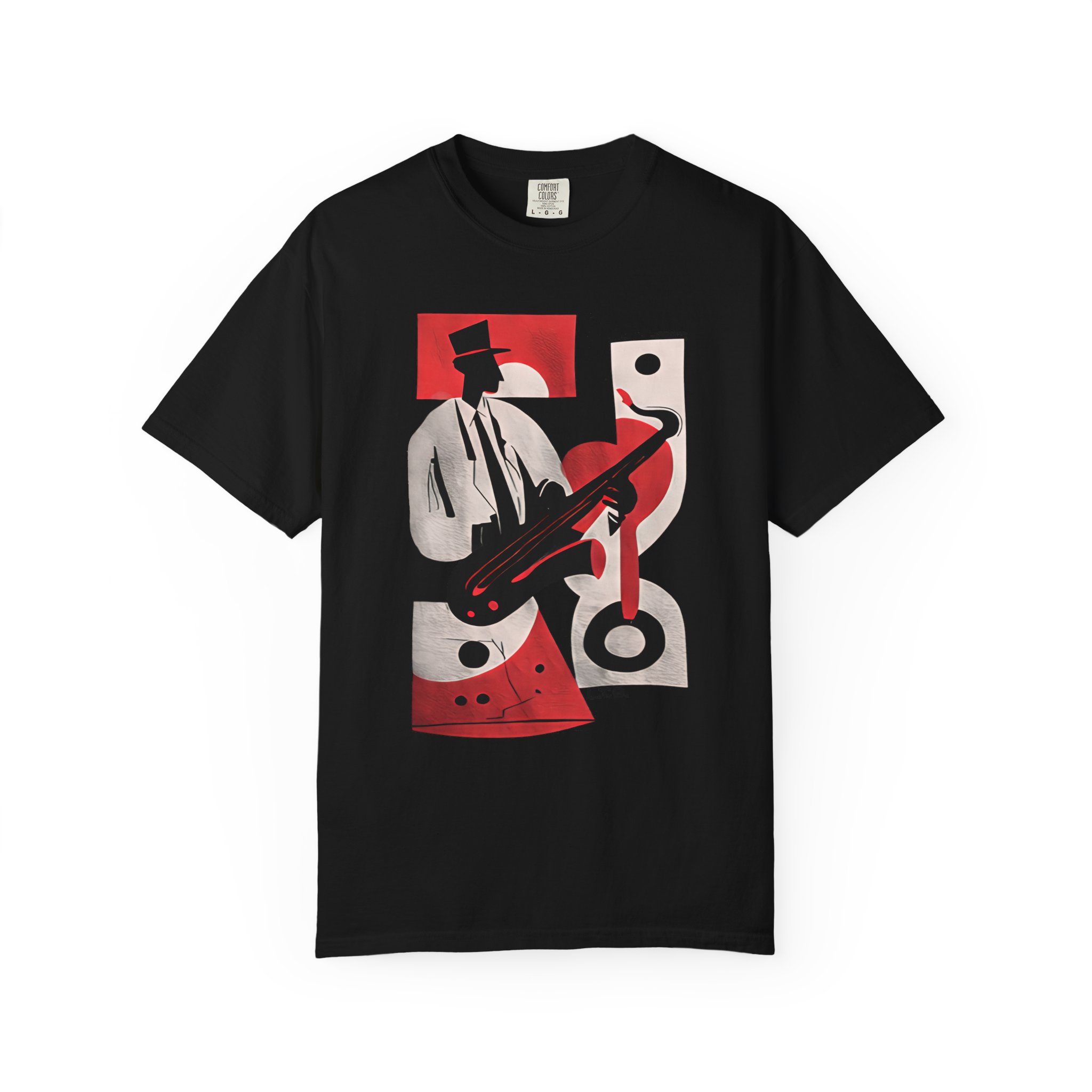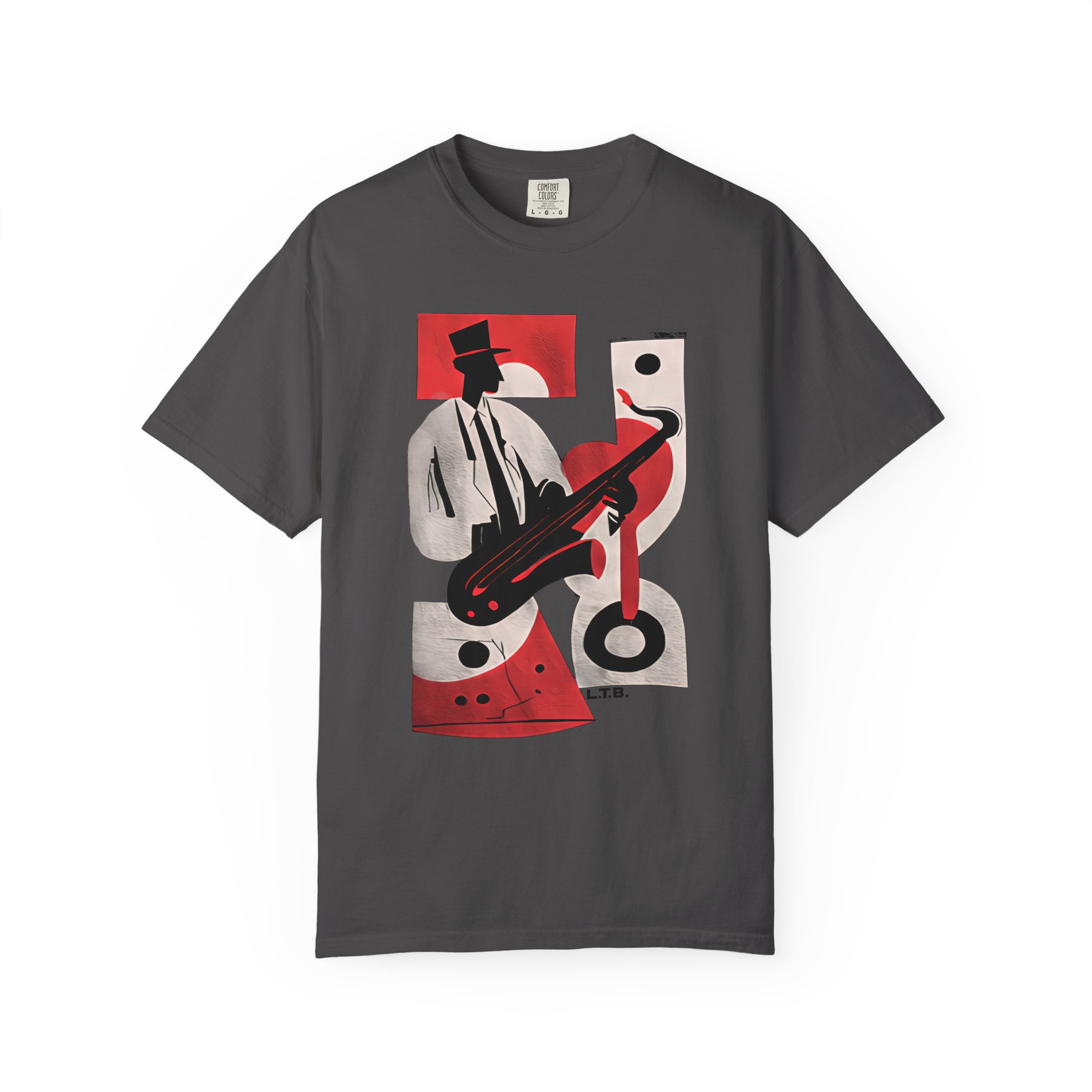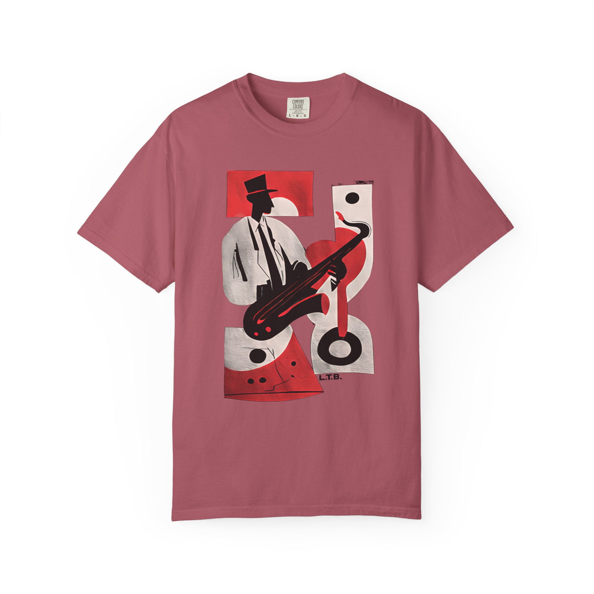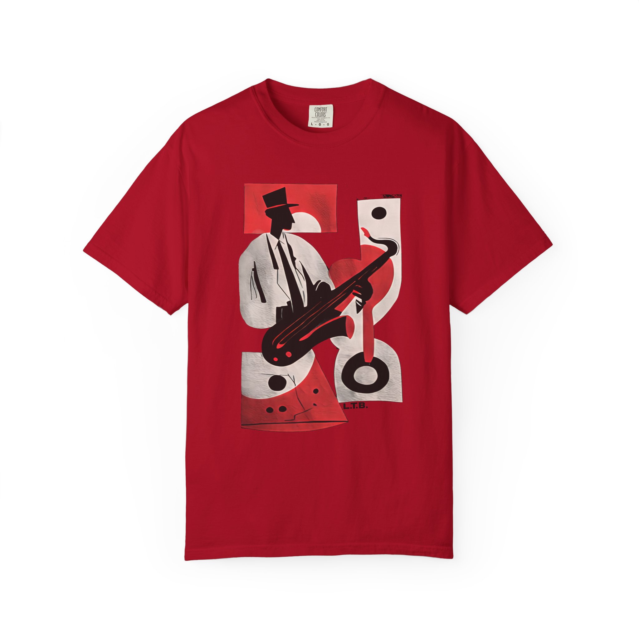 This heavyweight garment-dyed tee carries an artful, jazz-club energy. The front features a stylized saxophonist in bold red and black shapes that feel both vintage poster and modern print. The cotton softens with each wash so the colors age into a lived-in, familiar look. Wear it to slow evenings at a record store, late-night sets, or afternoons spent sketching in a sunlit cafe — it sits relaxed across the shoulders and moves with you without fuss.