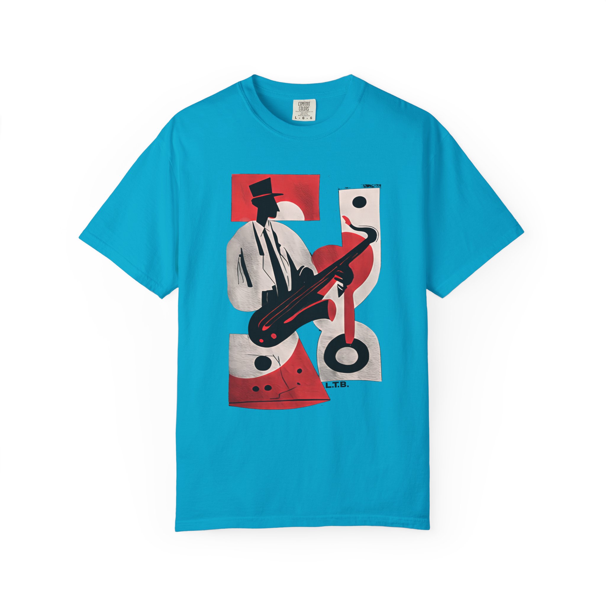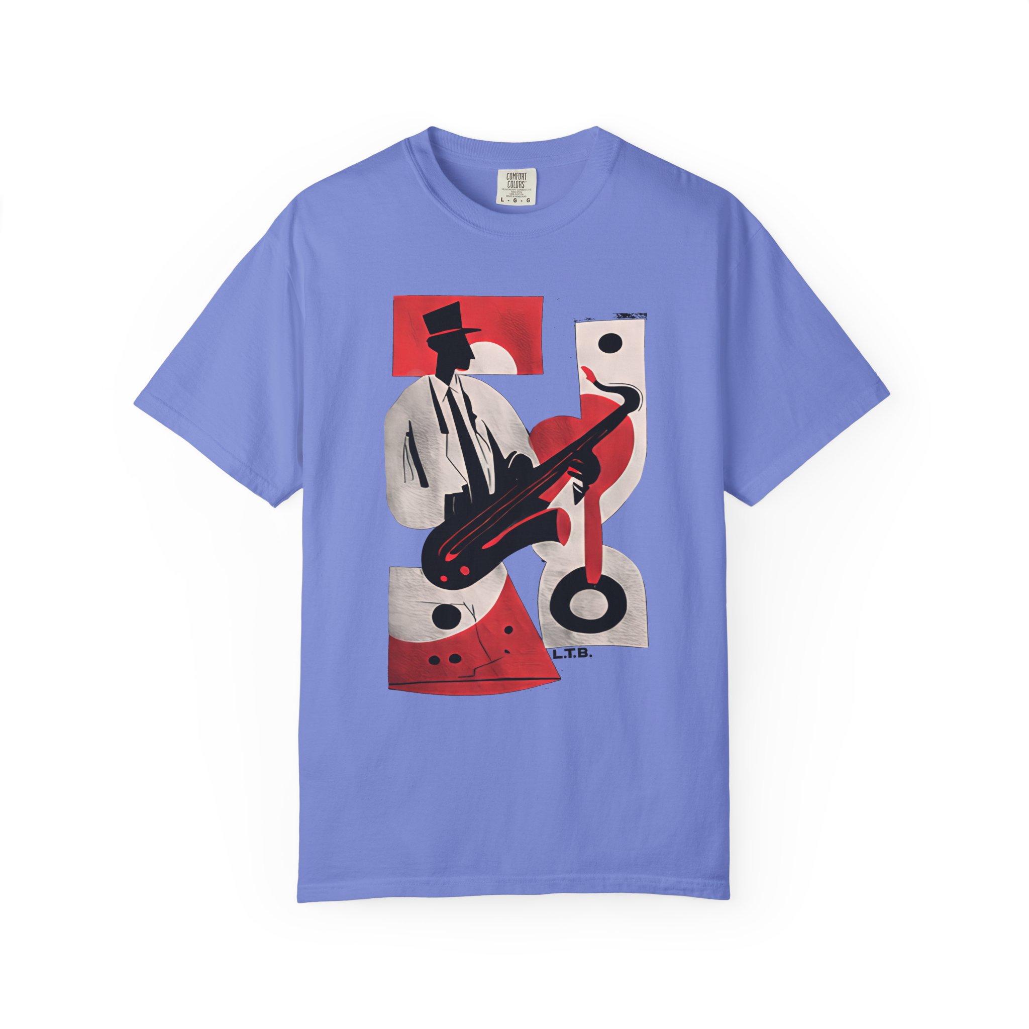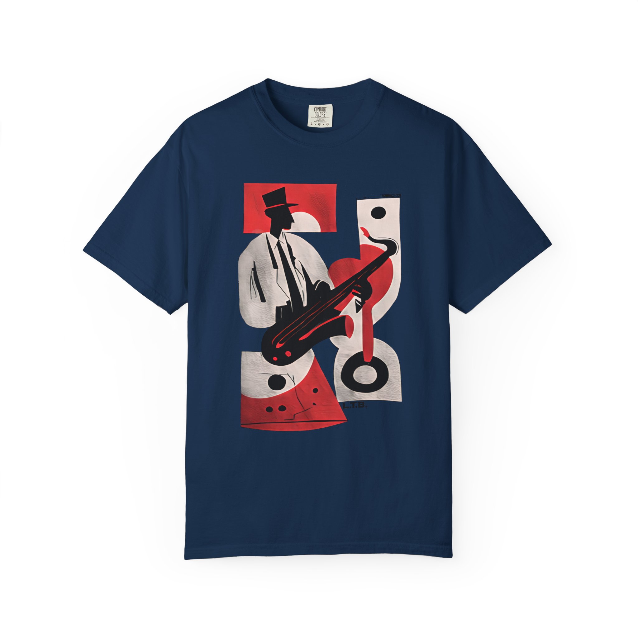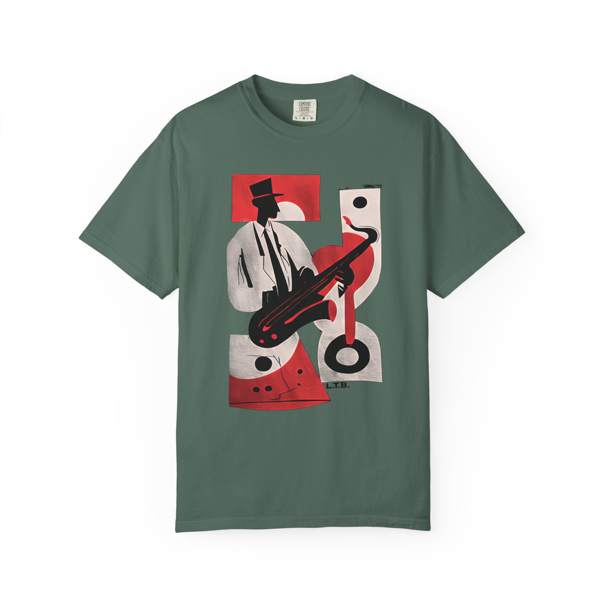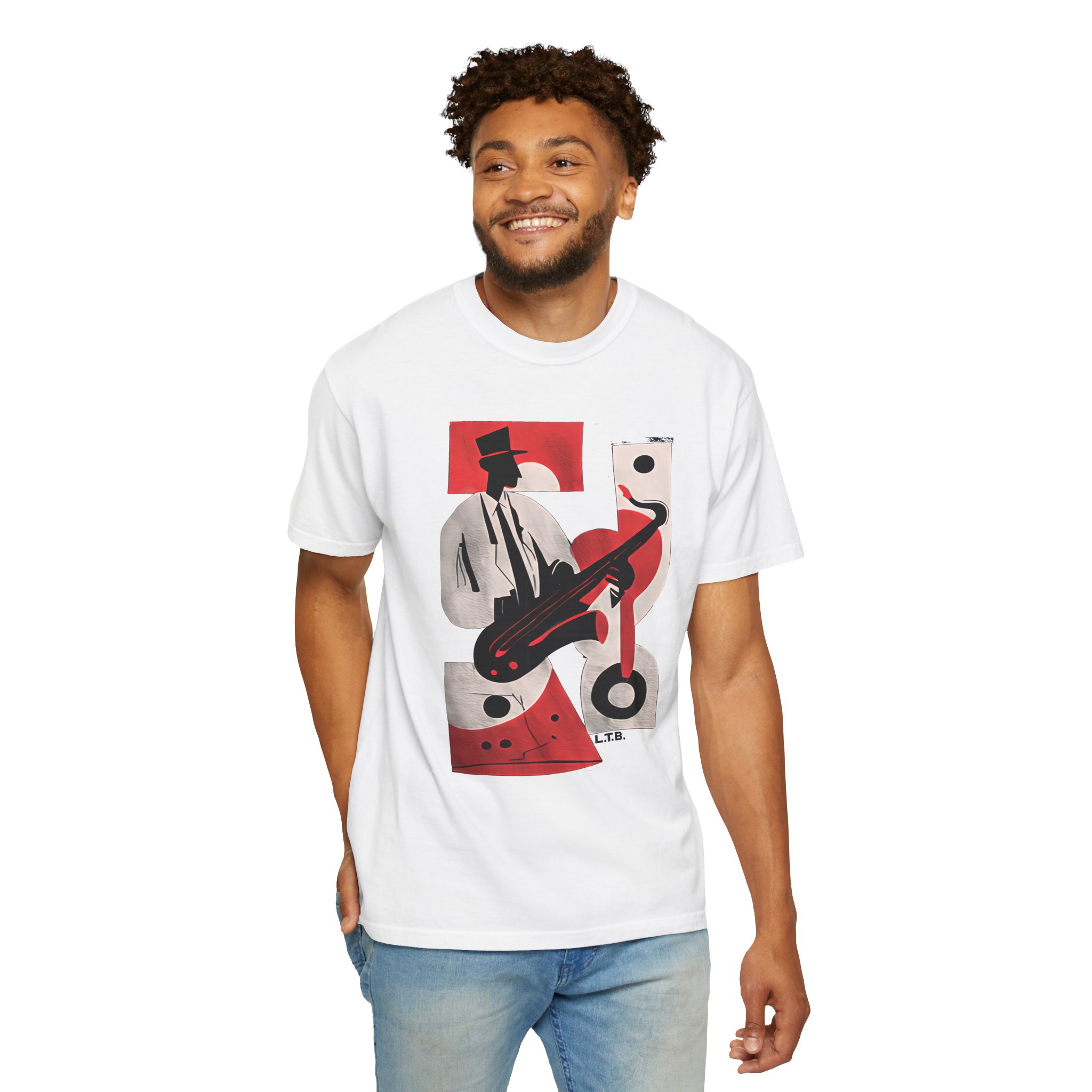 This heavyweight garment-dyed tee carries an artful, jazz-club energy. The front features a stylized saxophonist in bold red and black shapes that feel both vintage poster and modern print. The cotton softens with each wash so the colors age into a lived-in, familiar look. Wear it to slow evenings at a record store, late-night sets, or afternoons spent sketching in a sunlit cafe — it sits relaxed across the shoulders and moves with you without fuss.