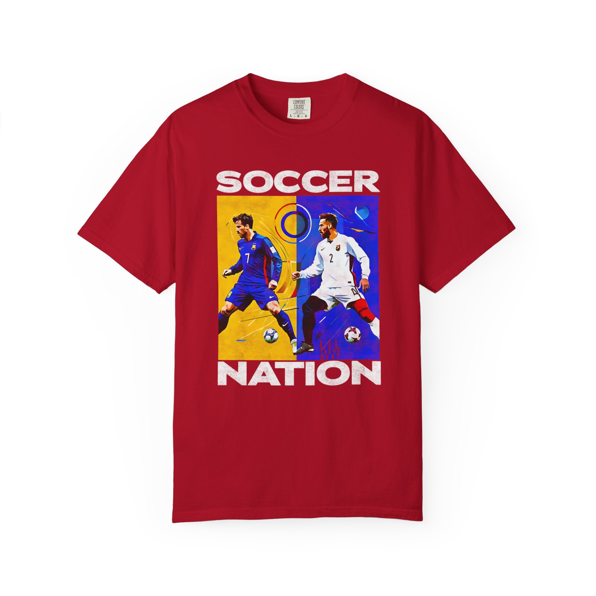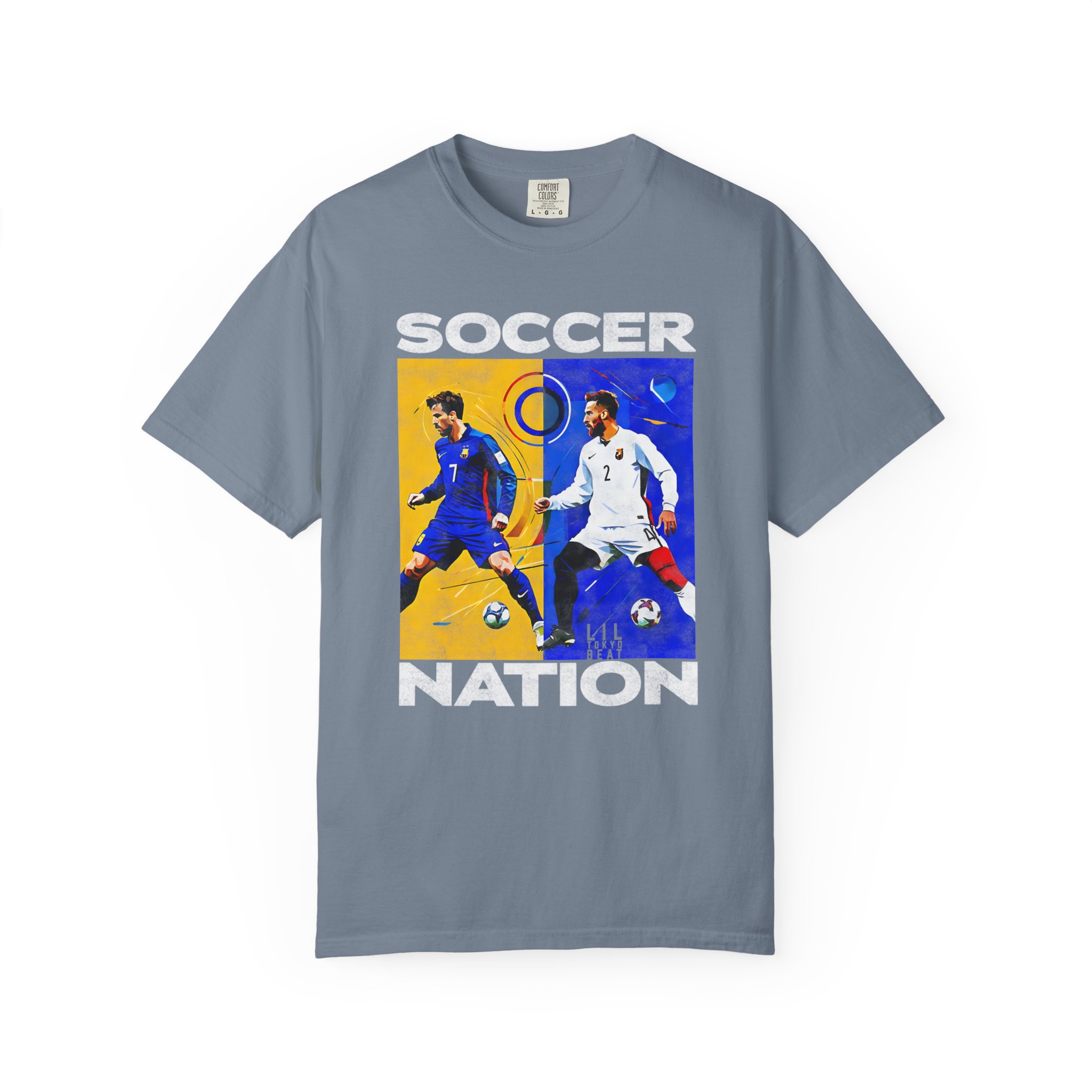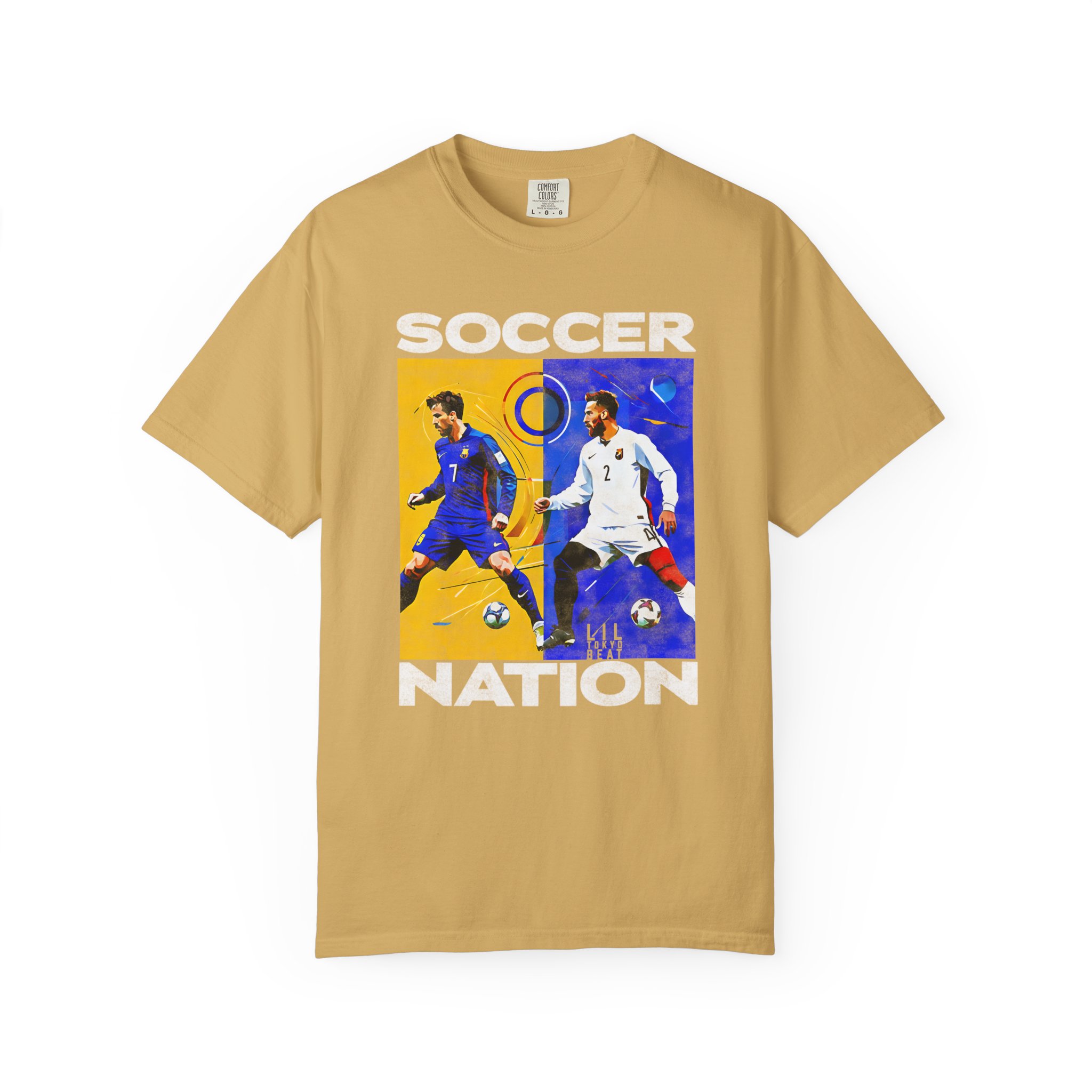 A soft, garment-dyed cotton tee that carries the energy of the pitch. The front block print captures two opposing players mid-motion — one framed in warm golds, the other in cool blues — creating a bold, painterly contrast that reads like a snapshot from a decisive match. The medium-weight fabric and relaxed cut make it comfortable for long days, whether you’re heading to a local match, watching with friends, or wearing it as a casual statement piece. The tubular knit and double-needle stitching mean the shirt hangs cleanly and holds up through repeated wear, while the garment-dyed finish gives each shirt a lived-in softness and slightly muted color that feels personal, not manufactured.
