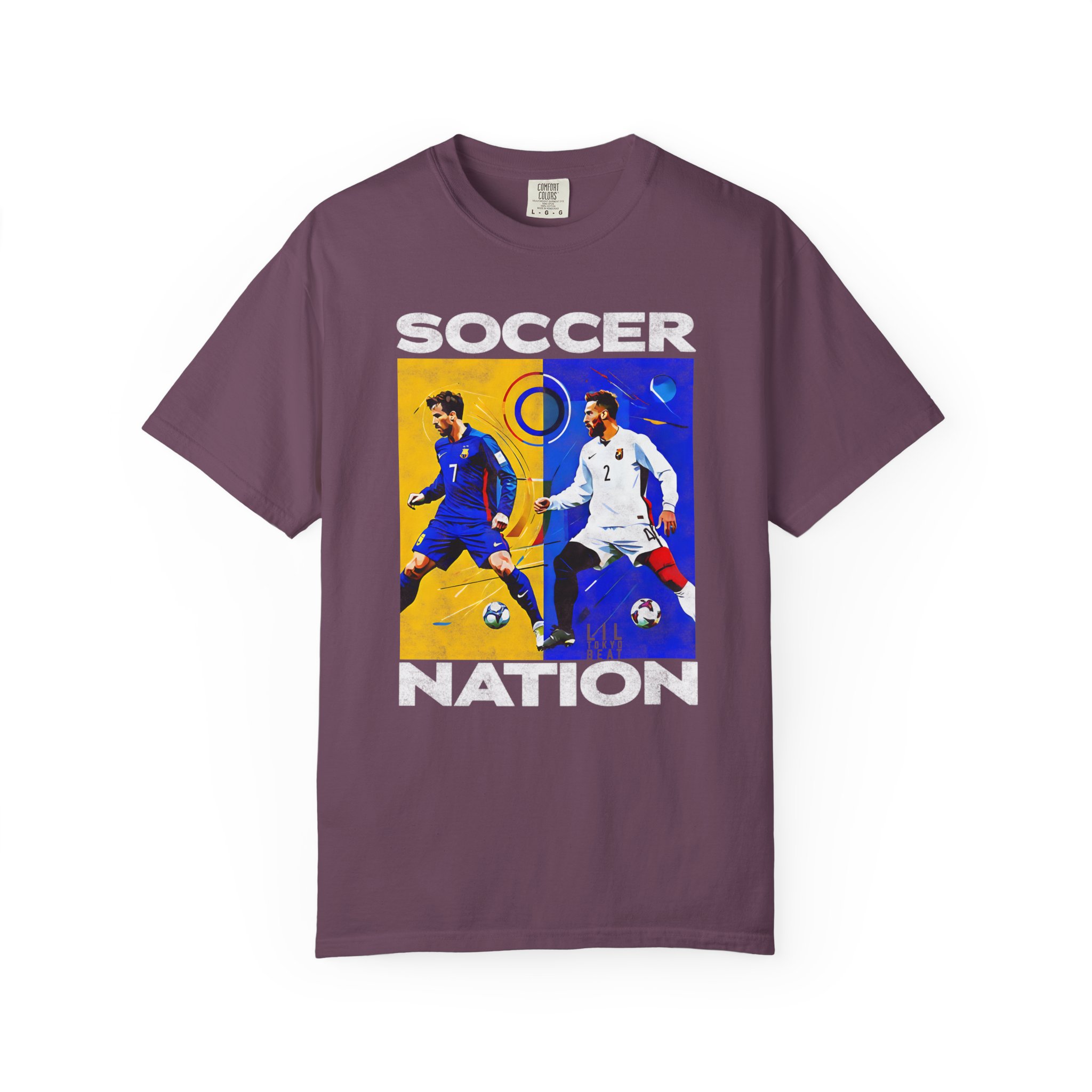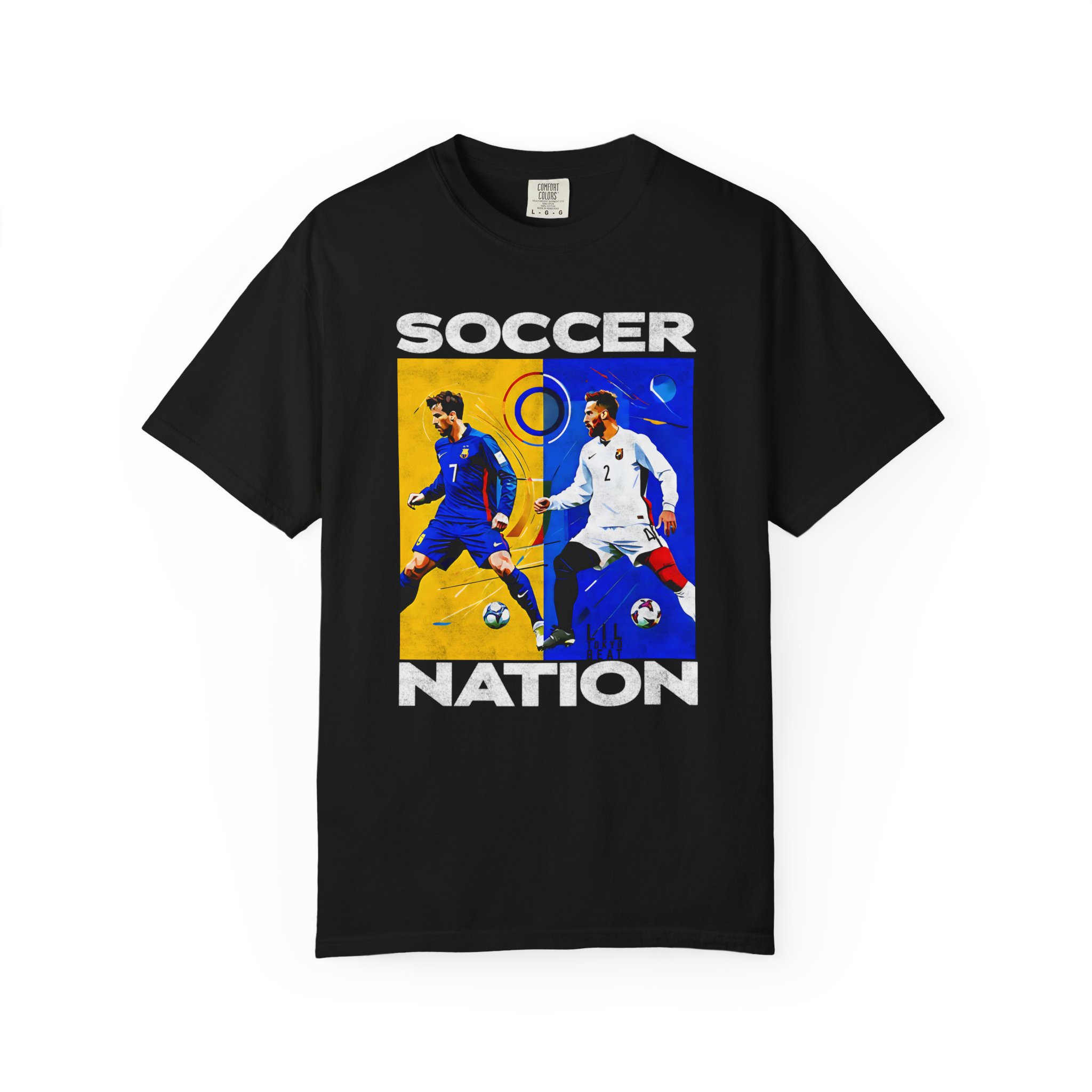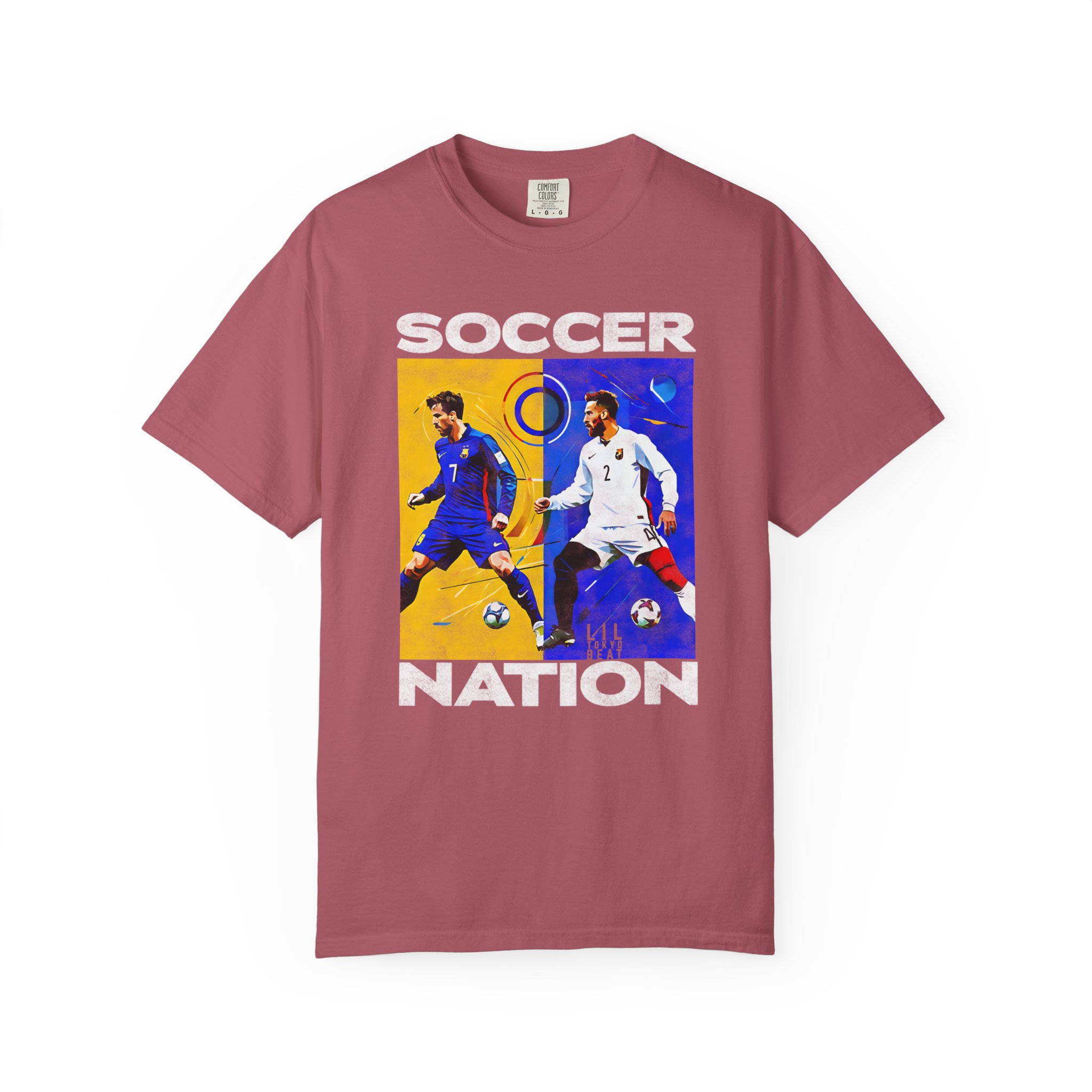 A soft, garment-dyed cotton tee that carries the energy of the pitch. The front block print captures two opposing players mid-motion — one framed in warm golds, the other in cool blues — creating a bold, painterly contrast that reads like a snapshot from a decisive match. The medium-weight fabric and relaxed cut make it comfortable for long days, whether you’re heading to a local match, watching with friends, or wearing it as a casual statement piece. The tubular knit and double-needle stitching mean the shirt hangs cleanly and holds up through repeated wear, while the garment-dyed finish gives each shirt a lived-in softness and slightly muted color that feels personal, not manufactured.