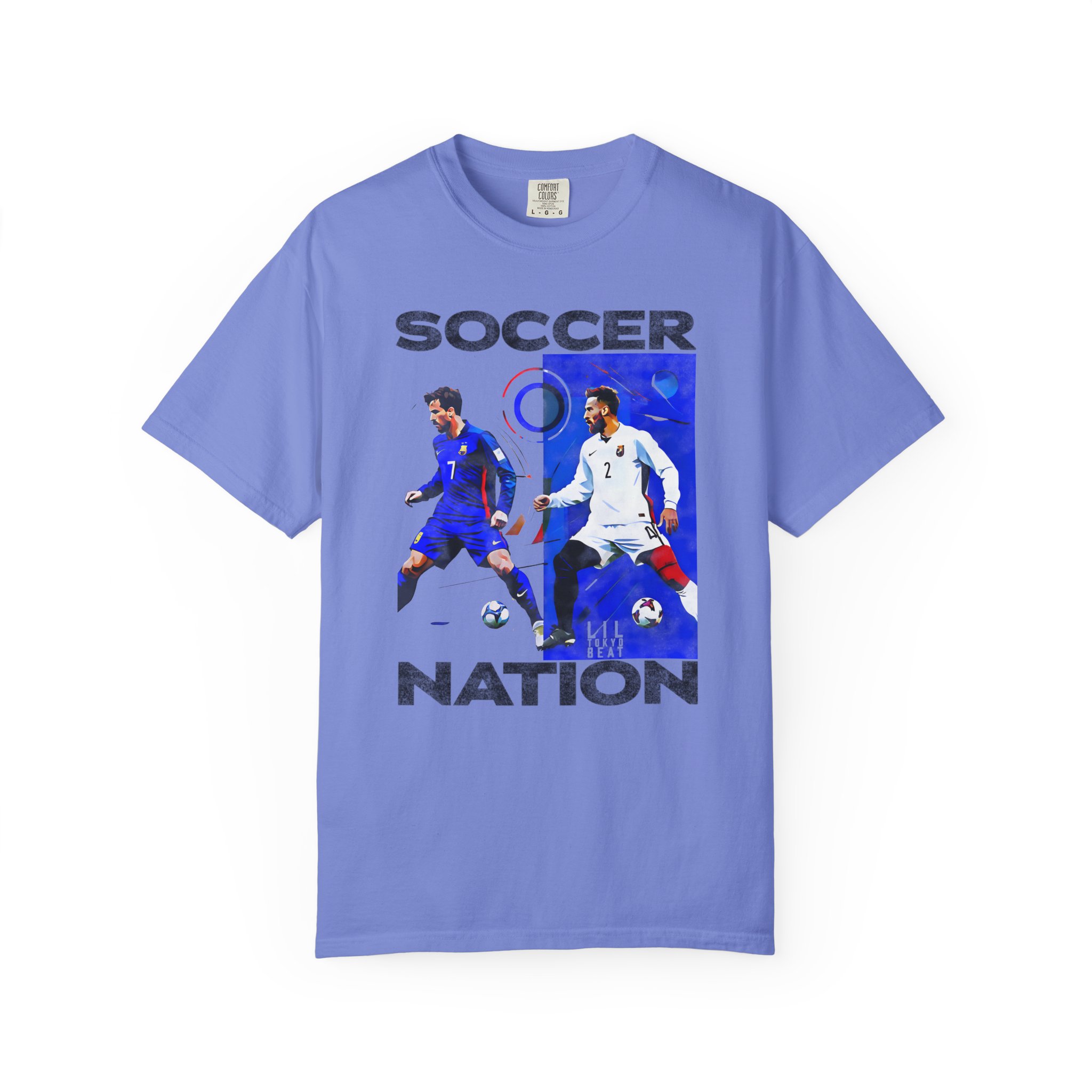 This garment-dyed tee channels the raw energy of matchday. Soft, lived-in cotton carries a bold two-player graphic and the block-lettered “SOCCER NATION” headline — a look that reads like a fan poster and feels like a favorite shirt already. The relaxed fit and medium-weight fabric let it layer under a jacket or wear alone on warm evenings. Wear it to watch a game, walk through the city after a win, or gather with friends who speak fluent kick-and-cheer; the muted, garment-dyed finish gives each wash a bit more character so it ages with you, not against you.