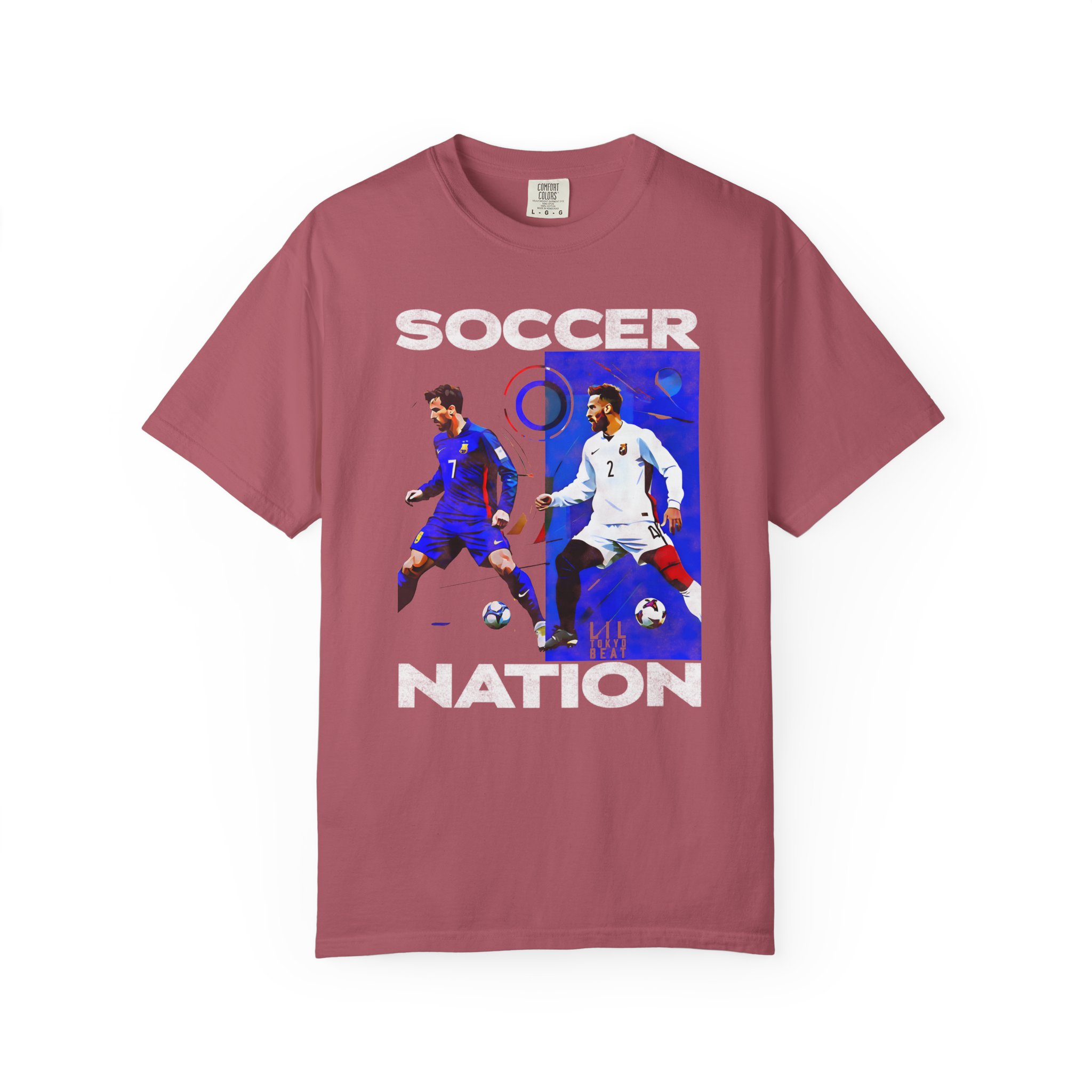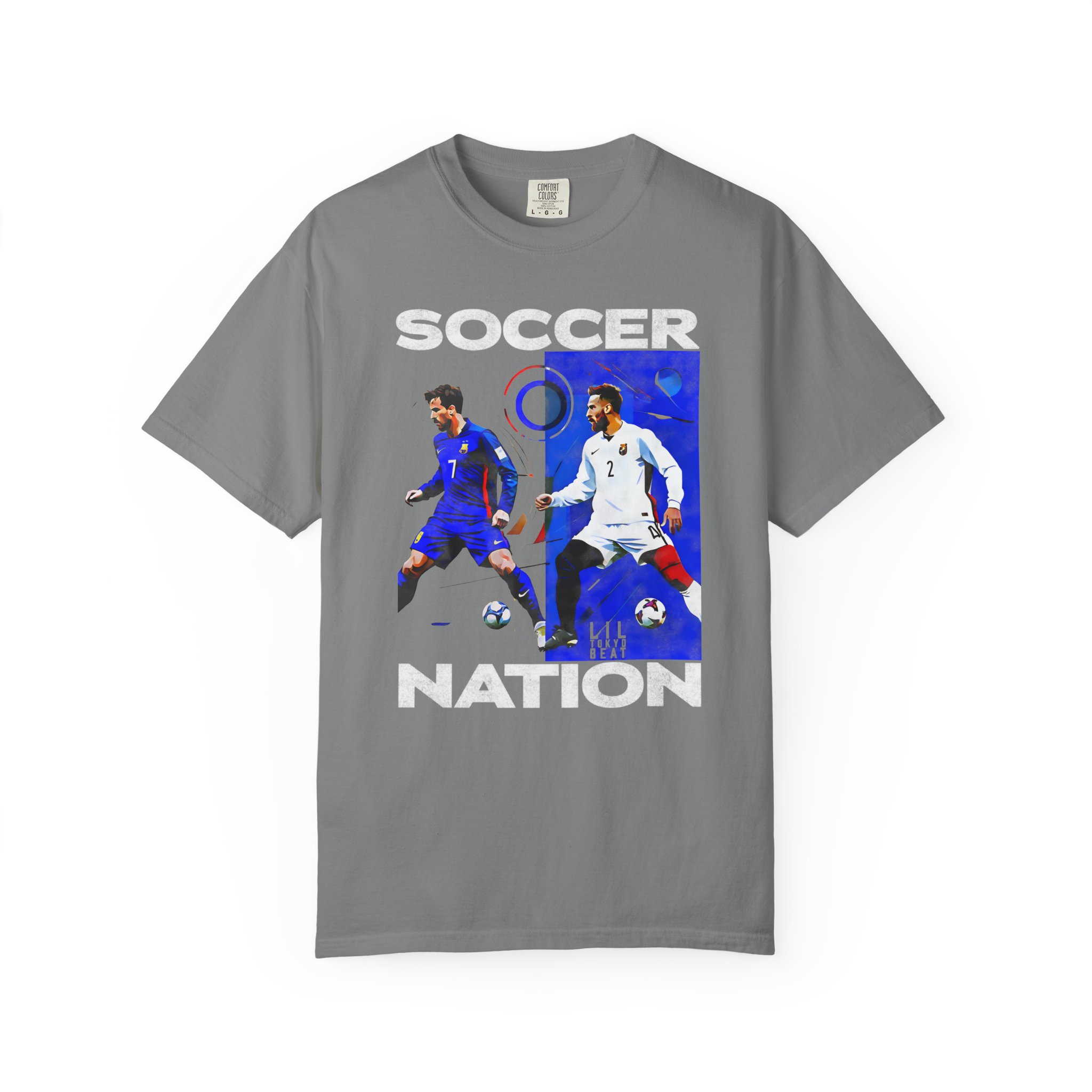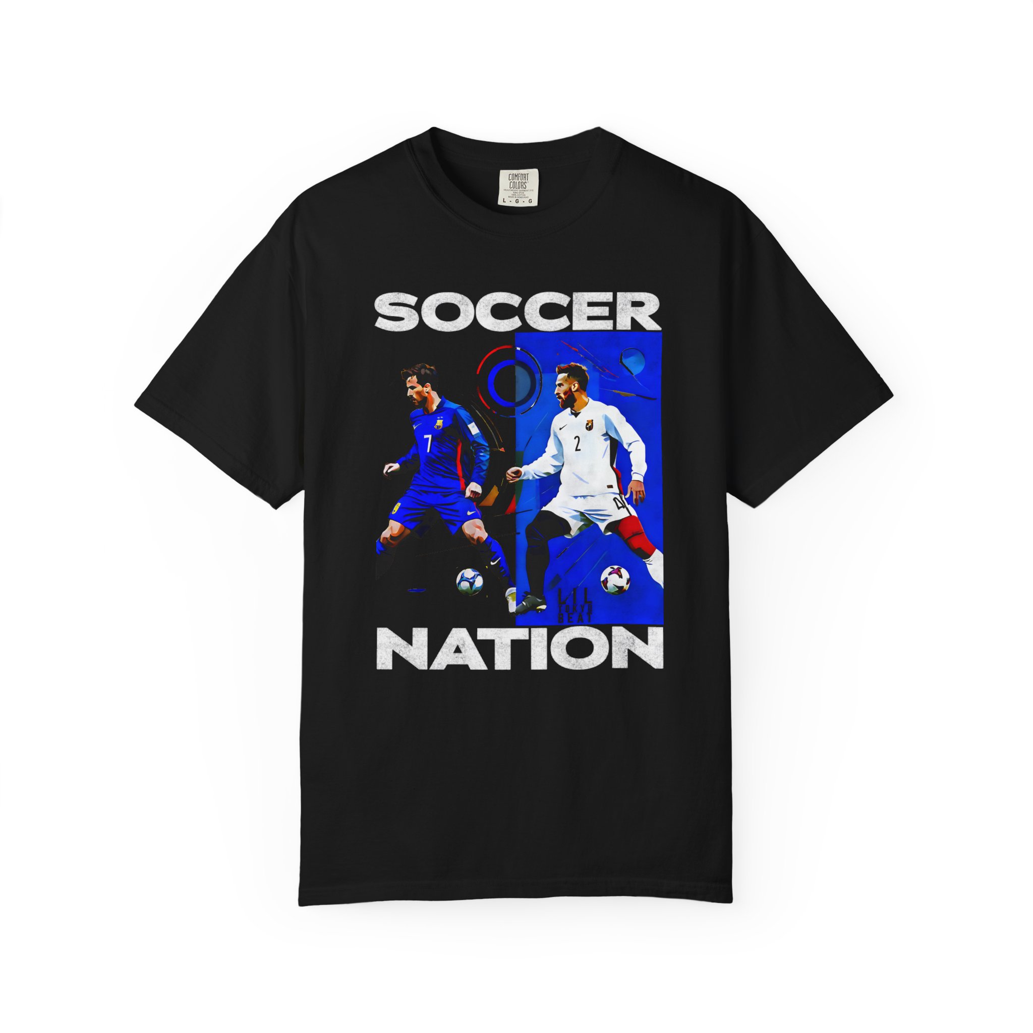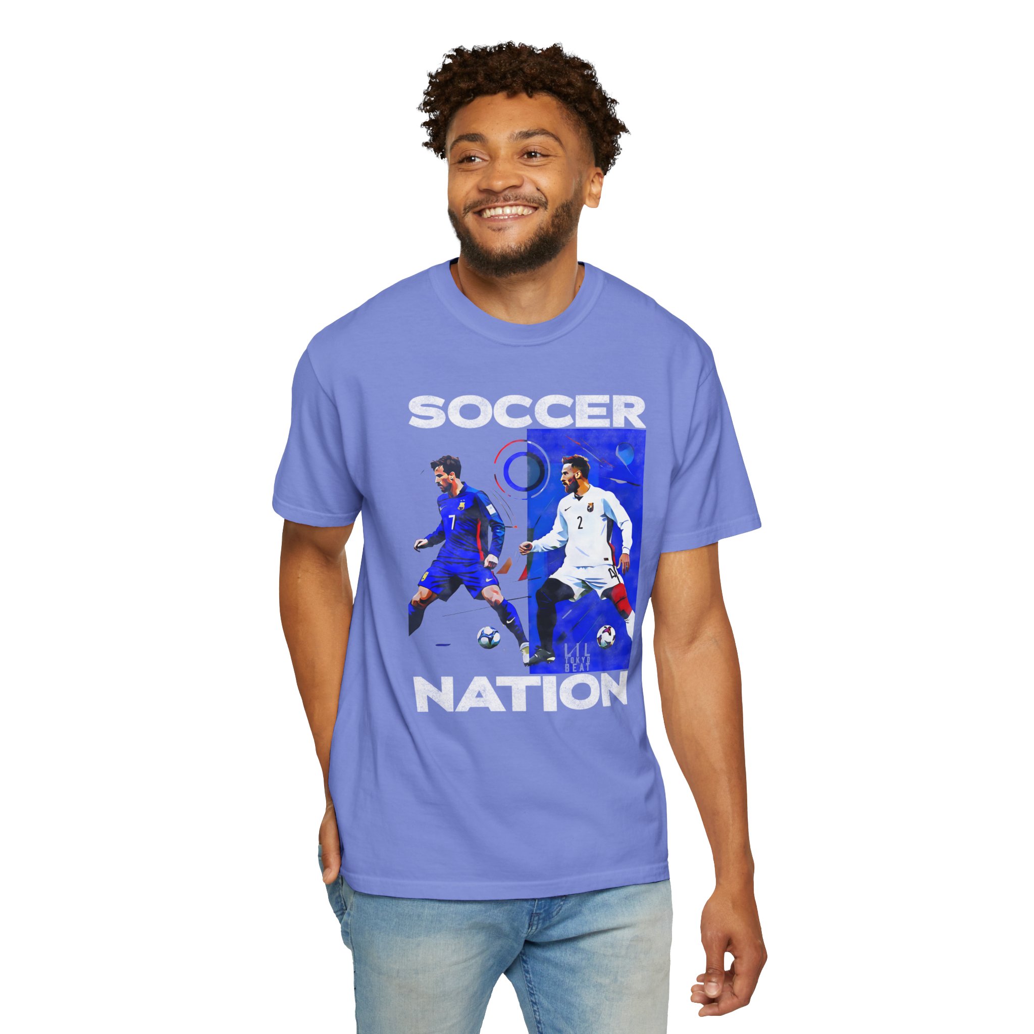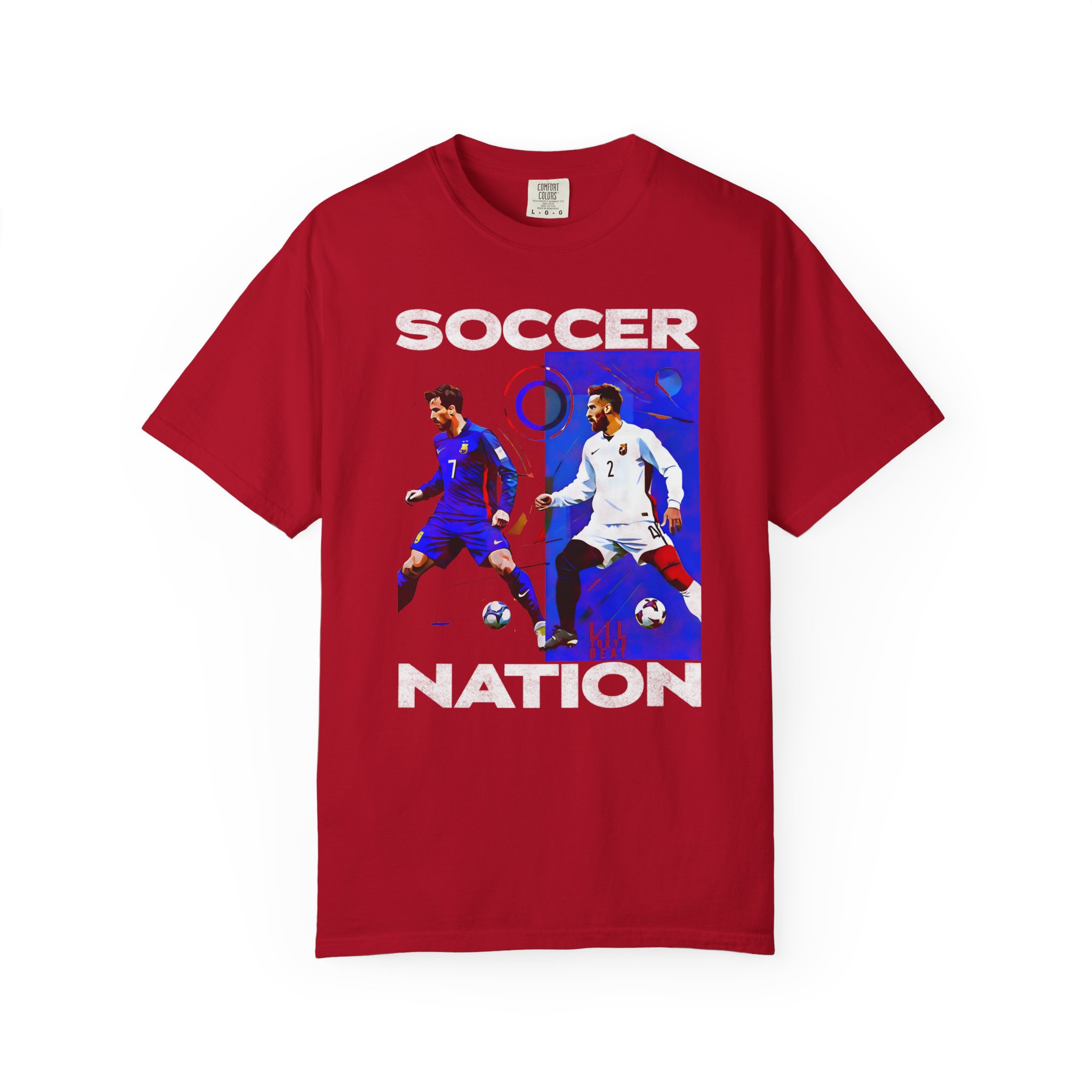 This relaxed-fit garment-dyed tee carries a lived-in softness and bold soccer graphics that speak to fans who live for the pitch. The front art pairs dynamic player action shots with block lettering to create an athletic, streetwise look — worn and washed textures of the dye make each shirt feel like an instant favorite. It sits casually on the body without clinging, so it layers easily under a jacket or stands alone at watch parties, weekend pick-up games, and long match nights. Thoughtful construction—tubular knit, double-needle stitching and a sewn-in label—keeps the silhouette clean and durable through many seasons of cheering and travel. Available in a wide color range and extended sizes, this tee fits the roster of fans who want a comfortable, seasoned piece that wears like memory rather than new merch.