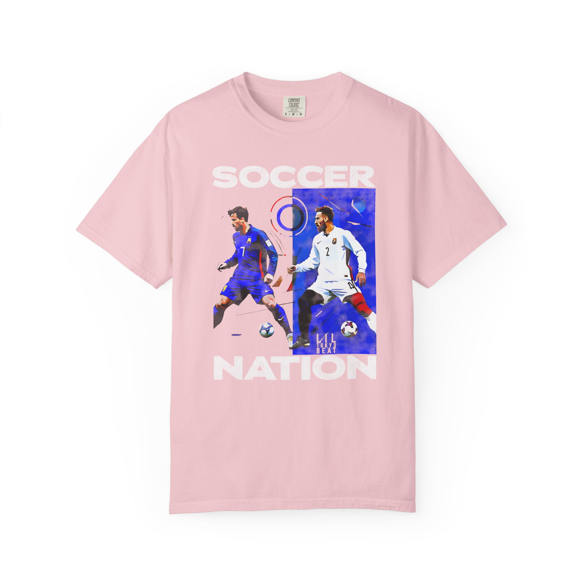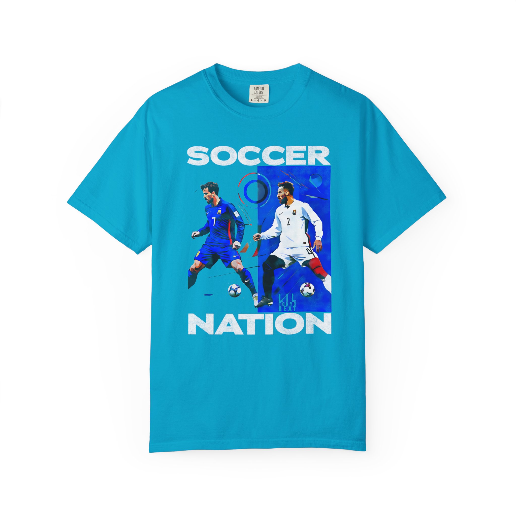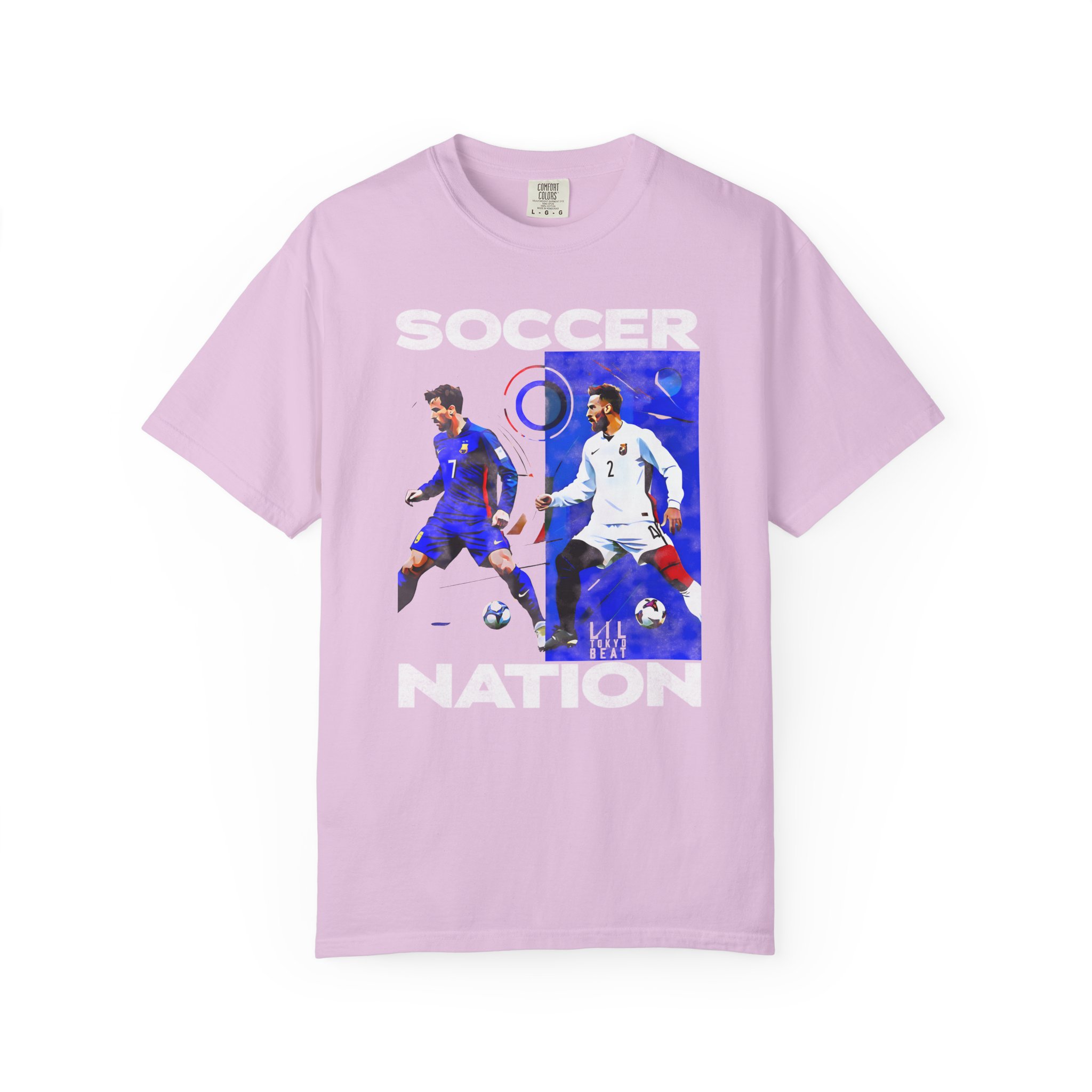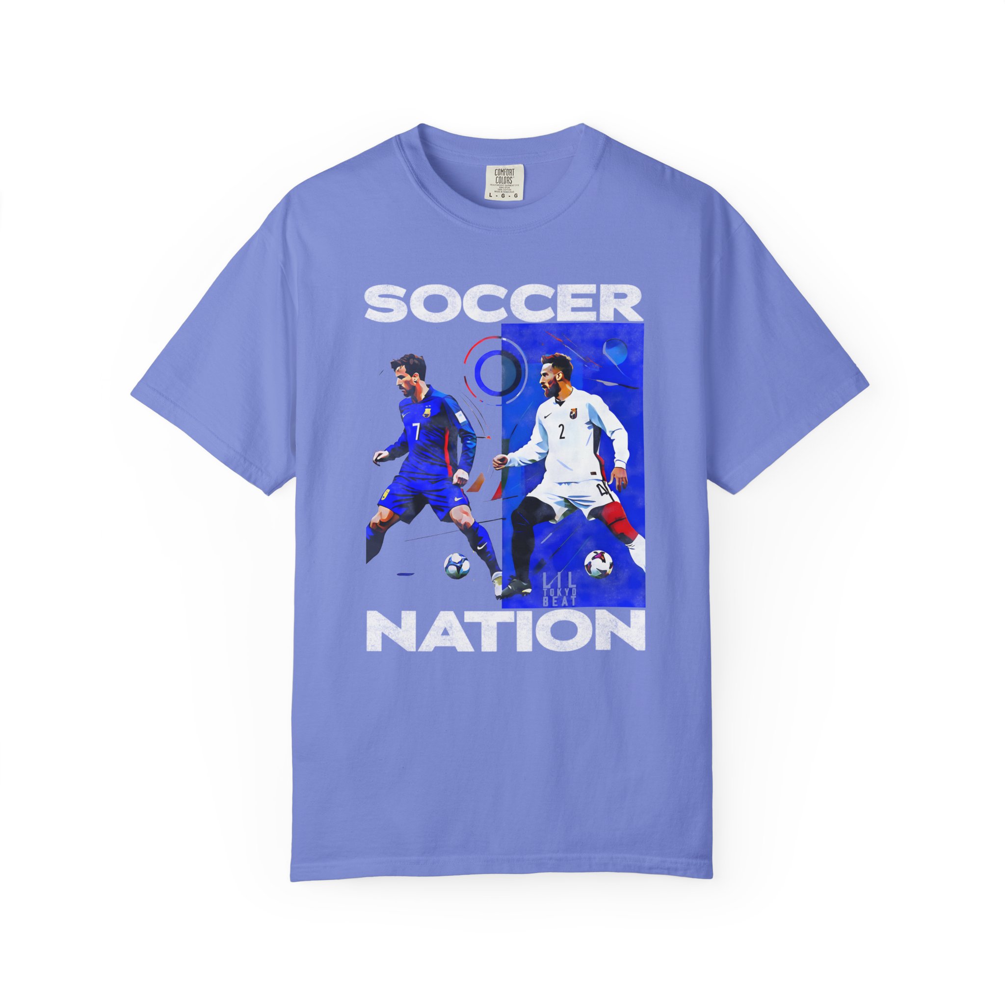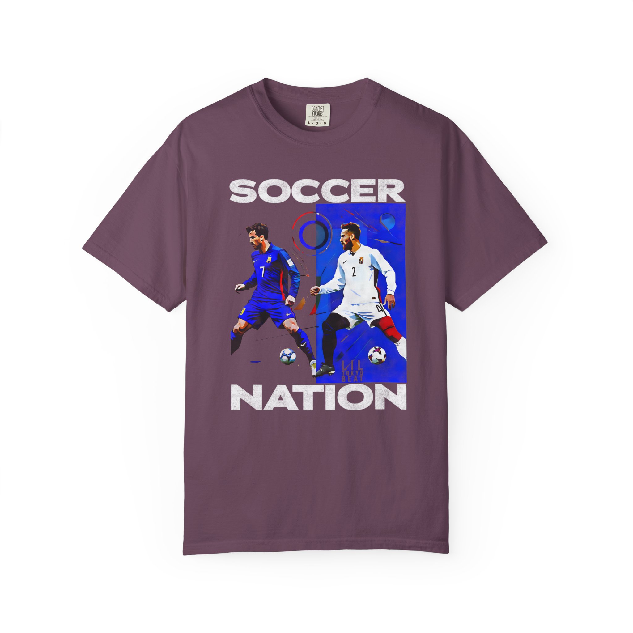 This relaxed-fit garment-dyed tee carries a lived-in softness and bold soccer graphics that speak to fans who live for the pitch. The front art pairs dynamic player action shots with block lettering to create an athletic, streetwise look — worn and washed textures of the dye make each shirt feel like an instant favorite. It sits casually on the body without clinging, so it layers easily under a jacket or stands alone at watch parties, weekend pick-up games, and long match nights. Thoughtful construction—tubular knit, double-needle stitching and a sewn-in label—keeps the silhouette clean and durable through many seasons of cheering and travel. Available in a wide color range and extended sizes, this tee fits the roster of fans who want a comfortable, seasoned piece that wears like memory rather than new merch.