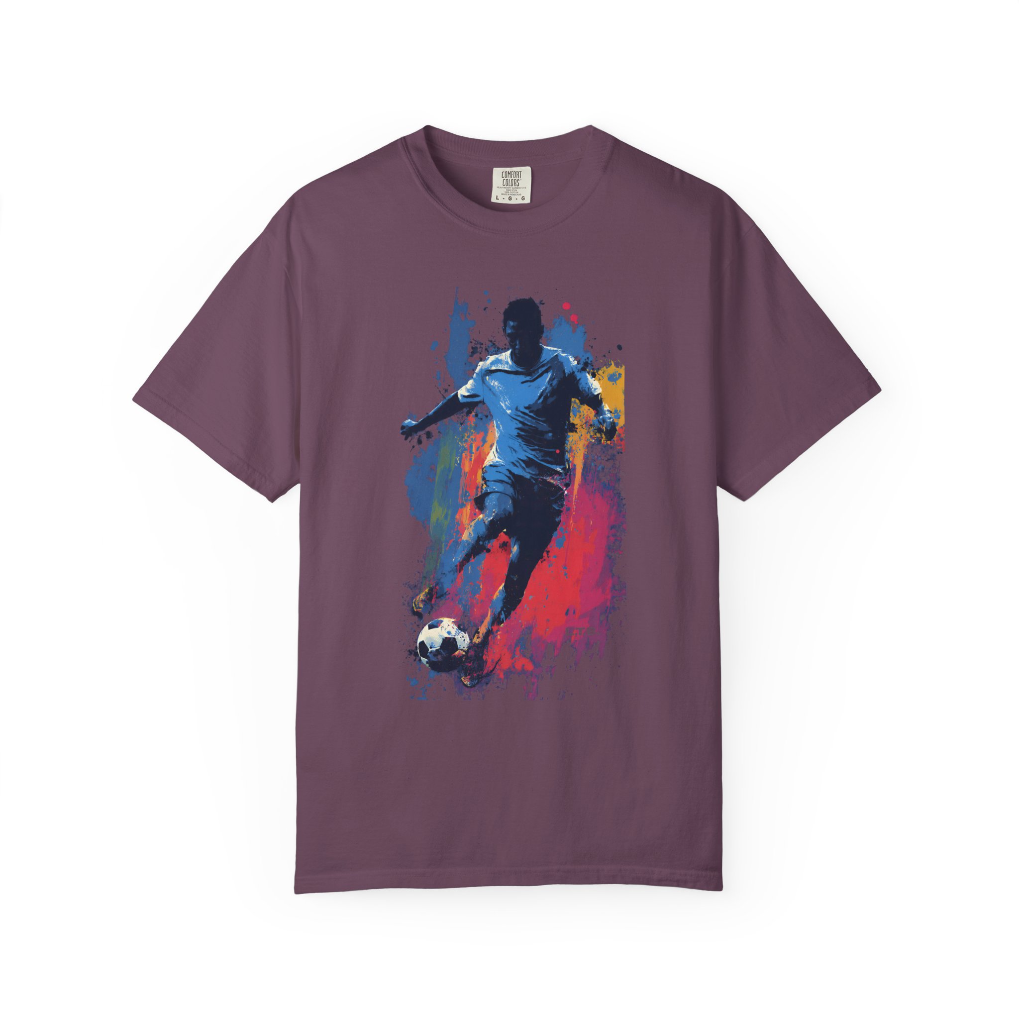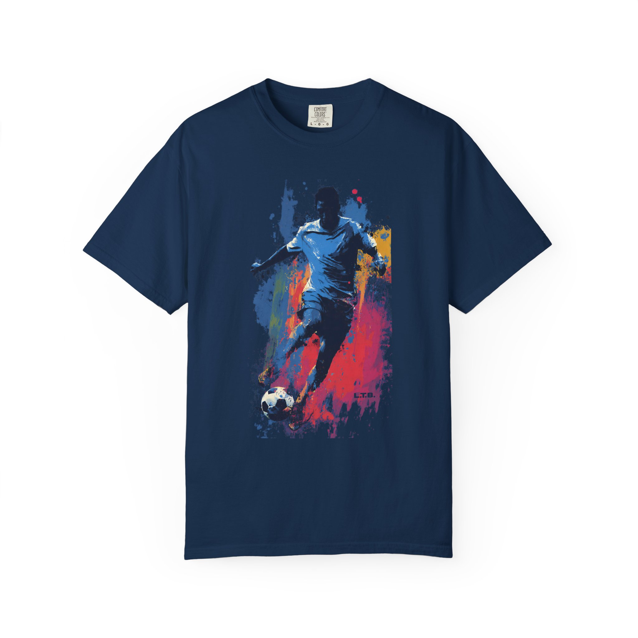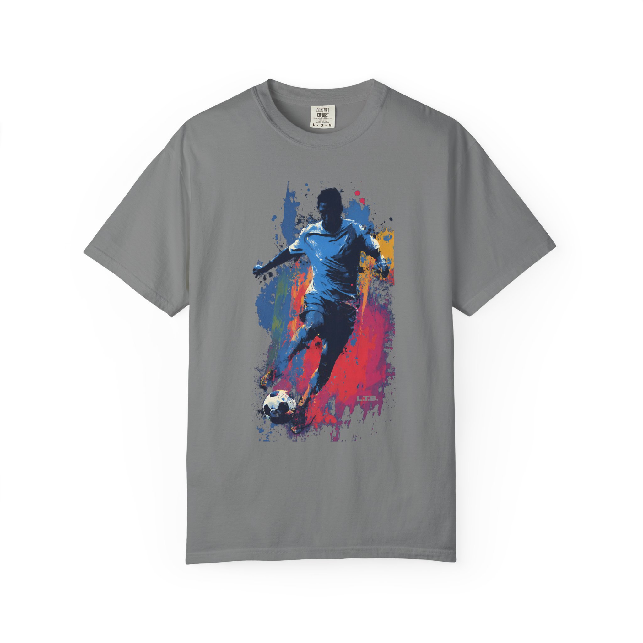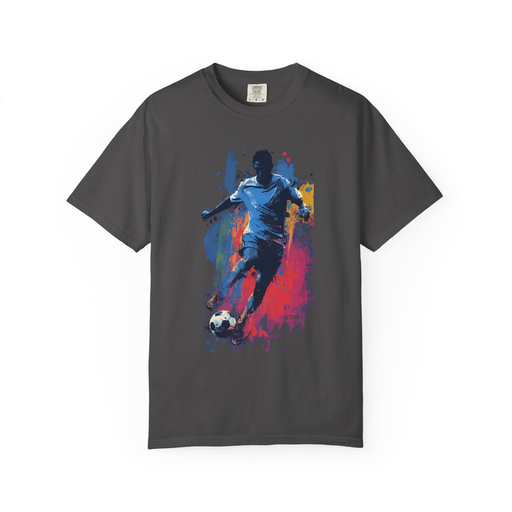 A bold, energetic soccer tee that feels like the match still buzzing in your veins. Vivid splash-art captures a player mid-strike—painted motion, sweat, and stadium lights—so the shirt reads like a snapshot from the pitch. The heavyweight, garment-dyed cotton softens with wear, taking on a lived-in look that matches the grit of weekend leagues and late-night pick-up games. It sits relaxed across the shoulders and moves with you, whether you’re warming up, cheering from the sidelines, or winding down after practice. This is for players and fans who live for that rush of a perfectly placed shot and want their gear to carry the same fearless energy to post-game hangs, casual city walks, and club nights where the conversation inevitably turns to goals and saves.