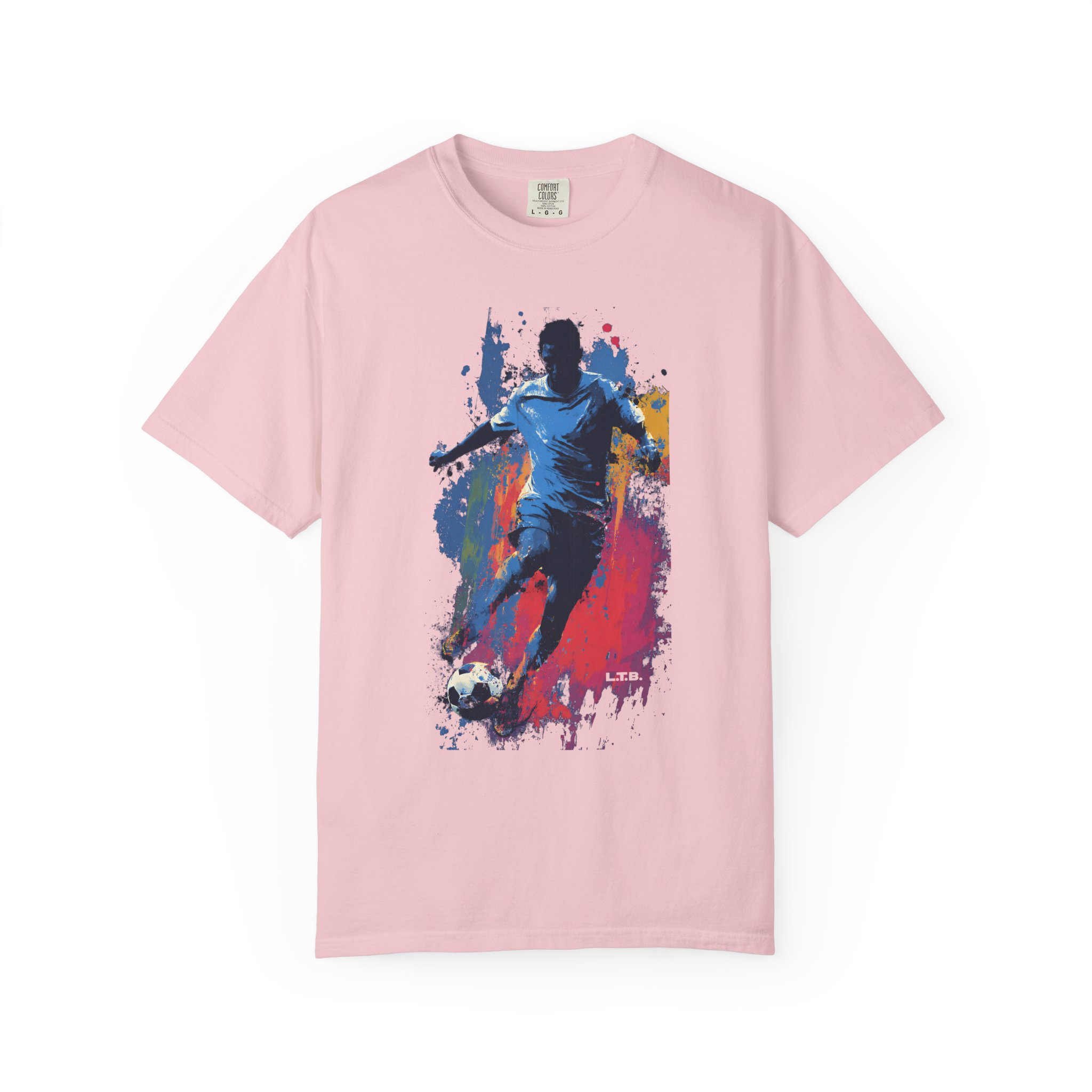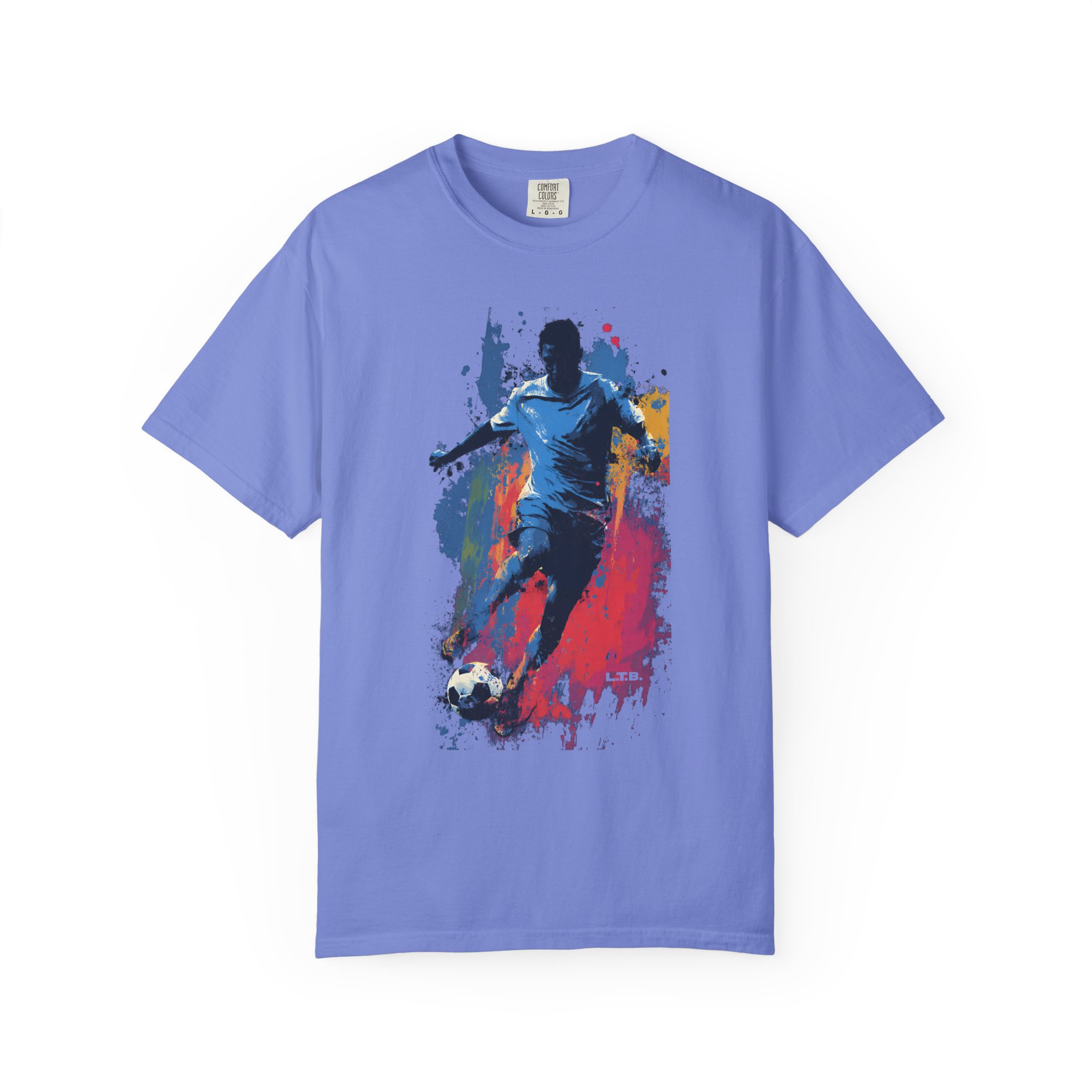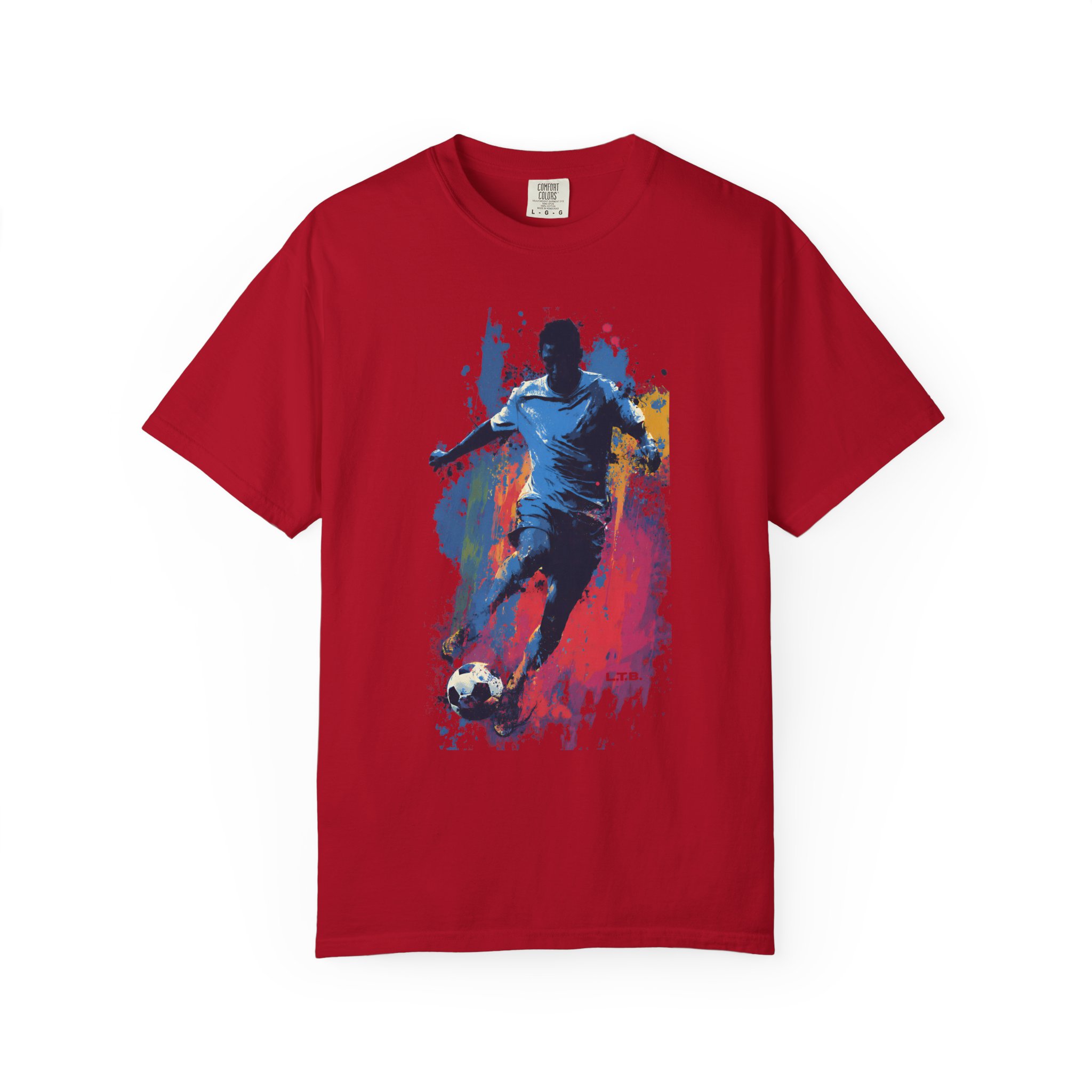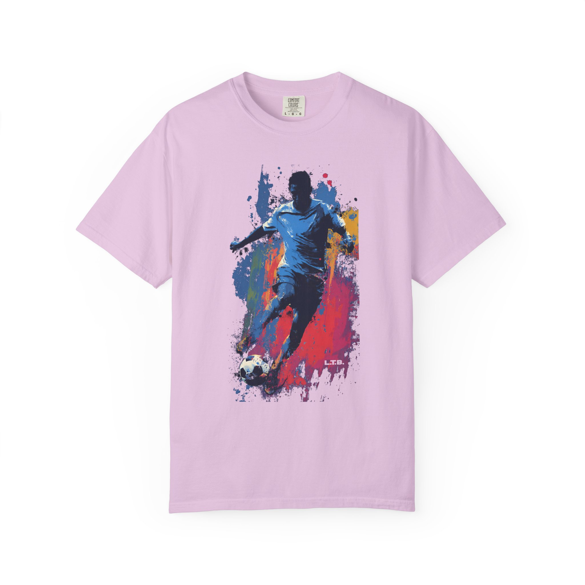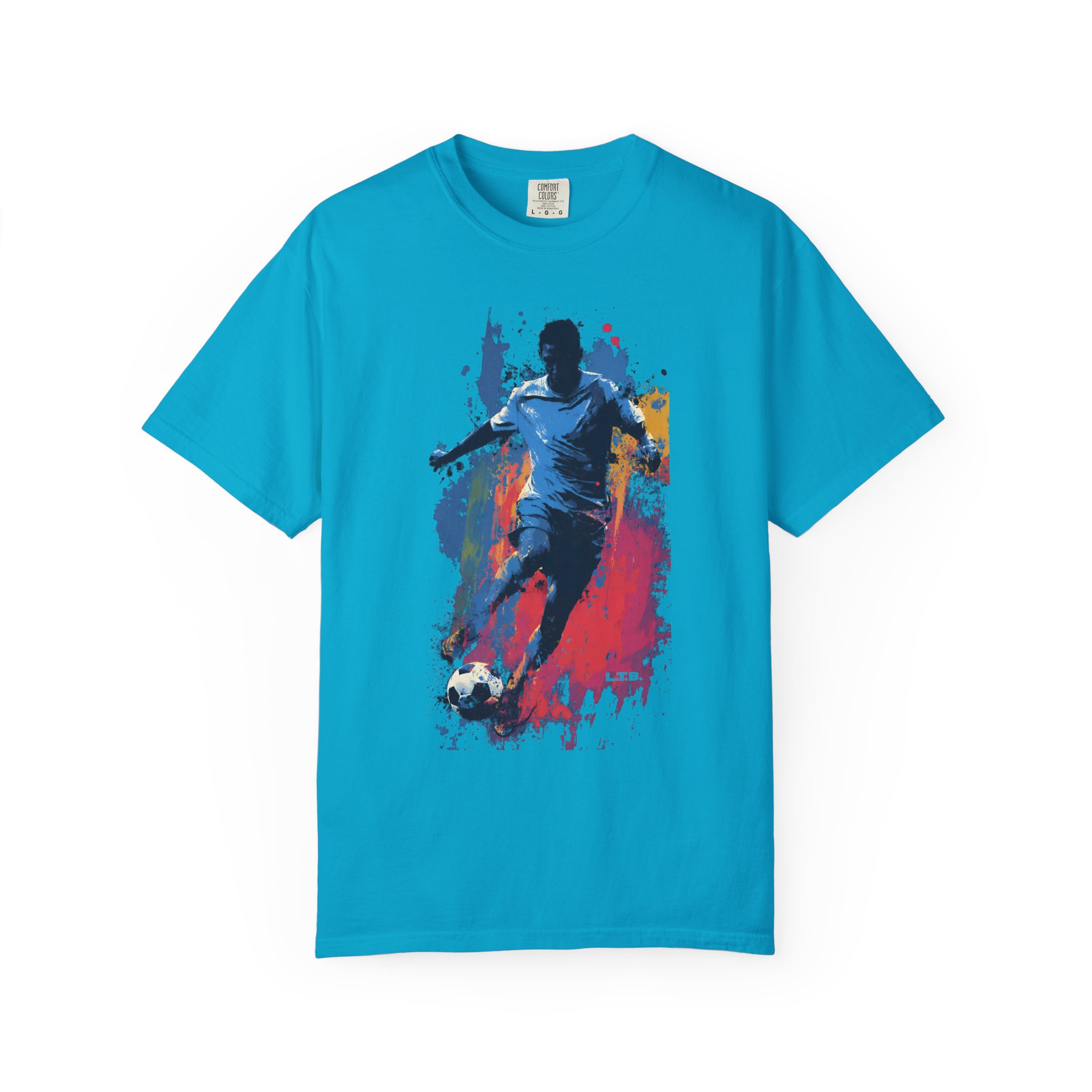 A bold, energetic soccer tee that feels like the match still buzzing in your veins. Vivid splash-art captures a player mid-strike—painted motion, sweat, and stadium lights—so the shirt reads like a snapshot from the pitch. The heavyweight, garment-dyed cotton softens with wear, taking on a lived-in look that matches the grit of weekend leagues and late-night pick-up games. It sits relaxed across the shoulders and moves with you, whether you’re warming up, cheering from the sidelines, or winding down after practice. This is for players and fans who live for that rush of a perfectly placed shot and want their gear to carry the same fearless energy to post-game hangs, casual city walks, and club nights where the conversation inevitably turns to goals and saves.