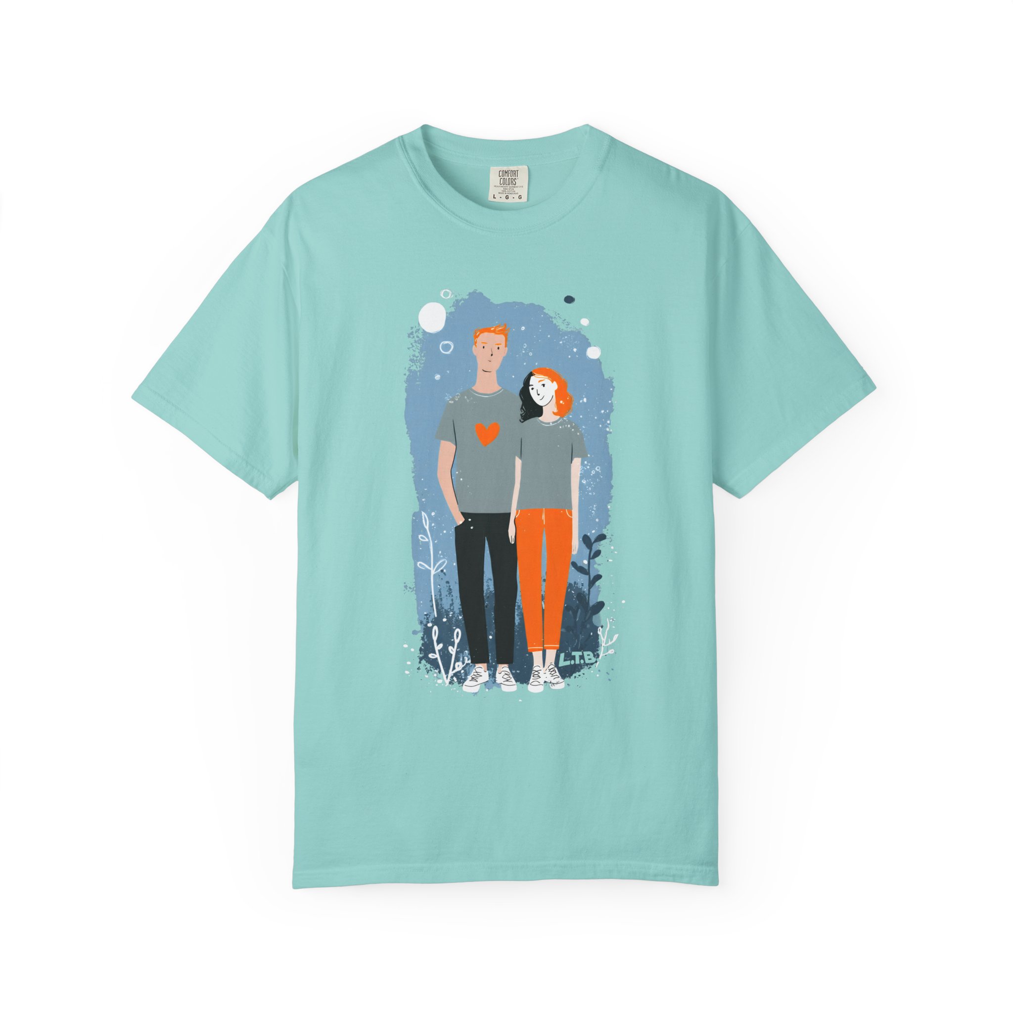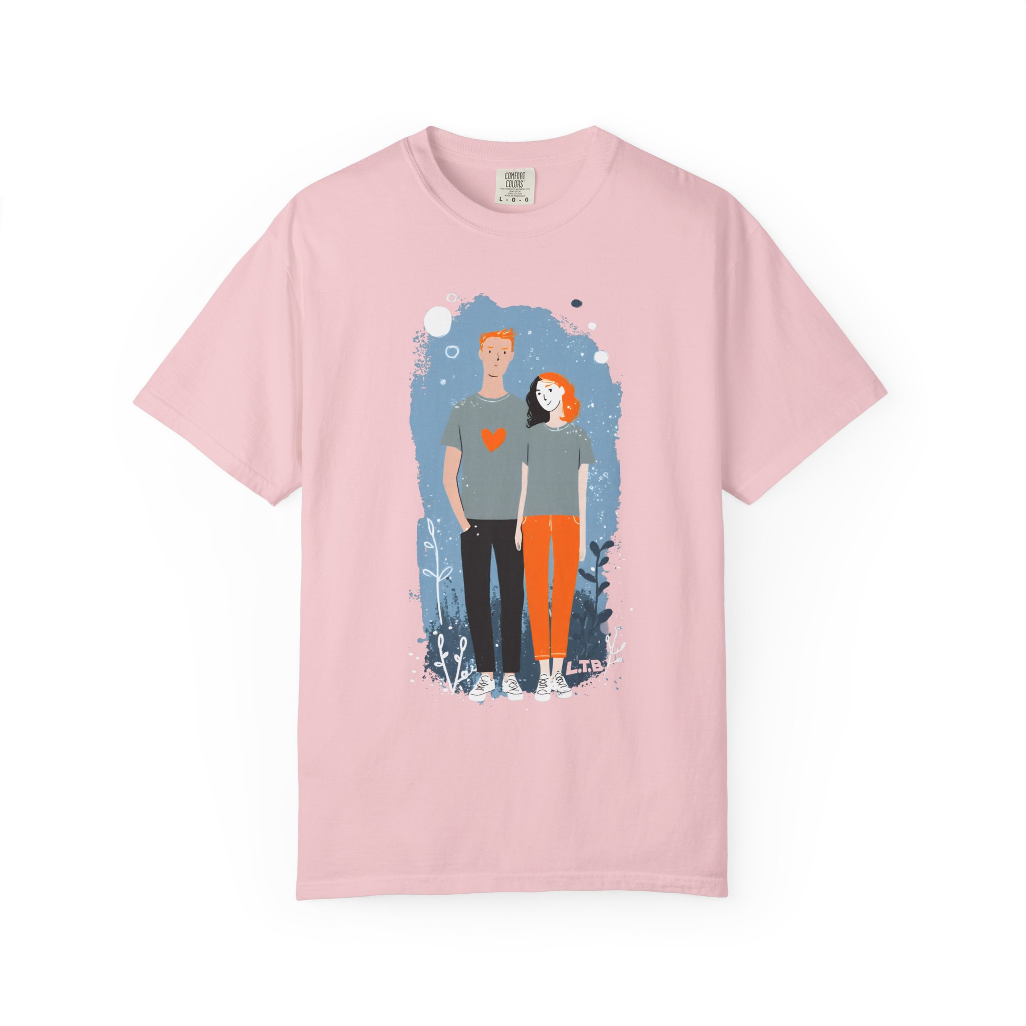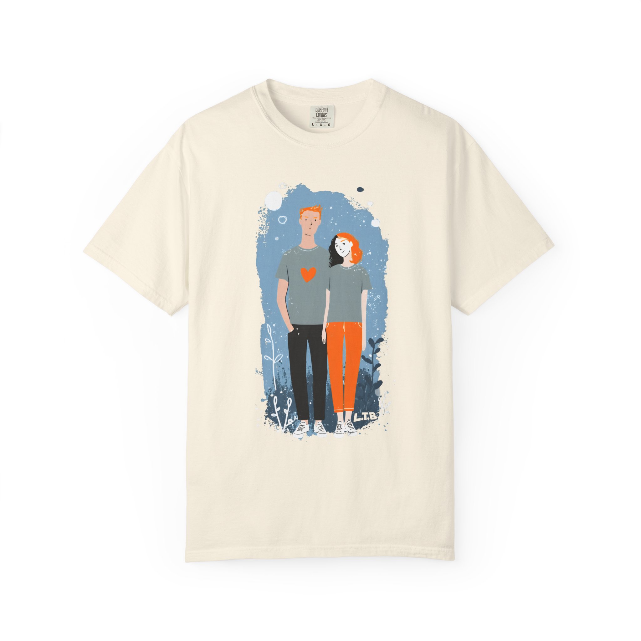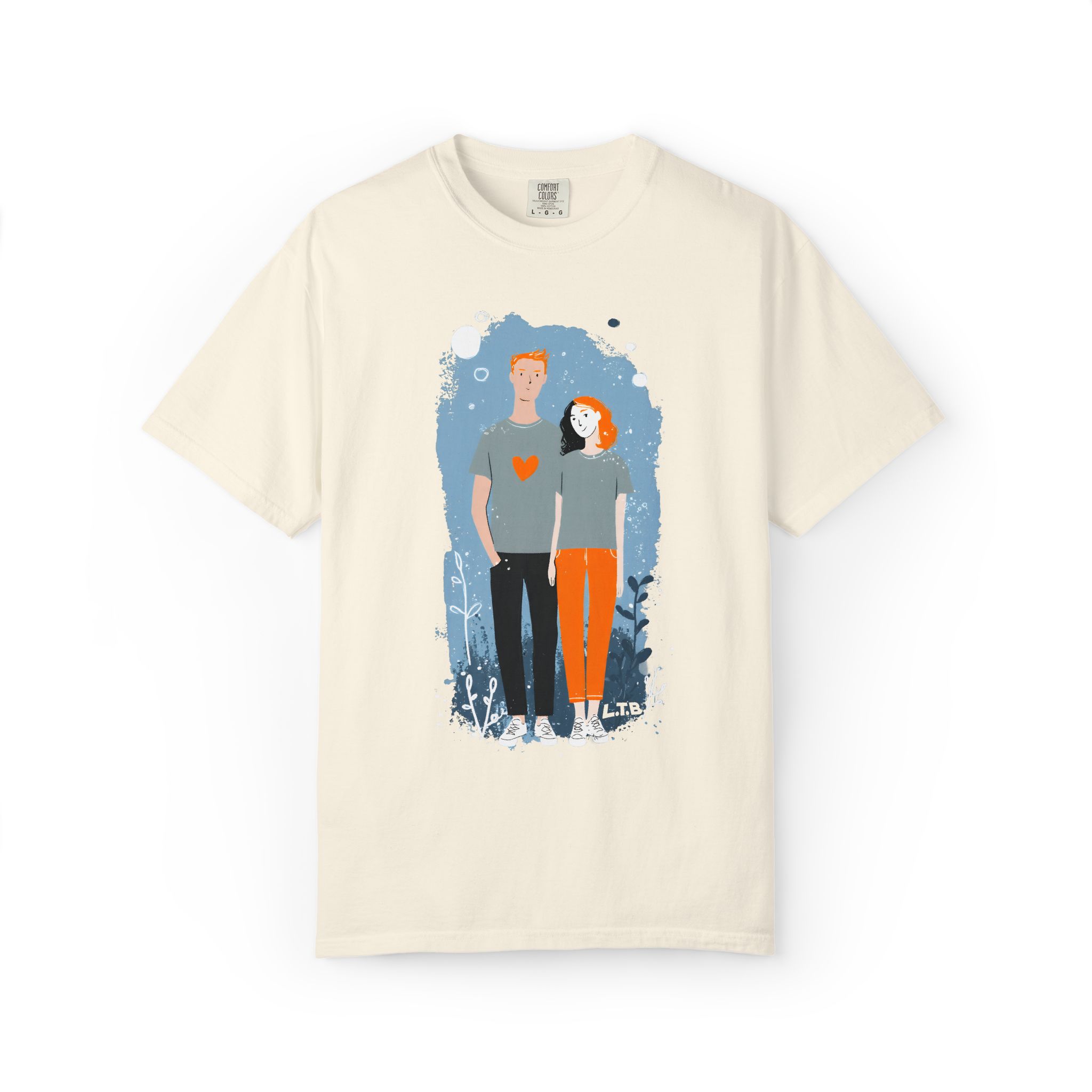 A quiet, tender moment captured in soft color and gentle illustration. This Valentine couple T-shirt features two figures standing close together, connected by a subtle heart and a calm, intimate presence. The painterly background and muted palette create a feeling of warmth, trust, and everyday love rather than loud romance.