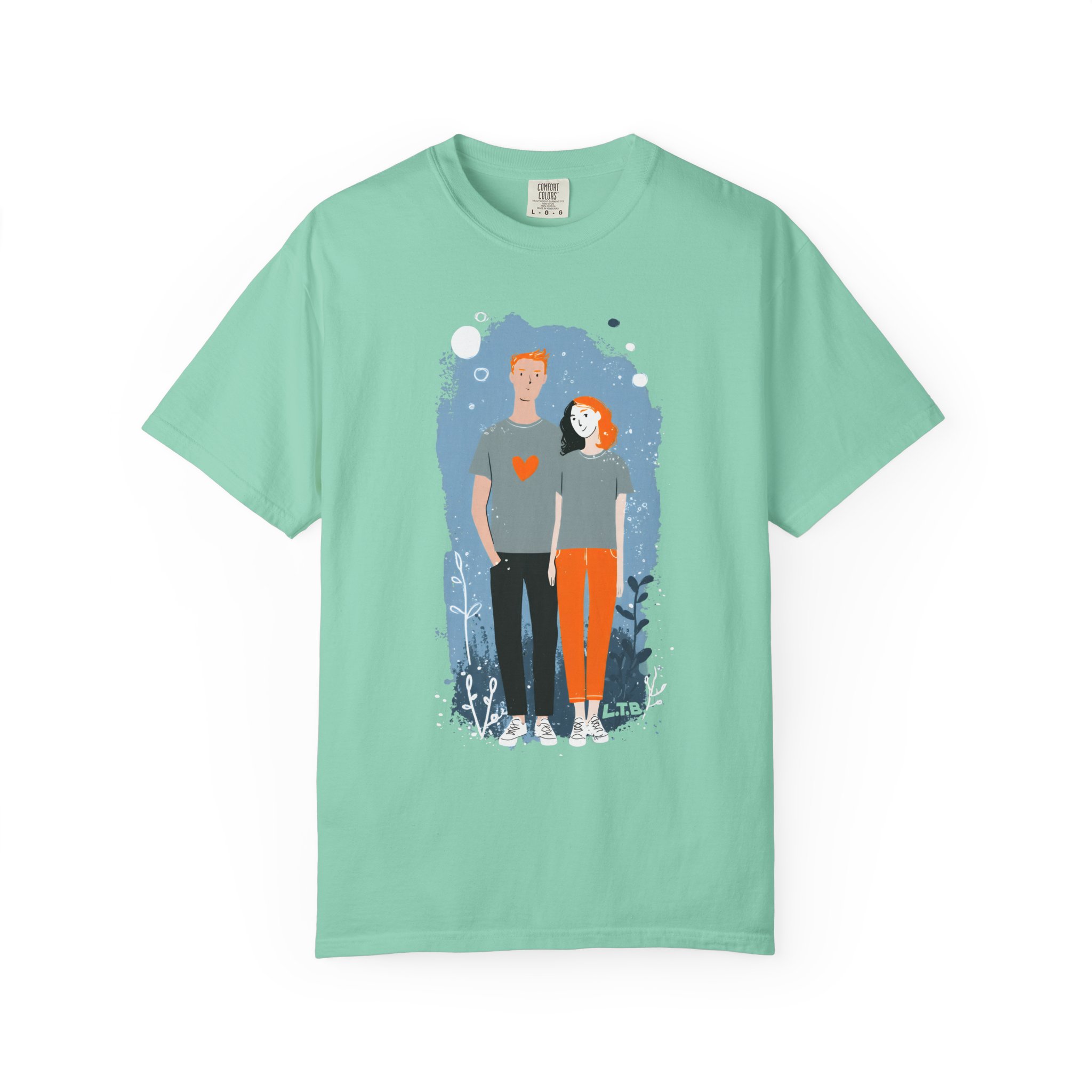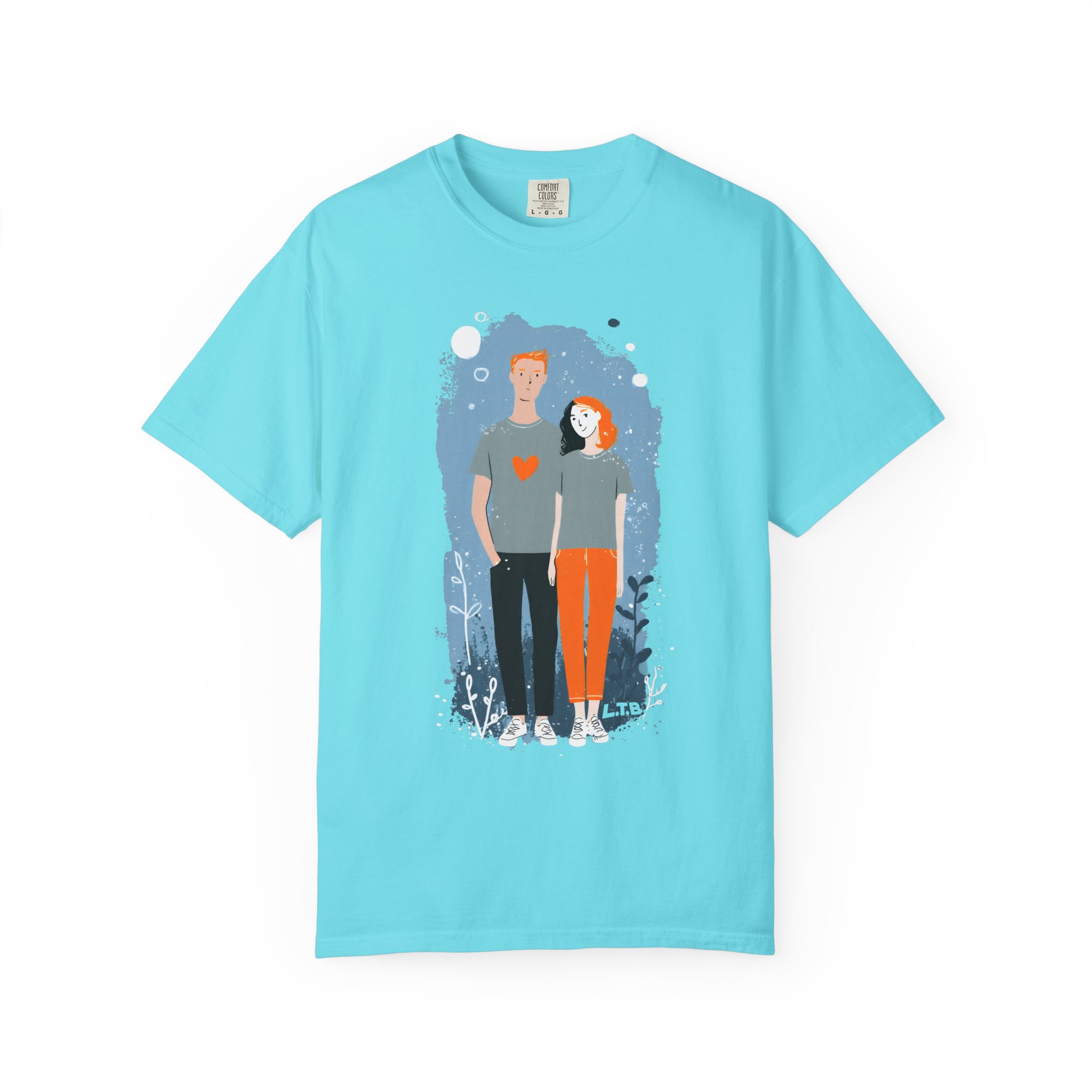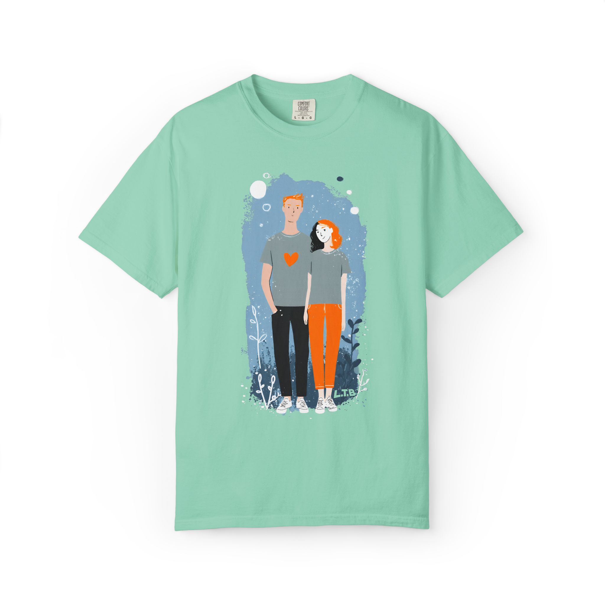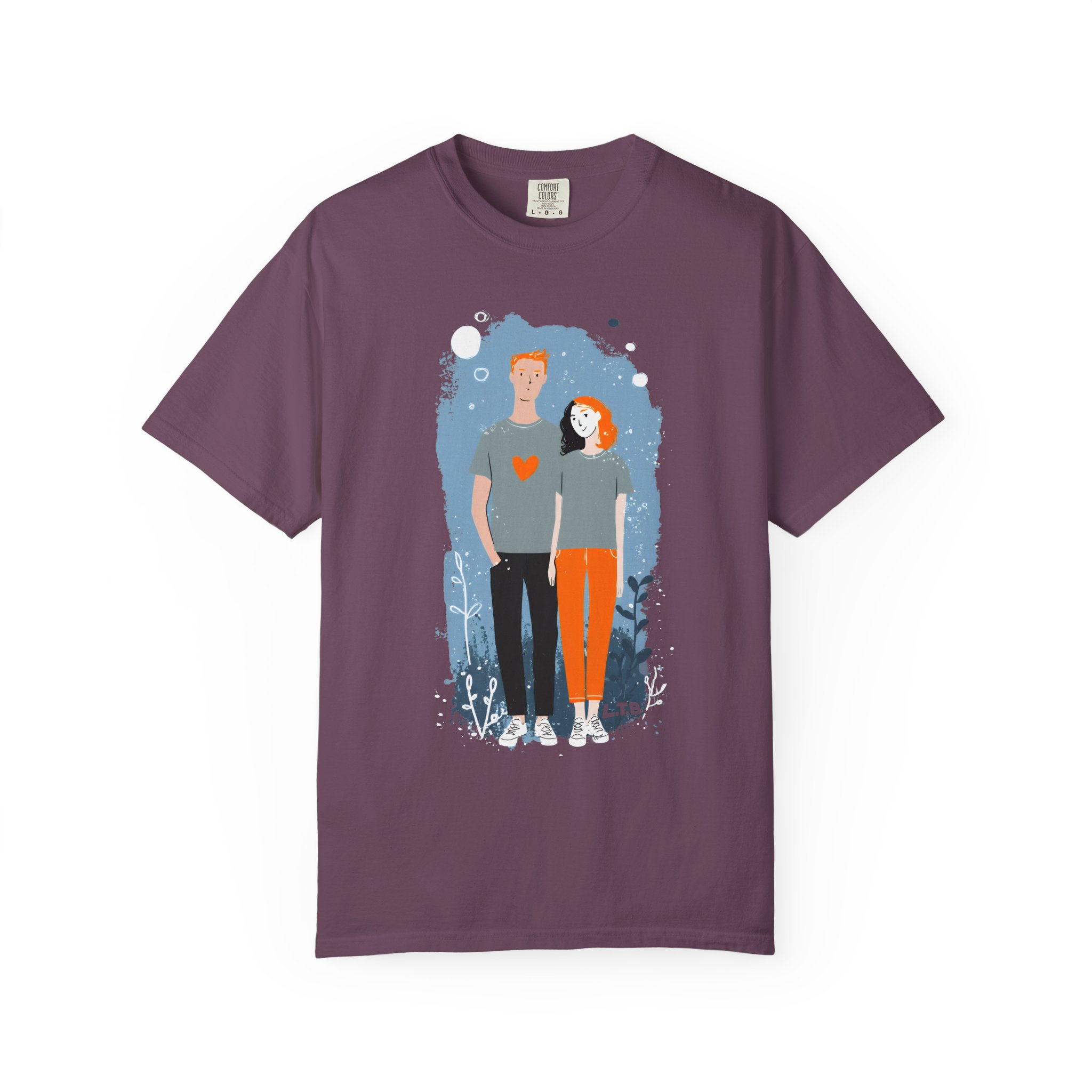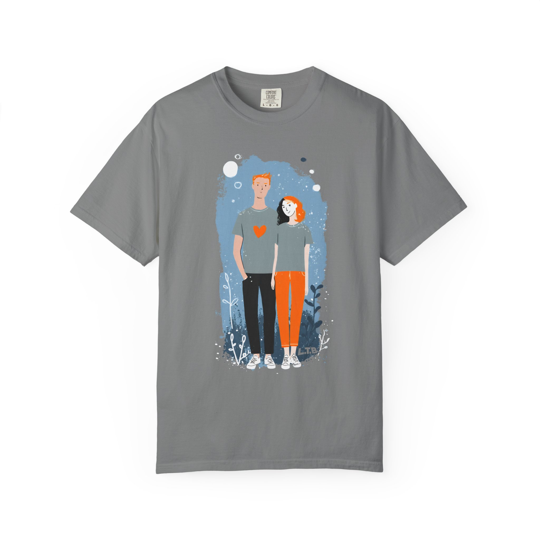 A quiet, tender moment captured in soft color and gentle illustration. This Valentine couple T-shirt features two figures standing close together, connected by a subtle heart and a calm, intimate presence. The painterly background and muted palette create a feeling of warmth, trust, and everyday love rather than loud romance.