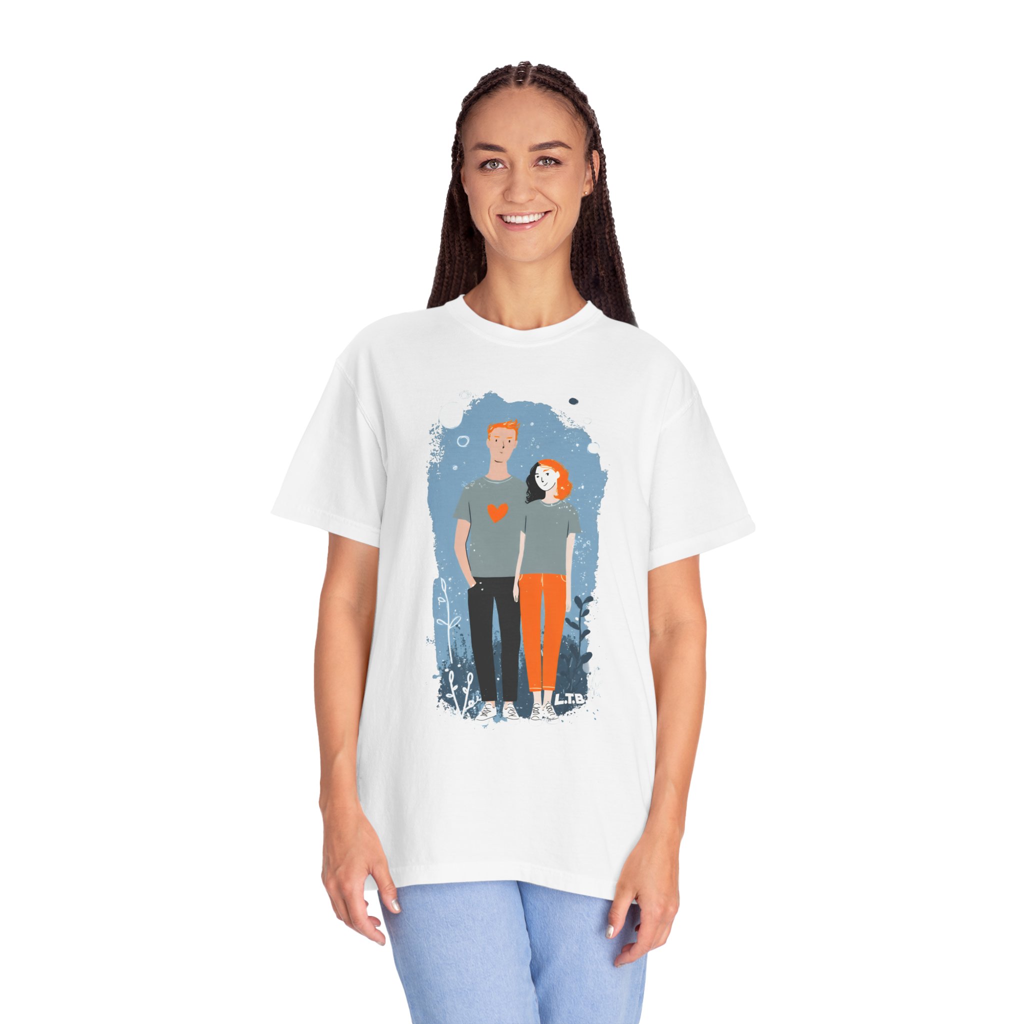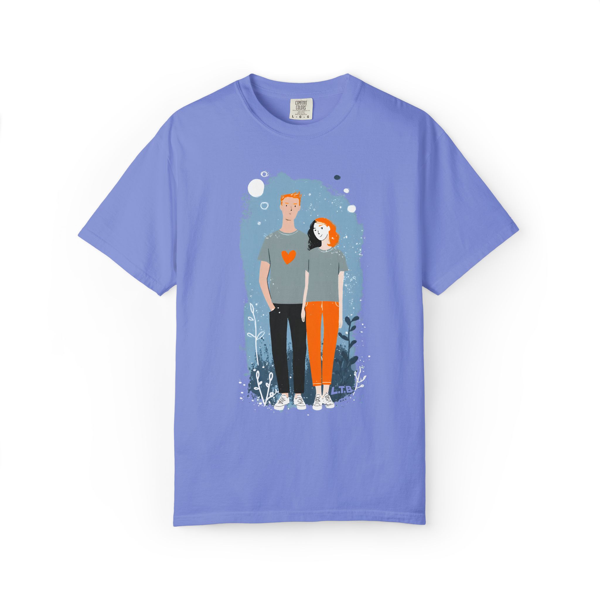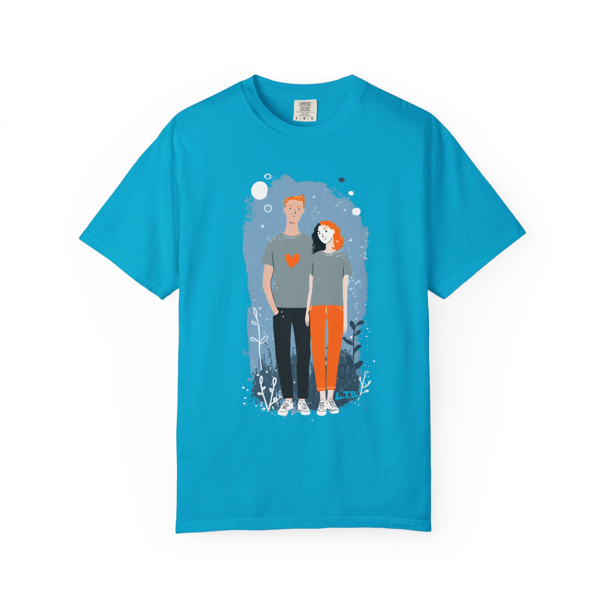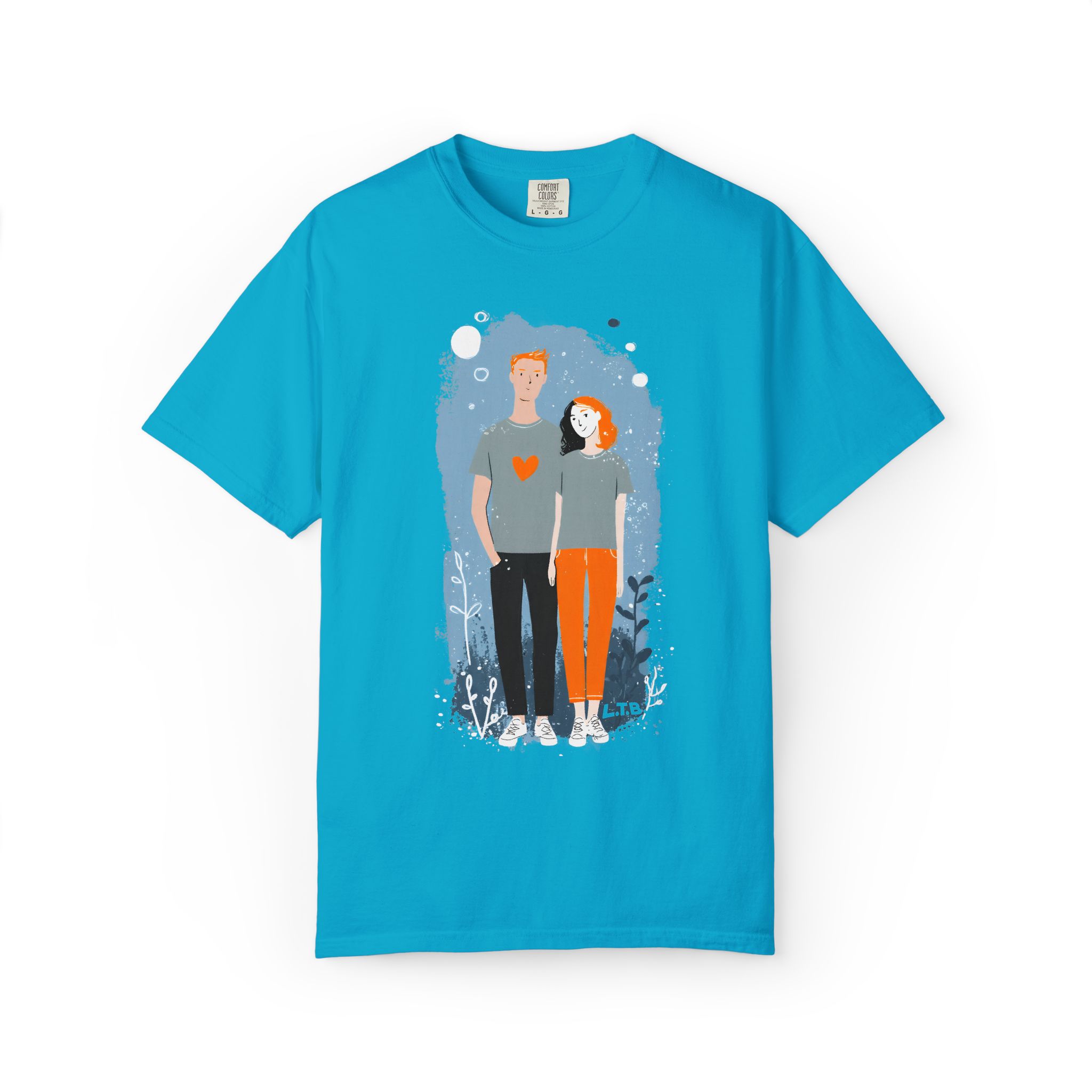 A quiet, tender moment captured in soft color and gentle illustration. This Valentine couple T-shirt features two figures standing close together, connected by a subtle heart and a calm, intimate presence. The painterly background and muted palette create a feeling of warmth, trust, and everyday love rather than loud romance.