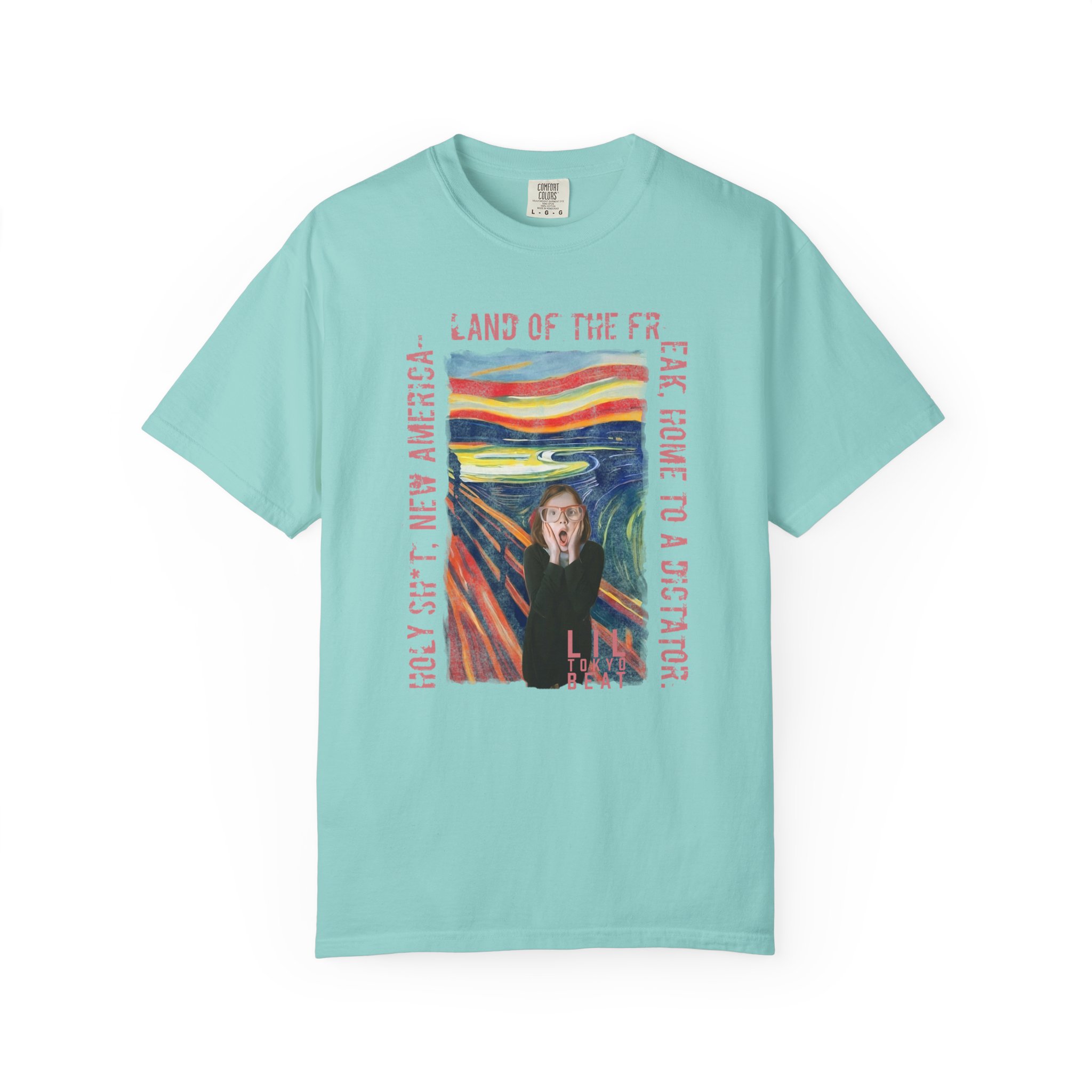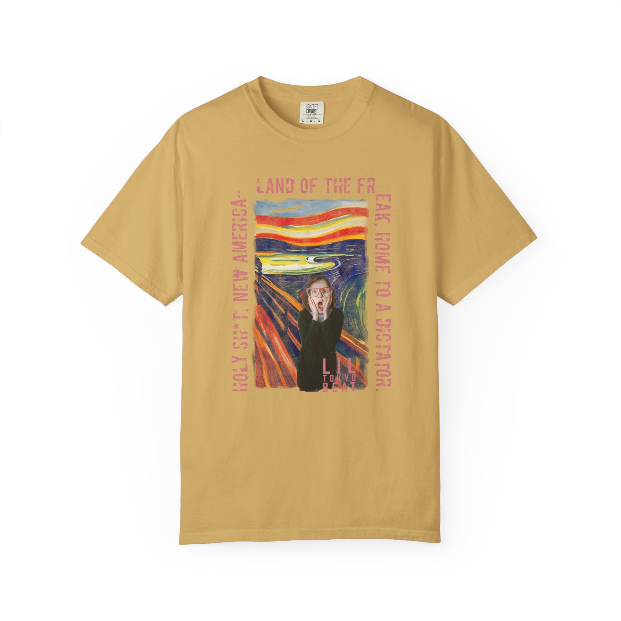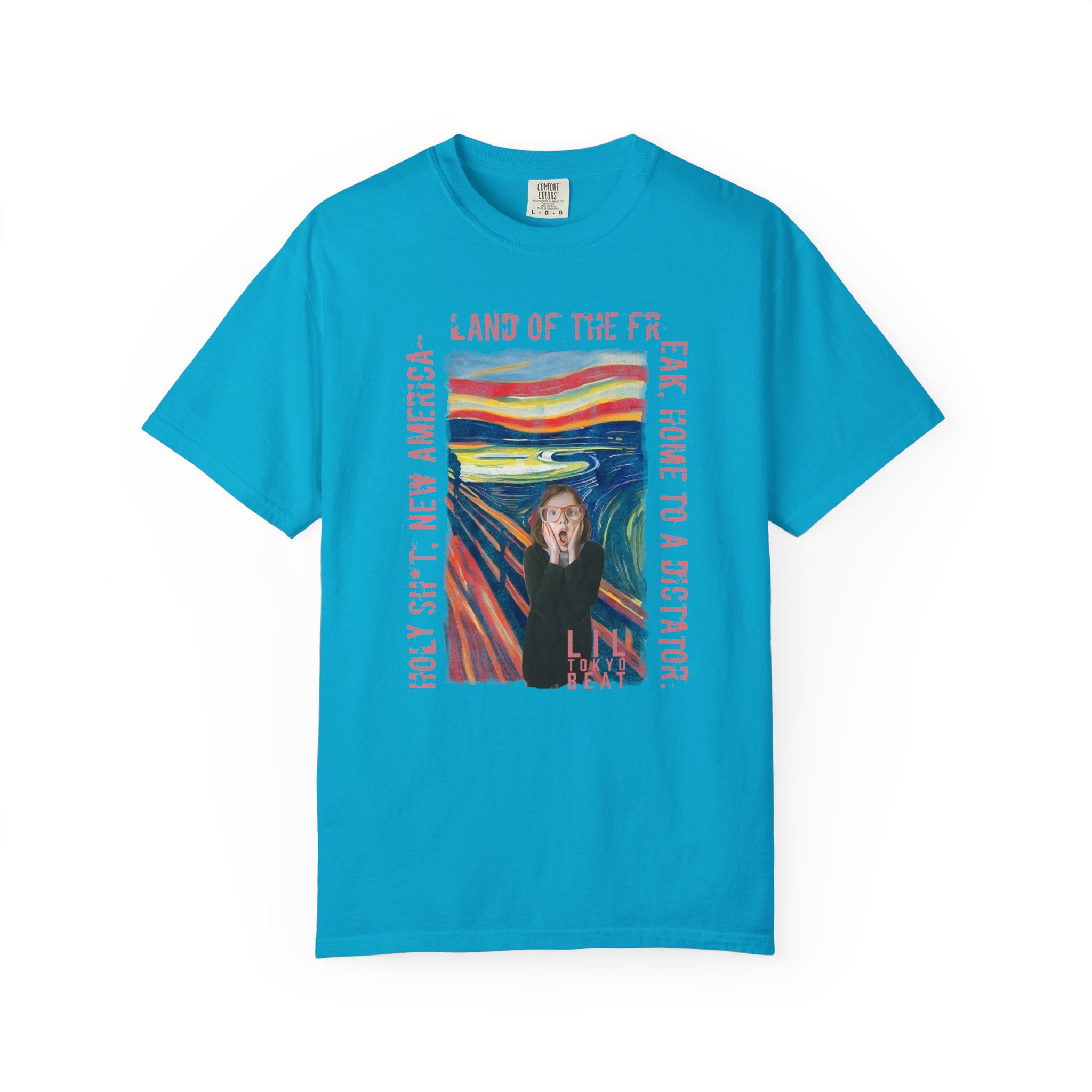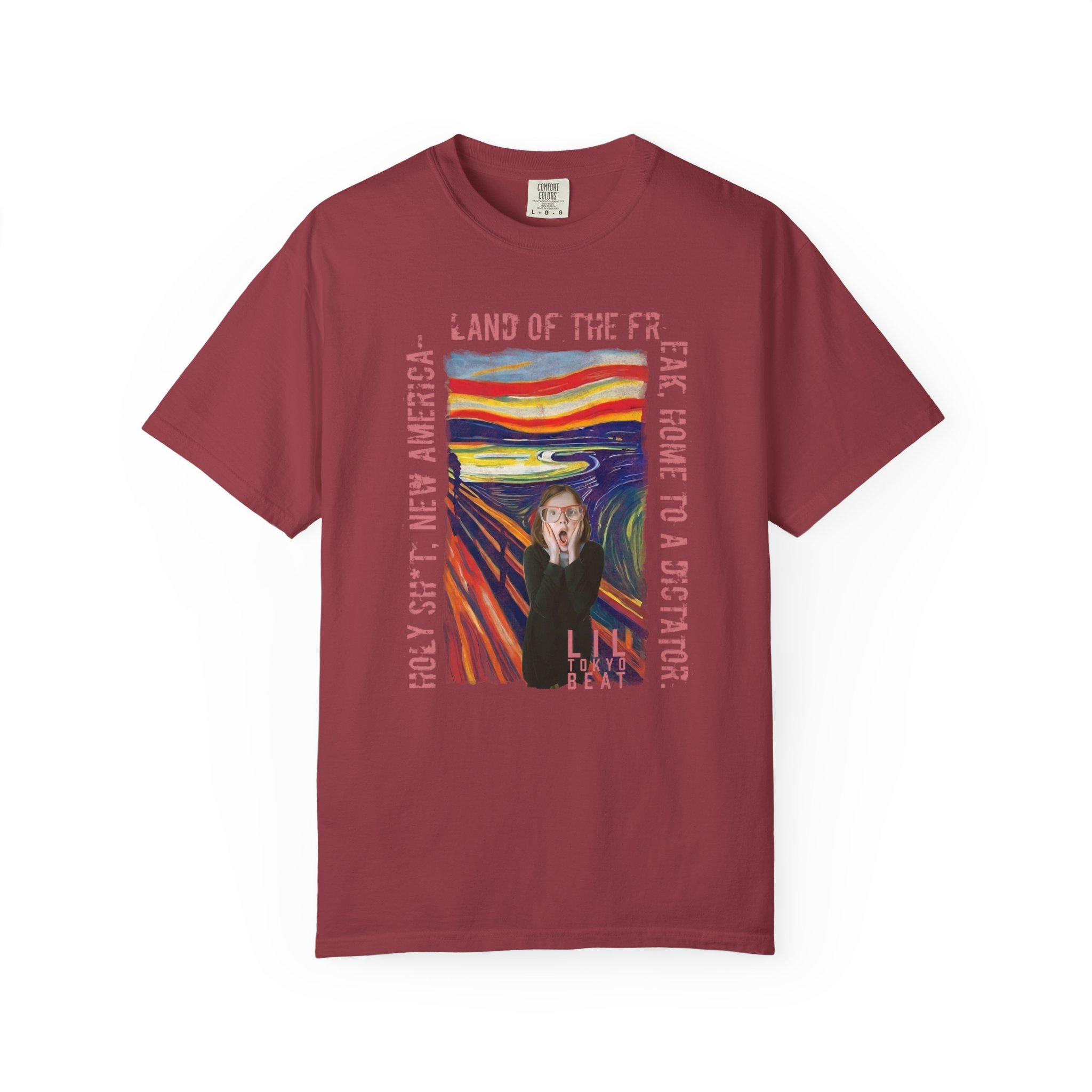 The Age of Trump: A New Reality, Artistic Statement T-Shirt, The Scream of Trump’s America 2025, Political Humor, Unisex Fashion, Introducing our Unisex Garment-Dyed T-shirt – a stylish and comfortable staple for every wardrobe. This tee offers a relaxed fit that pairs well with jeans for a casual day out or can be dressed up with accessories for a semi-formal occasion. Crafted from 100% ring-spun US cotton, it feels wonderfully soft against the skin. Available in a wide range of sizes from S to 4XL, it ensures everyone can find their perfect fit. With its striking design inspired by contemporary themes, it’s perfect for individuals looking to make a statement. Product features – Available in sizes S to 4XL for a customized fit. – Durable double-needle stitching on all seams for longevity. – Sewn without side seams for a sleek look and reduced waste. – Garment-dyed for a soft texture and unique color. – Made from ethically sourced 100% US cotton for sustainable fashion. Care instructions – Machine wash: cold (max 30C or 90F) – Do not bleach – Tumble dry: low heat – Iron, steam or dry: low heat – Do not dryclean
